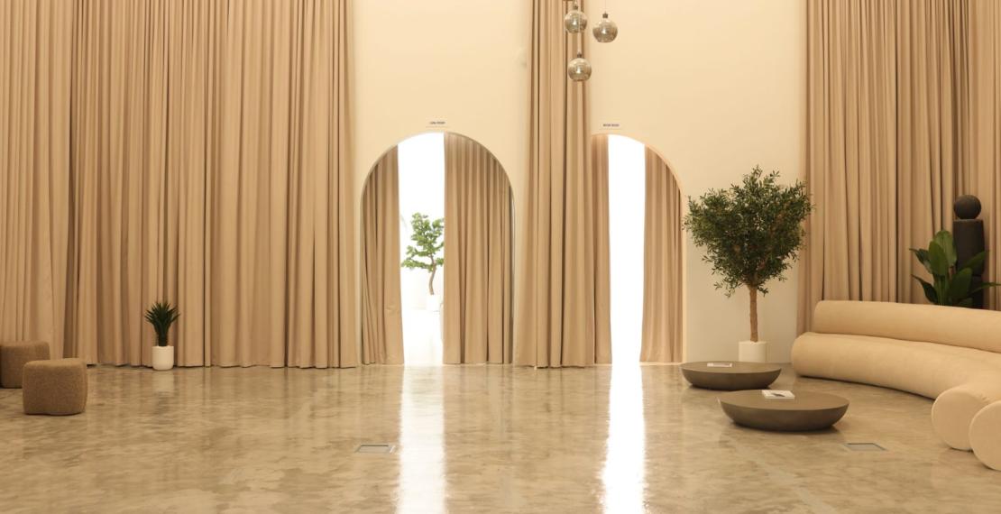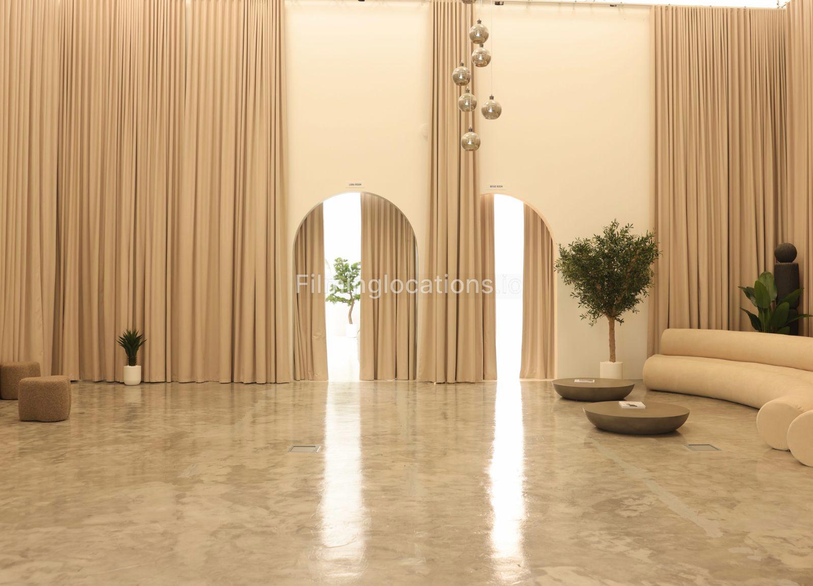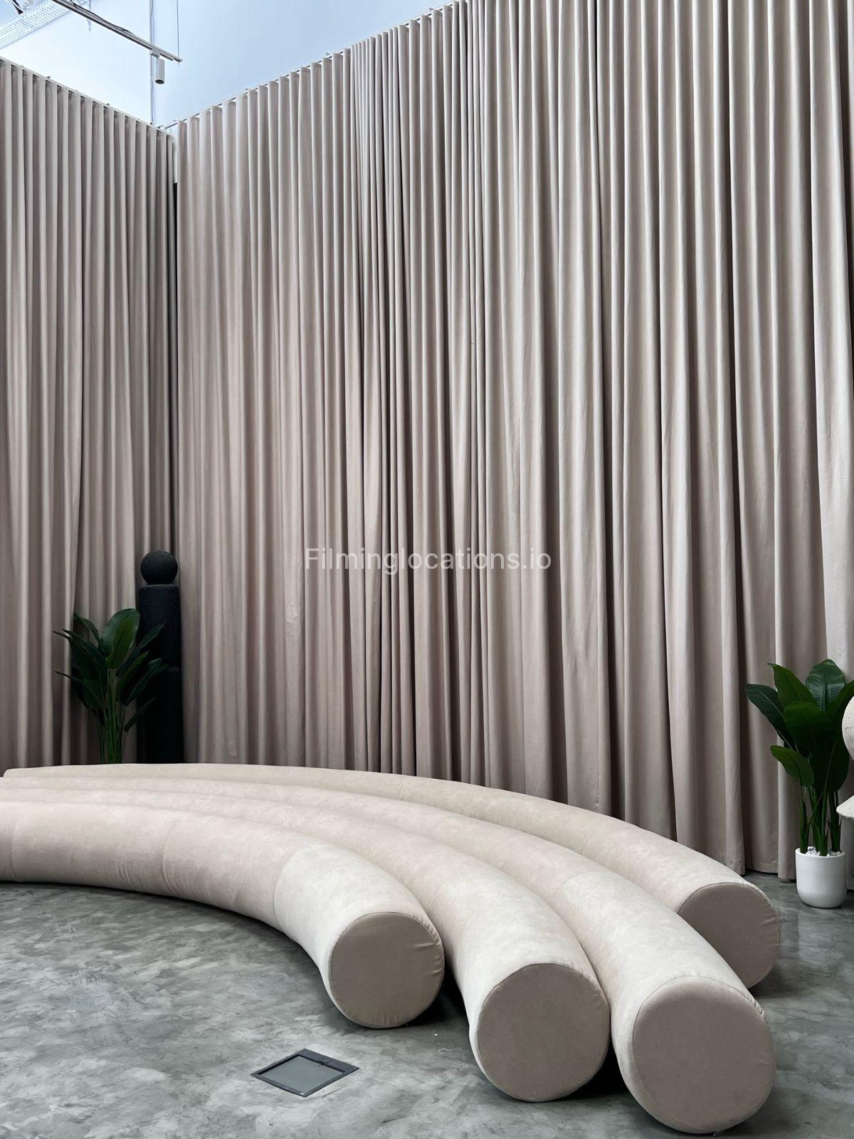 Our stylish studio is designed with pop-ups, also serving as an elegant lounge extension to your shoot. The area includes basic furniture and display stands for flexible use.