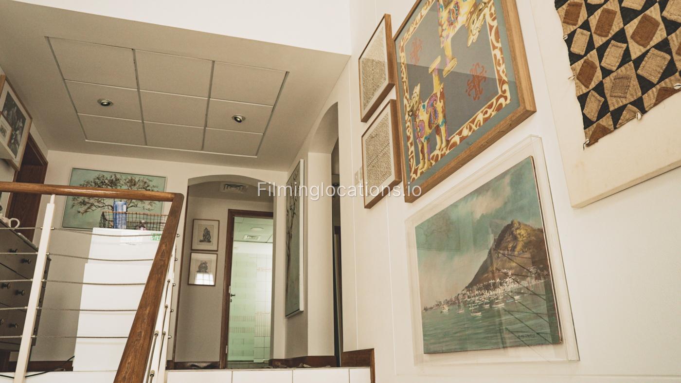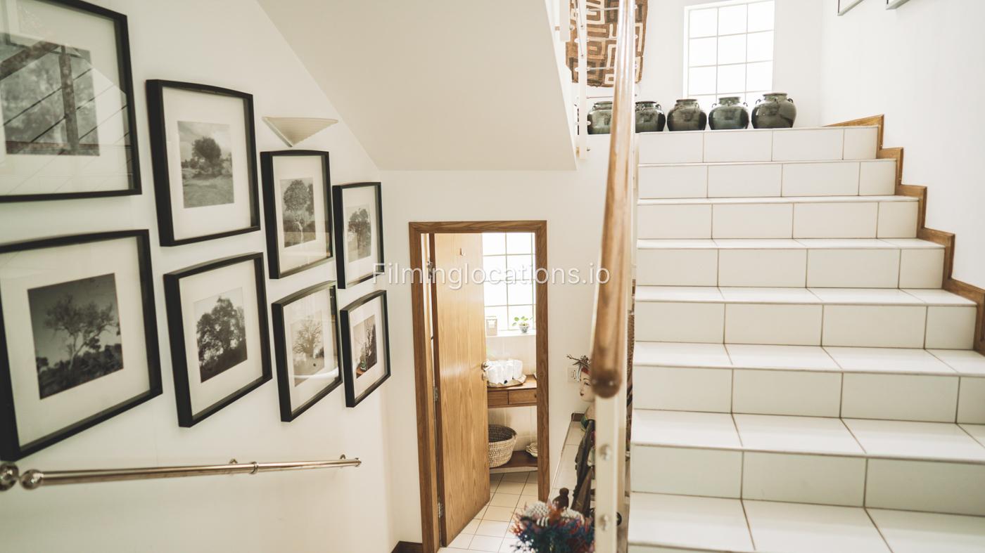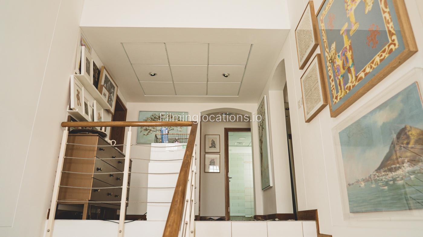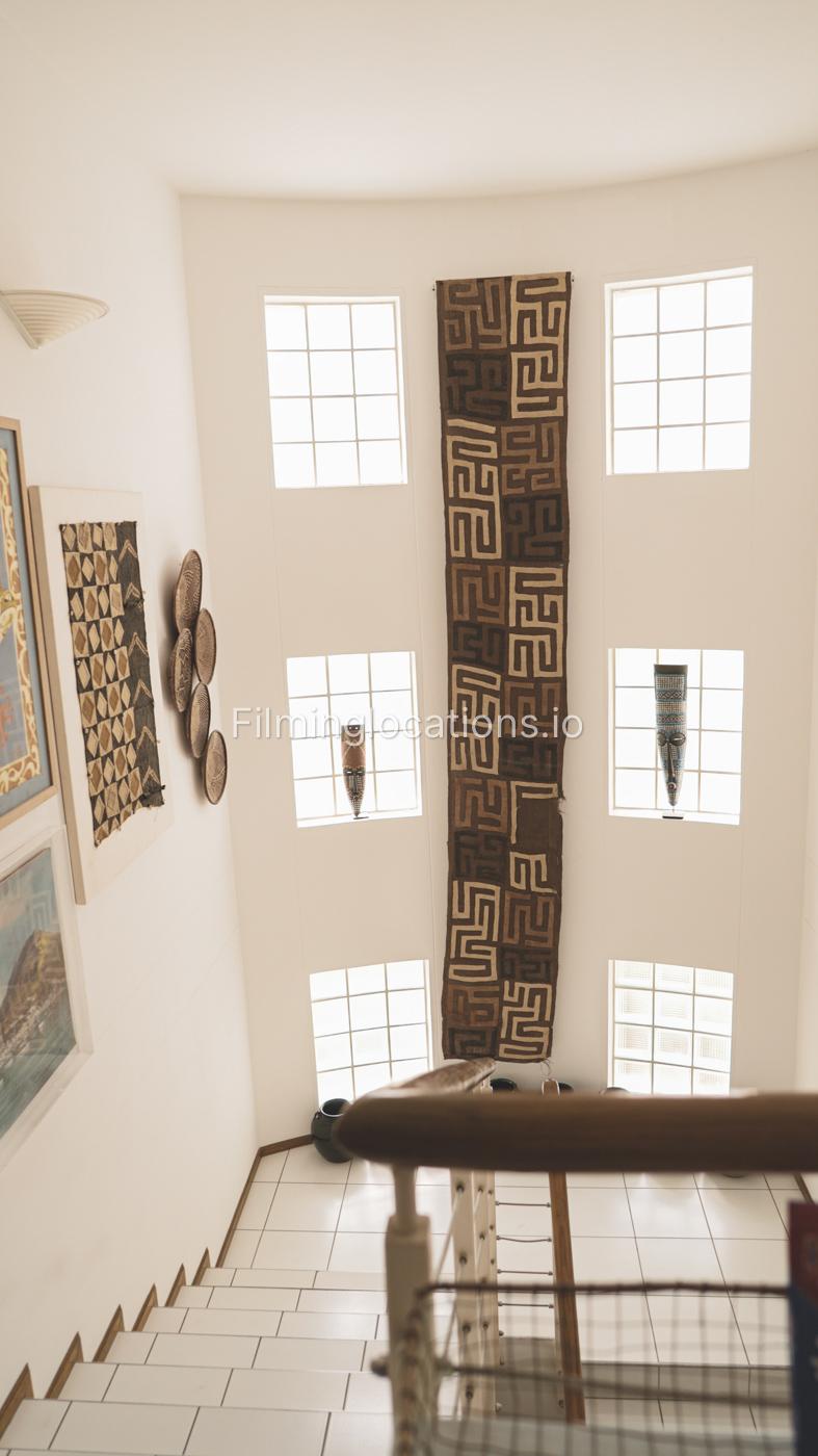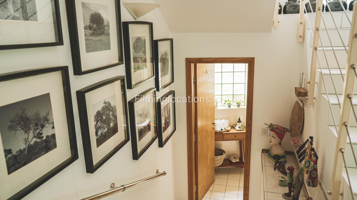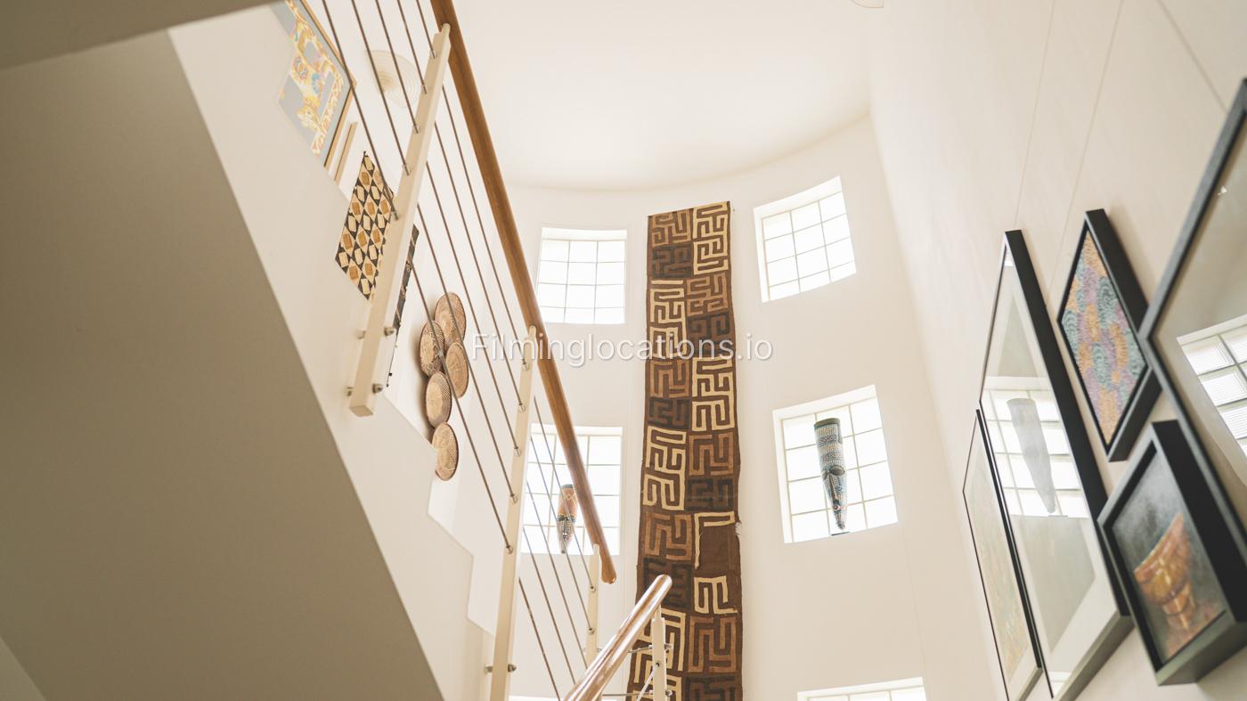 The property has a lot of art wooden decorations and creative paintings all over the place. A nicely decorated staircase has a high ceiling and four windows with lots of bright light.