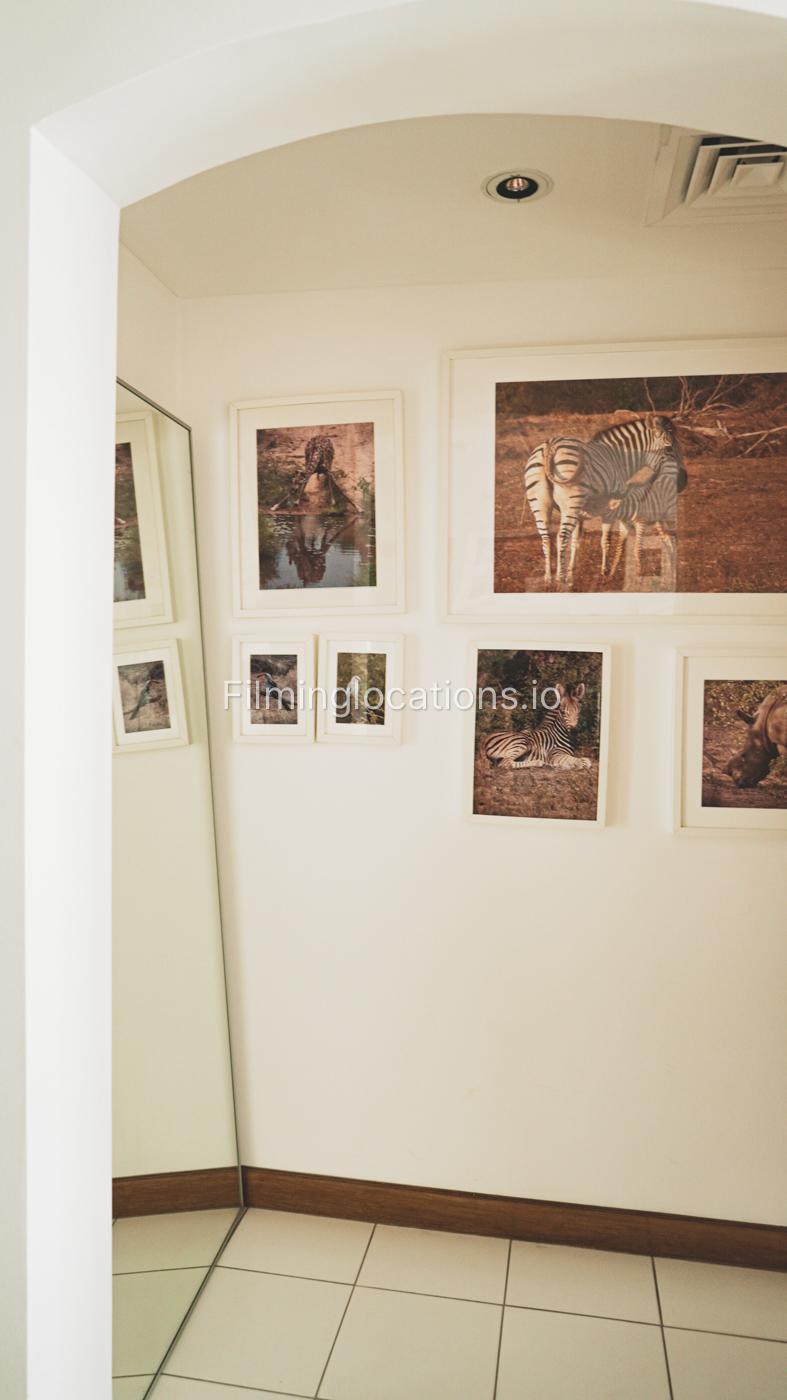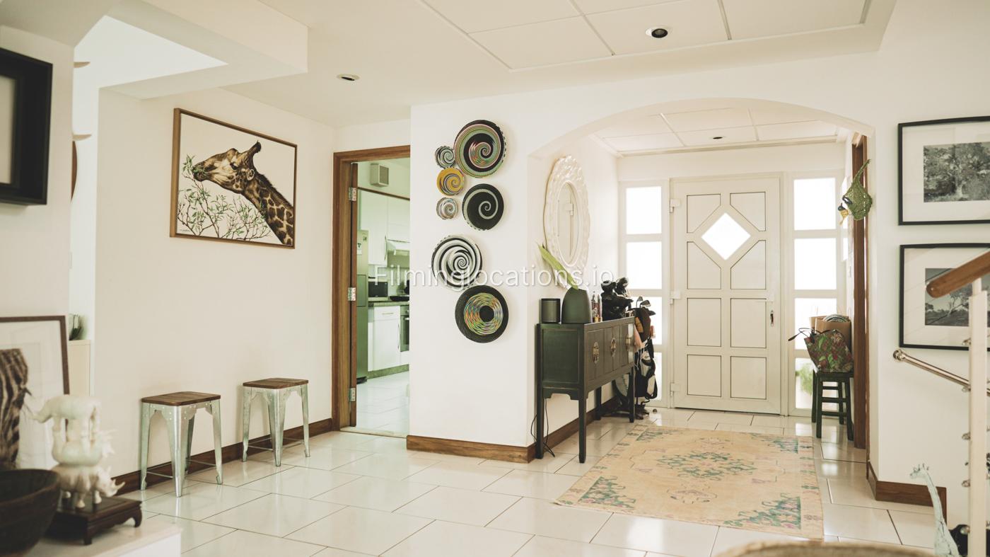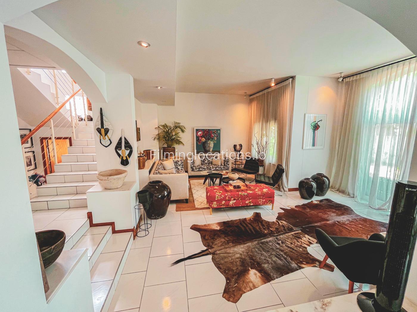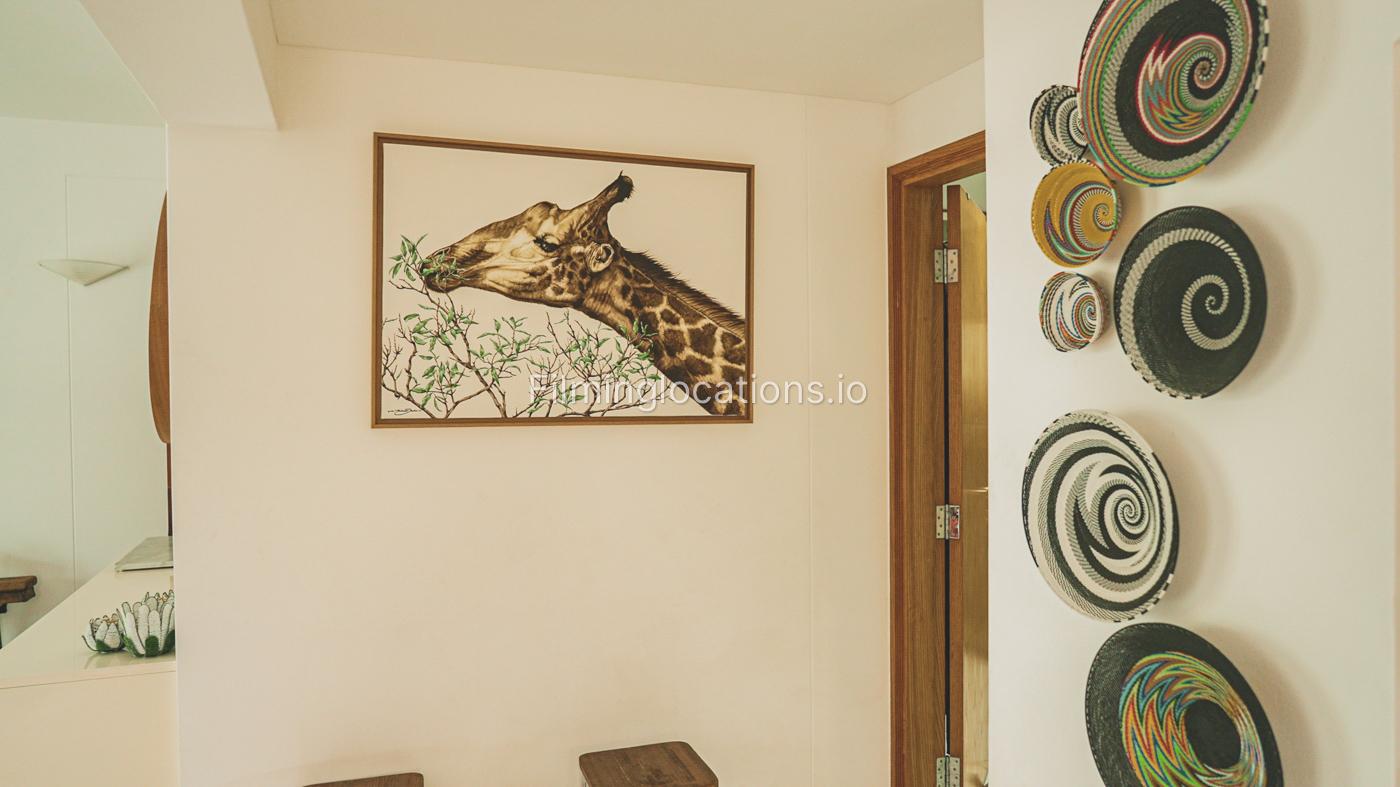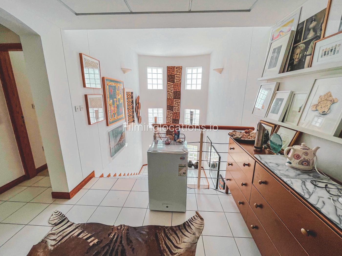 The property has a lot of art wooden decorations and creative paintings all over the place. A nicely decorated staircase has a high ceiling and four windows with lots of bright light.