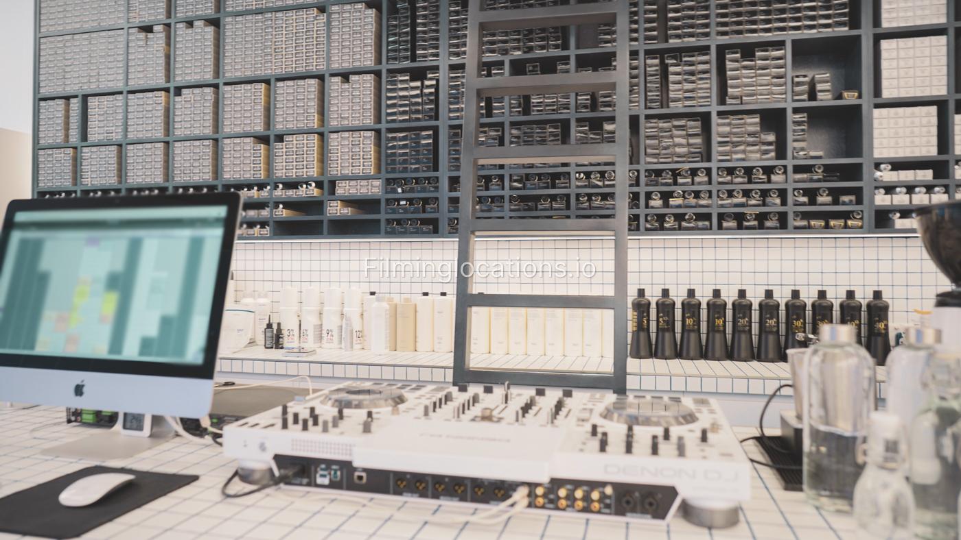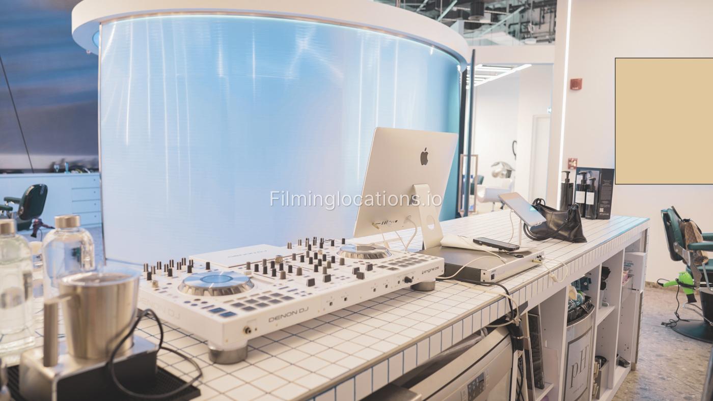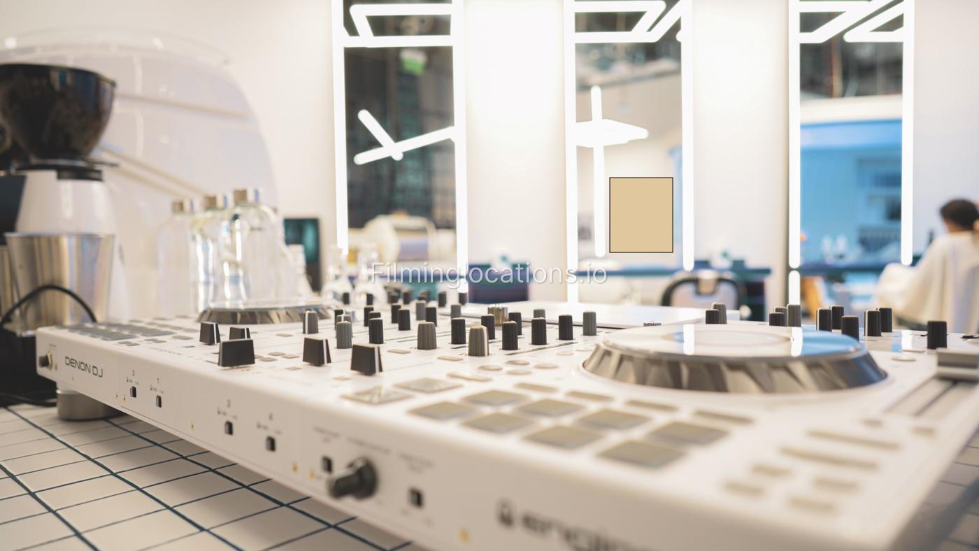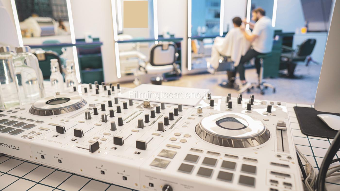 Exclusive white DJ Corner with Coffee bar and 9 meter high shelf full field with hair color and treatment. Latest sound system is available. There is also a 9 meter ladder attached to the shelf behind the DJ set.