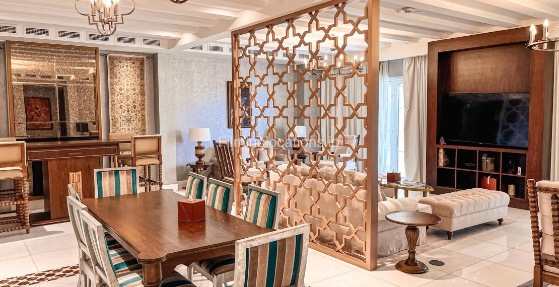 Modifying practical lighting is acceptable as long as it's restored to its original condition post-shoot. Abundant natural light illuminates the terrace area.
