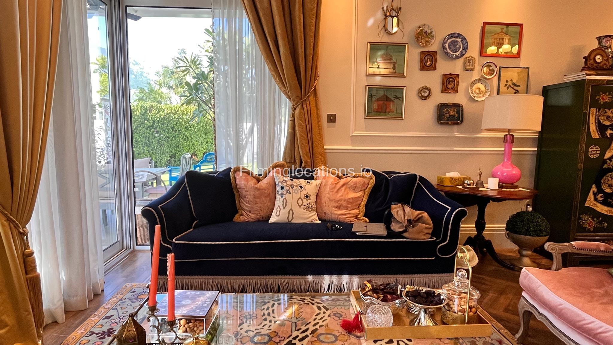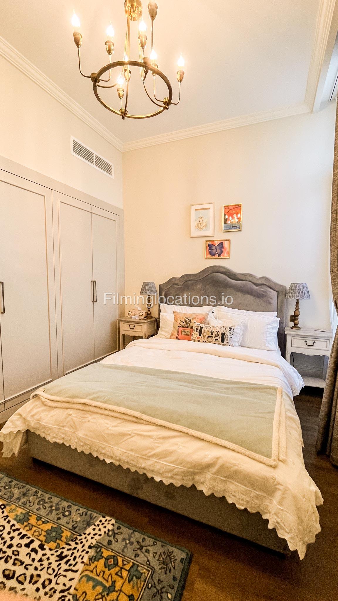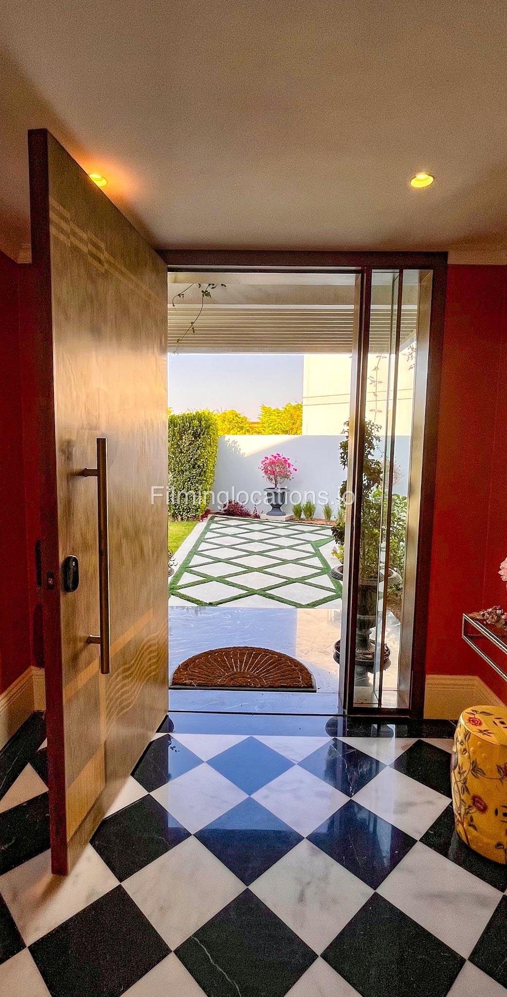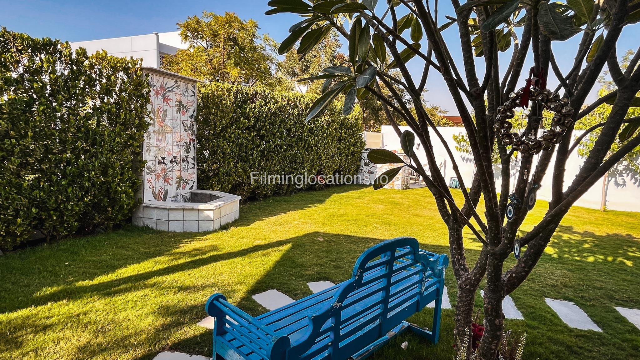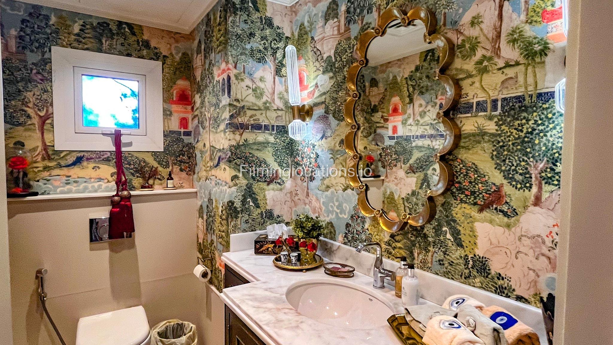 The colorful living room seamlessly integrates a stylish dining area, creating a welcoming space for any type of production. Villa has sleek and modern kitchen with straight access to the garden which can be perfect for filmmakers. The grand foyer welcomes you with its exquisite decor, and elegant lighting, setting the tone for the rest of the home. This cozy and well-appointed guest bedroom features a comfortable bed, and a spacious wardrobe. The chic powder room boasts sleek finishes and stylish space for guests.