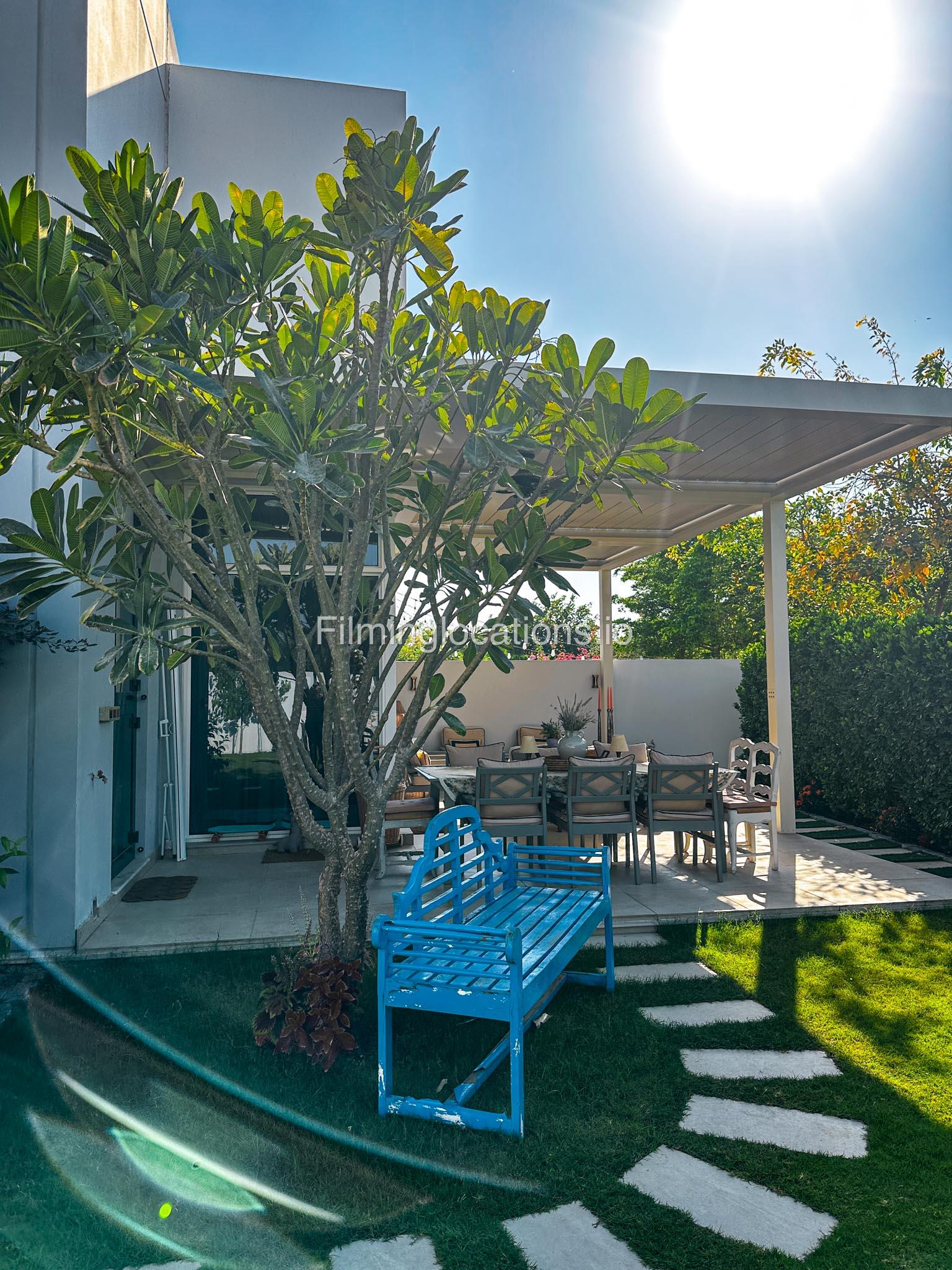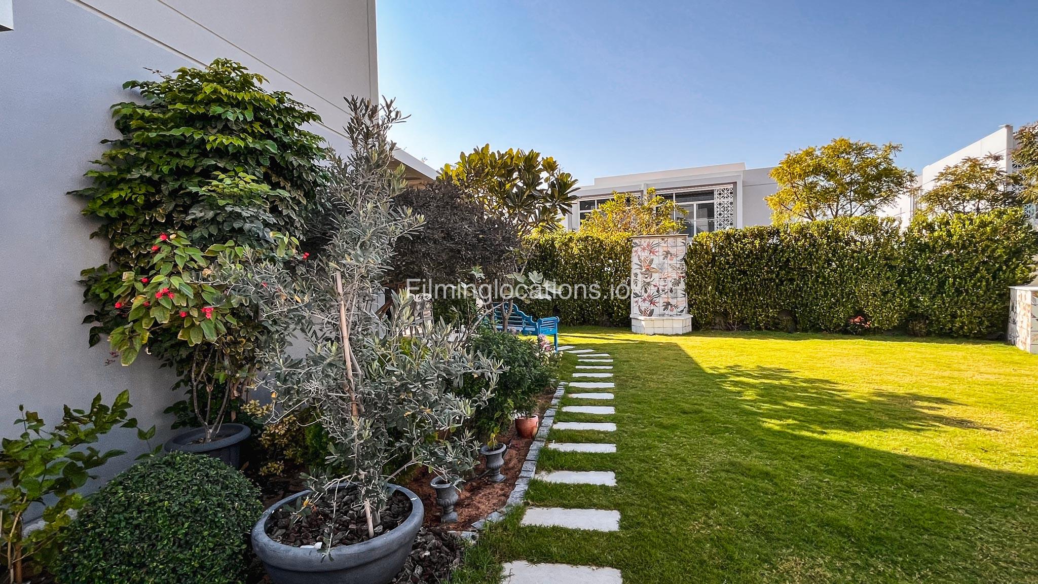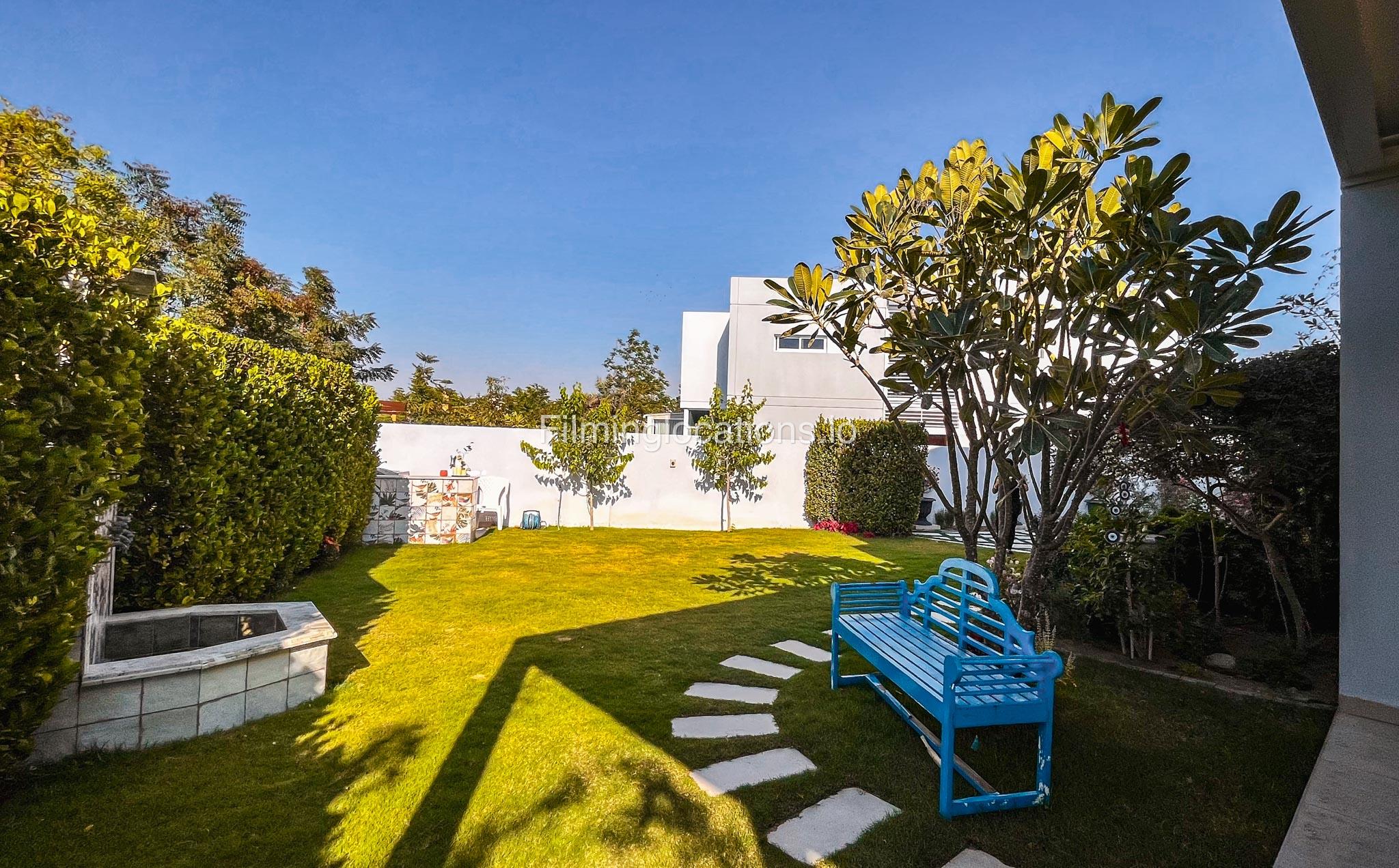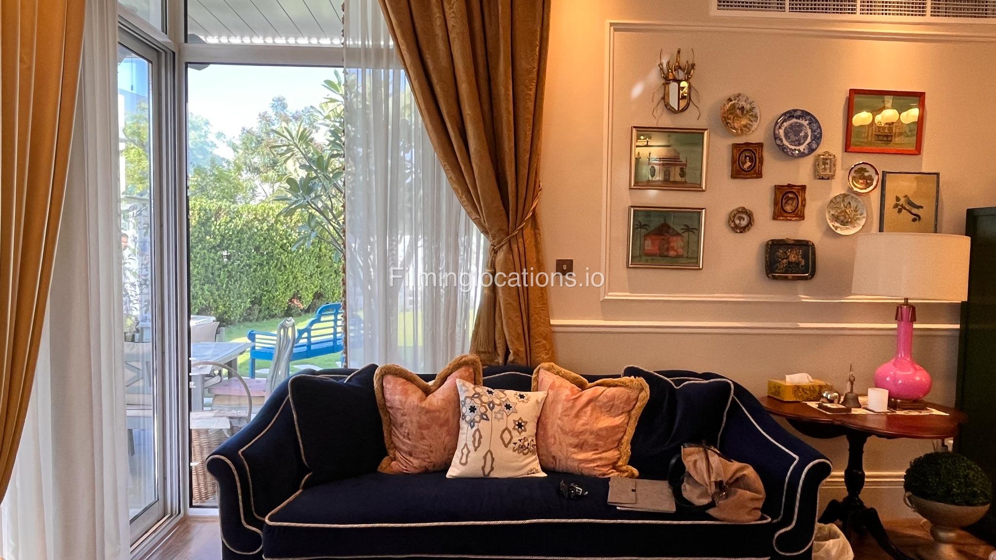 The colorful living room seamlessly integrates a stylish dining area, creating a welcoming space for any type of production. Villa has sleek and modern kitchen with straight access to the garden which can be perfect for filmmakers. The grand foyer welcomes you with its exquisite decor, and elegant lighting, setting the tone for the rest of the home. This cozy and well-appointed guest bedroom features a comfortable bed, and a spacious wardrobe. The chic powder room boasts sleek finishes and stylish space for guests.