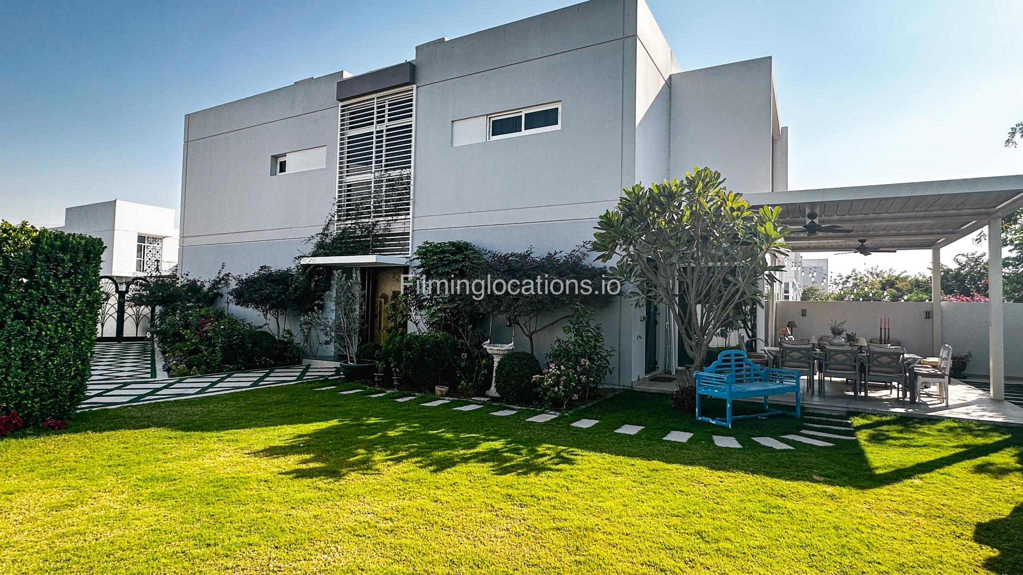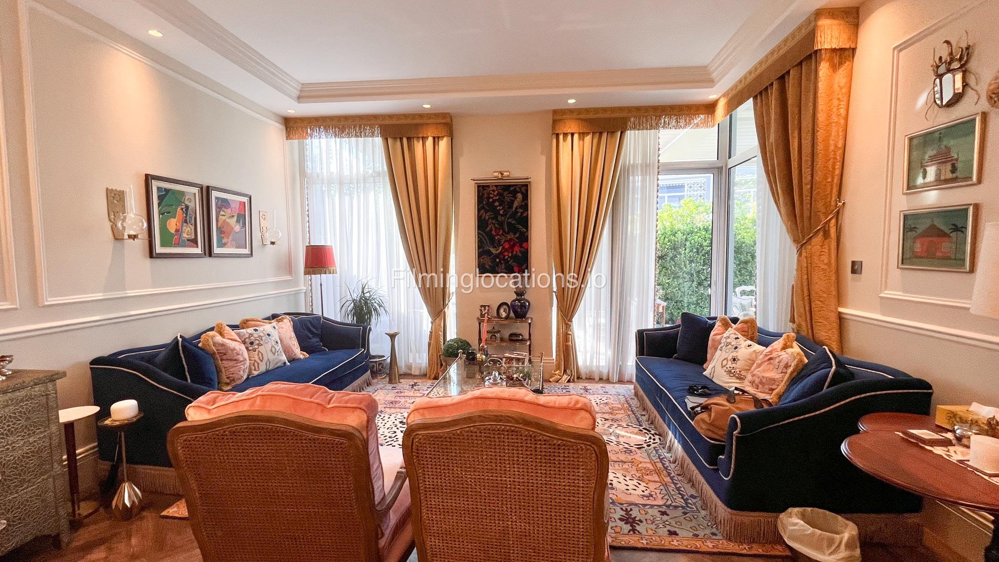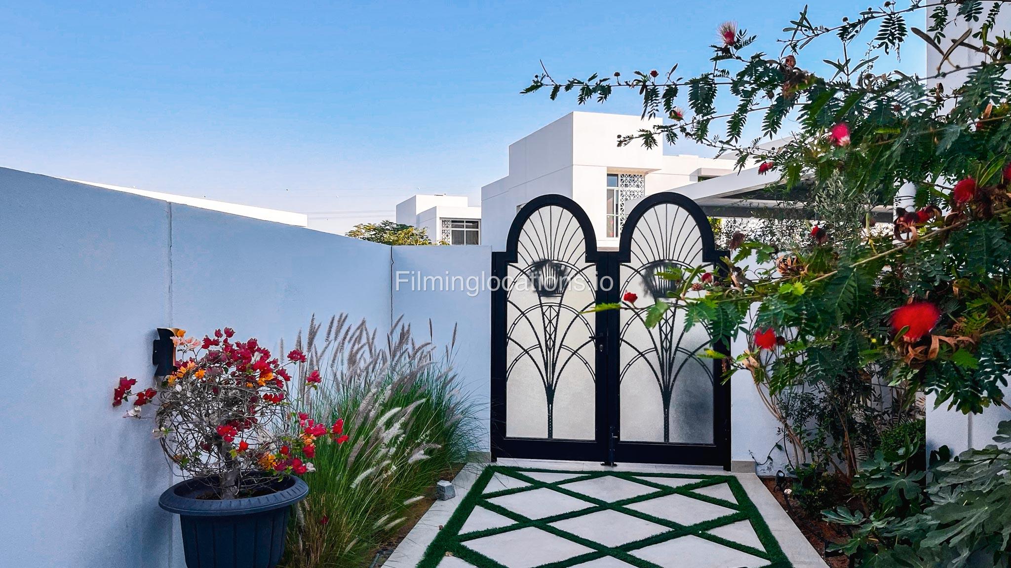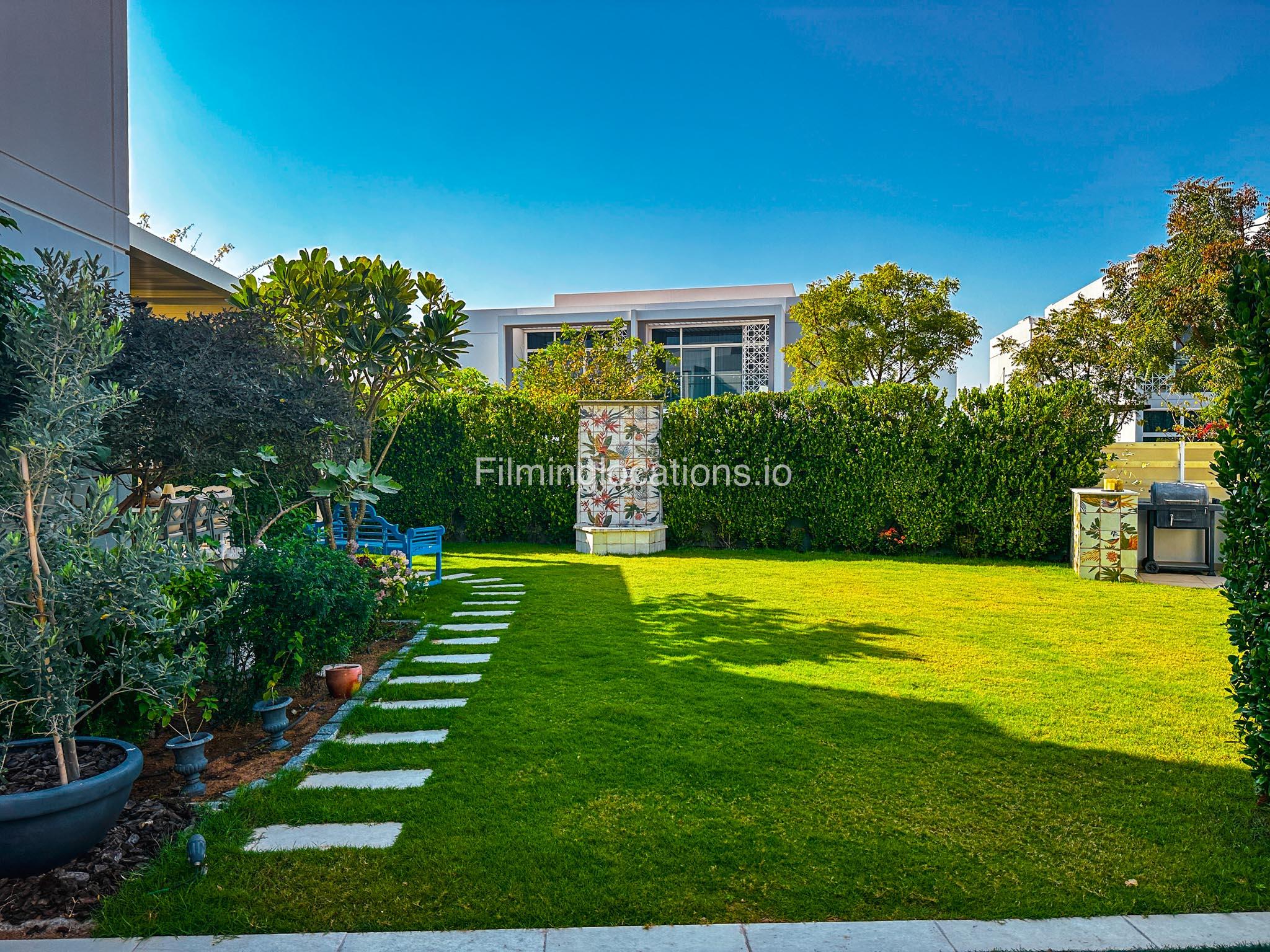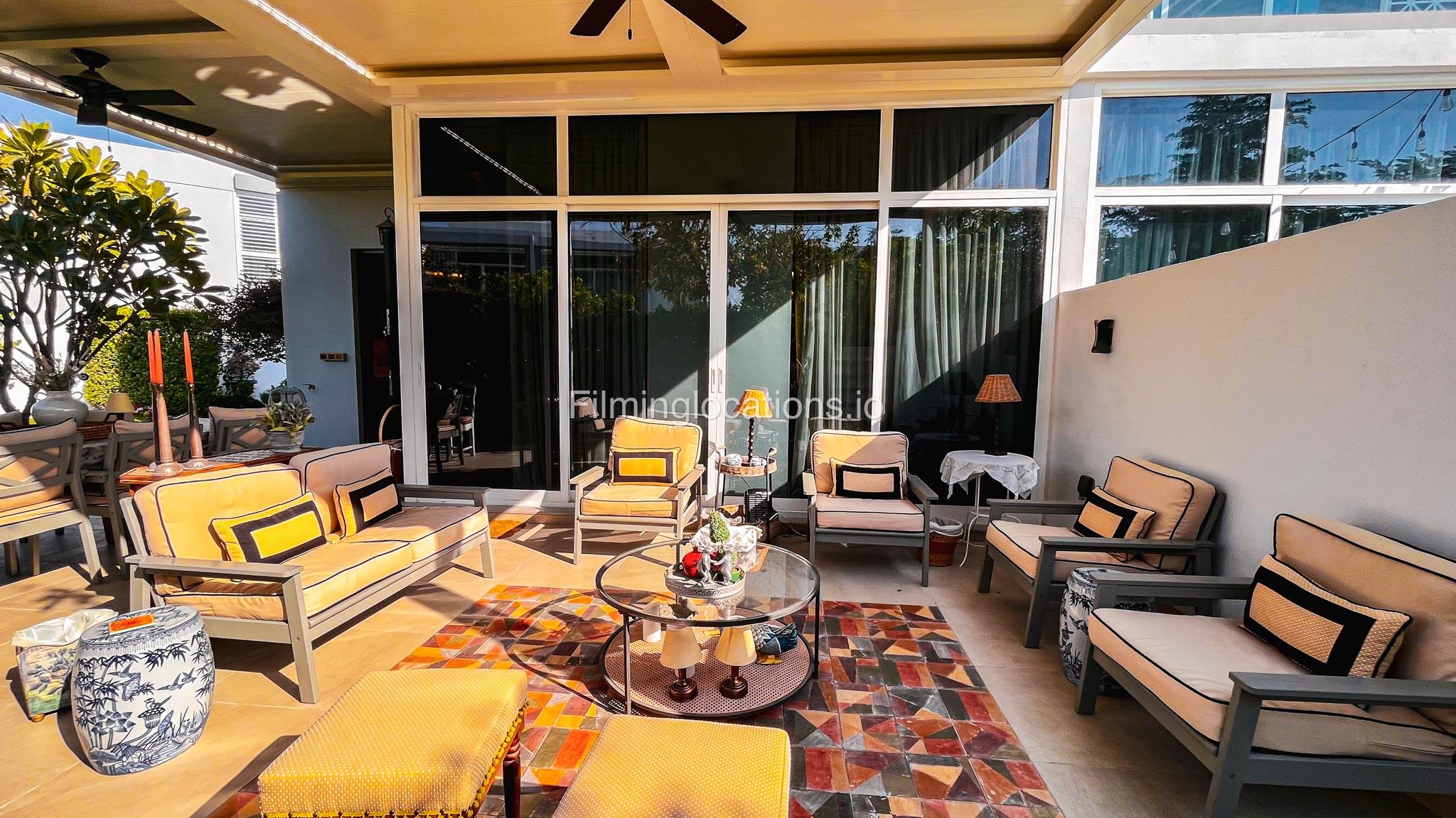 The colorful living room seamlessly integrates a stylish dining area, creating a welcoming space for any type of production. Villa has sleek and modern kitchen with straight access to the garden which can be perfect for filmmakers. The grand foyer welcomes you with its exquisite decor, and elegant lighting, setting the tone for the rest of the home. This cozy and well-appointed guest bedroom features a comfortable bed, and a spacious wardrobe. The chic powder room boasts sleek finishes and stylish space for guests.