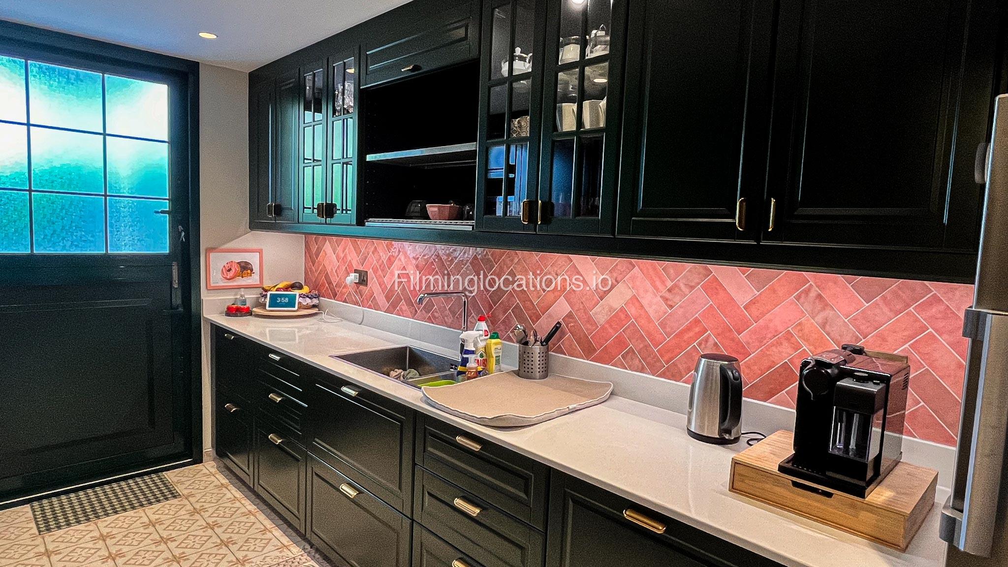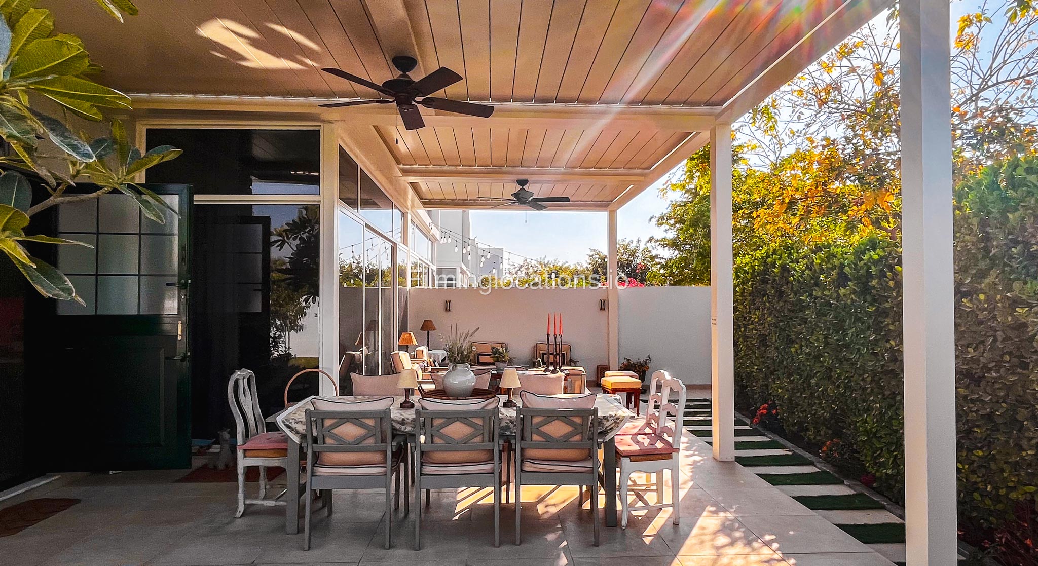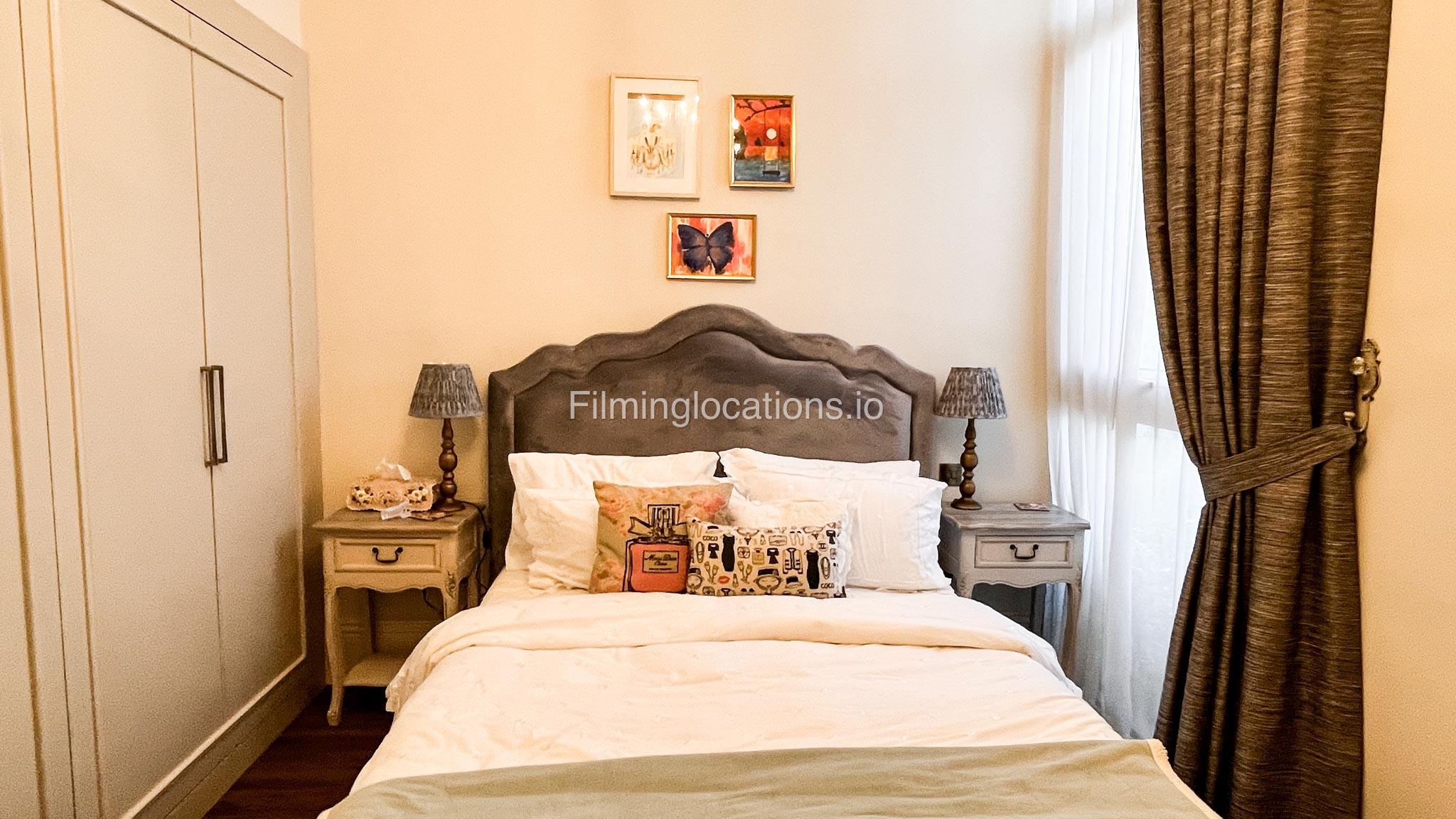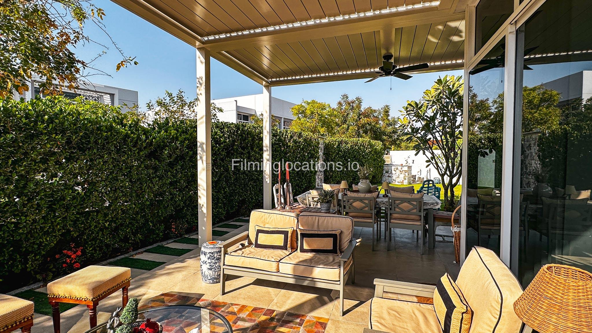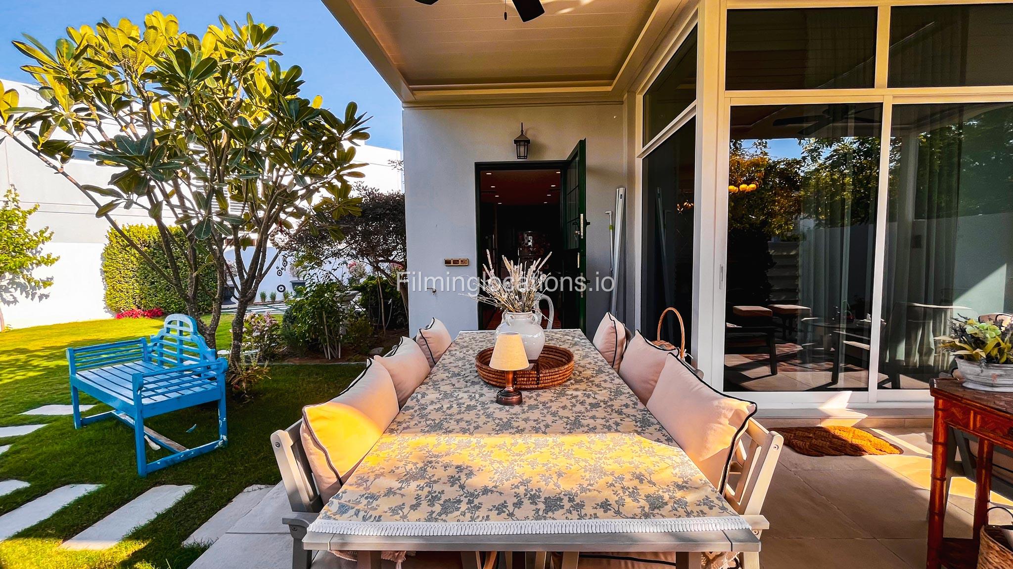 The colorful living room seamlessly integrates a stylish dining area, creating a welcoming space for any type of production. Villa has sleek and modern kitchen with straight access to the garden which can be perfect for filmmakers. The grand foyer welcomes you with its exquisite decor, and elegant lighting, setting the tone for the rest of the home. This cozy and well-appointed guest bedroom features a comfortable bed, and a spacious wardrobe. The chic powder room boasts sleek finishes and stylish space for guests.