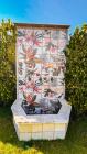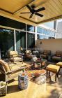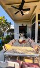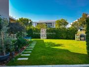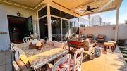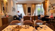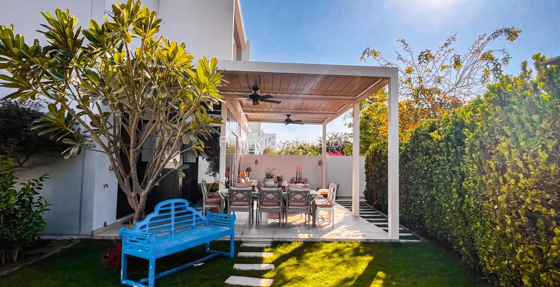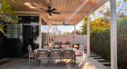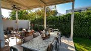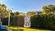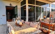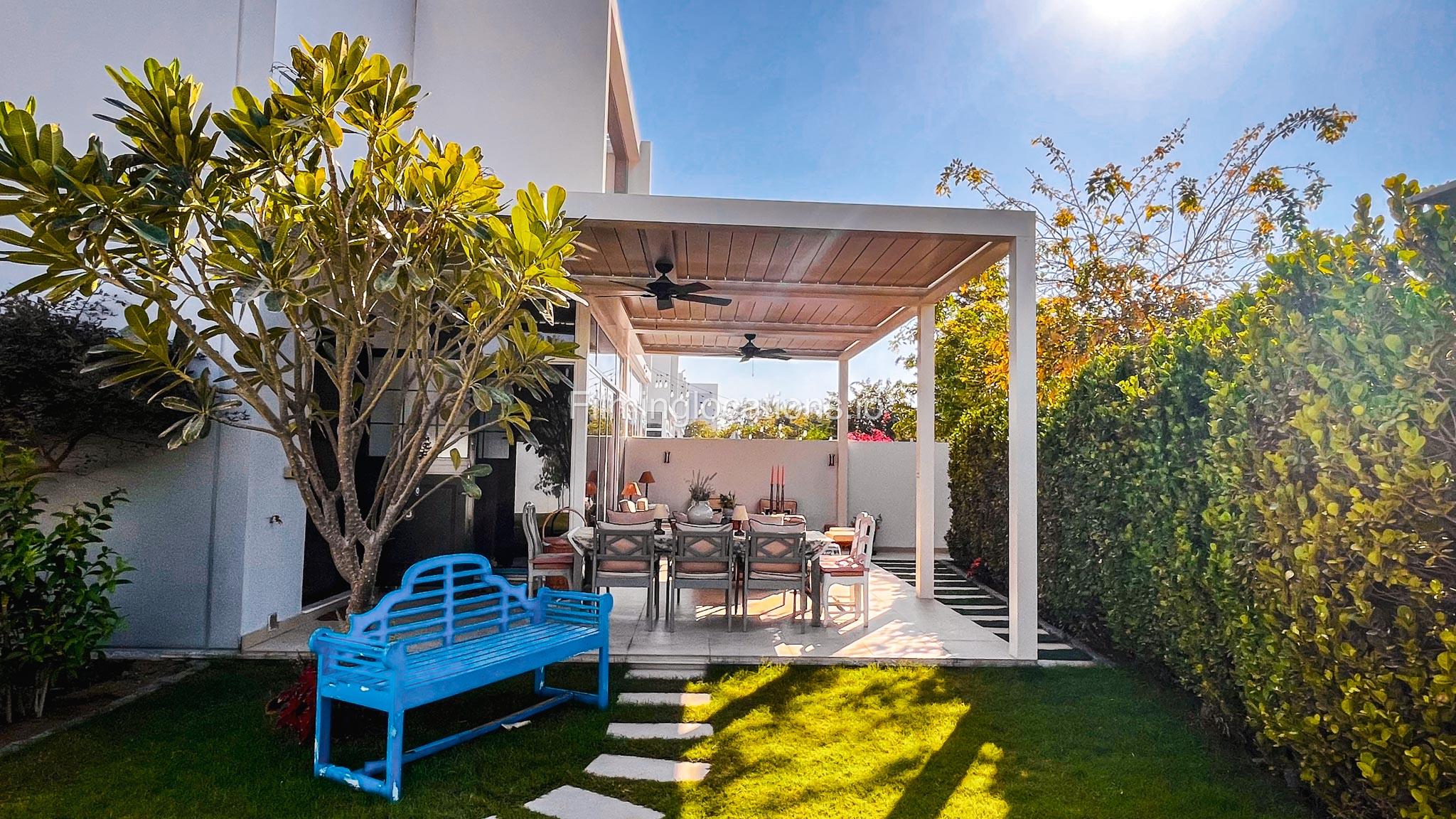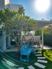 The lush garden and outside dining area provide a serene and inviting atmosphere.