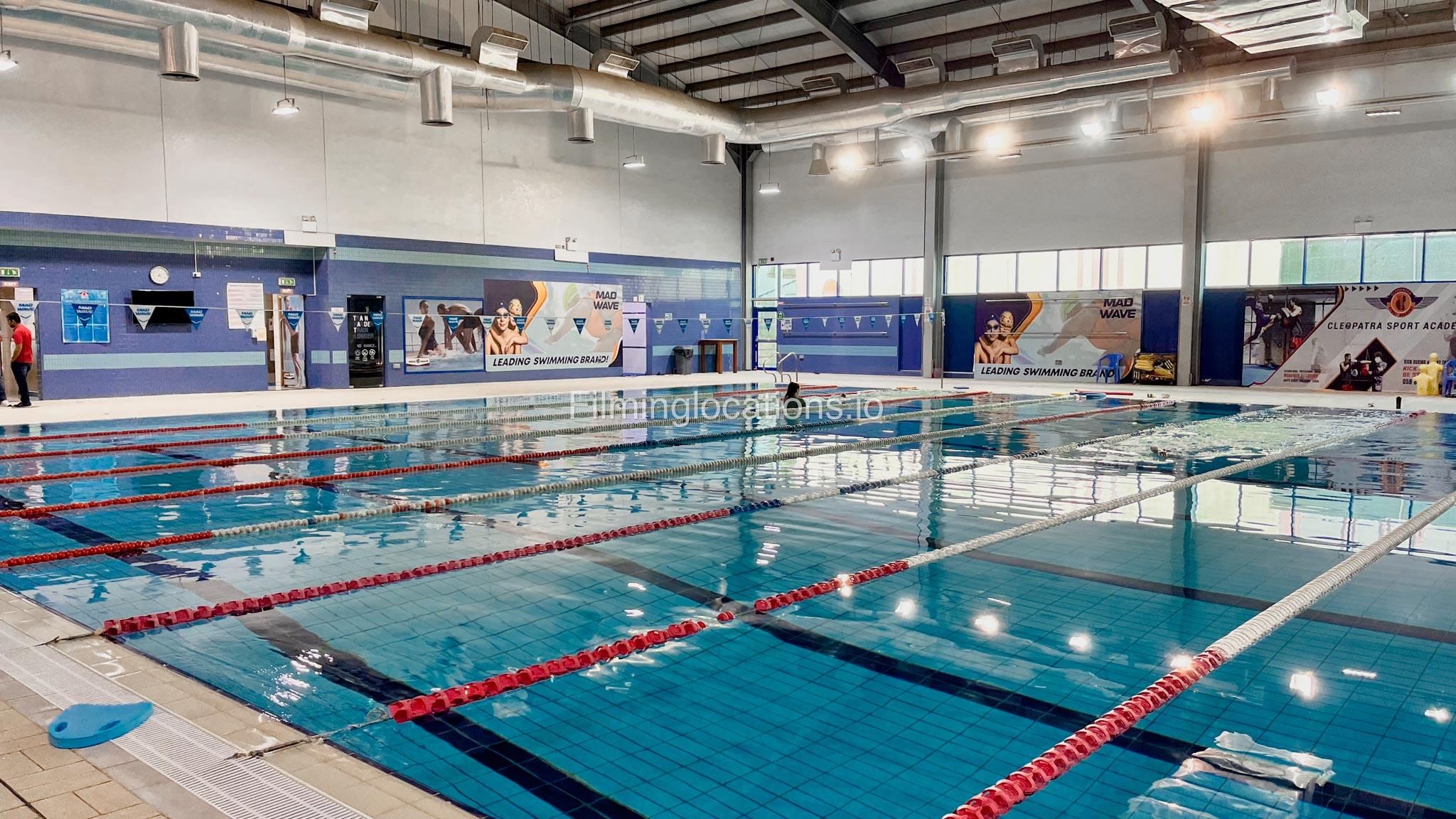 A sprawling indoor swimming pool with dedicated lanes for professional swimming, offering ample space to accommodate a large number of individuals. Additionally, it provides convenient dressing rooms for use during filming sessions.