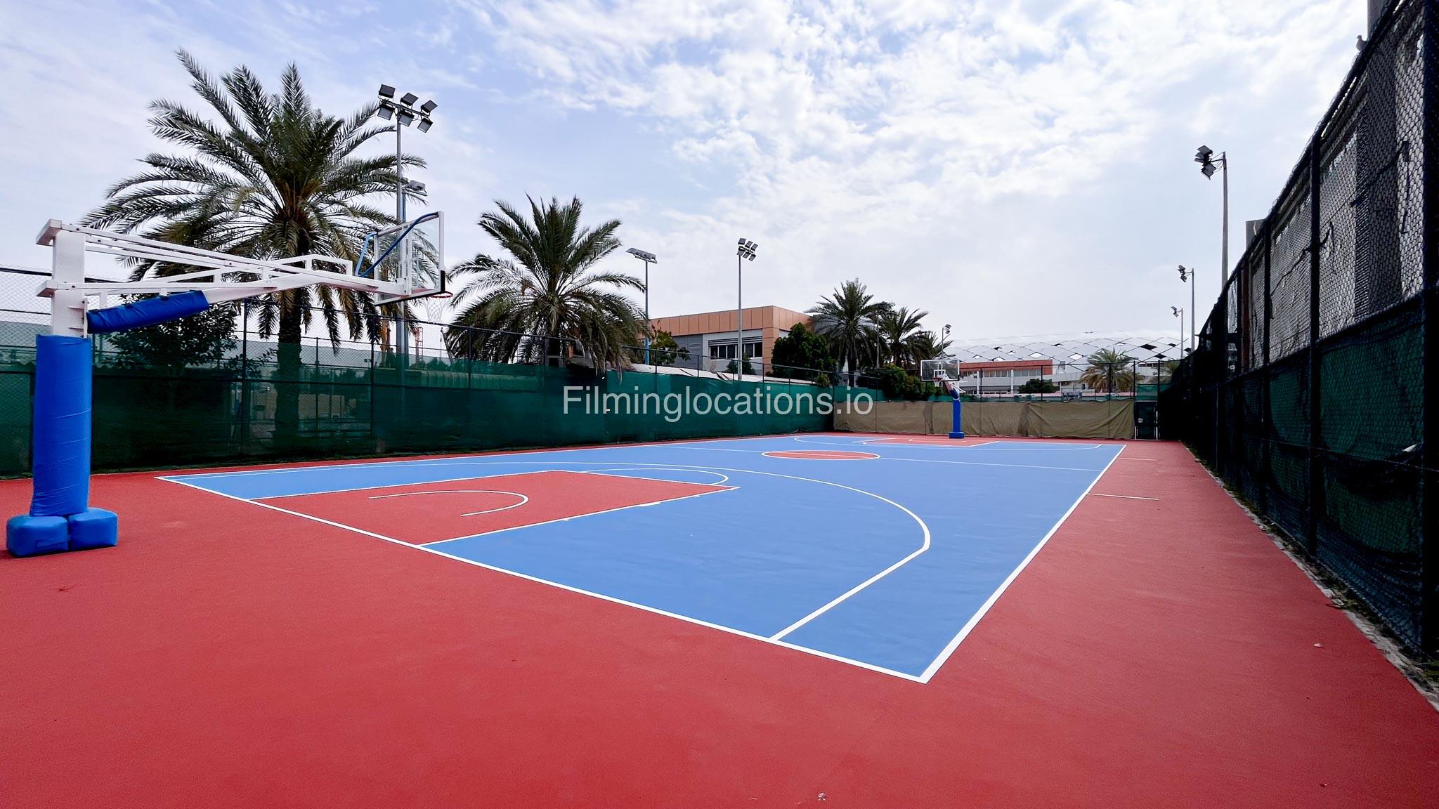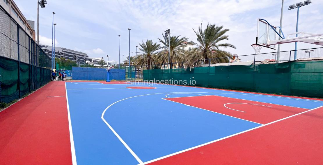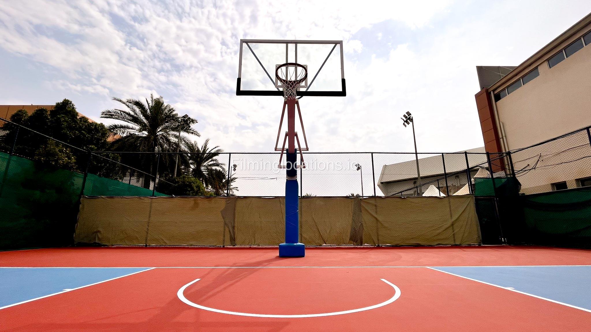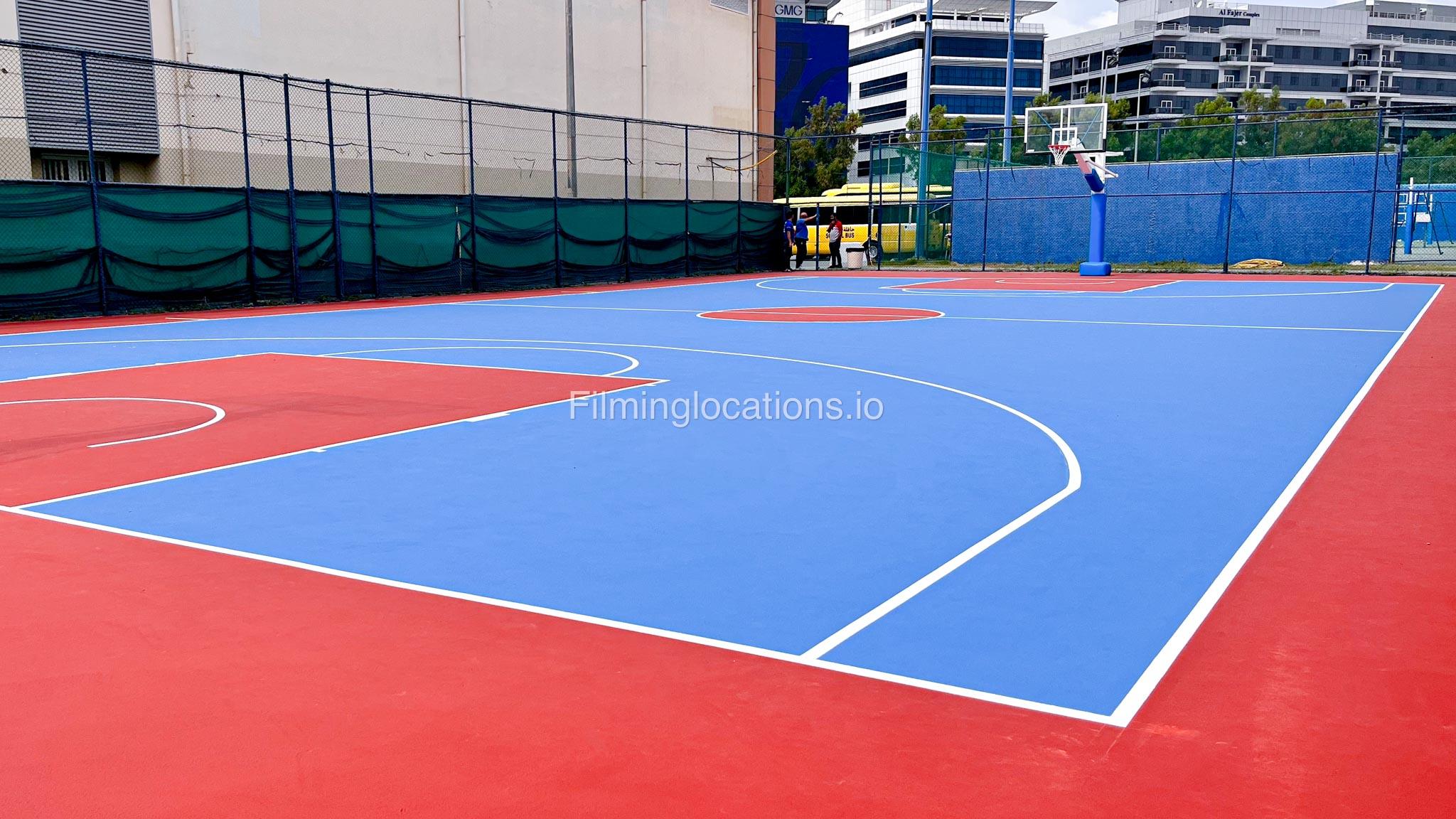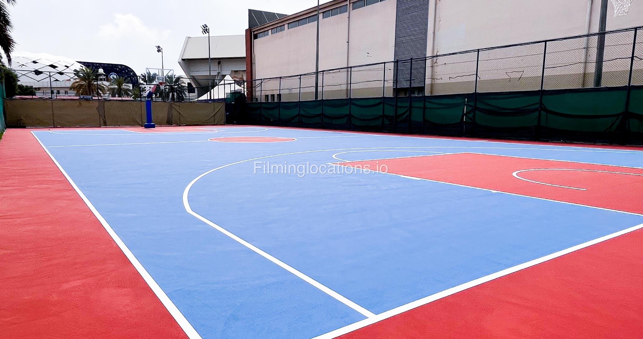 A vast basketball court offers wide space that can accommodate a significant number of people, making it an ideal location for filming.