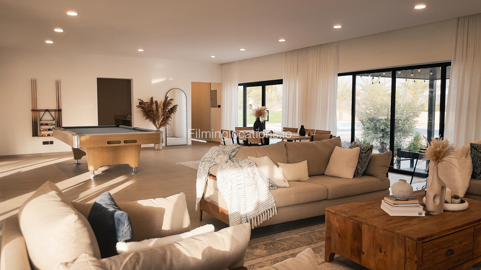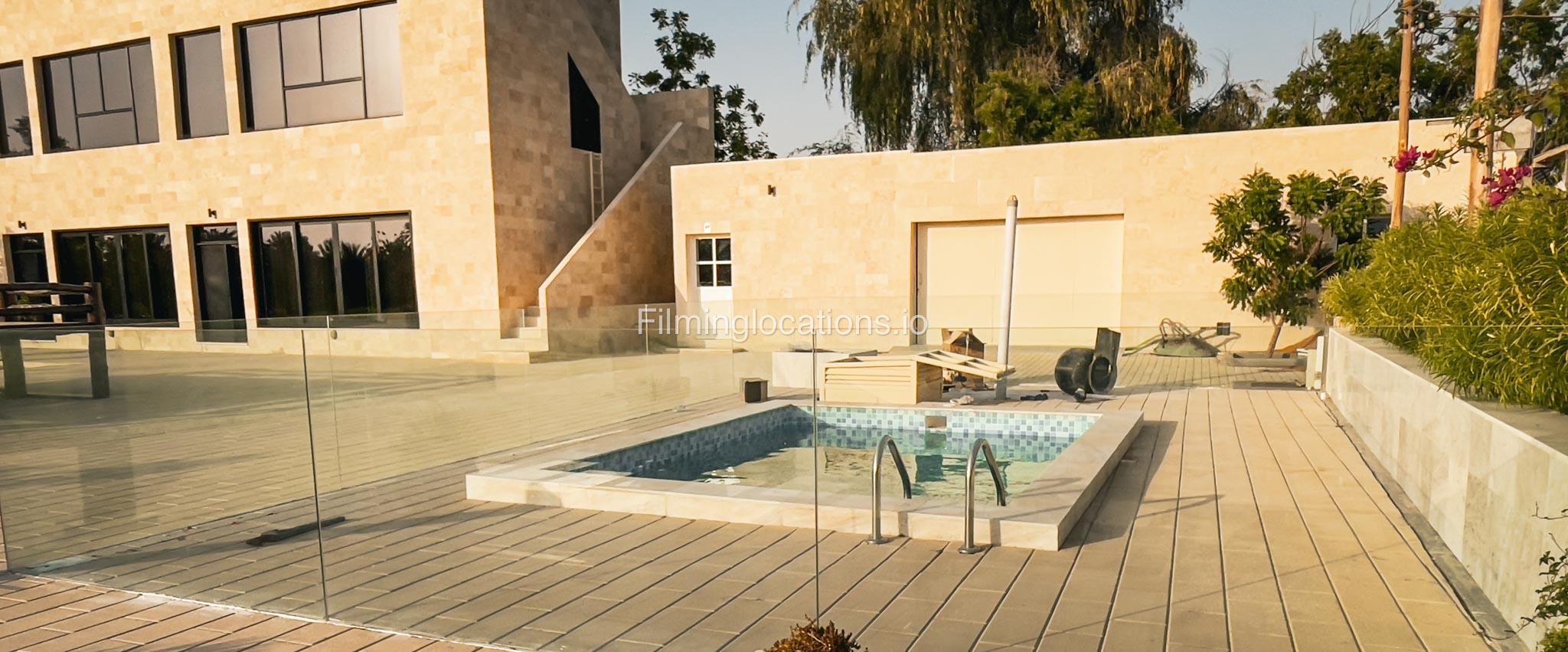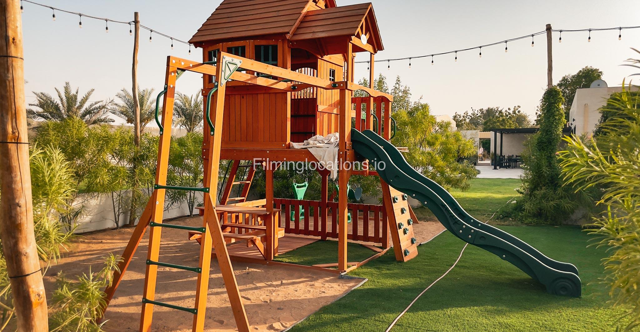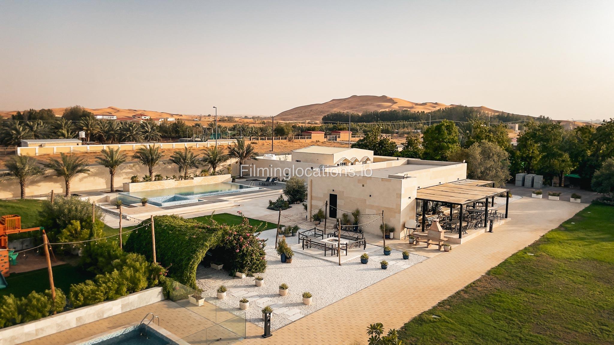 Our animal Farm located in Sharjah serves as an exceptional filming and event location featuring a swimming pool with two BBQ areas, a majestic Majlis on the rooftop, and a relaxing terrace. It offers a spacious lounge, five duplex rooms, four bathrooms, two kitchens, and a maid's room. The living area is equipped with a pool table, providing a recreational space for the crew. Outside, there is a dedicated kids' play area and a sprawling lawn capable of accommodating more than 1000 people. Notably, the outdoor area is equipped with air conditioning, ensuring a comfortable environment for film crew and any kind of celebration. Additionally, the Farm a short two-minute walk away from the desert provides a stunning backdrop for various scenes.