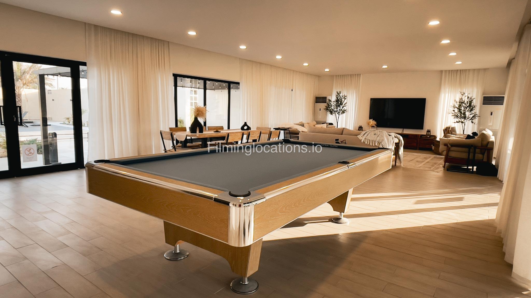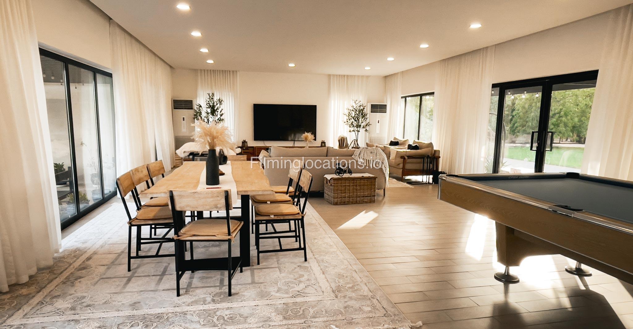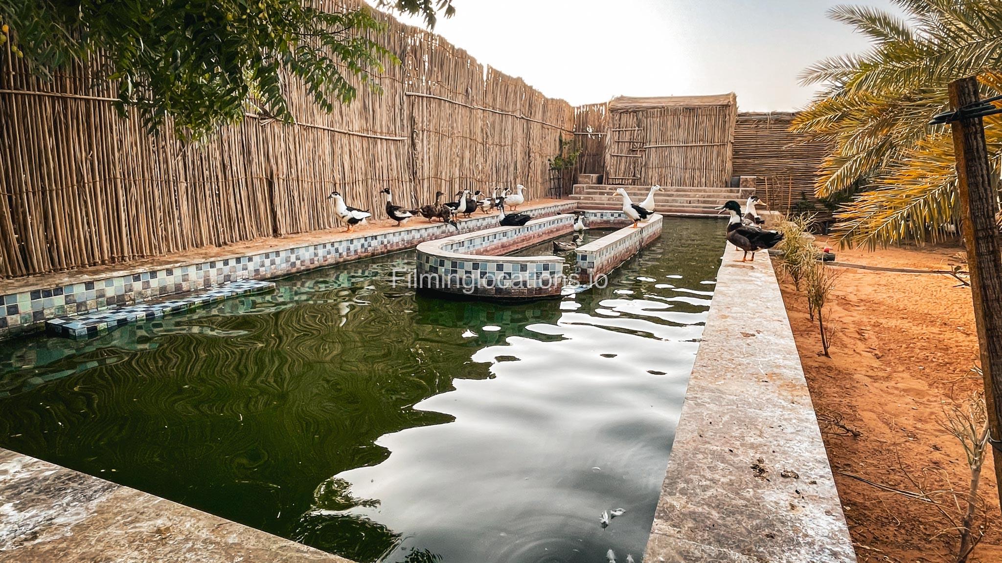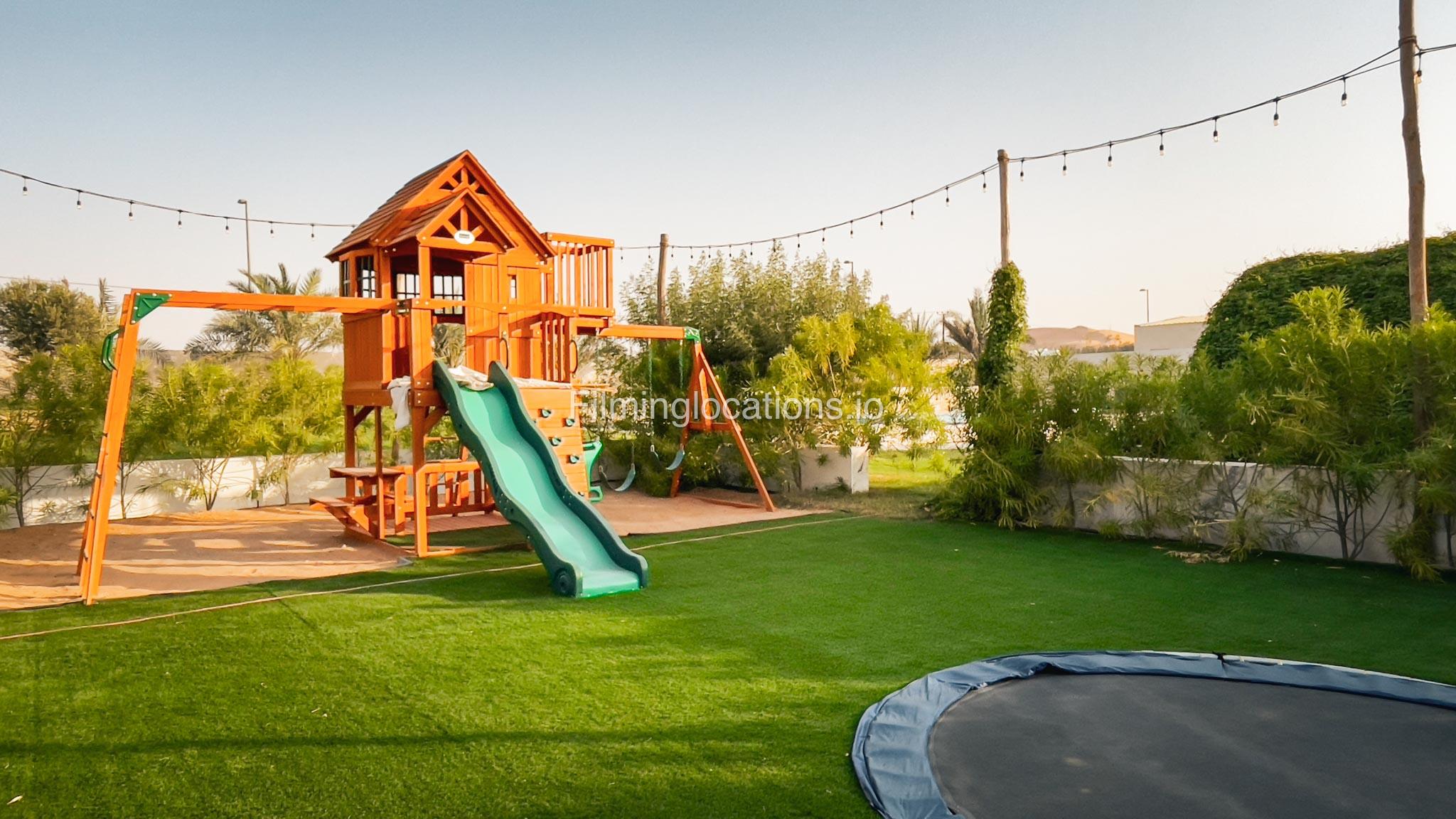 Our animal Farm located in Sharjah serves as an exceptional filming and event location featuring a swimming pool with two BBQ areas, a majestic Majlis on the rooftop, and a relaxing terrace. It offers a spacious lounge, five duplex rooms, four bathrooms, two kitchens, and a maid's room. The living area is equipped with a pool table, providing a recreational space for the crew. Outside, there is a dedicated kids' play area and a sprawling lawn capable of accommodating more than 1000 people. Notably, the outdoor area is equipped with air conditioning, ensuring a comfortable environment for film crew and any kind of celebration. Additionally, the Farm a short two-minute walk away from the desert provides a stunning backdrop for various scenes.