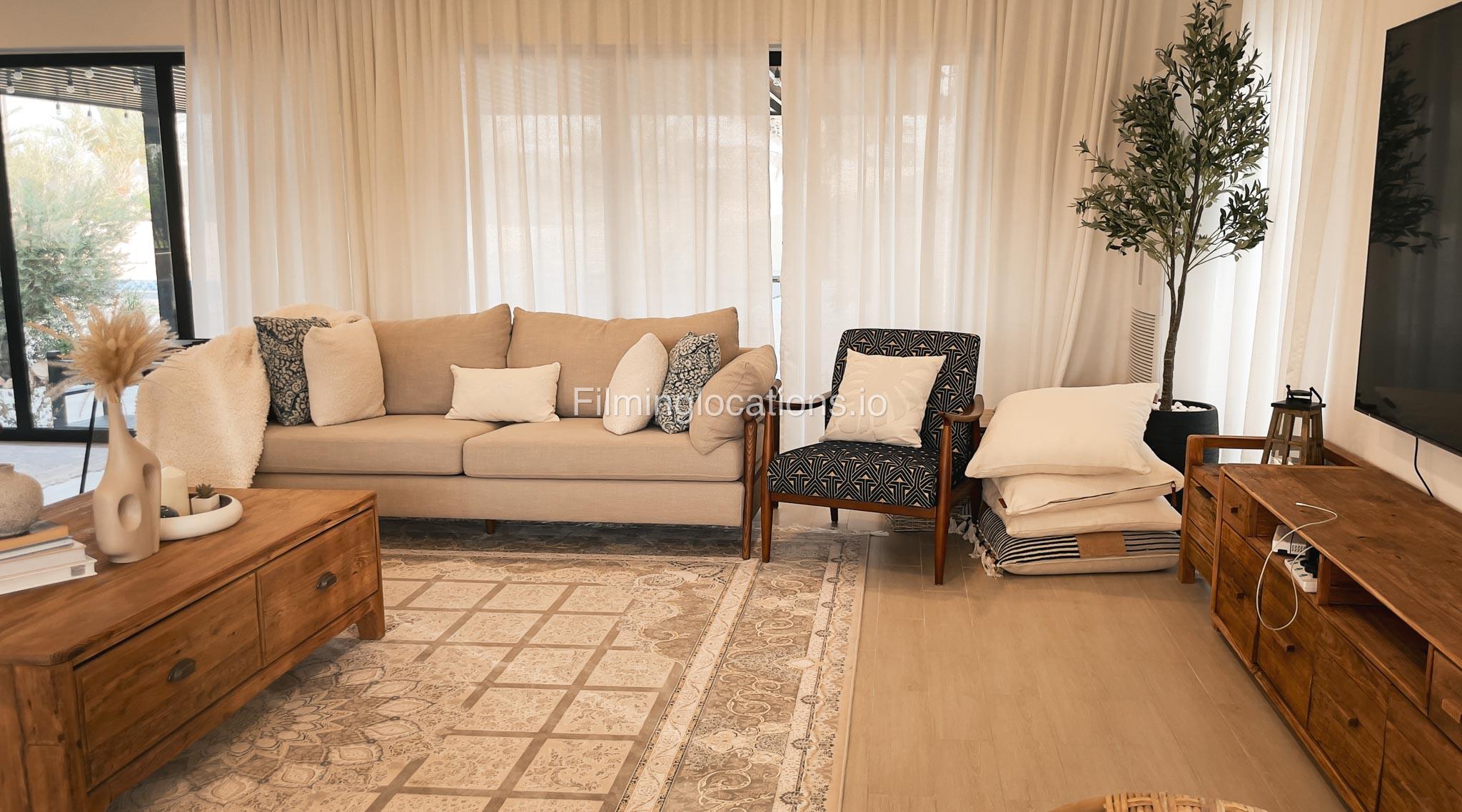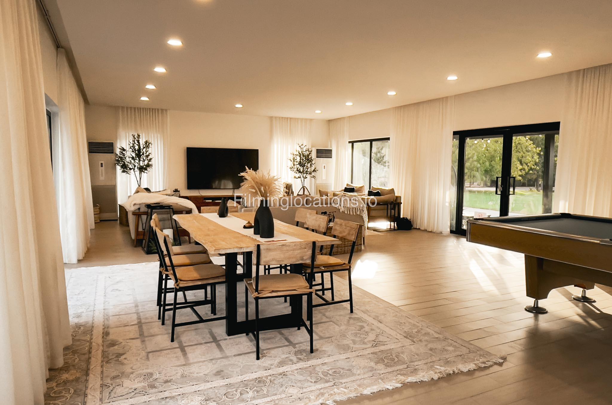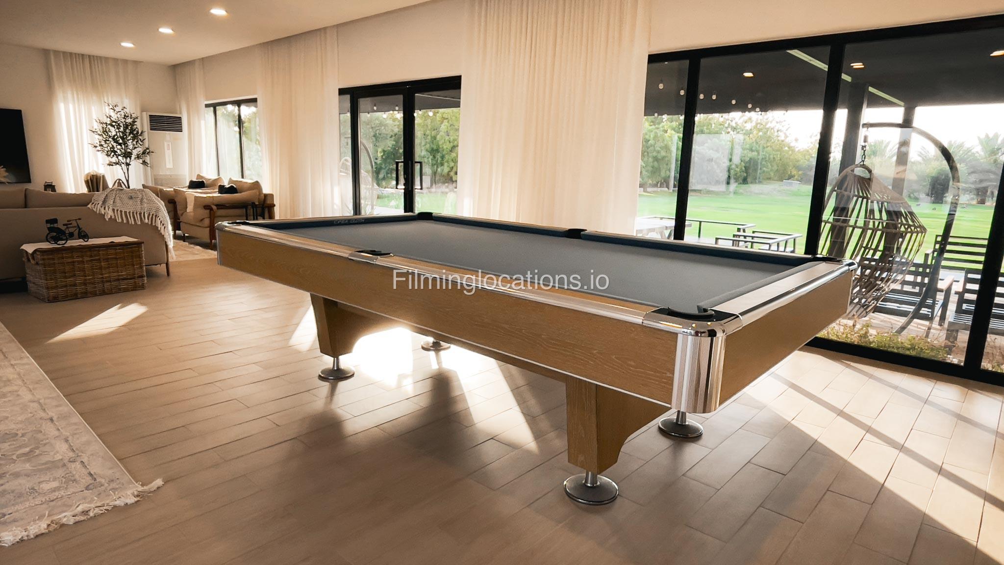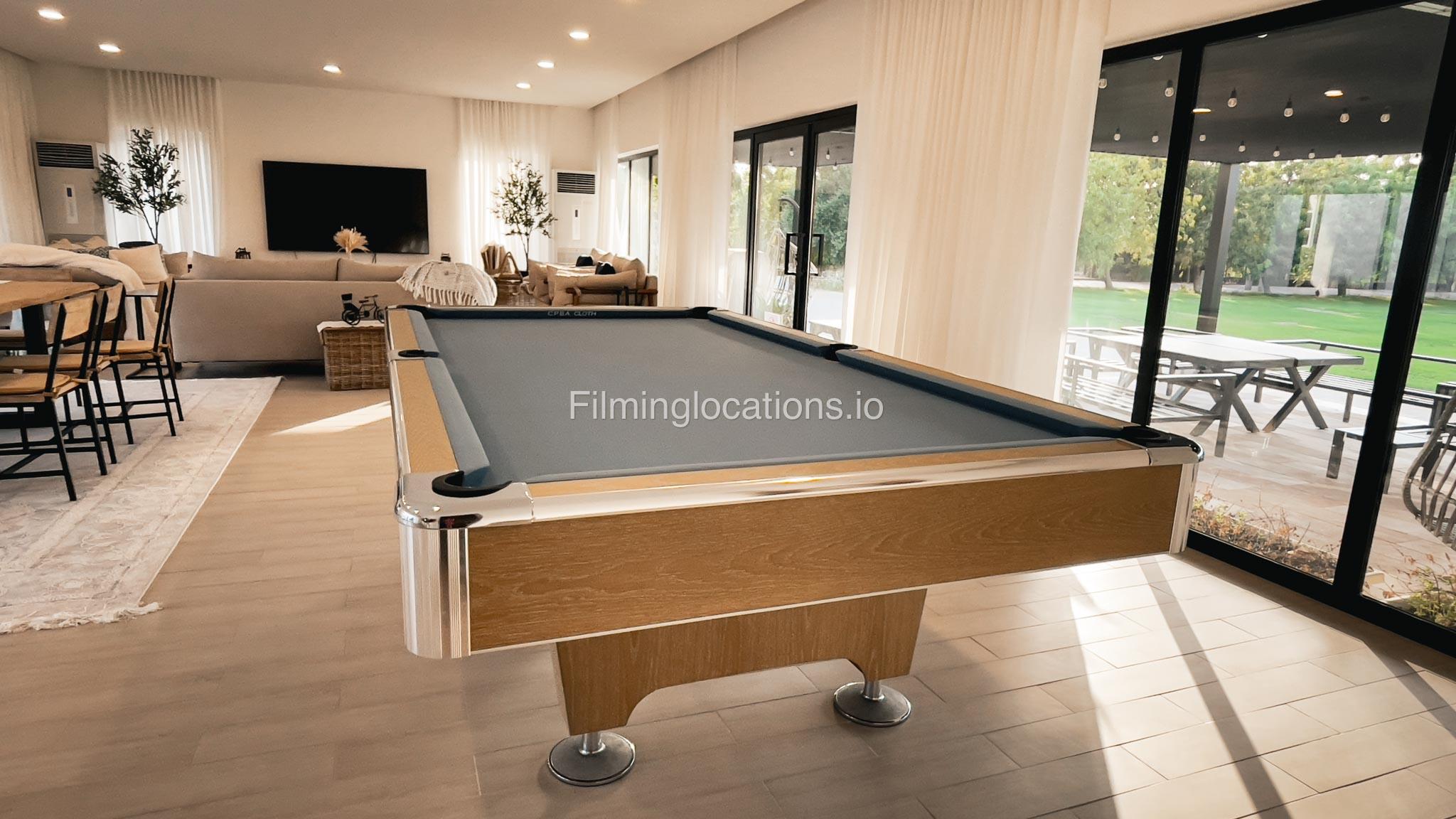 Our animal Farm located in Sharjah serves as an exceptional filming and event location featuring a swimming pool with two BBQ areas, a majestic Majlis on the rooftop, and a relaxing terrace. It offers a spacious lounge, five duplex rooms, four bathrooms, two kitchens, and a maid's room. The living area is equipped with a pool table, providing a recreational space for the crew. Outside, there is a dedicated kids' play area and a sprawling lawn capable of accommodating more than 1000 people. Notably, the outdoor area is equipped with air conditioning, ensuring a comfortable environment for film crew and any kind of celebration. Additionally, the Farm a short two-minute walk away from the desert provides a stunning backdrop for various scenes.