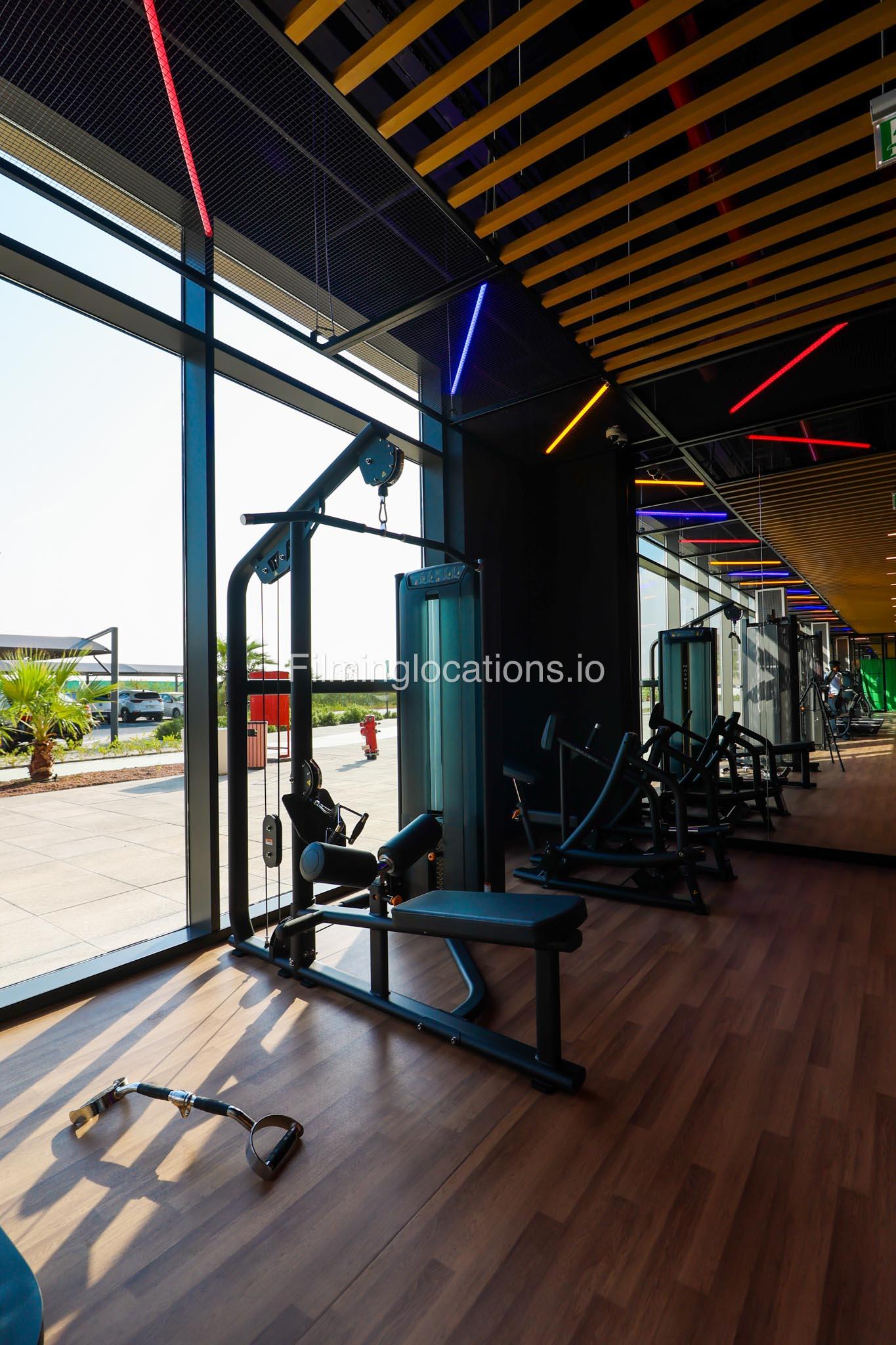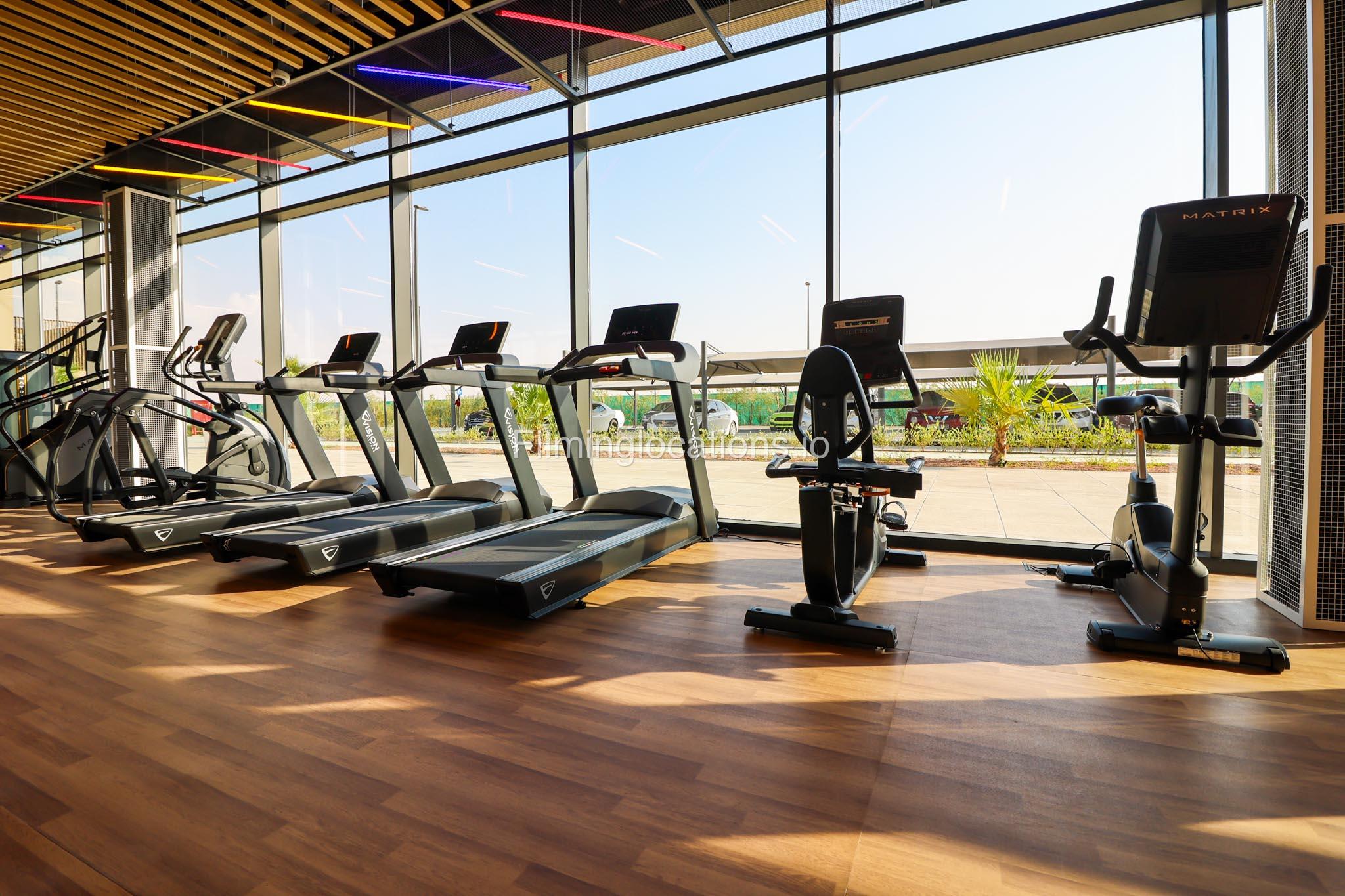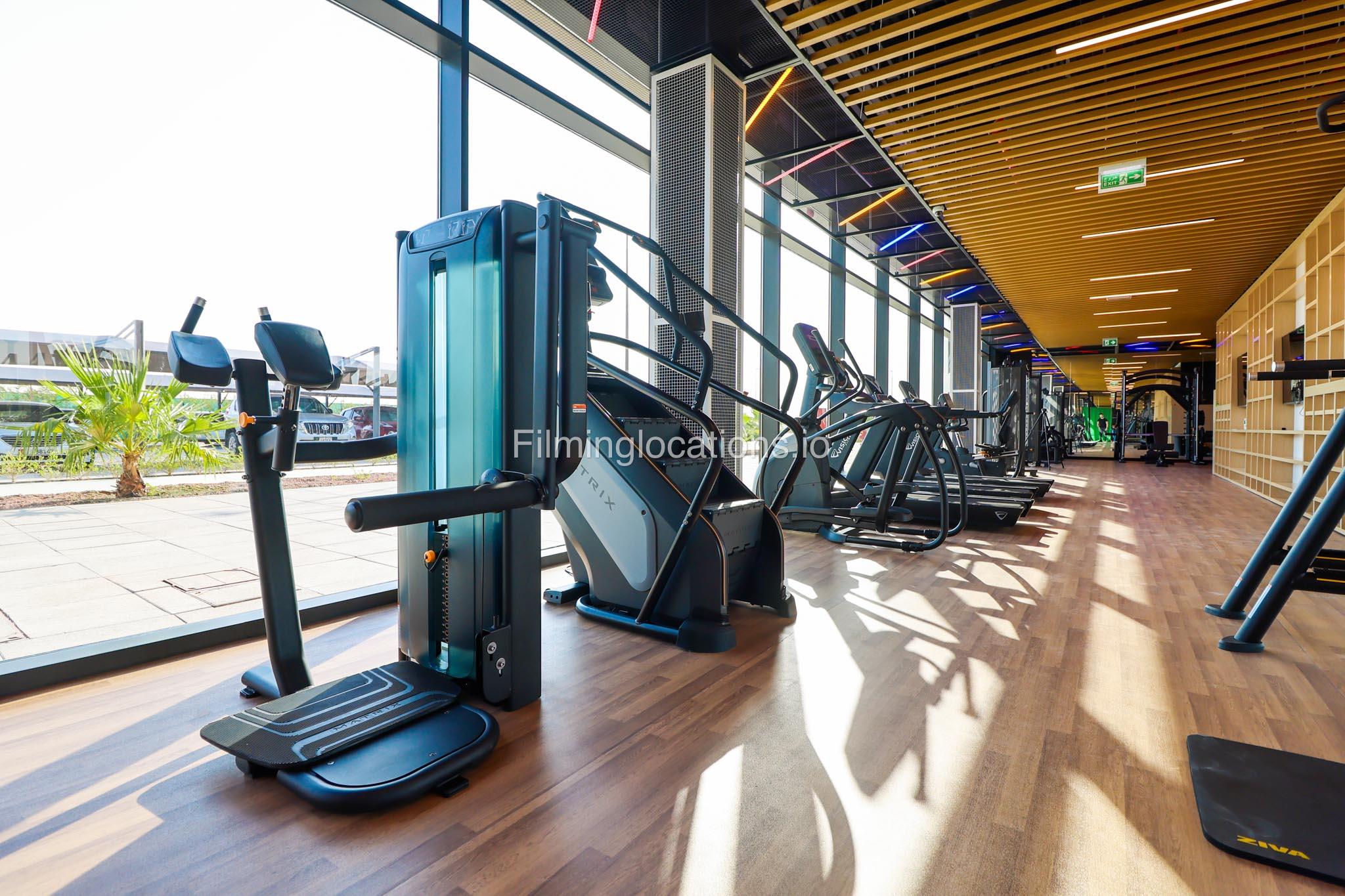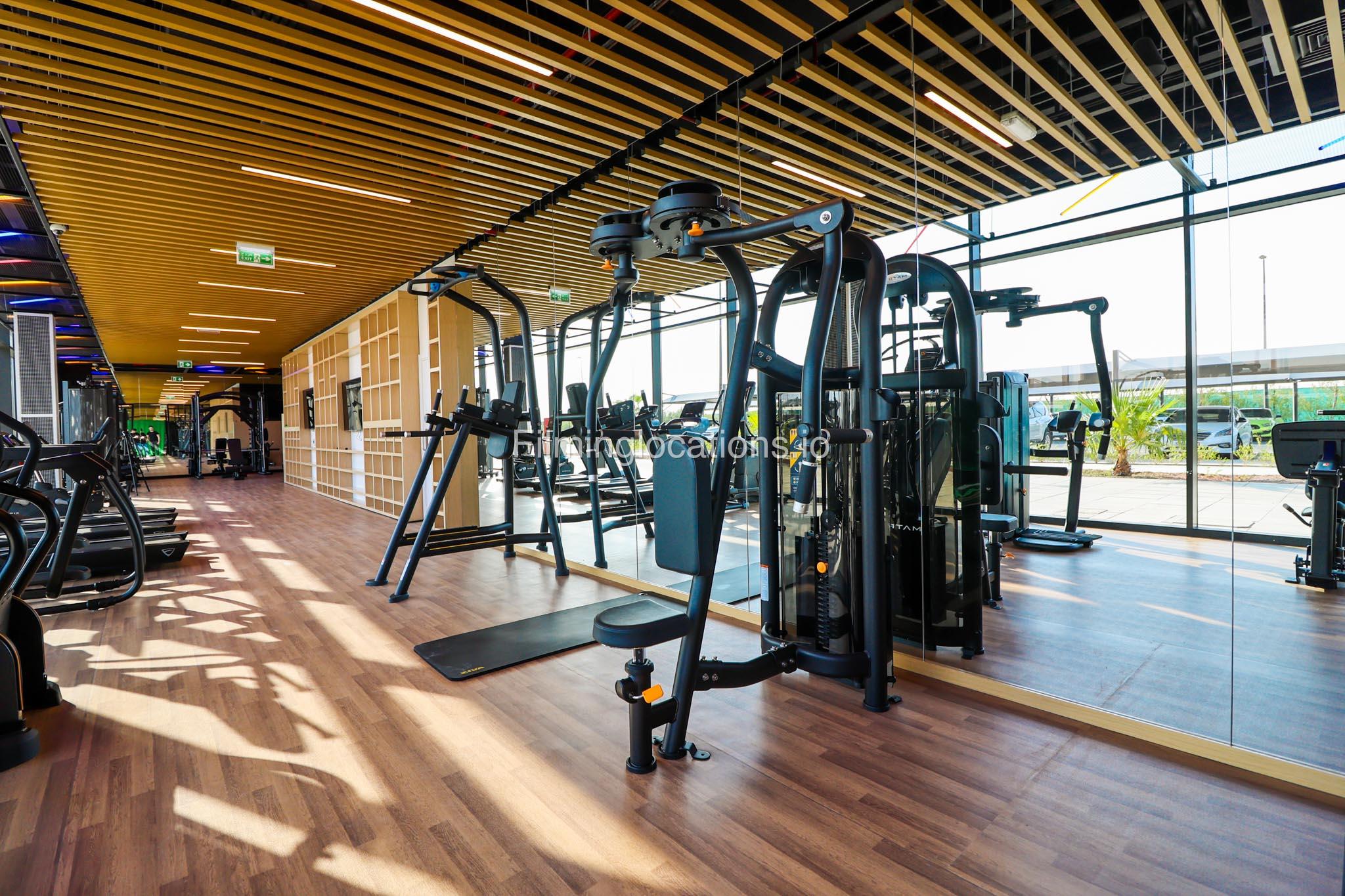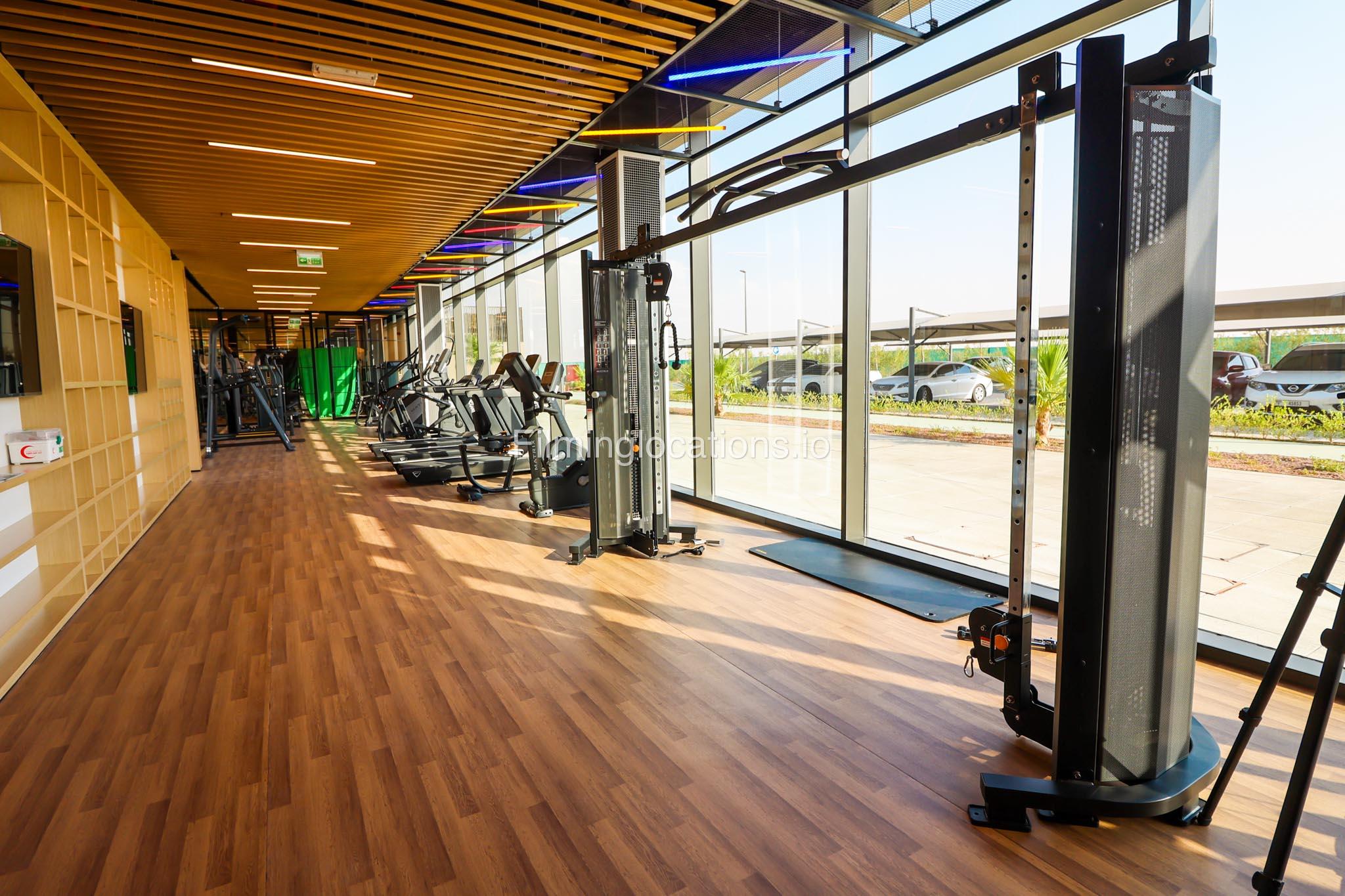 Our spacious Gym with Reception area is located in Sharjah. Spanning 185 sq.m., our facility offers an outdoor sitting area, shower cabins, and large fitness are fully equipment suitable for any size of production.