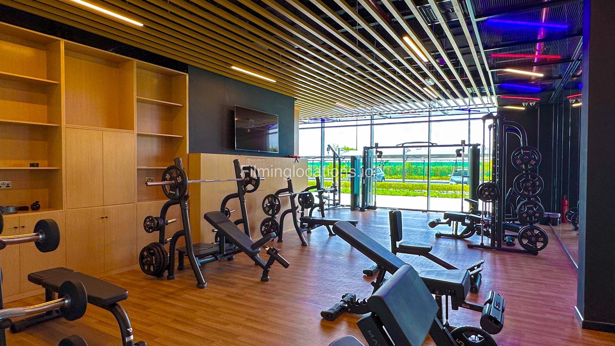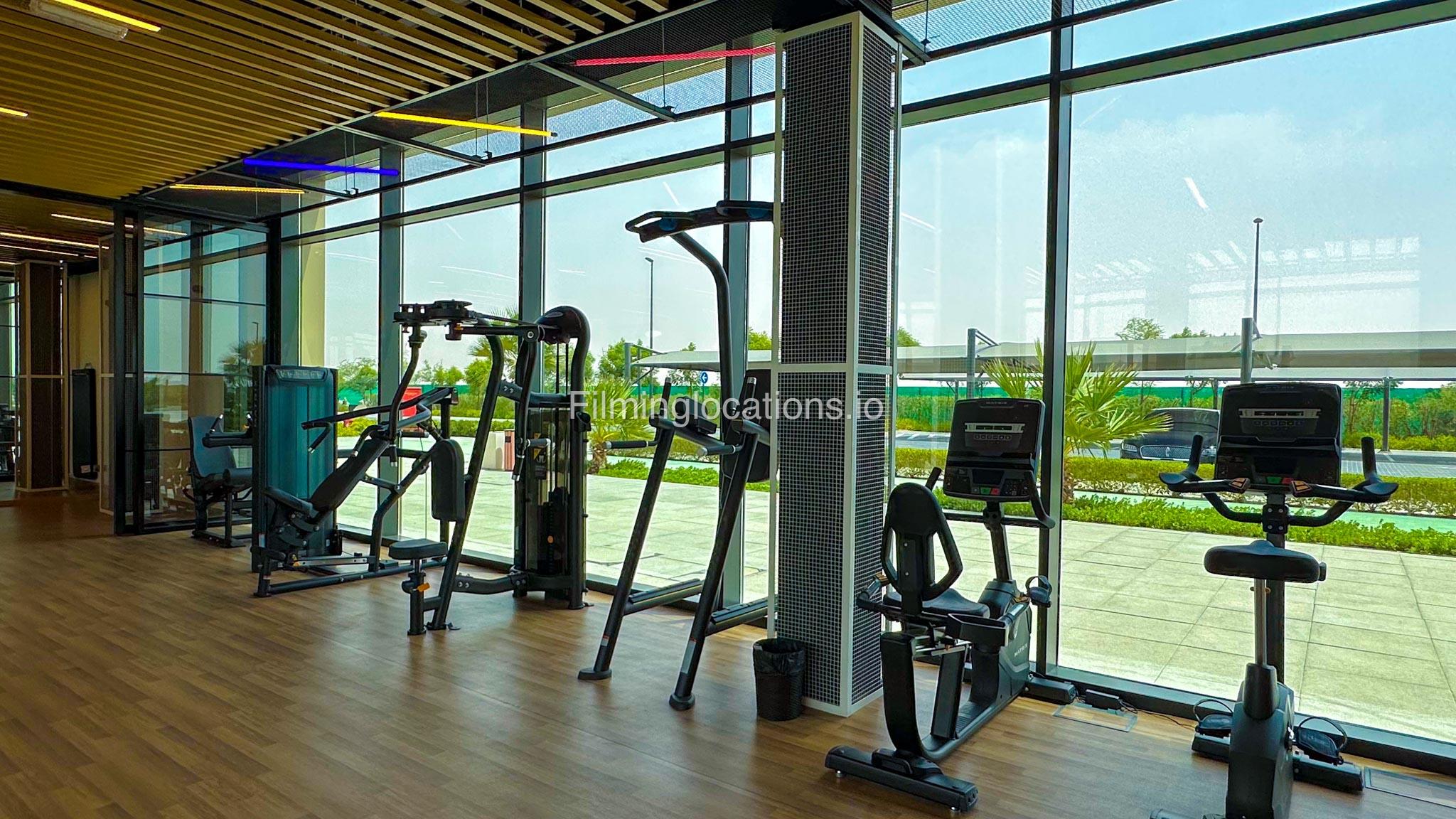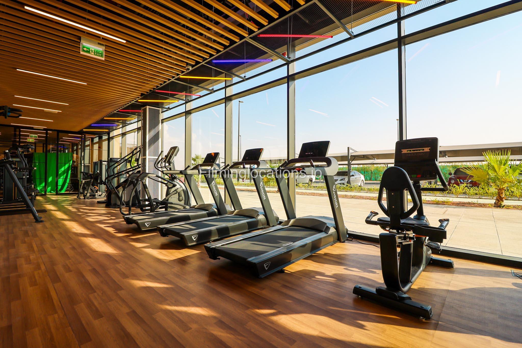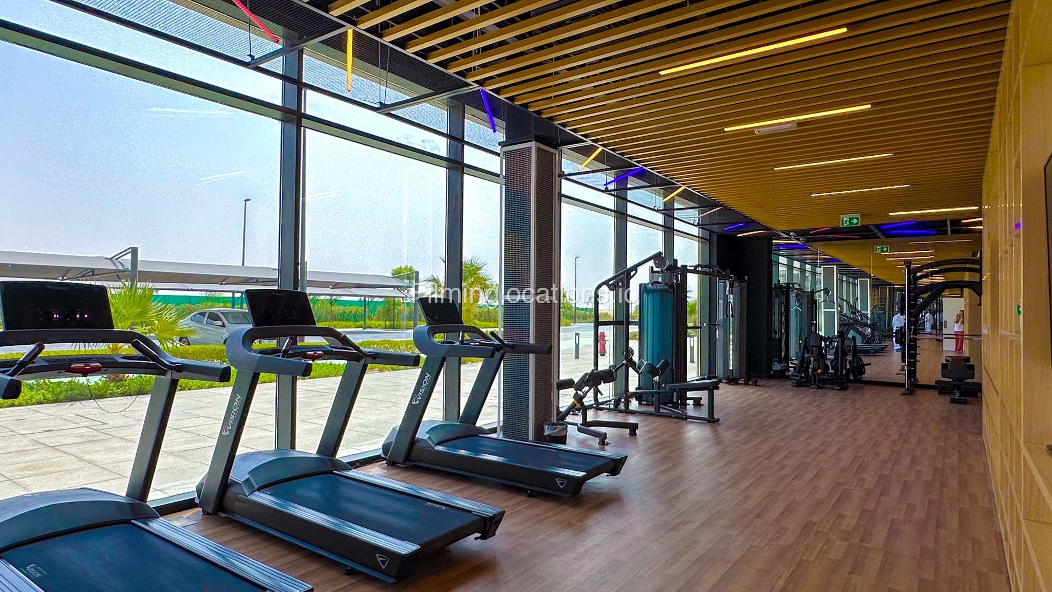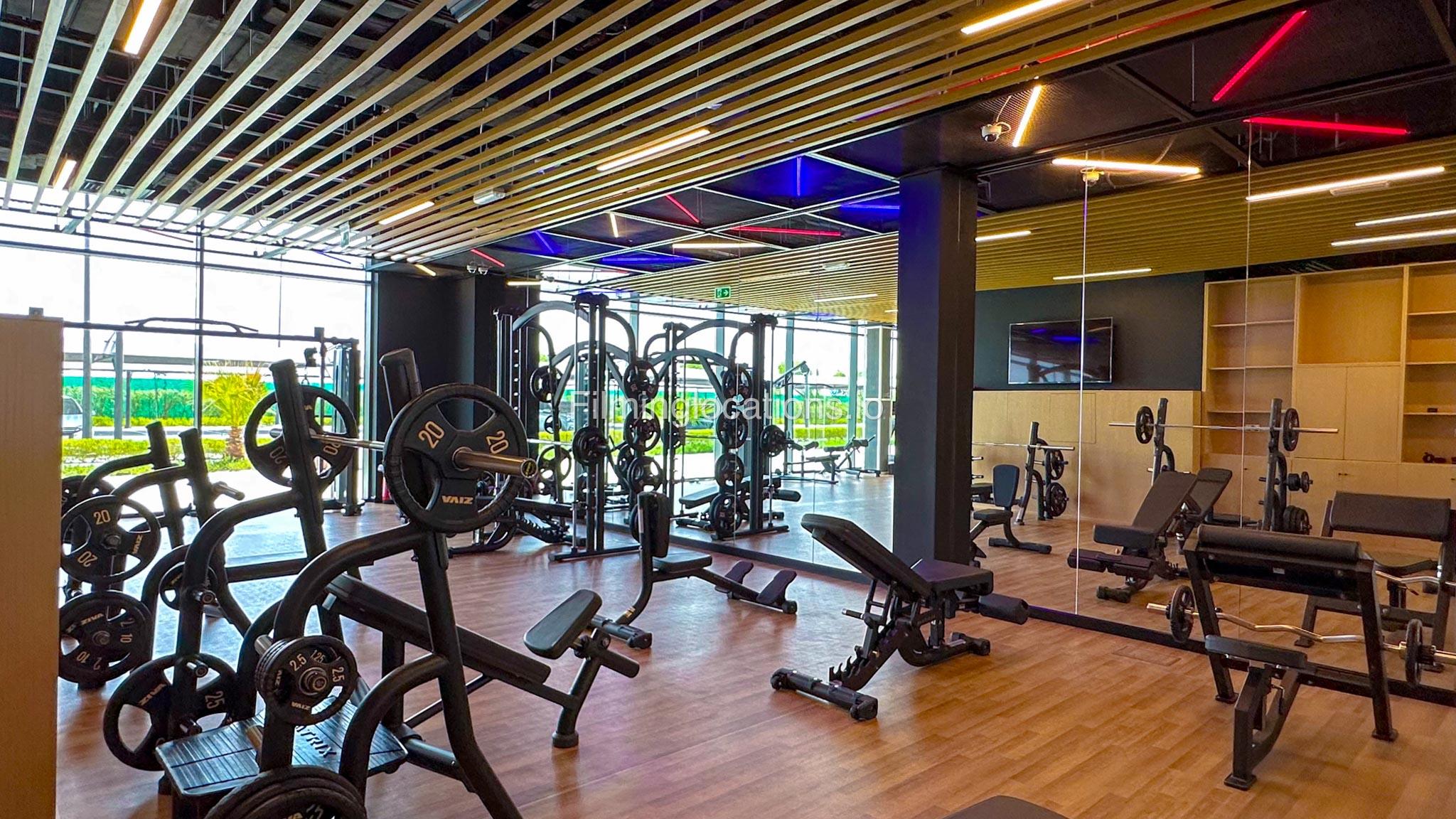 Our spacious Gym with Reception area is located in Sharjah. Spanning 185 sq.m., our facility offers an outdoor sitting area, shower cabins, and large fitness are fully equipment suitable for any size of production.