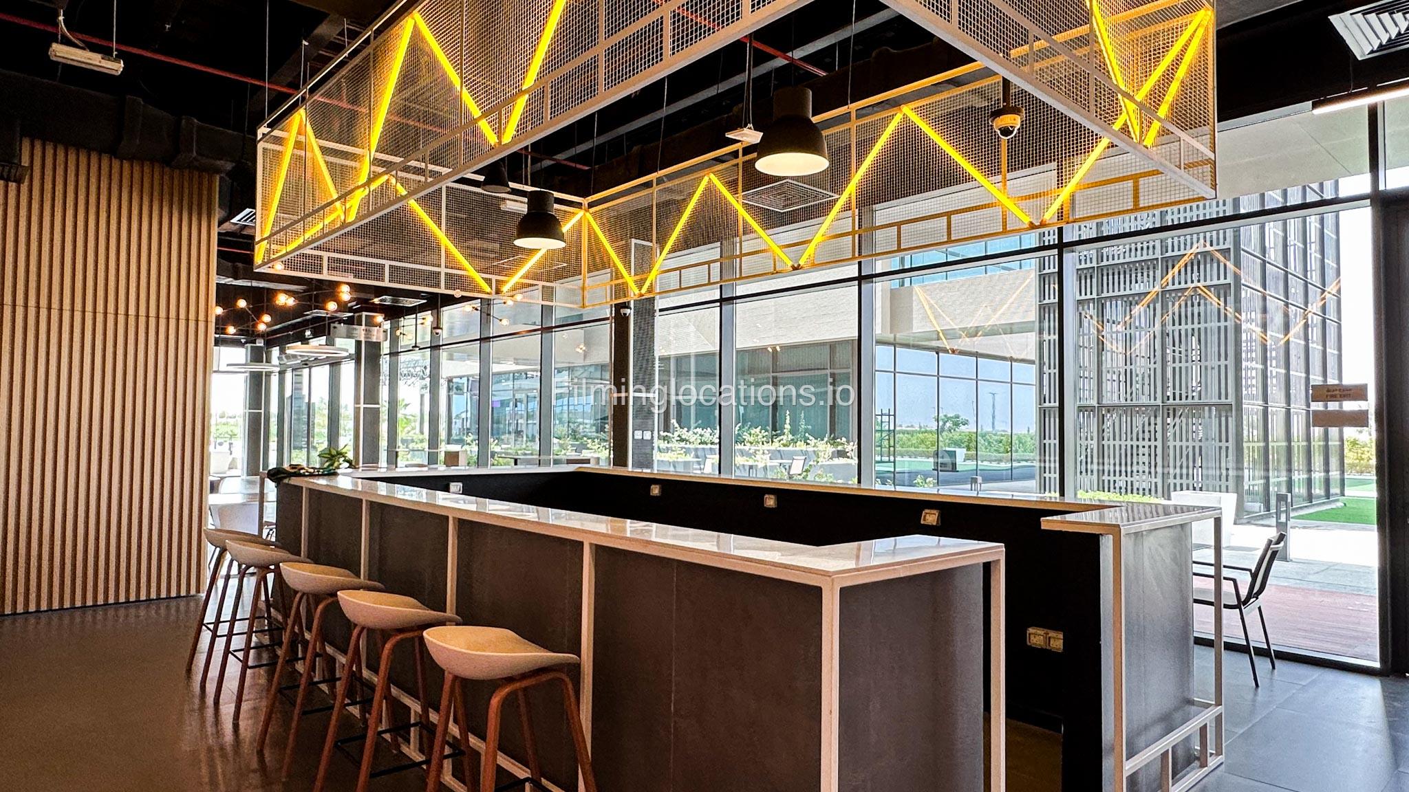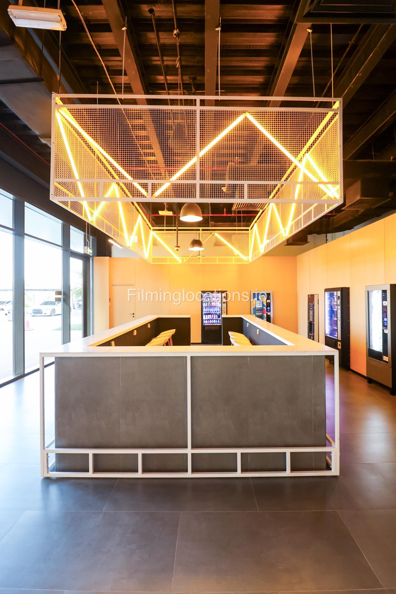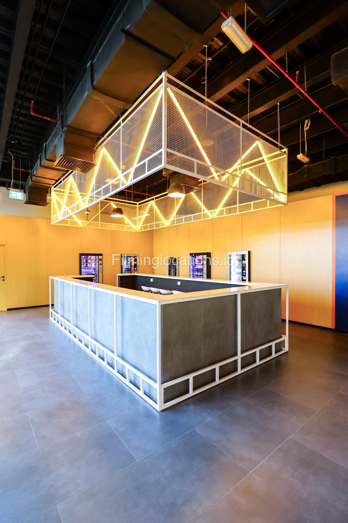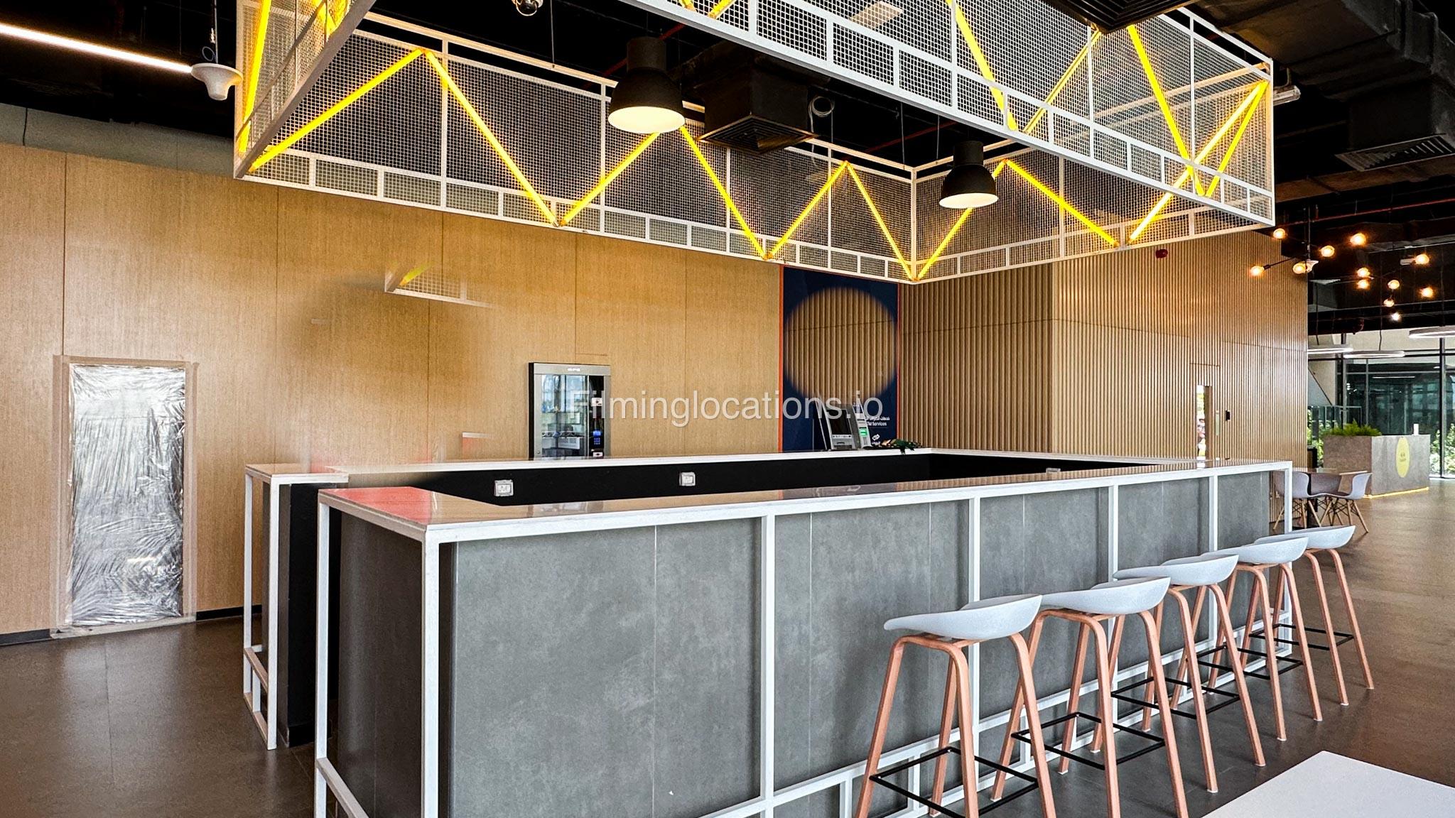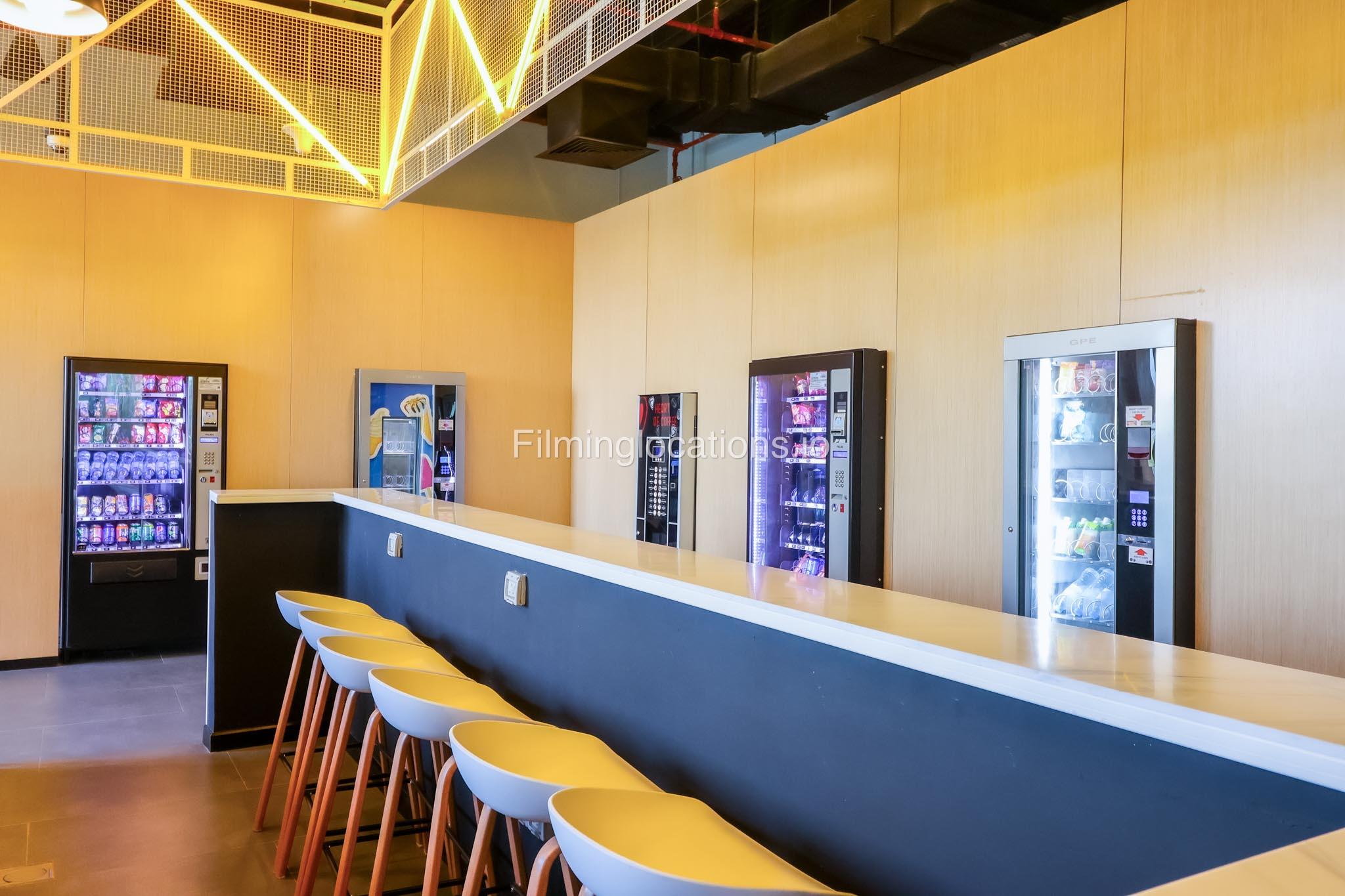 Our space features a multifunctional bar counter cum table, complete with bar stools for seating. Above it, there is a unique light fixture suspended from the ceiling. The space also includes four vending machines and an ATM machine. Furthermore, there are several tables and chairs throughout the area.