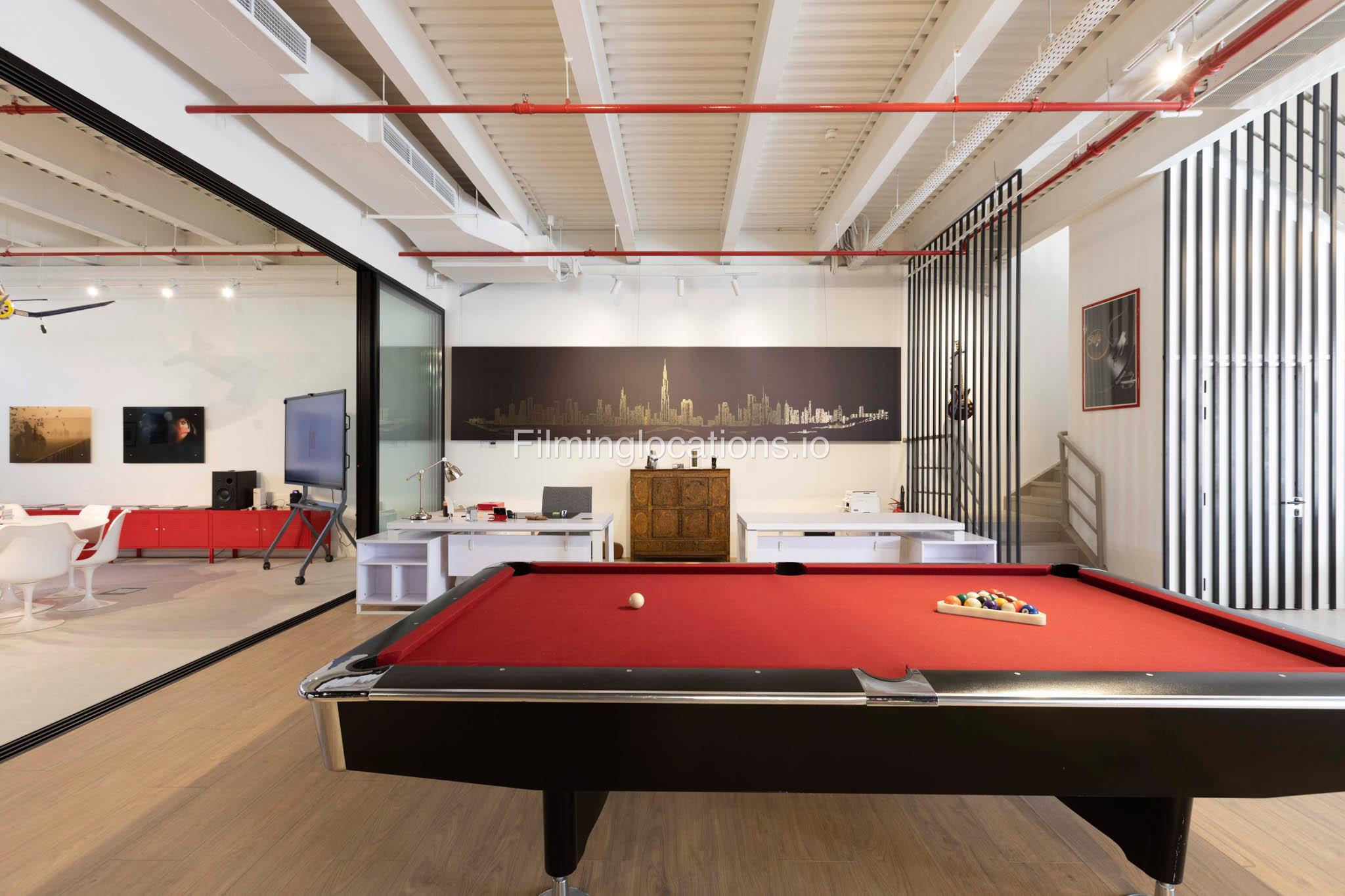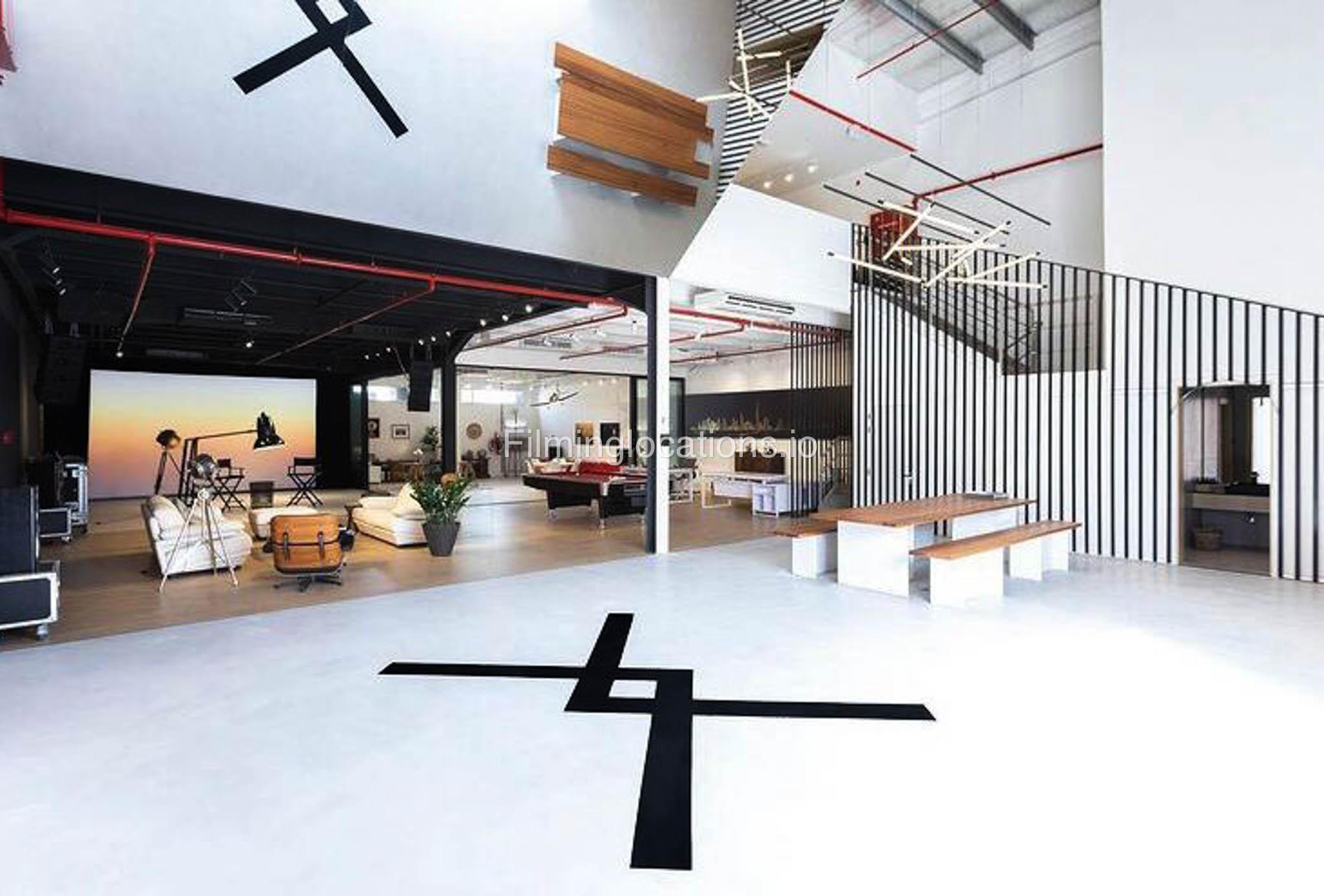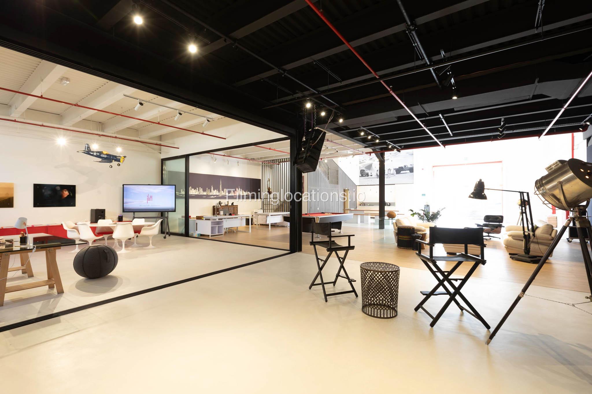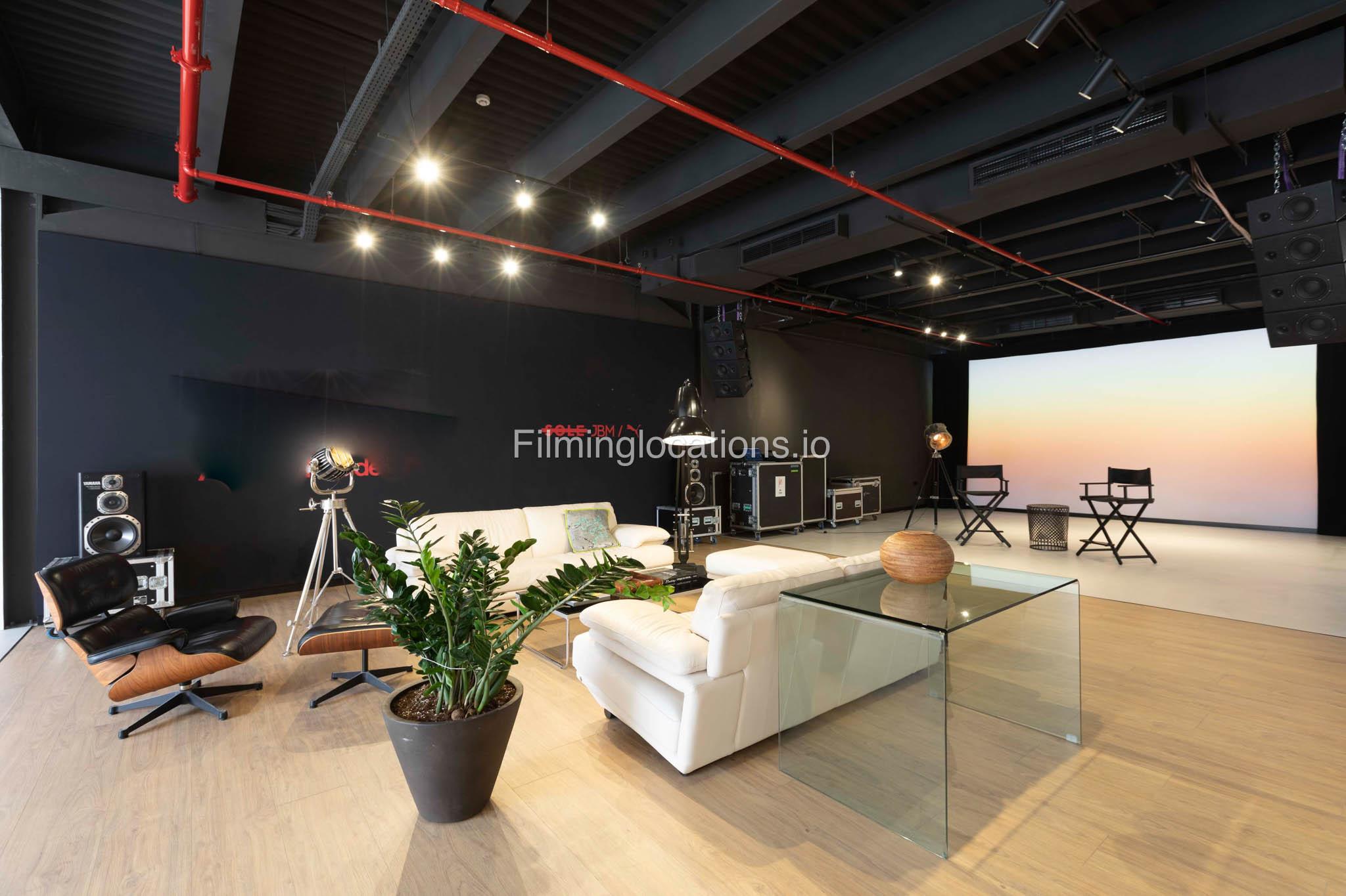 Our warehouse studio features various areas. This includes a space with a massive screen where media can be displayed along with a space for interviews and a lounge area which can be multifunctional and a pool table area. There's also a stylish office inside. Furthermore, there is a big open space with heigh ceiling and benches for seating.