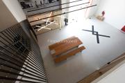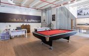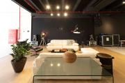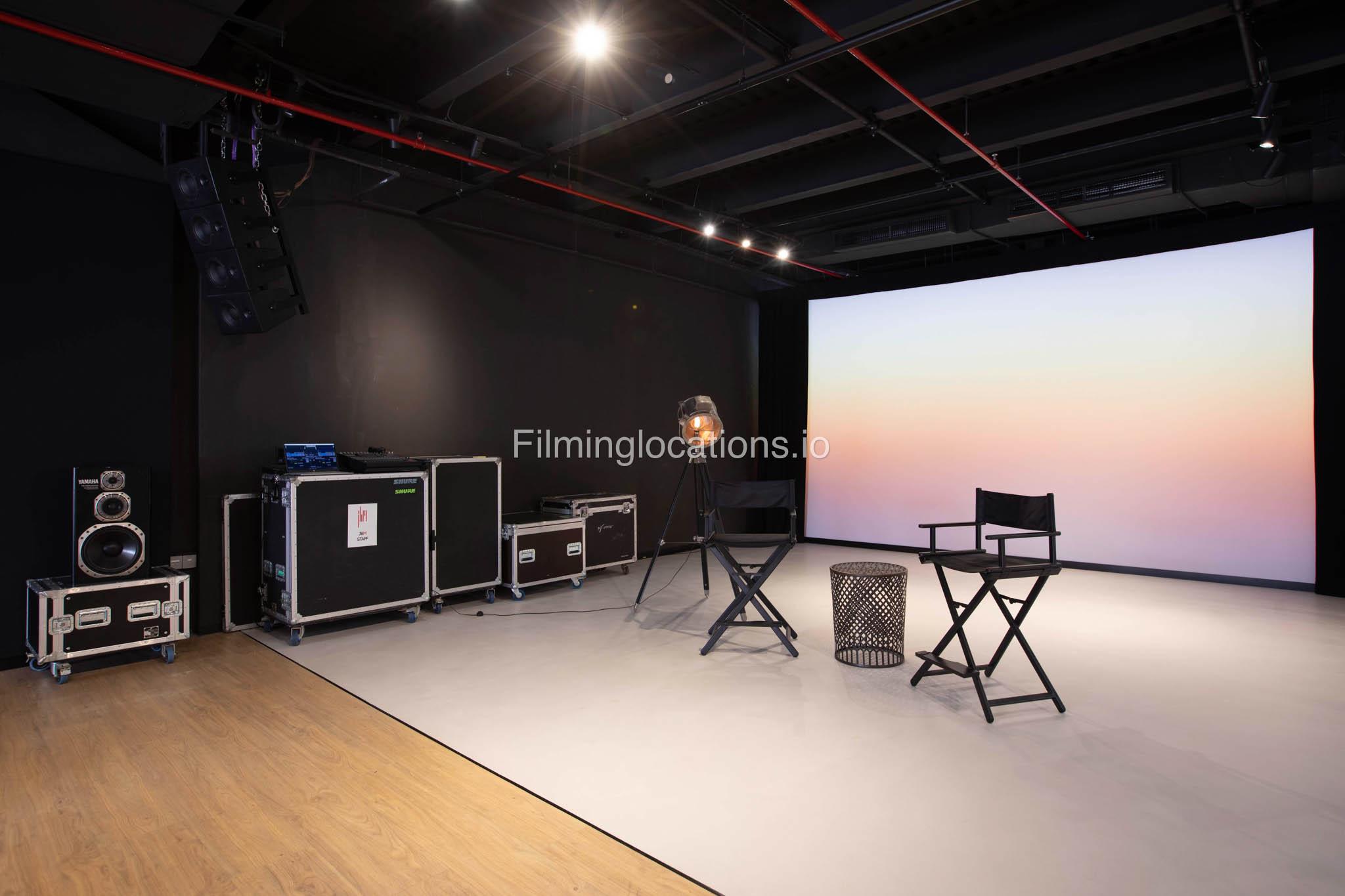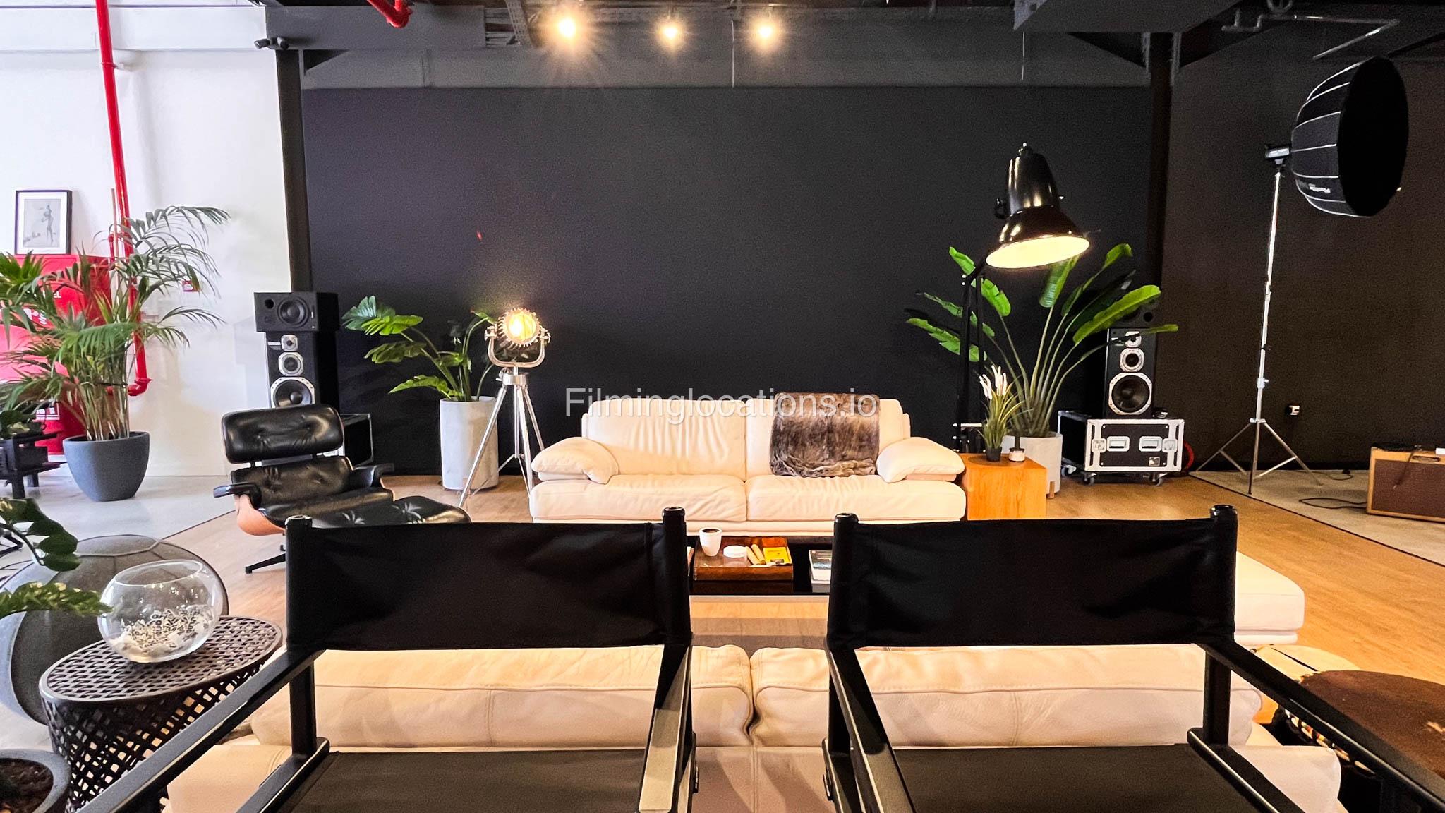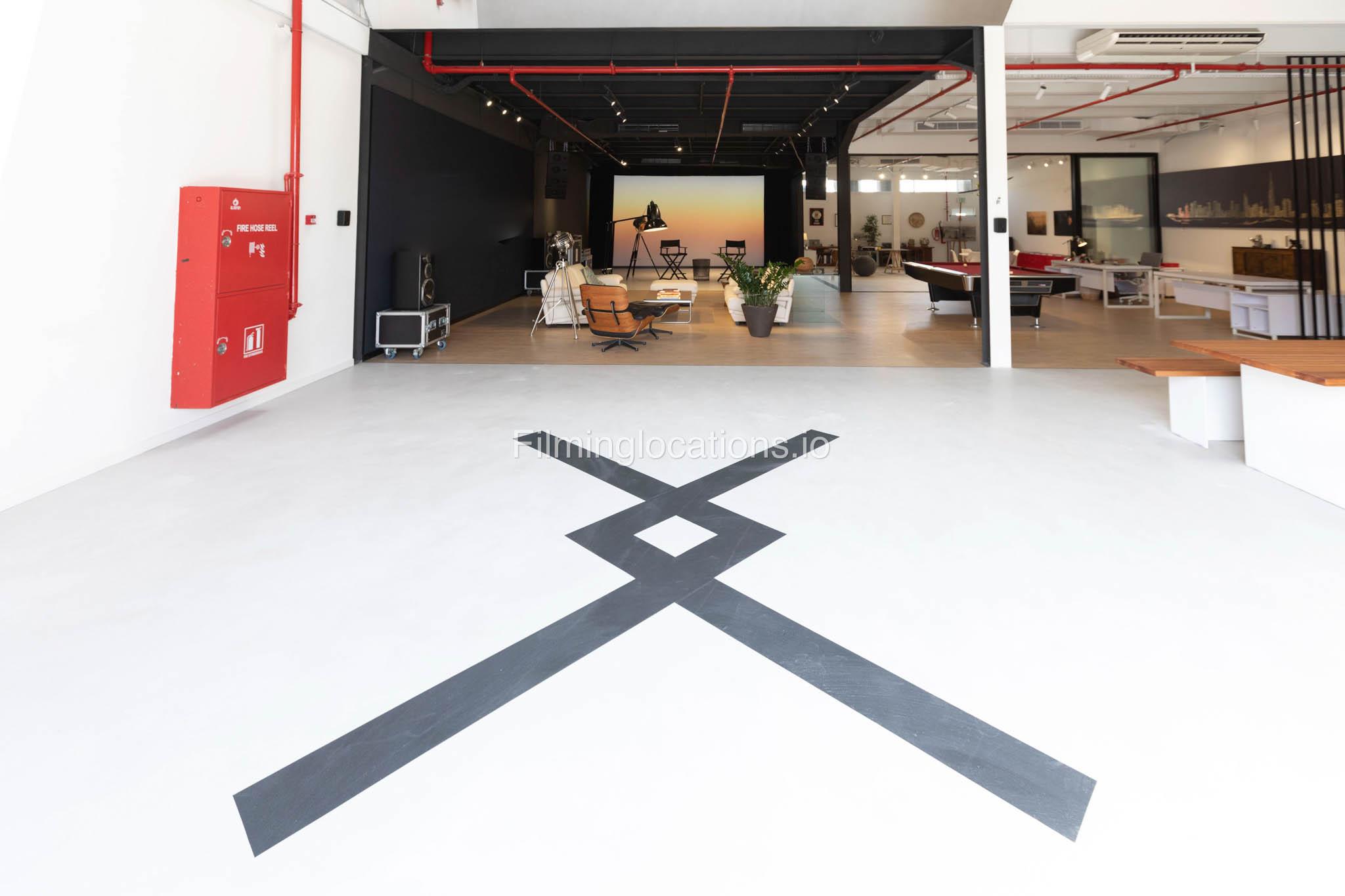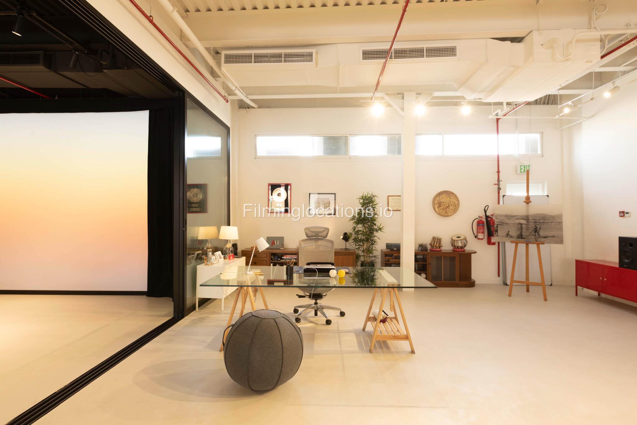 Our warehouse studio features various areas. This includes a space with a massive screen where media can be displayed along with a space for interviews and a lounge area which can be multifunctional and a pool table area. There's also a stylish office inside. Furthermore, there is a big open space with heigh ceiling and benches for seating.