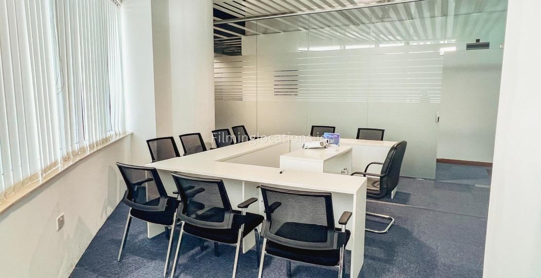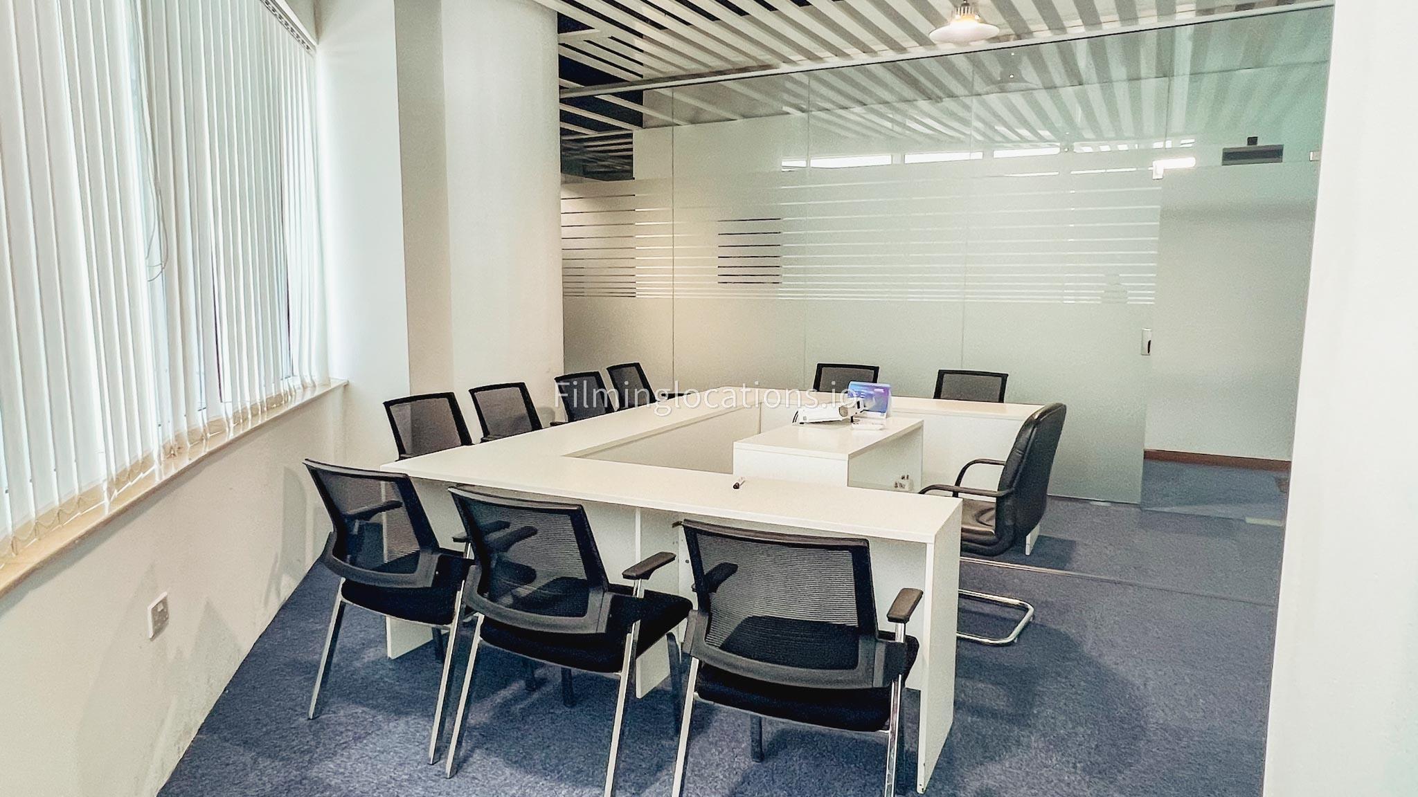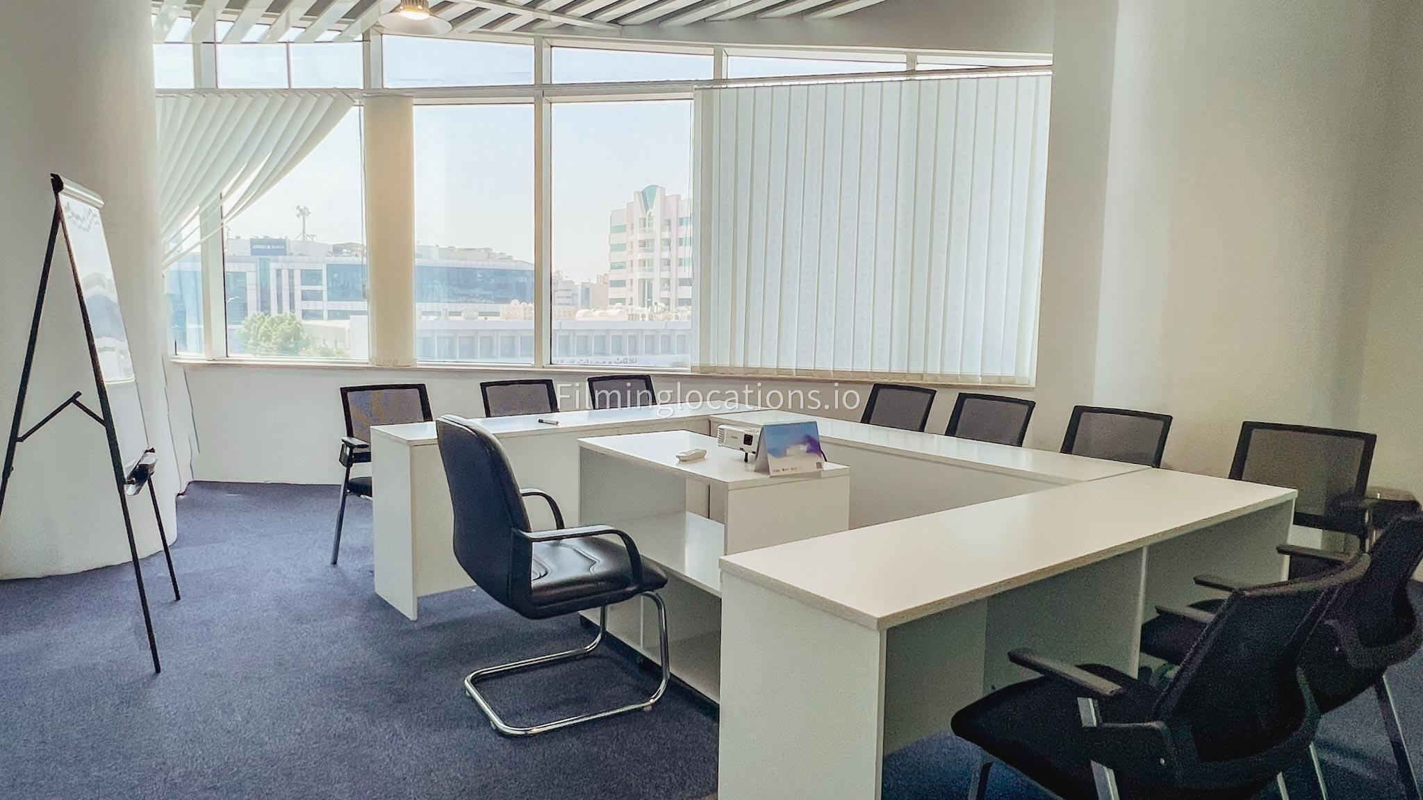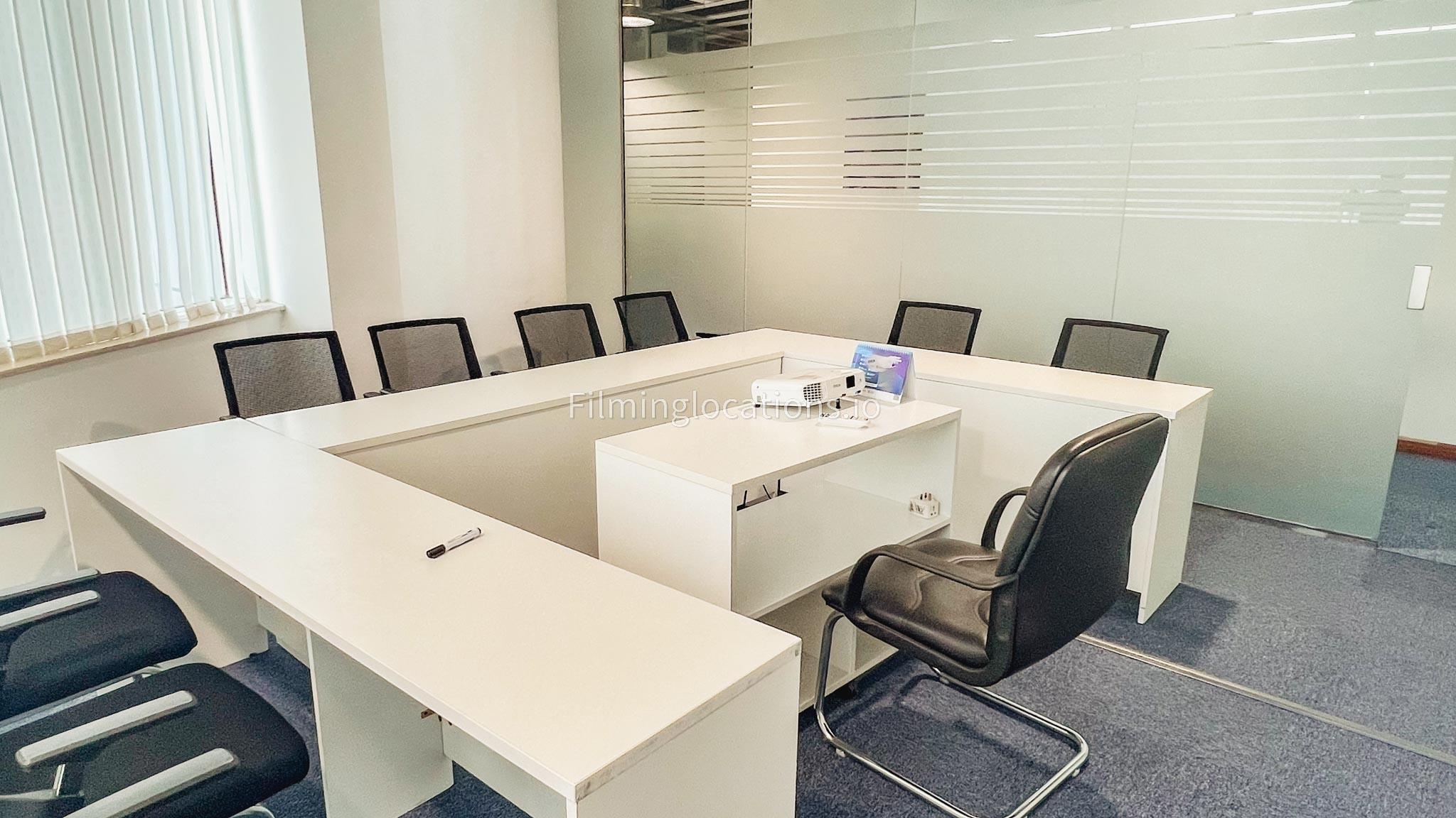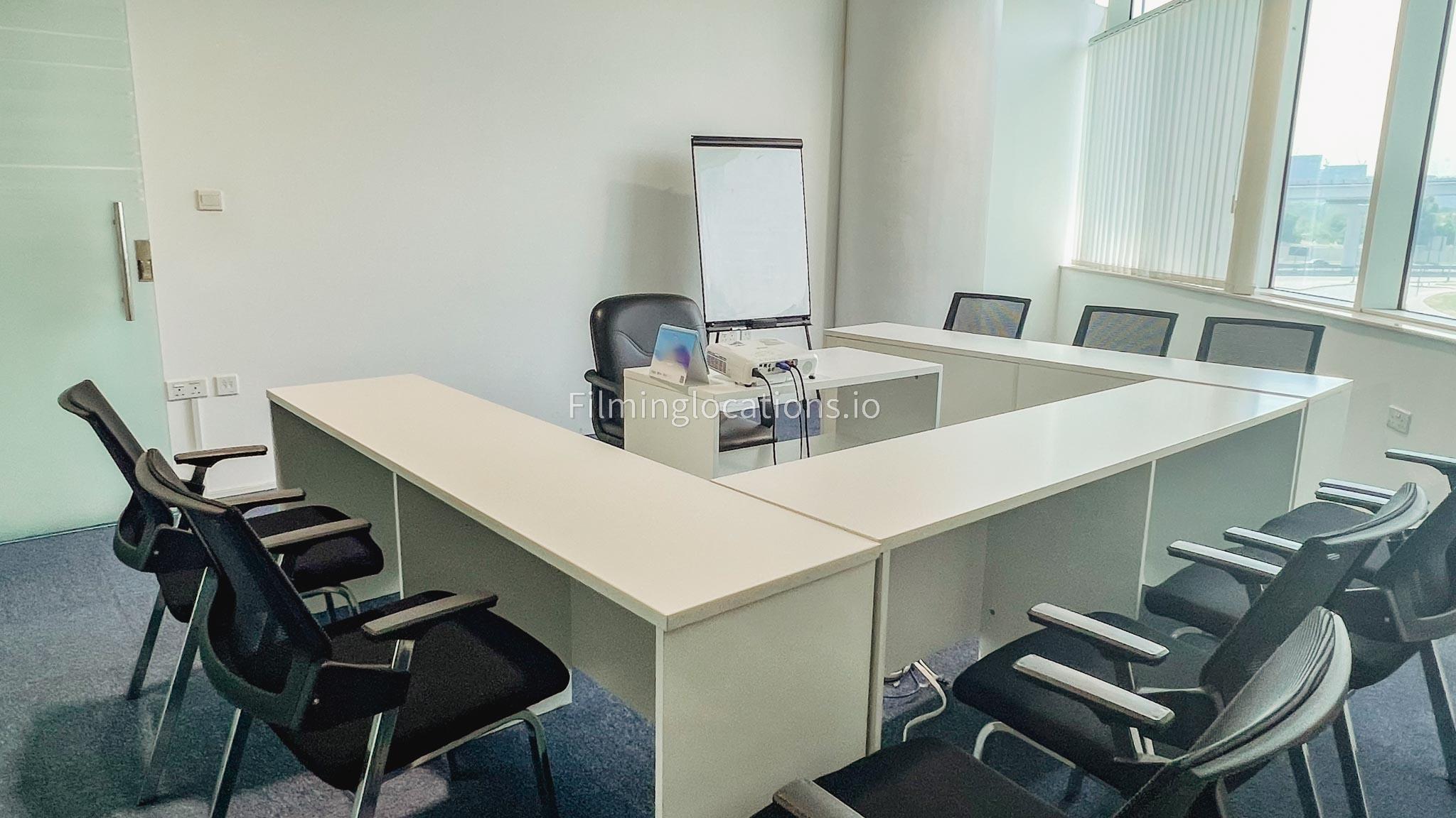 In our sleek meeting room, the furniture is arranged in a u-shape, creating an ideal setting for capturing interview scenes. The room is generously illuminated and comes fully equipped with tables, office chairs, a projector, and a portable whiteboard.