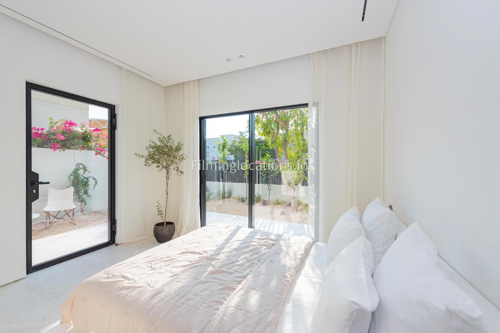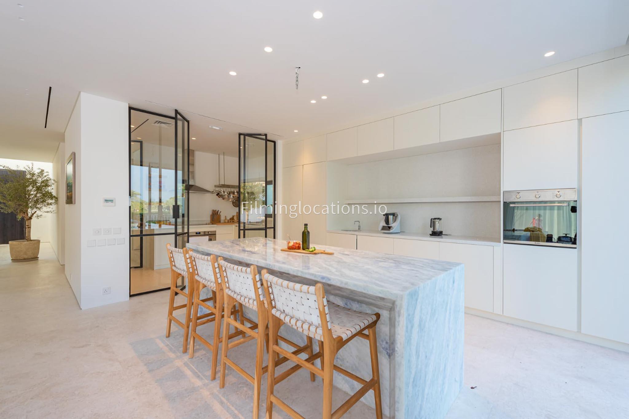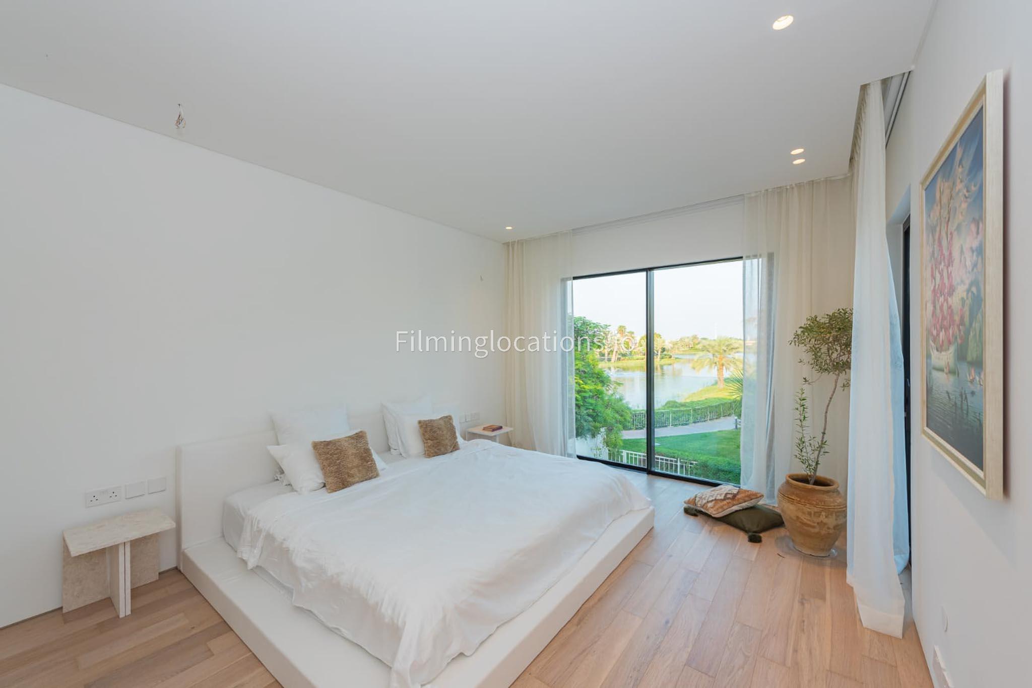 Our picturesque villa boasts a beautifully pristine and neutral design, featuring elegant furnishings throughout. It comprises five bedrooms, one of which is equipped with gym facilities. The open kitchen, adorned with a marble countertop, creates a serene atmosphere. Outside, there is a private high tech disappearing pool and an outdoor patio with various seating choices, an outdoor kitchen with a pizza oven, perfect for outdoor shoots. The outdoor seating area has stunning views on the large lake. The master spa bathroom is exquisitely adorned with stone, making it an ideal setting for commercial photoshoots.