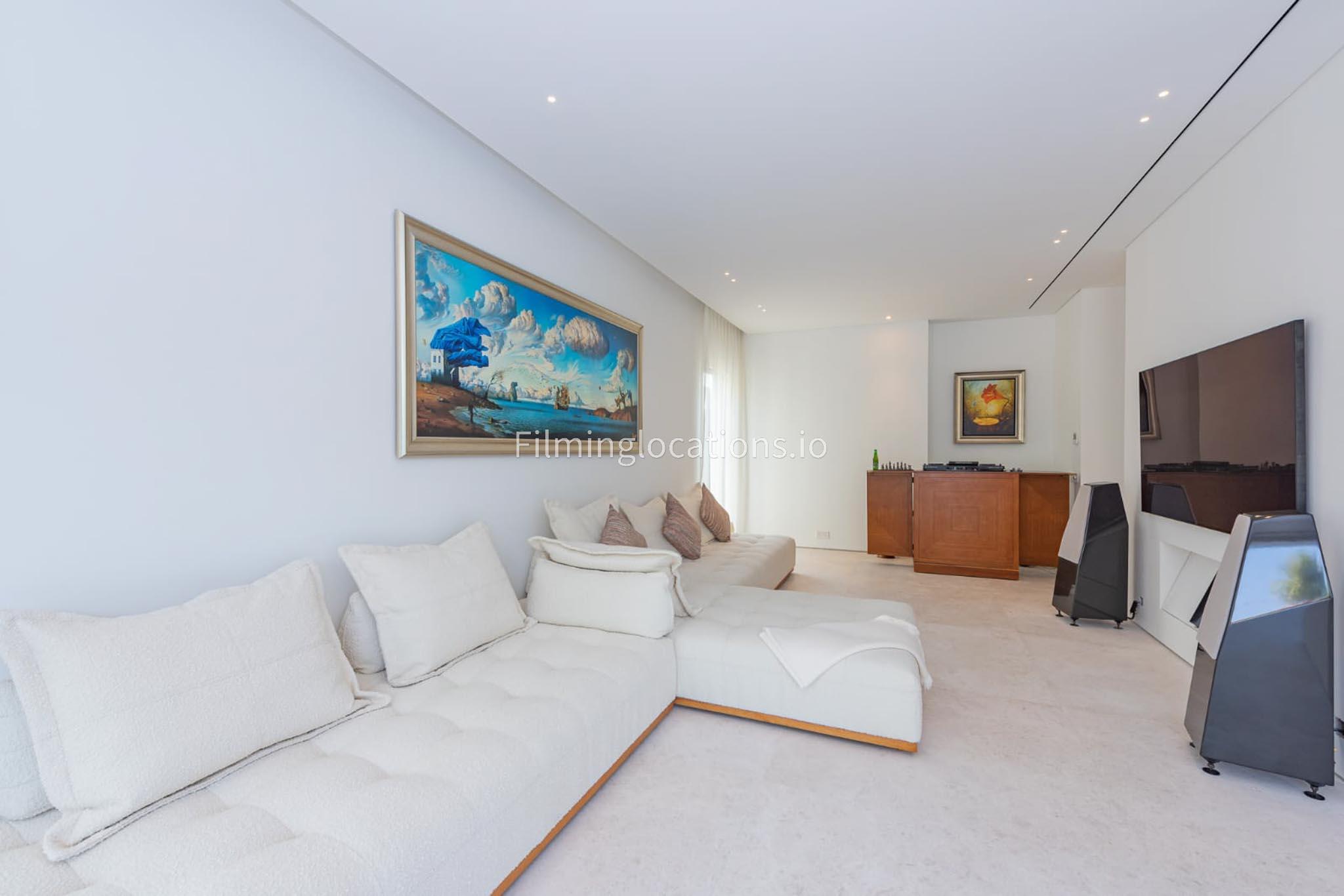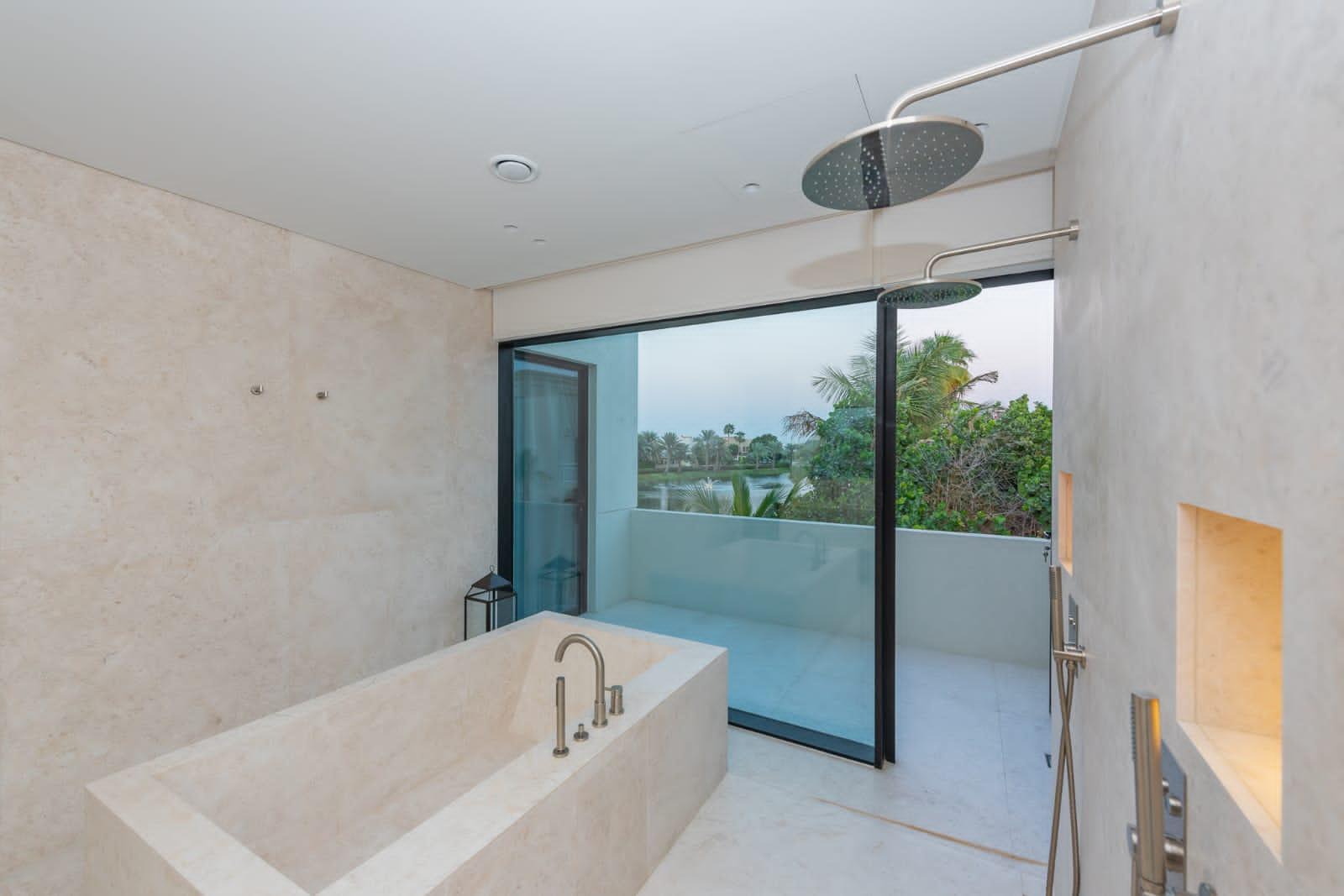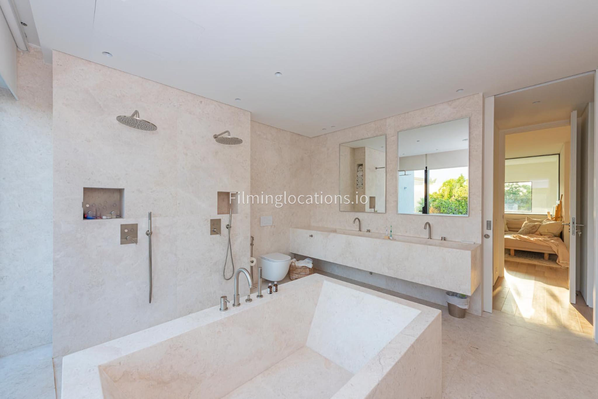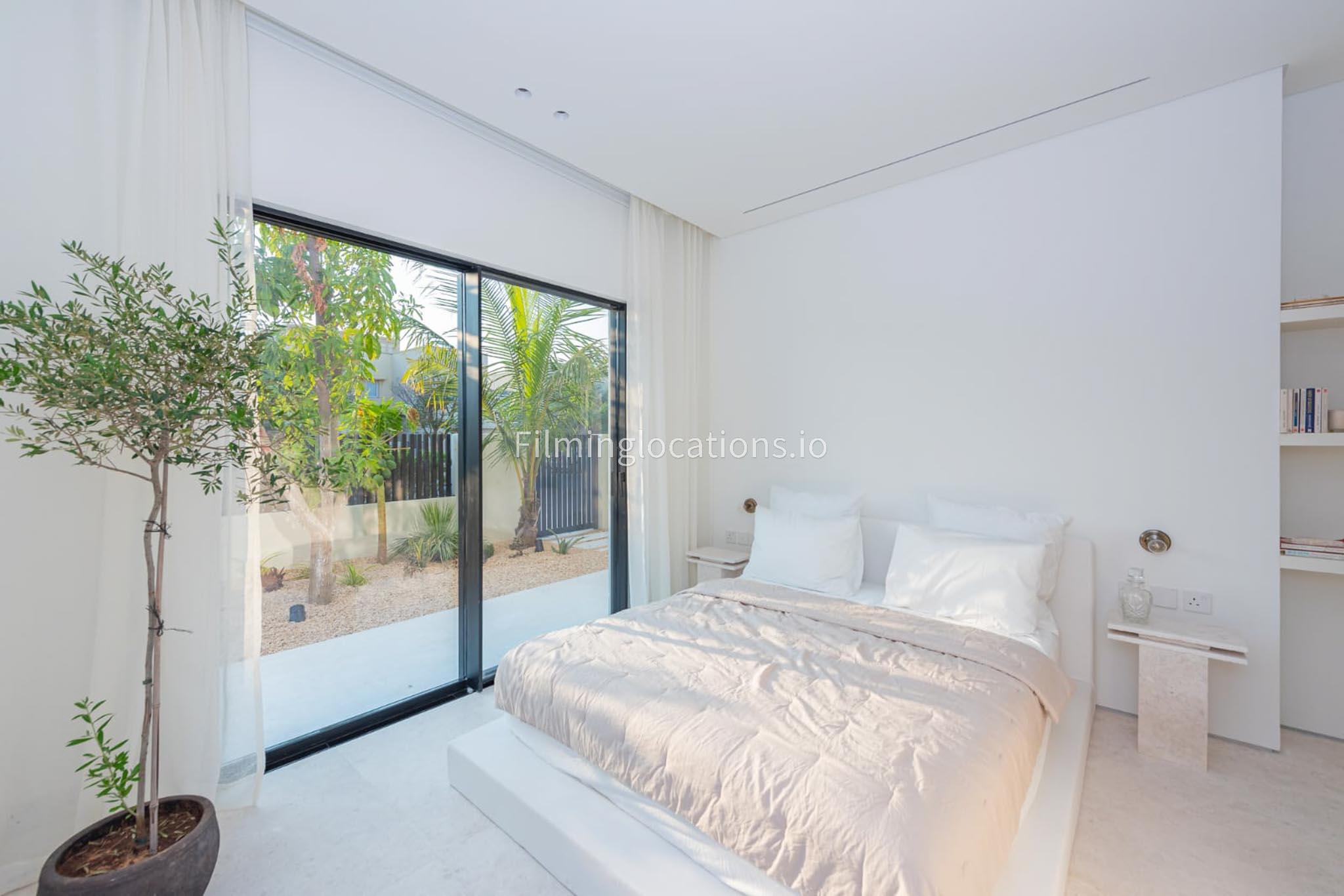 Our picturesque villa boasts a beautifully pristine and neutral design, featuring elegant furnishings throughout. It comprises five bedrooms, one of which is equipped with gym facilities. The open kitchen, adorned with a marble countertop, creates a serene atmosphere. Outside, there is a private high tech disappearing pool and an outdoor patio with various seating choices, an outdoor kitchen with a pizza oven, perfect for outdoor shoots. The outdoor seating area has stunning views on the large lake. The master spa bathroom is exquisitely adorned with stone, making it an ideal setting for commercial photoshoots.