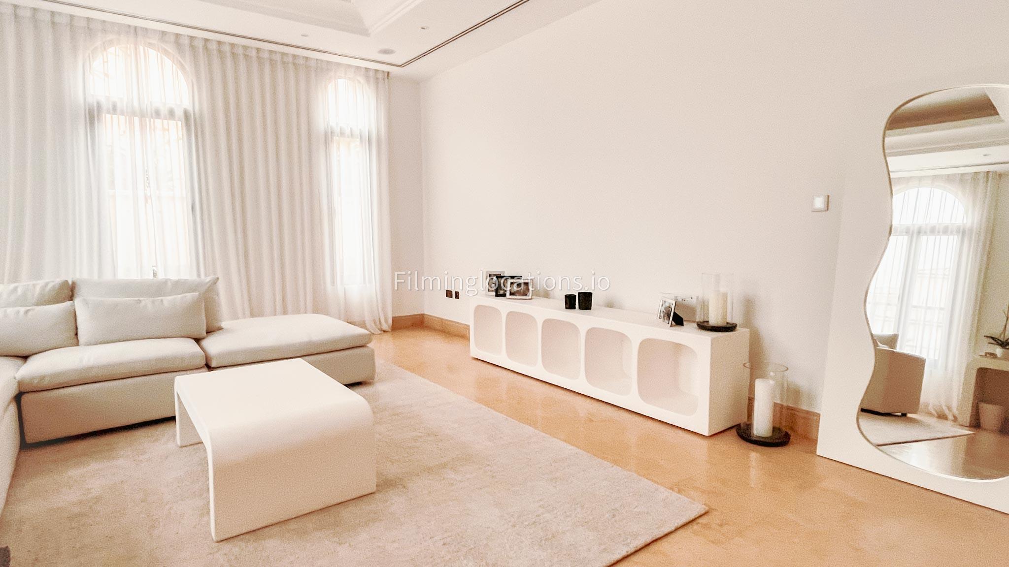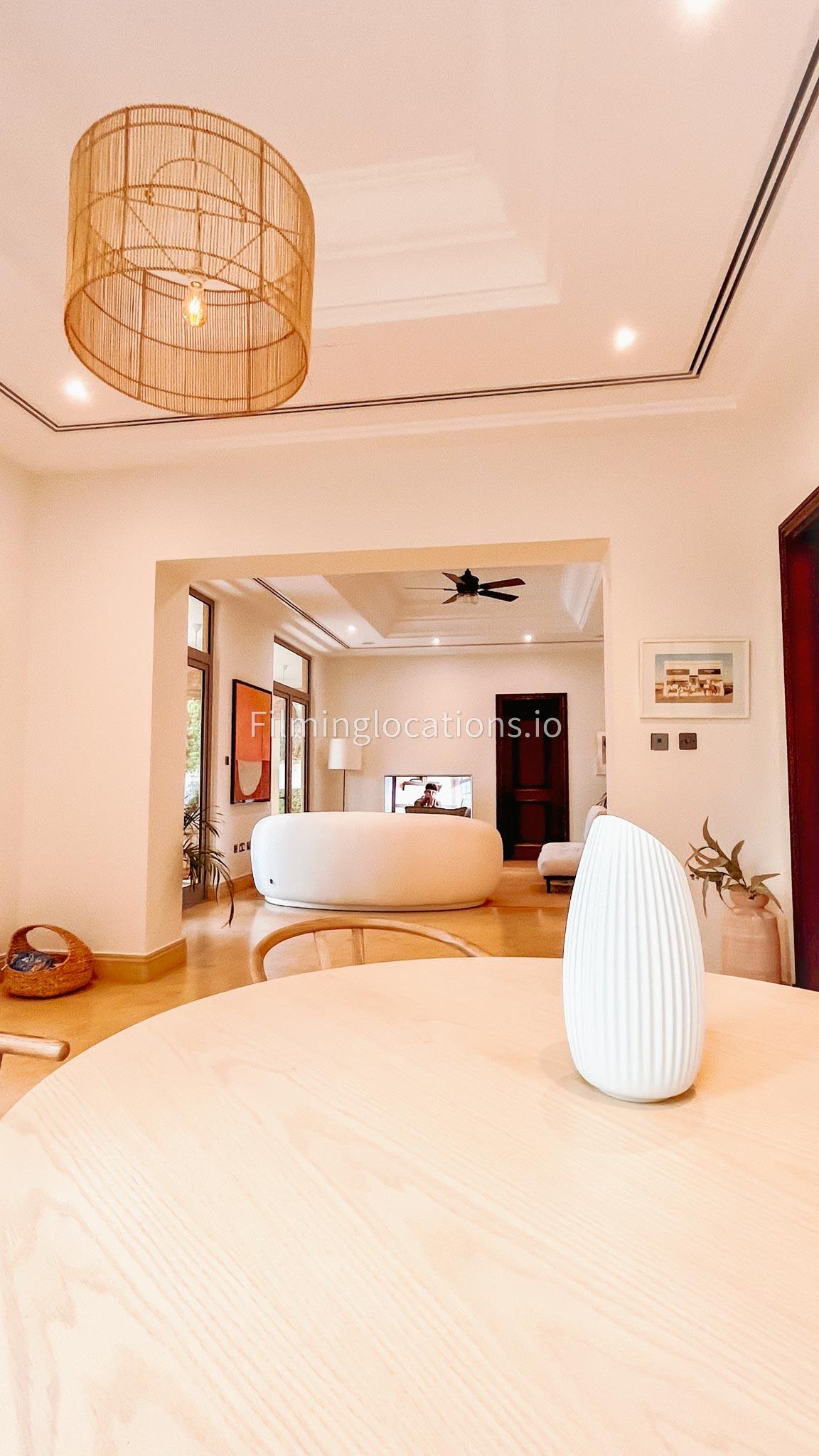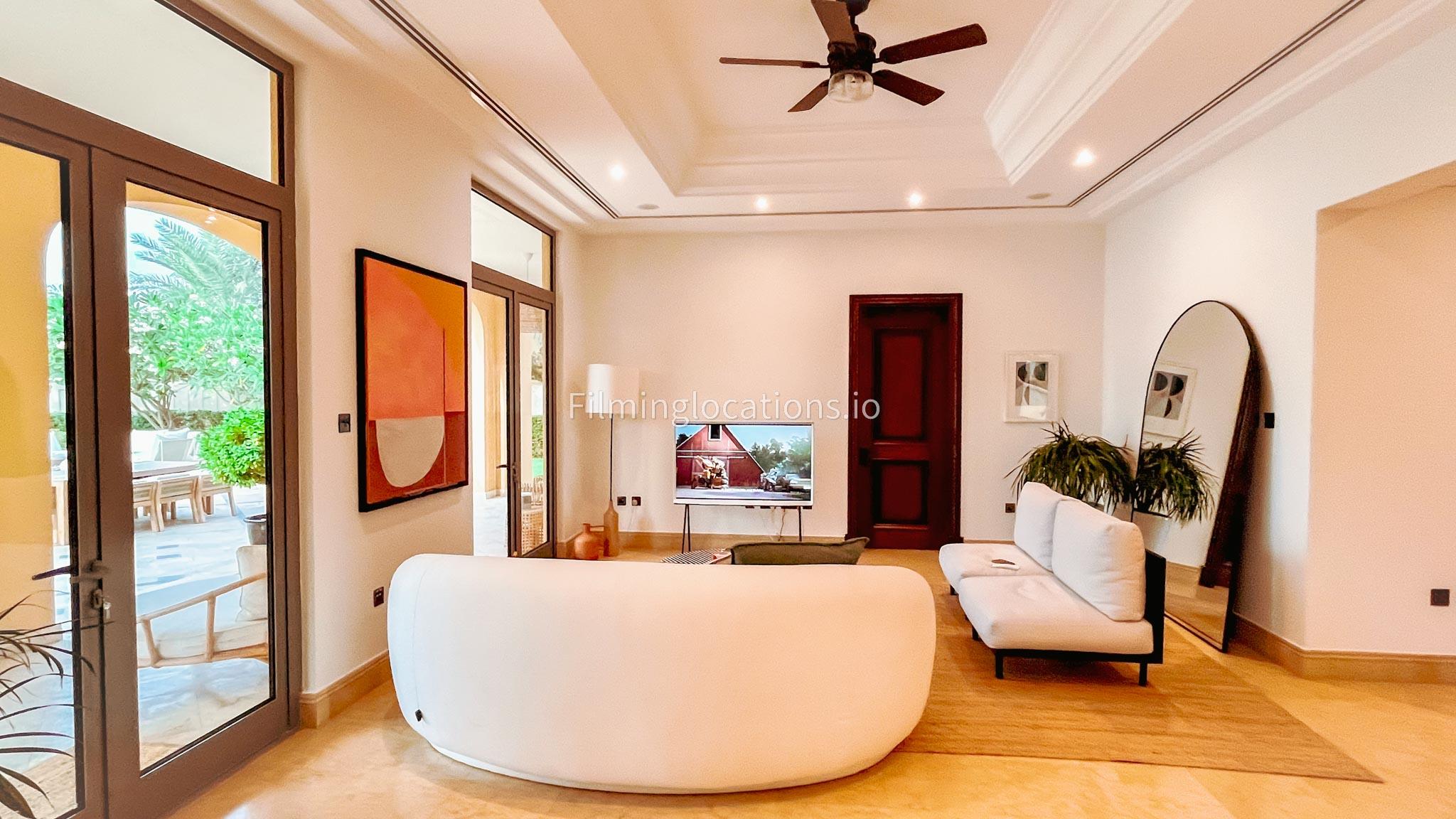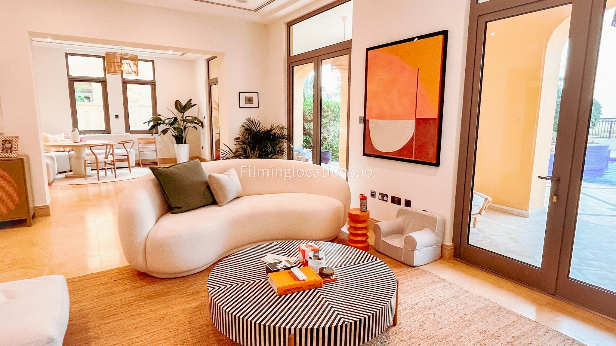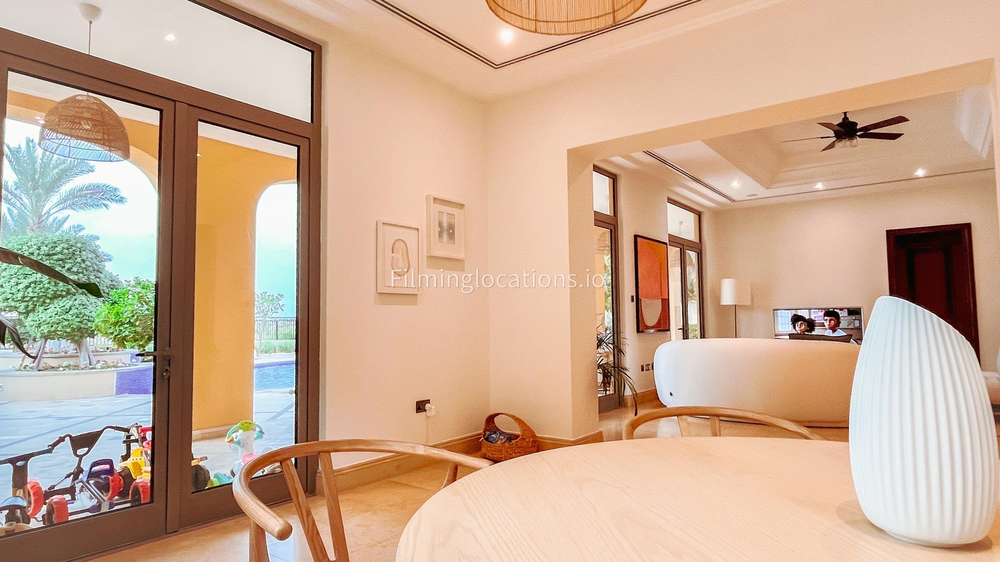 Our villa, located on Saadiyat Island, offers a delightful view of the golf course. It features five bedrooms, including two Kids rooms. The living room is elegantly decorated with artwork, furniture, and full-length mirrors. Additionally, there's a stunning backyard complete with a pristine pool and an outdoor seating area, all enveloped by lush greenery, making it an ideal setting for outdoor photography or film shoots. The kitchen is fully equipped, featuring an island, while the dining room emanates a tranquil atmosphere. The entire space is well-lit and exudes a peaceful ambiance
