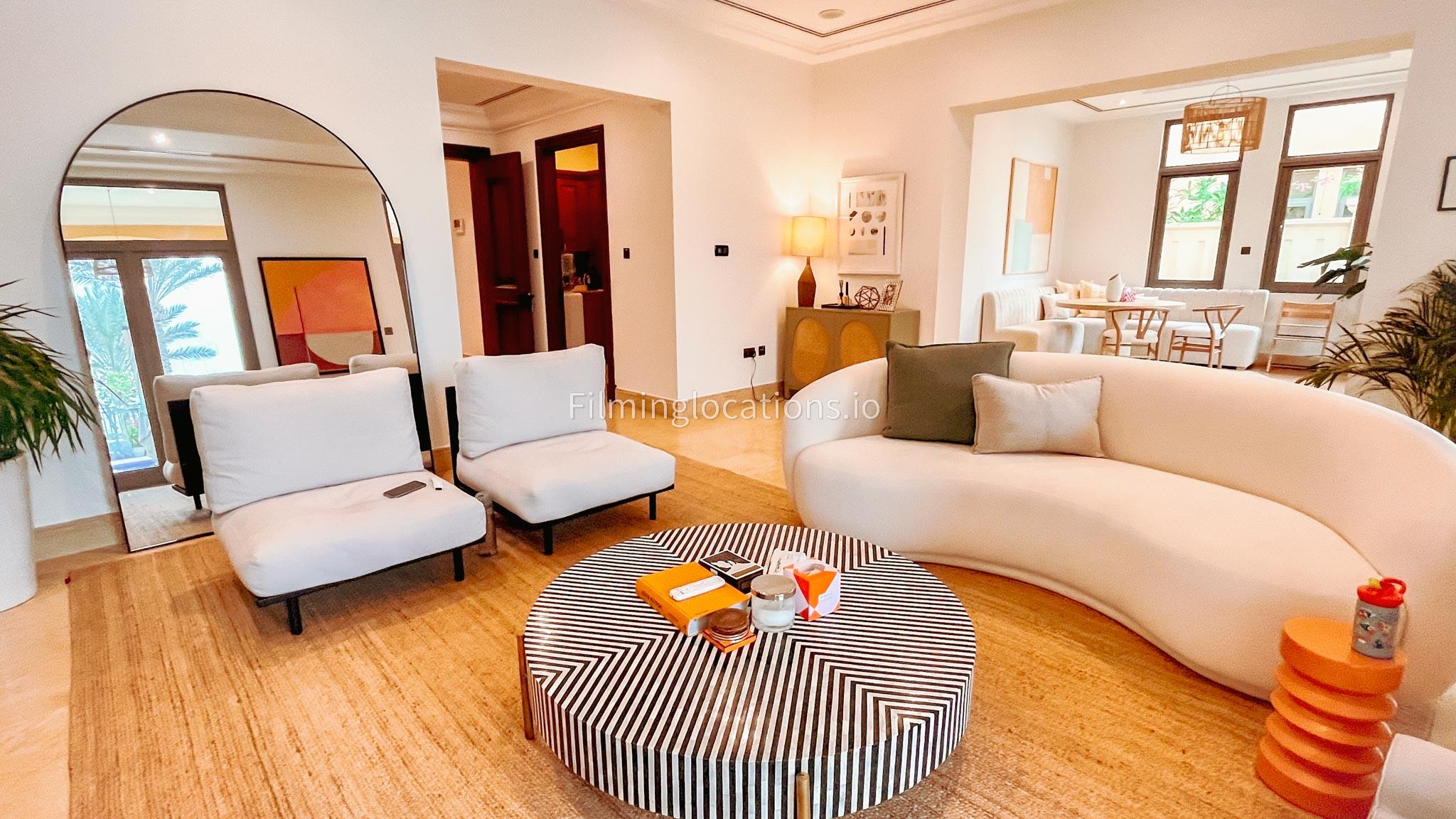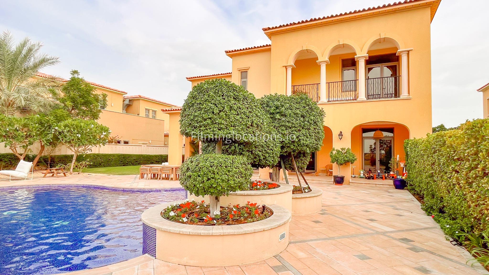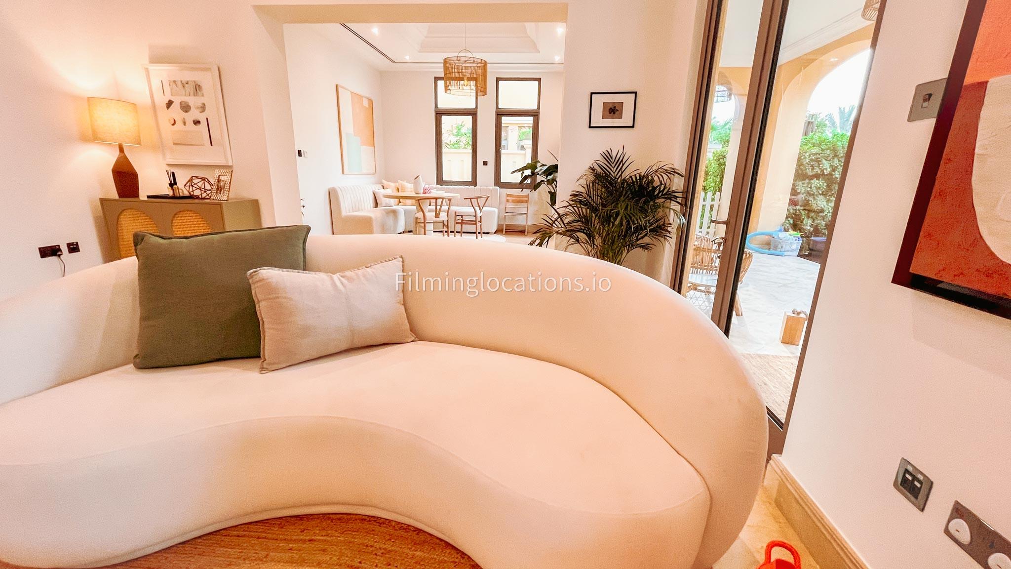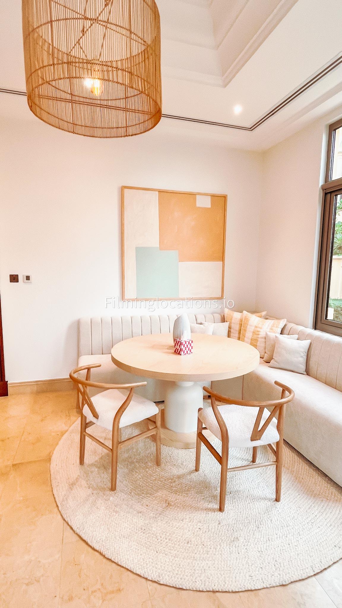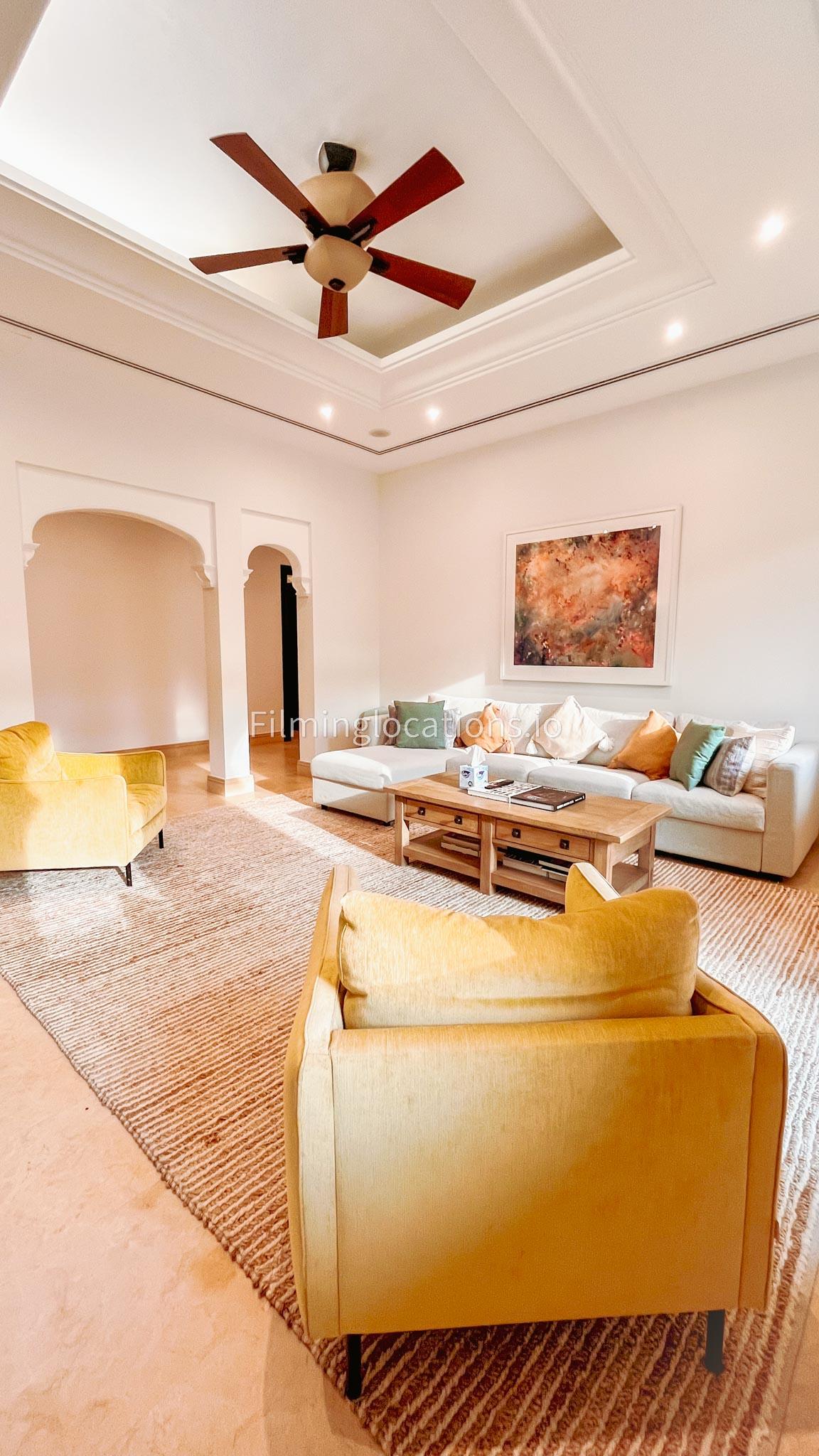 Our villa, located on Saadiyat Island, offers a delightful view of the golf course. It features five bedrooms, including two Kids rooms. The living room is elegantly decorated with artwork, furniture, and full-length mirrors. Additionally, there's a stunning backyard complete with a pristine pool and an outdoor seating area, all enveloped by lush greenery, making it an ideal setting for outdoor photography or film shoots. The kitchen is fully equipped, featuring an island, while the dining room emanates a tranquil atmosphere. The entire space is well-lit and exudes a peaceful ambiance