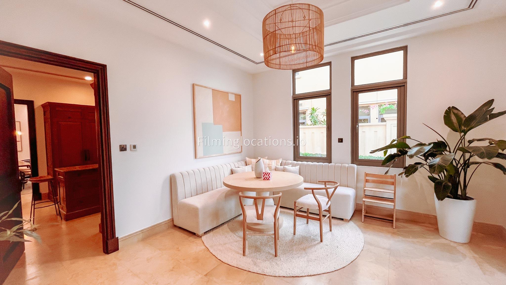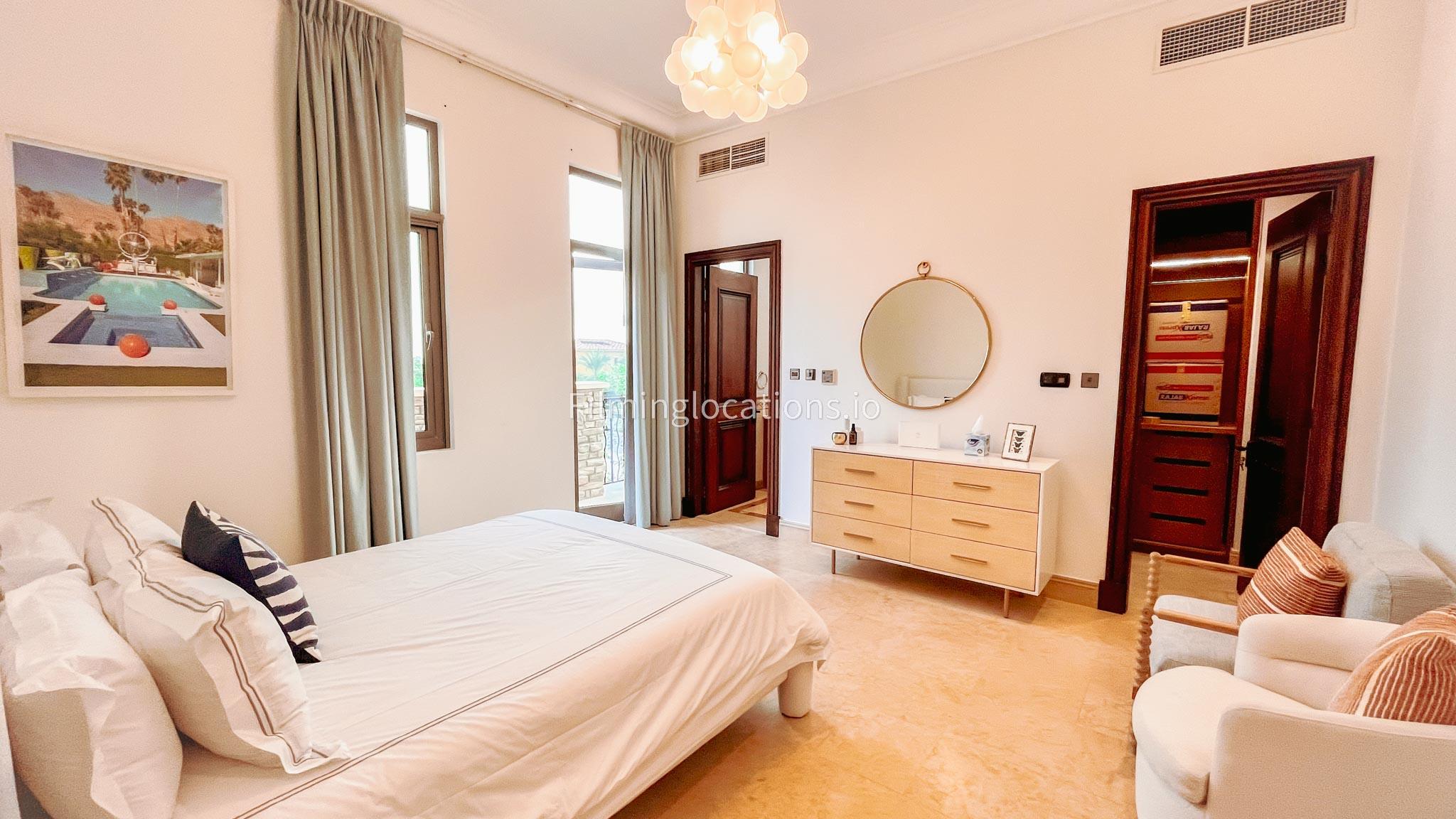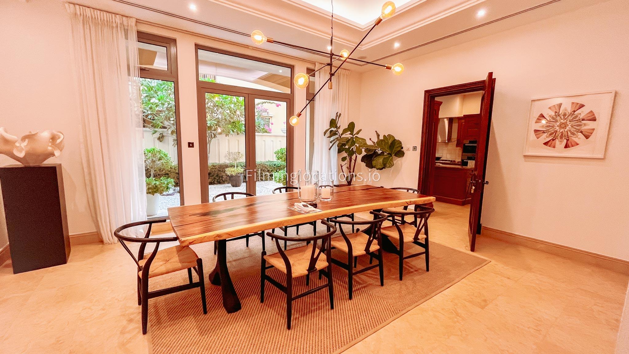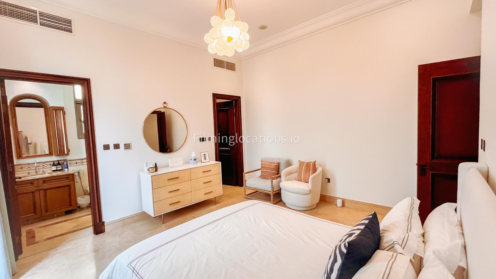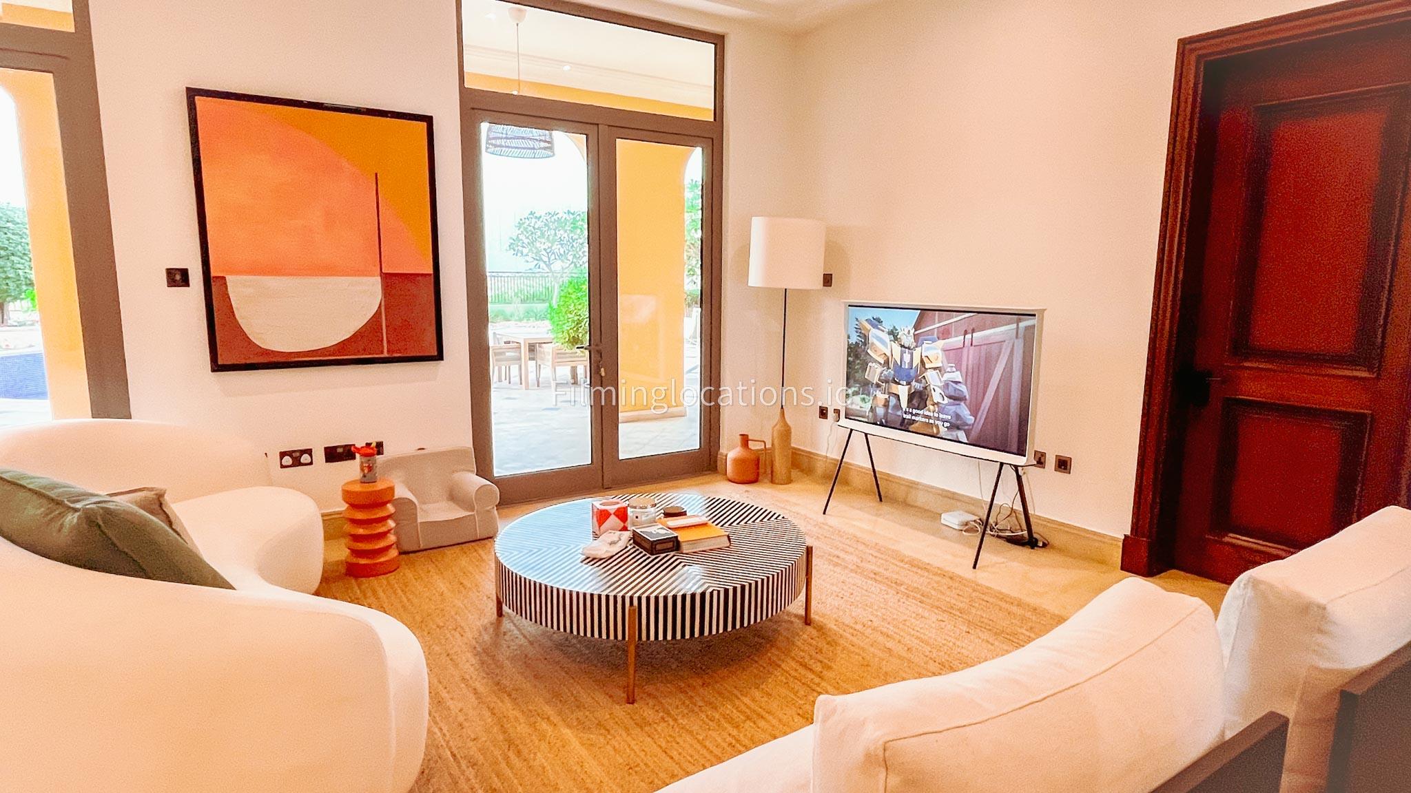 Our villa, located on Saadiyat Island, offers a delightful view of the golf course. It features five bedrooms, including two Kids rooms. The living room is elegantly decorated with artwork, furniture, and full-length mirrors. Additionally, there's a stunning backyard complete with a pristine pool and an outdoor seating area, all enveloped by lush greenery, making it an ideal setting for outdoor photography or film shoots. The kitchen is fully equipped, featuring an island, while the dining room emanates a tranquil atmosphere. The entire space is well-lit and exudes a peaceful ambiance