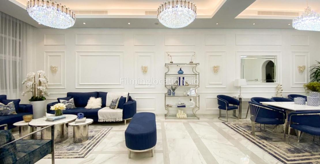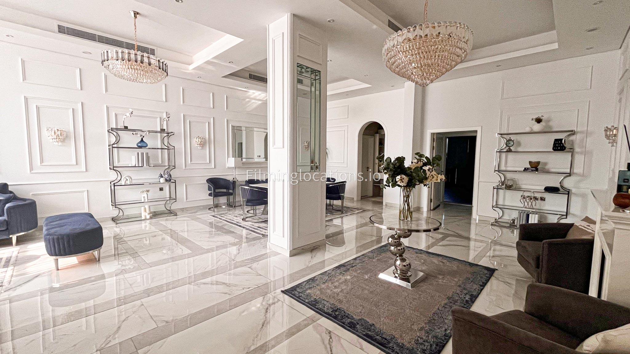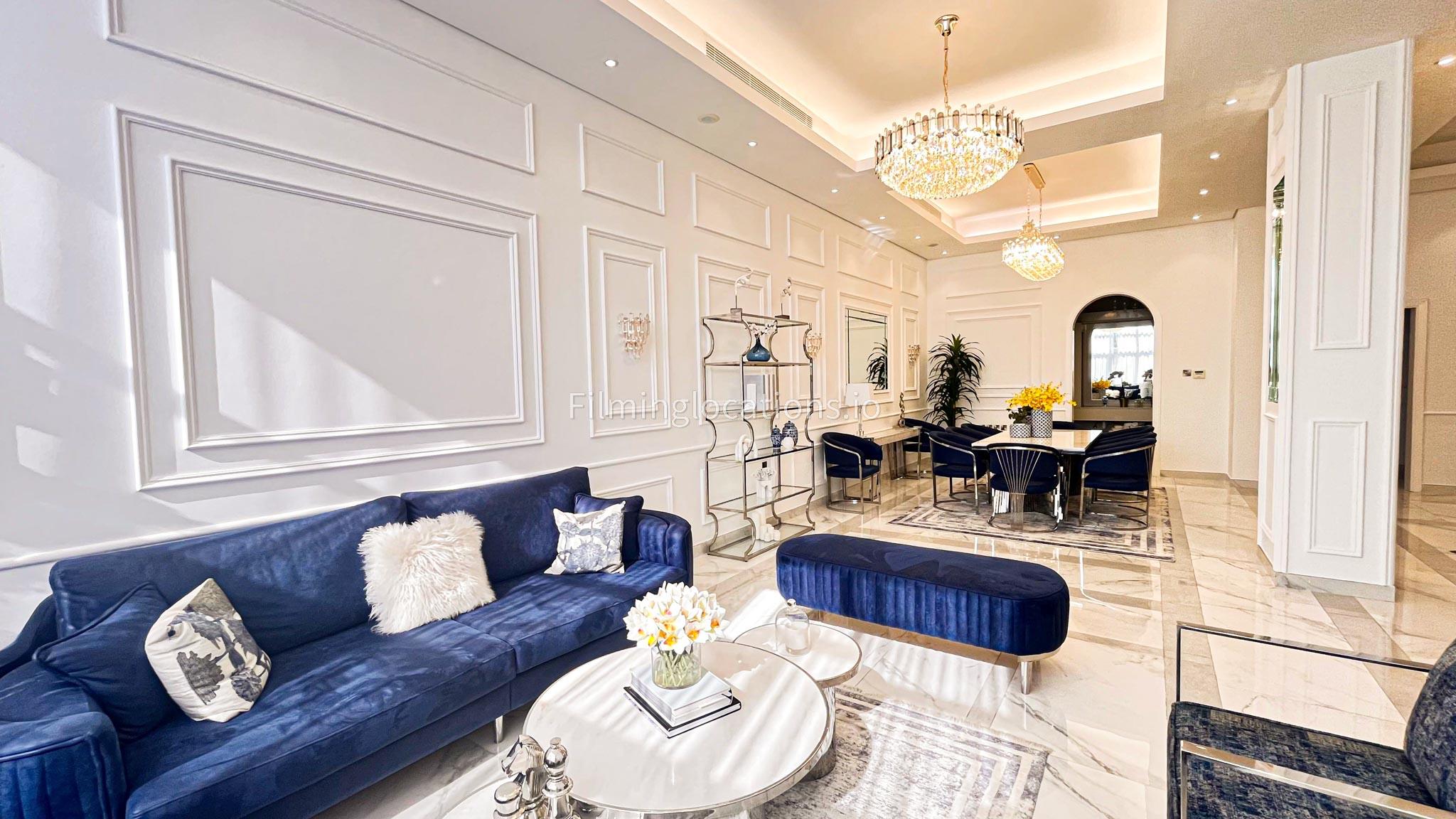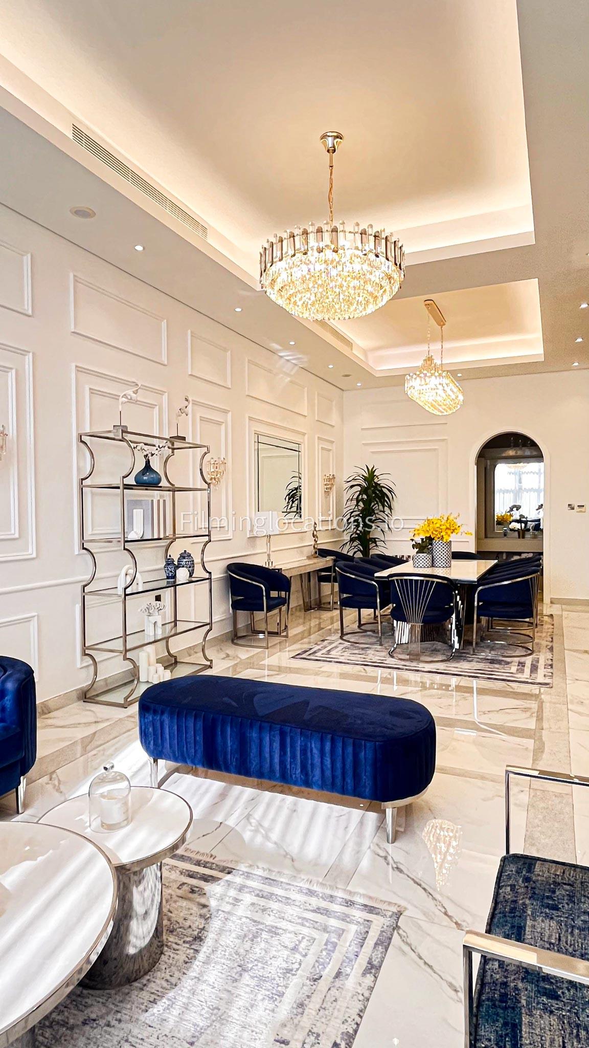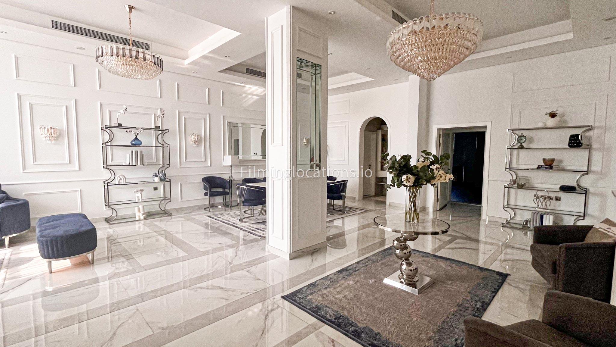 Our villa features a stunning living room adorned with stylish blue furnishings, complemented by golden sconces and grand chandeliers. We have two kitchens, one elegantly designed with white marble and wicker accents, while the other is adorned with grey furniture and includes a central island. The two bedrooms exude a sense of royalty with their sophisticated elegance.