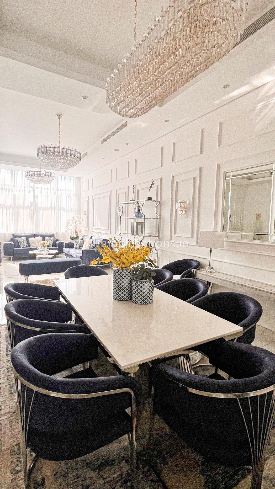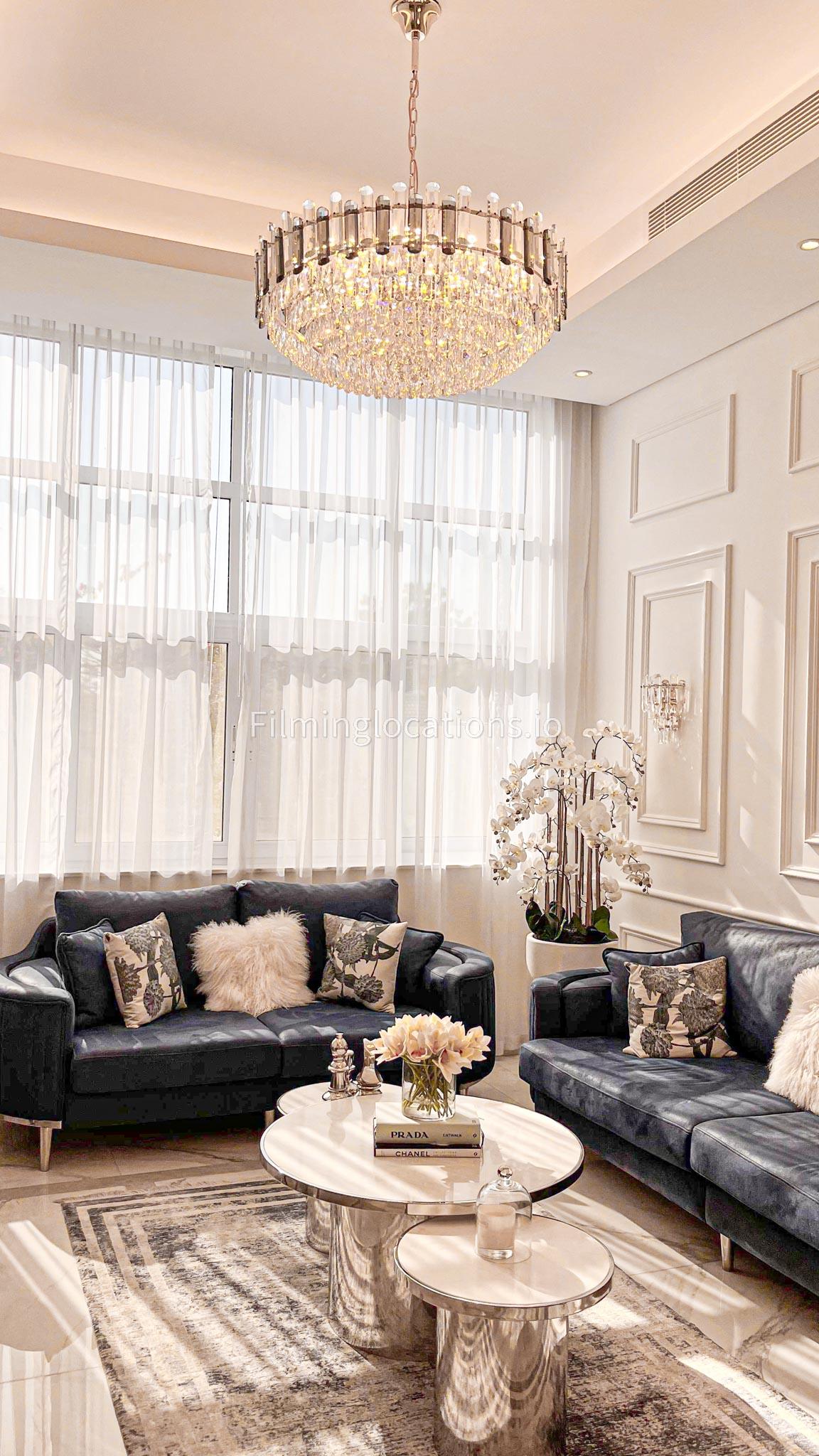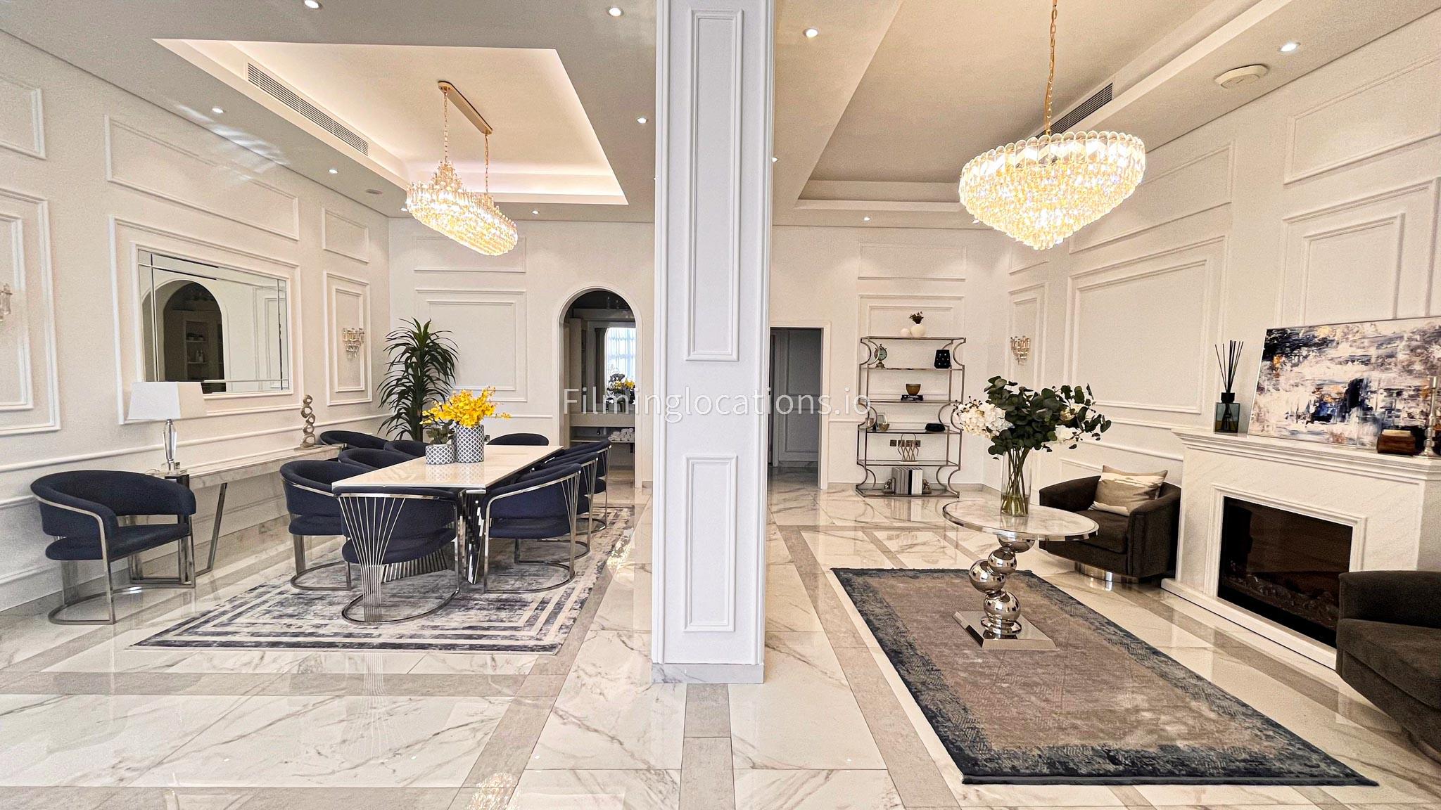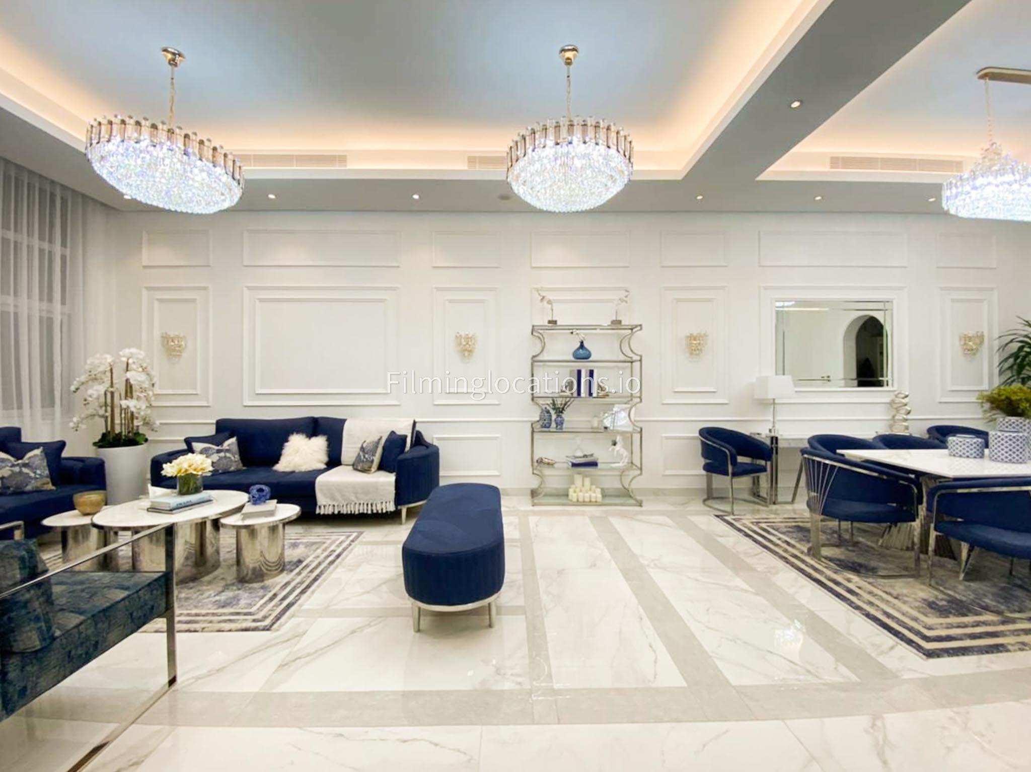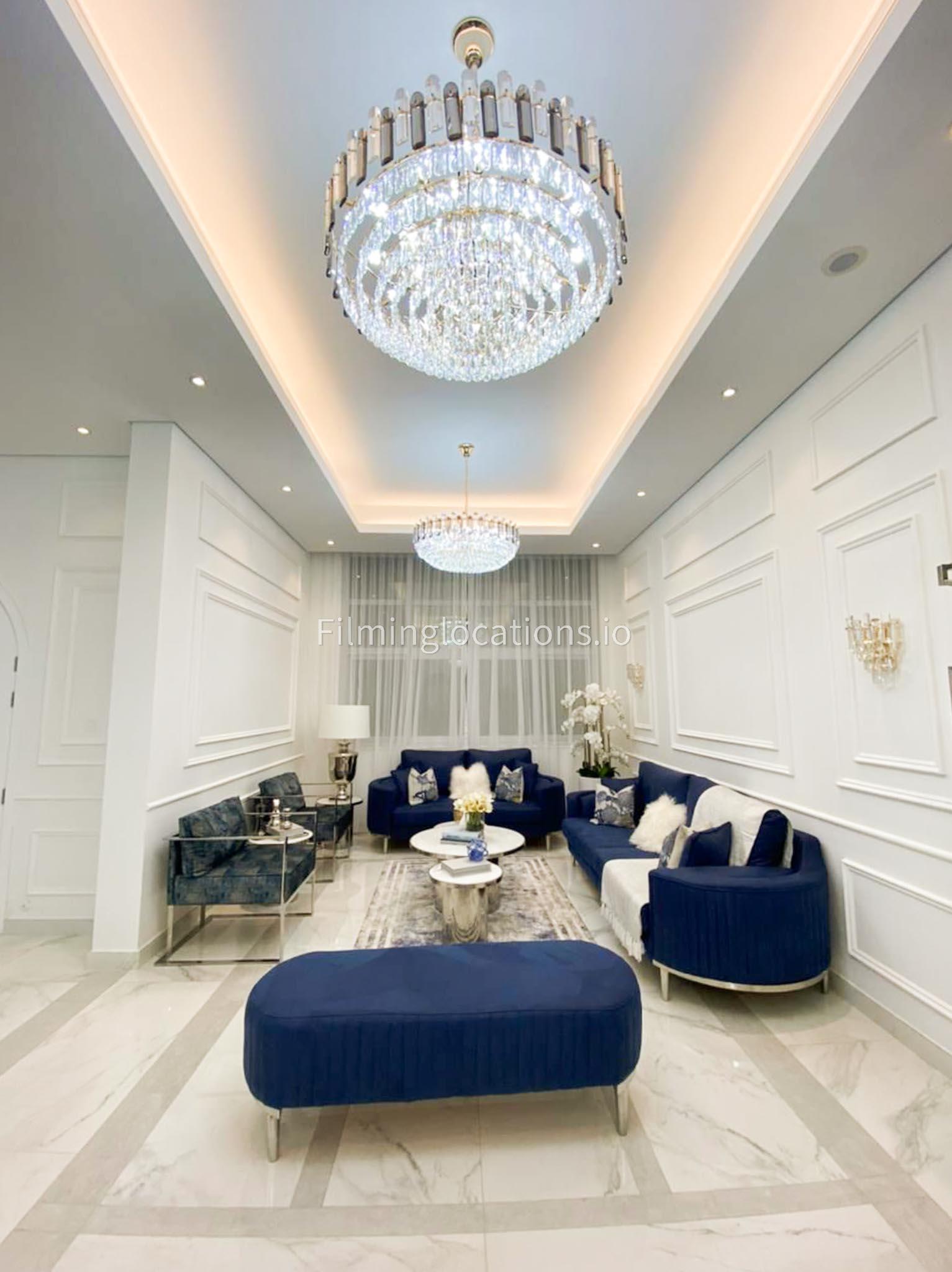 Our villa features a stunning living room adorned with stylish blue furnishings, complemented by golden sconces and grand chandeliers. We have two kitchens, one elegantly designed with white marble and wicker accents, while the other is adorned with grey furniture and includes a central island. The two bedrooms exude a sense of royalty with their sophisticated elegance.