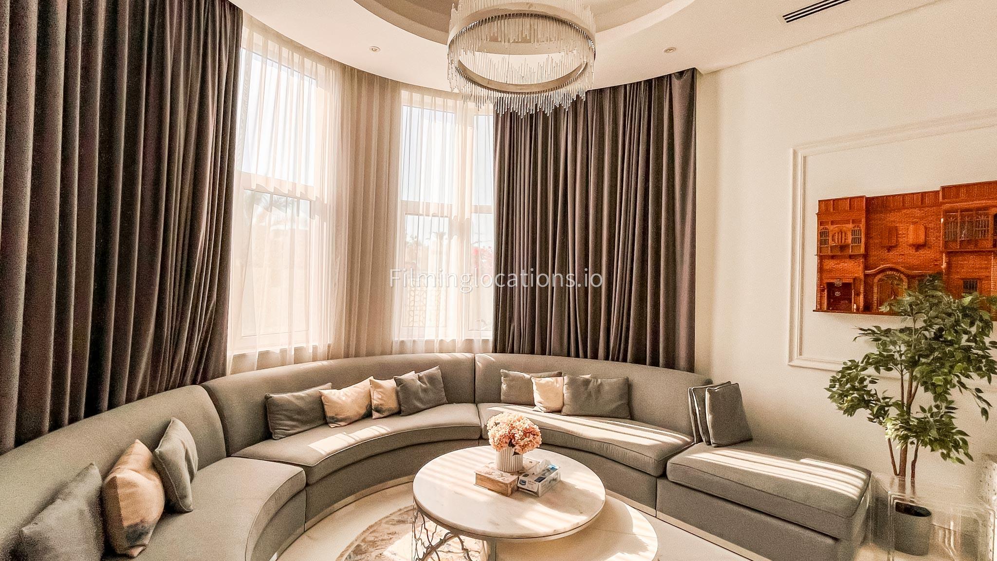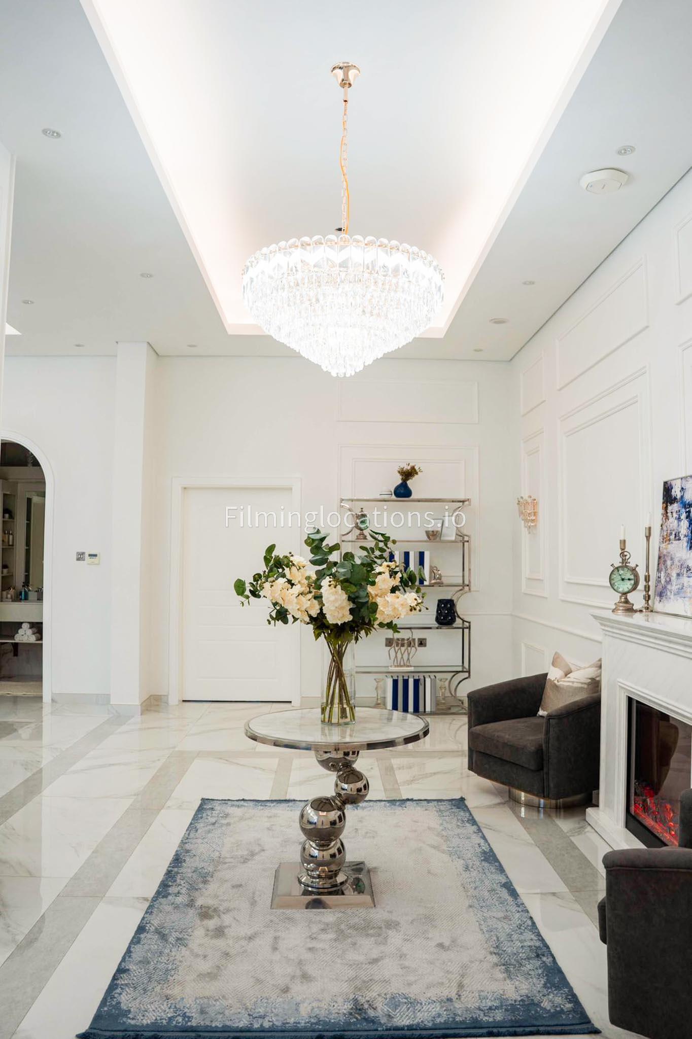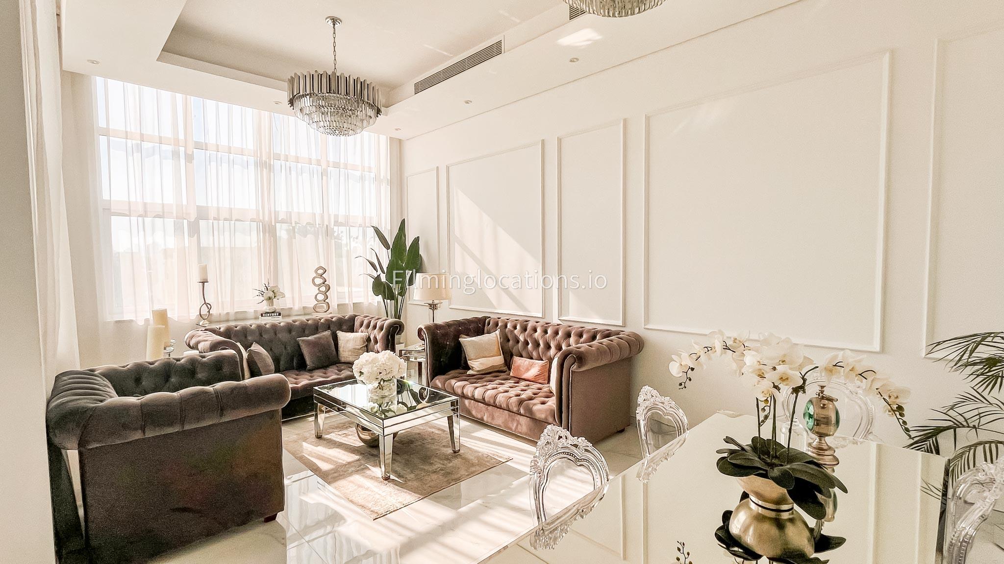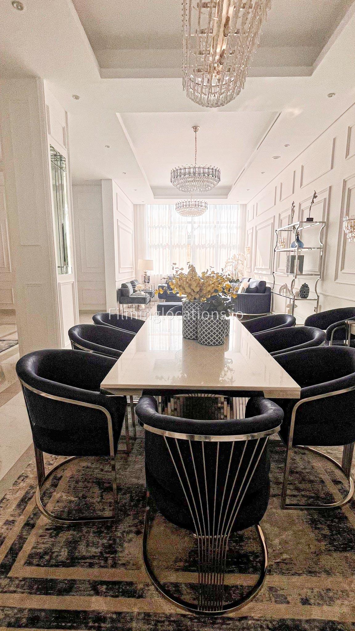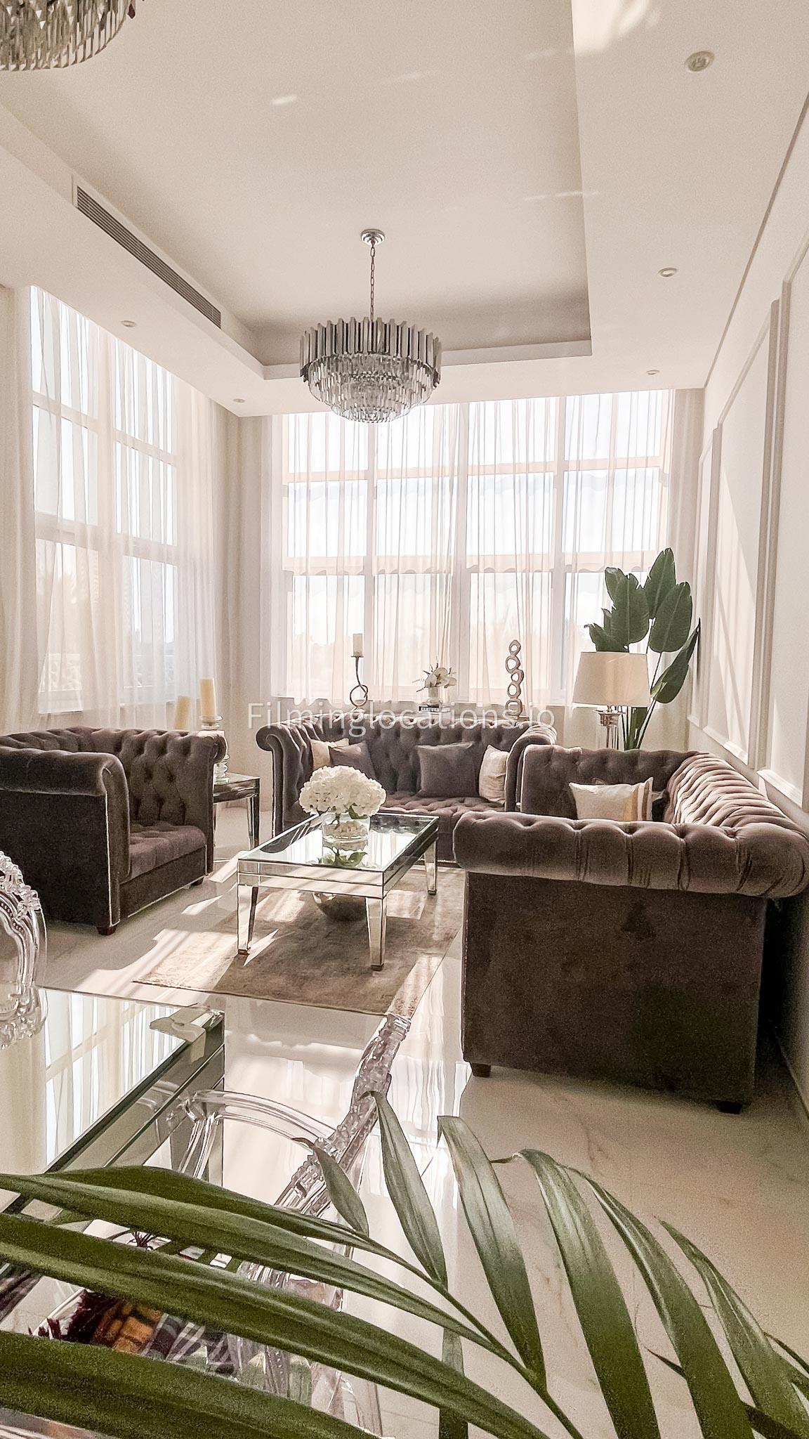 Our villa features a stunning living room adorned with stylish blue furnishings, complemented by golden sconces and grand chandeliers. We have two kitchens, one elegantly designed with white marble and wicker accents, while the other is adorned with grey furniture and includes a central island. The two bedrooms exude a sense of royalty with their sophisticated elegance.