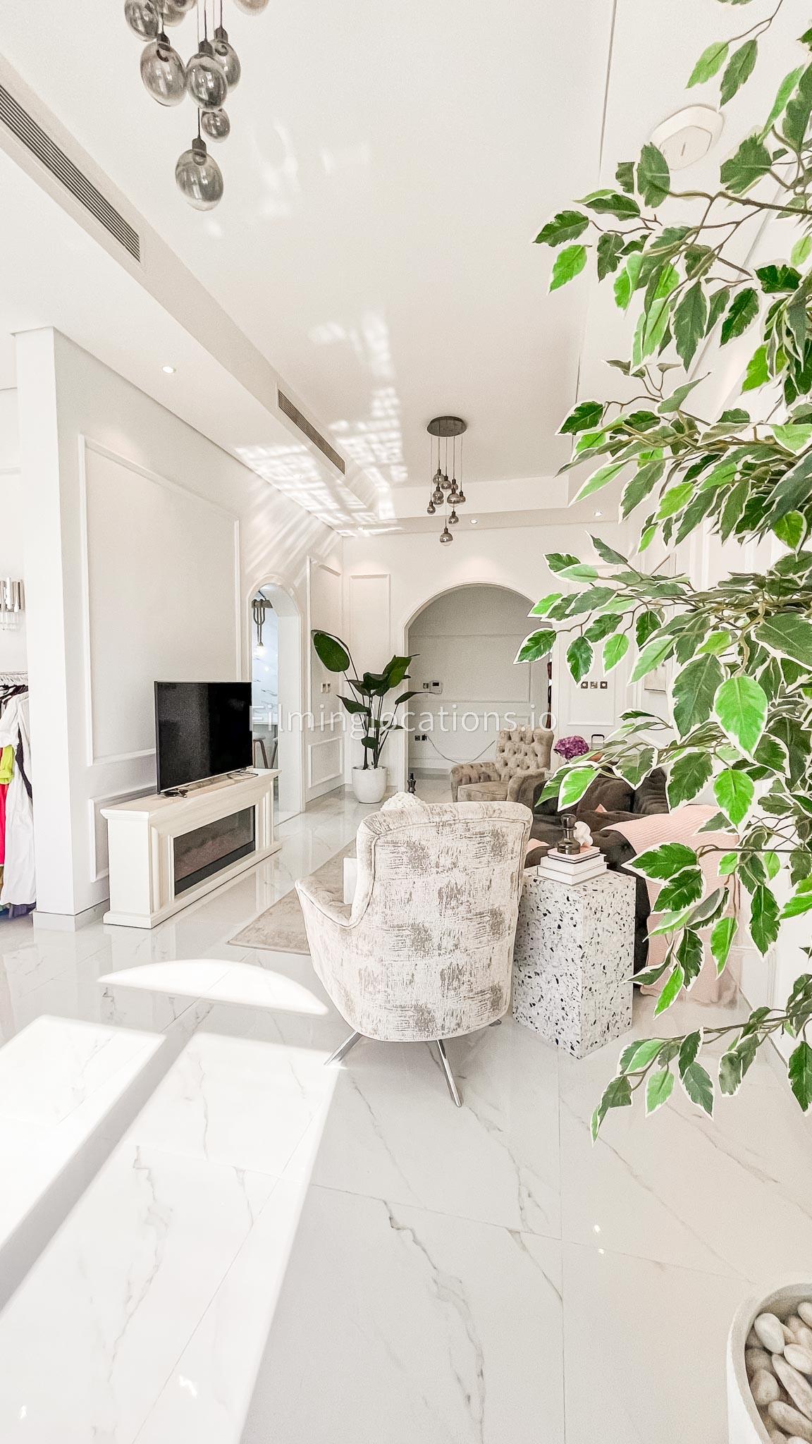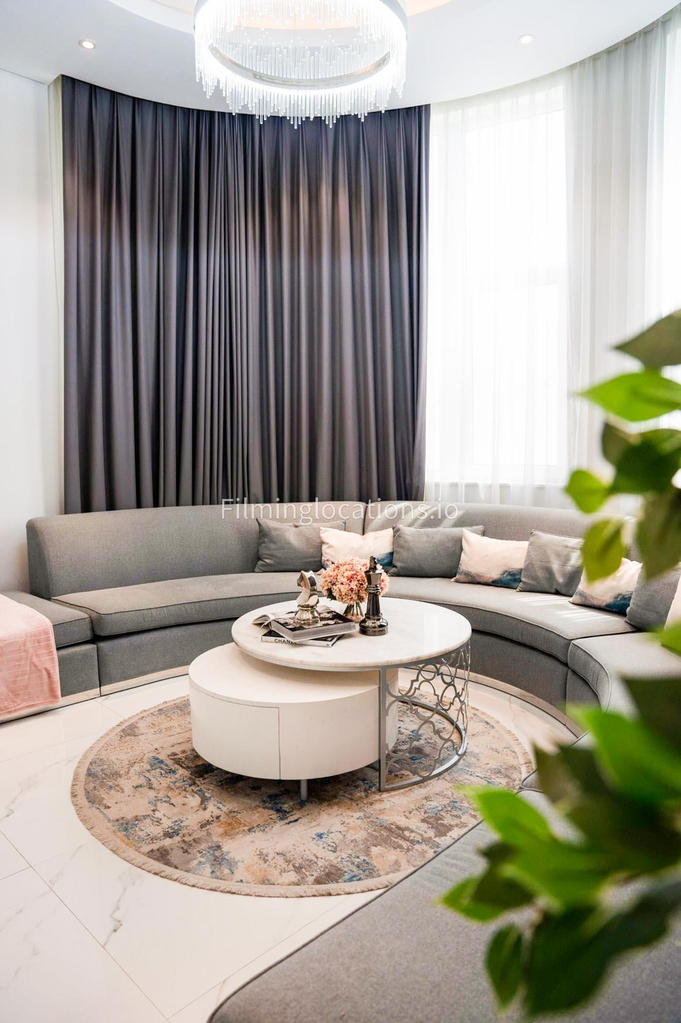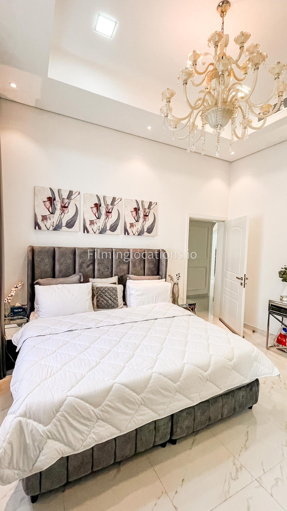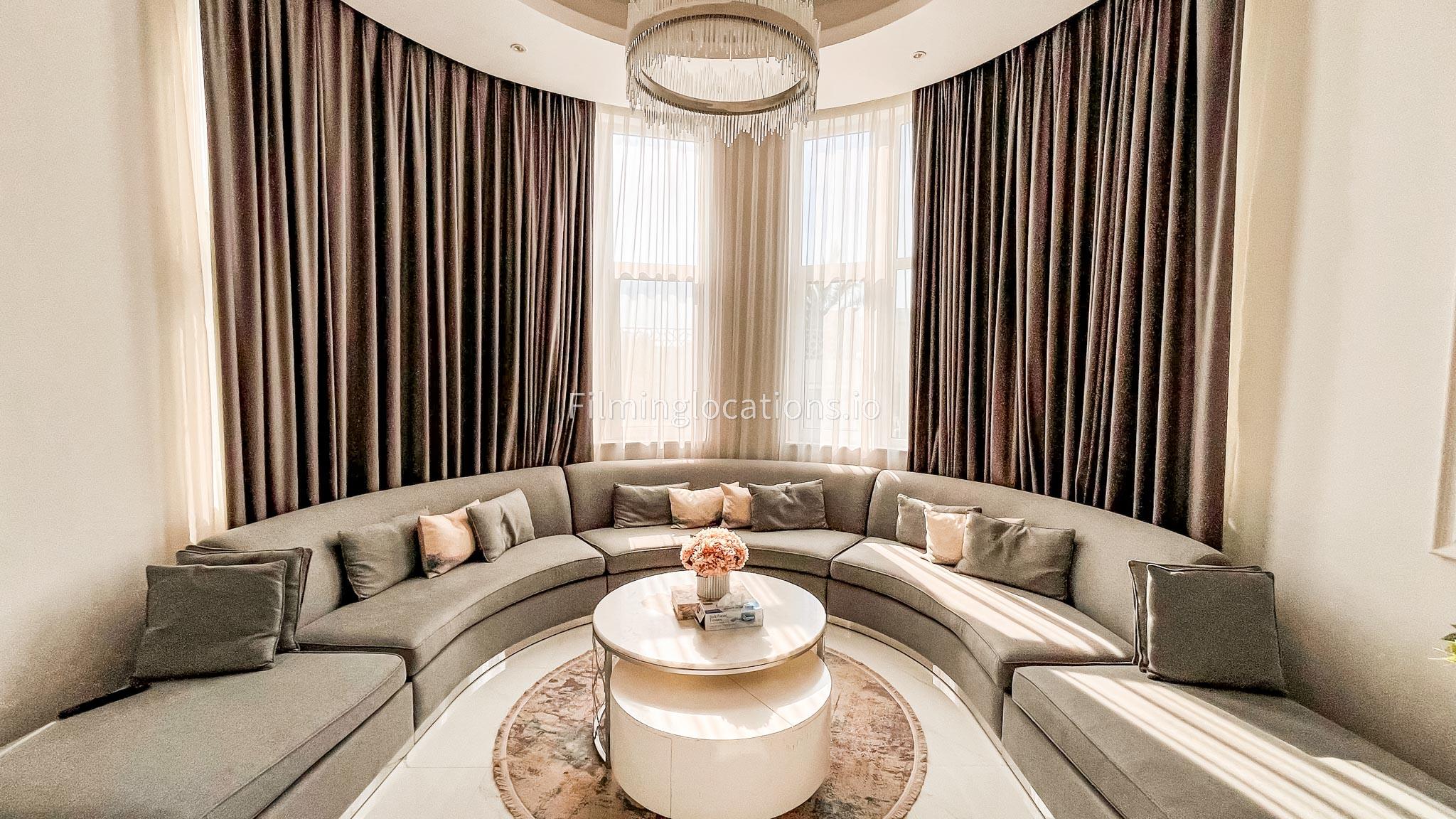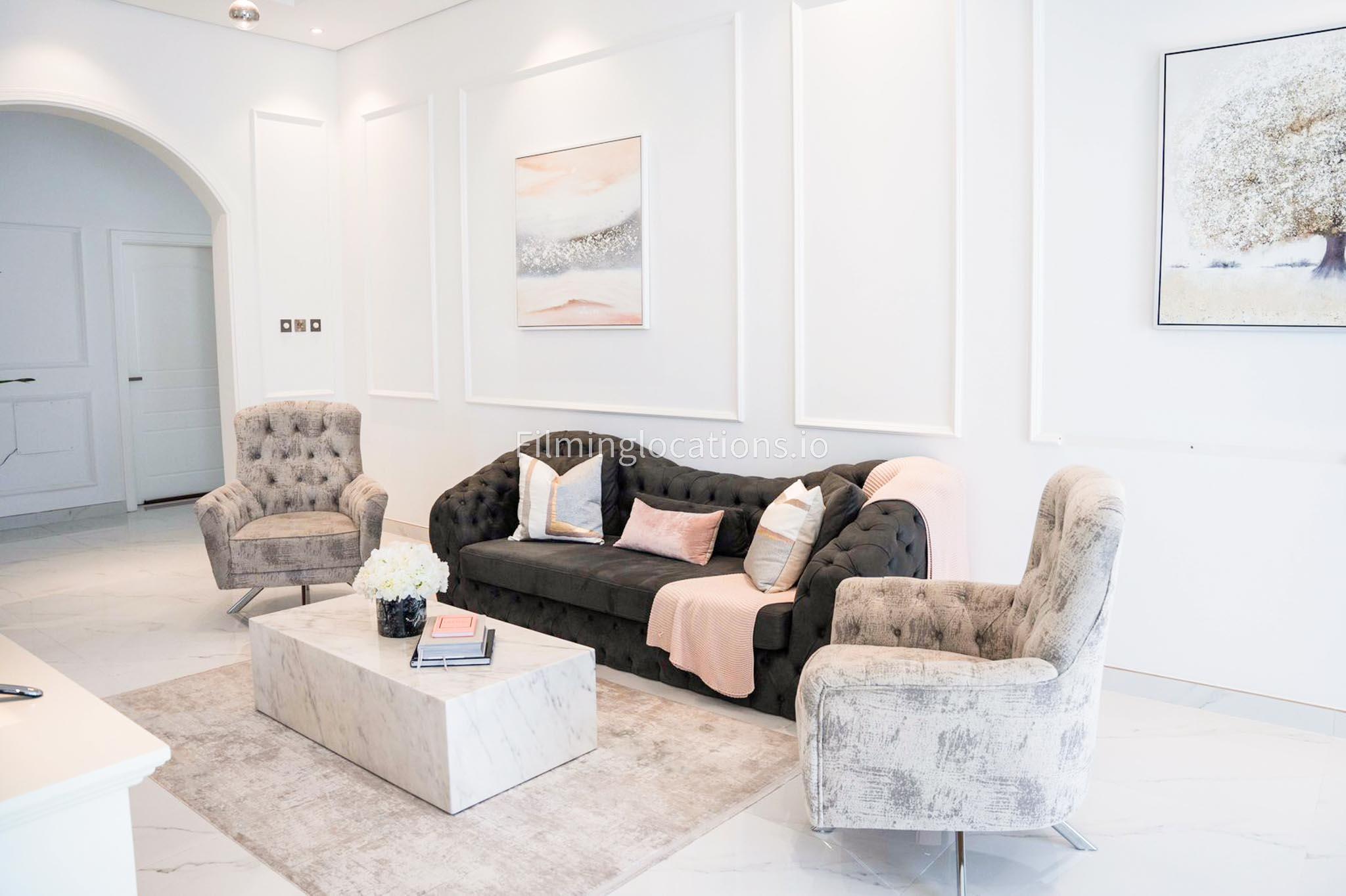 Our villa features a stunning living room adorned with stylish blue furnishings, complemented by golden sconces and grand chandeliers. We have two kitchens, one elegantly designed with white marble and wicker accents, while the other is adorned with grey furniture and includes a central island. The two bedrooms exude a sense of royalty with their sophisticated elegance.
