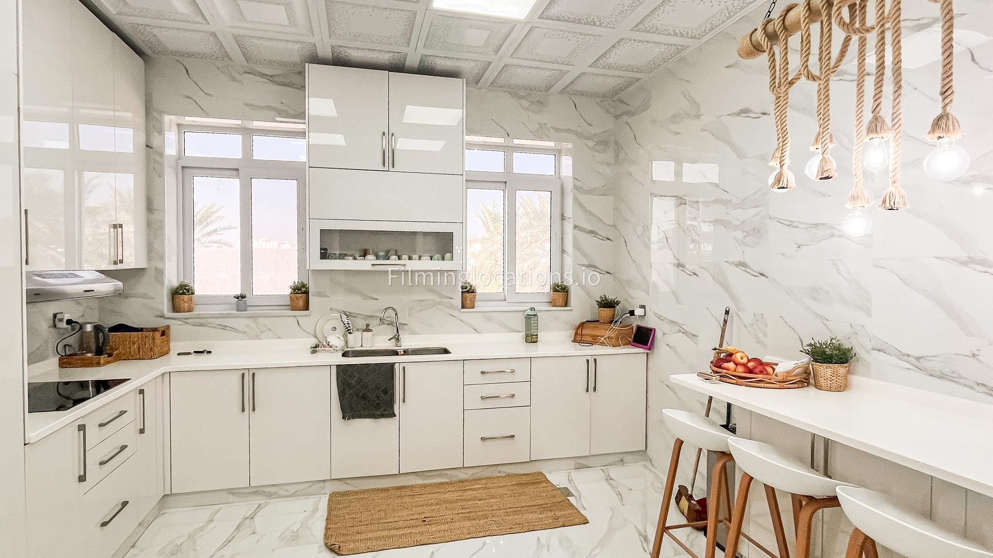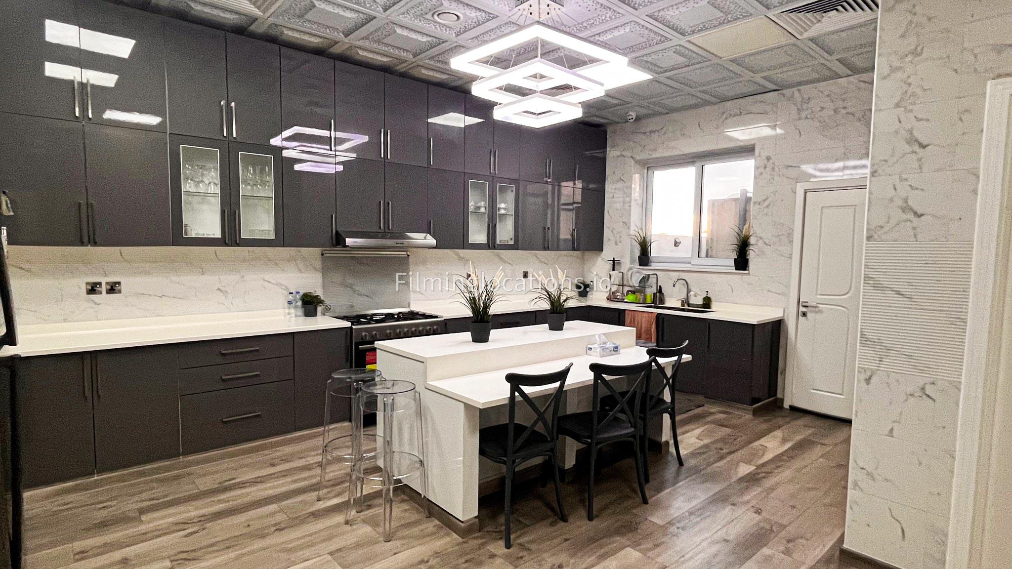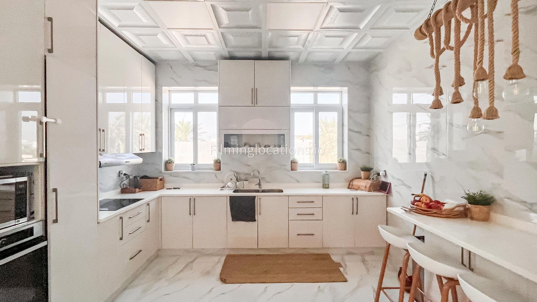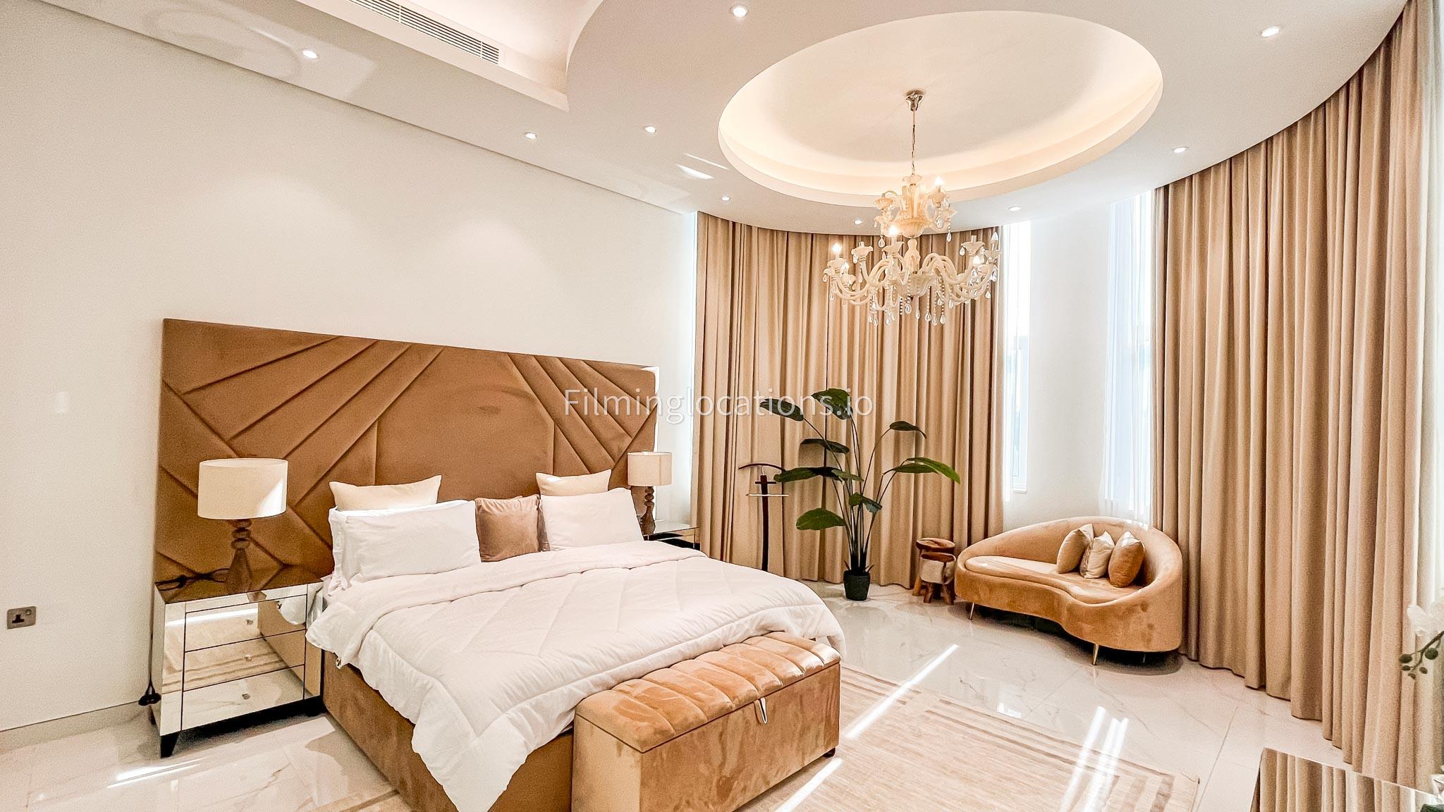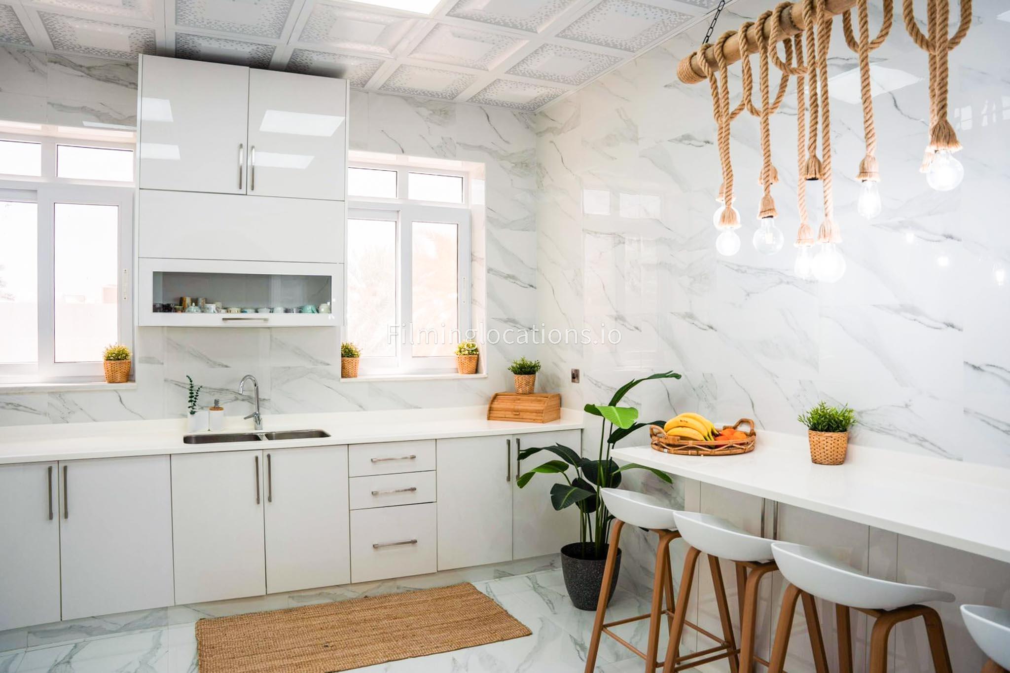Our villa features a stunning living room adorned with stylish blue furnishings, complemented by golden sconces and grand chandeliers. We have two kitchens, one elegantly designed with white marble and wicker accents, while the other is adorned with grey furniture and includes a central island. The two bedrooms exude a sense of royalty with their sophisticated elegance.