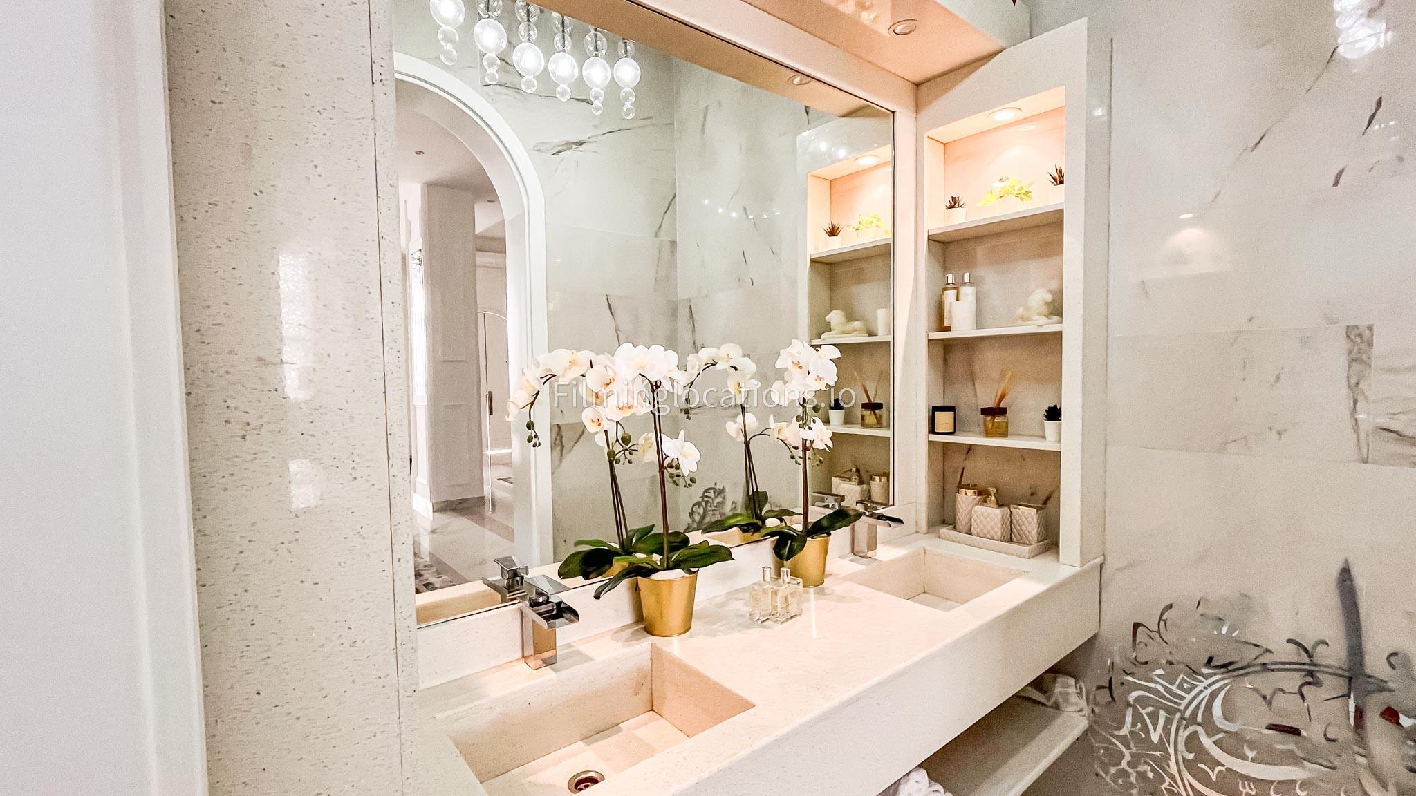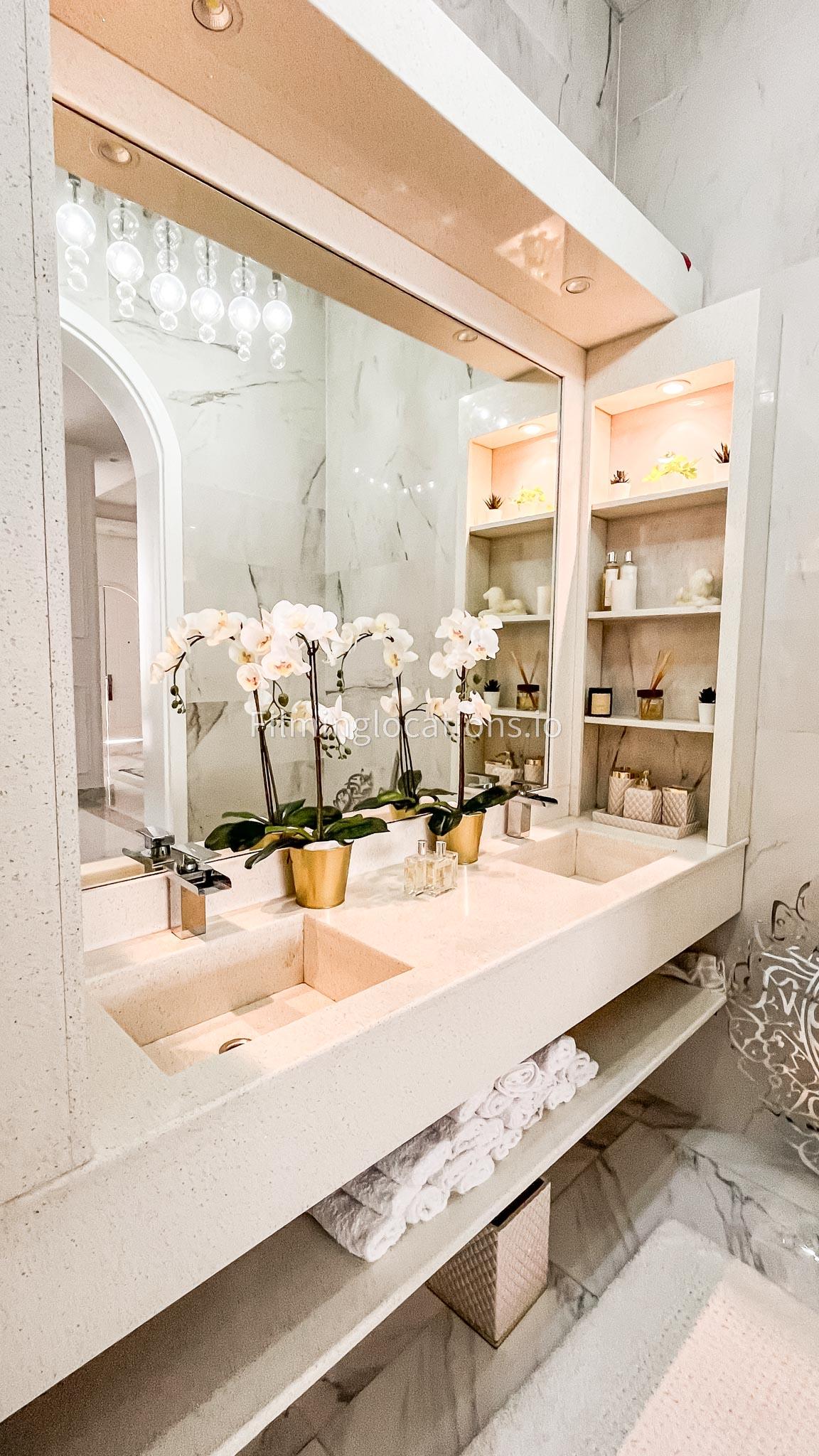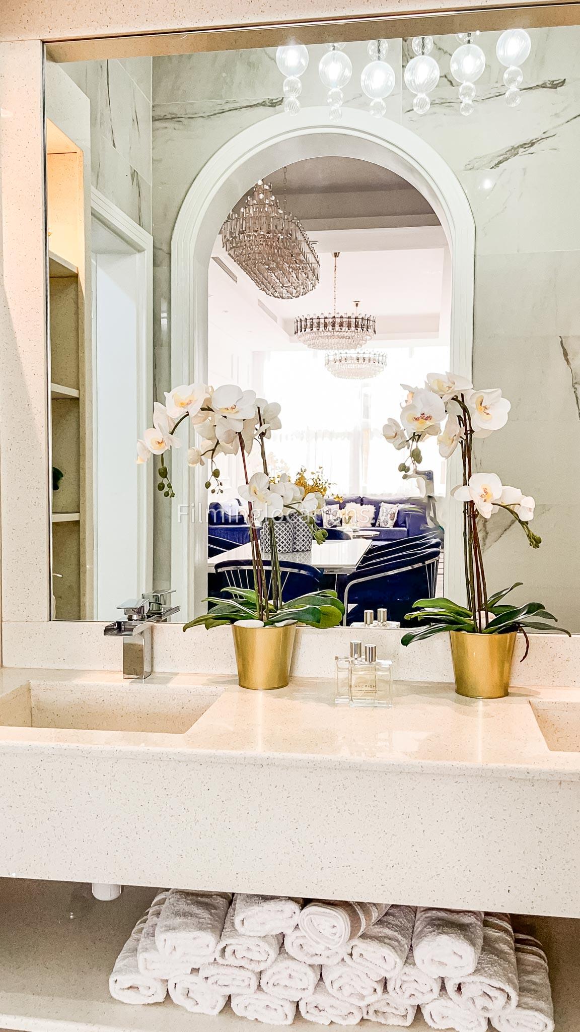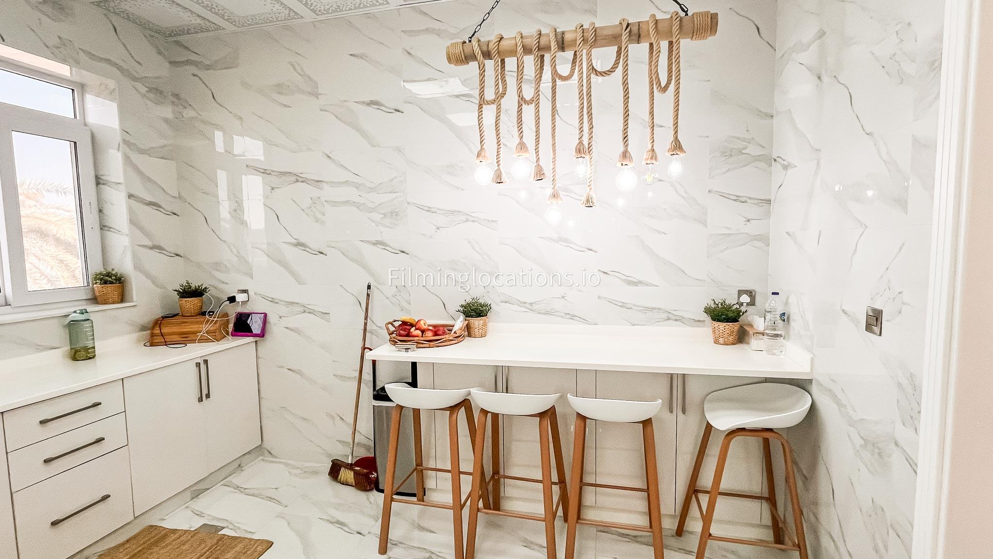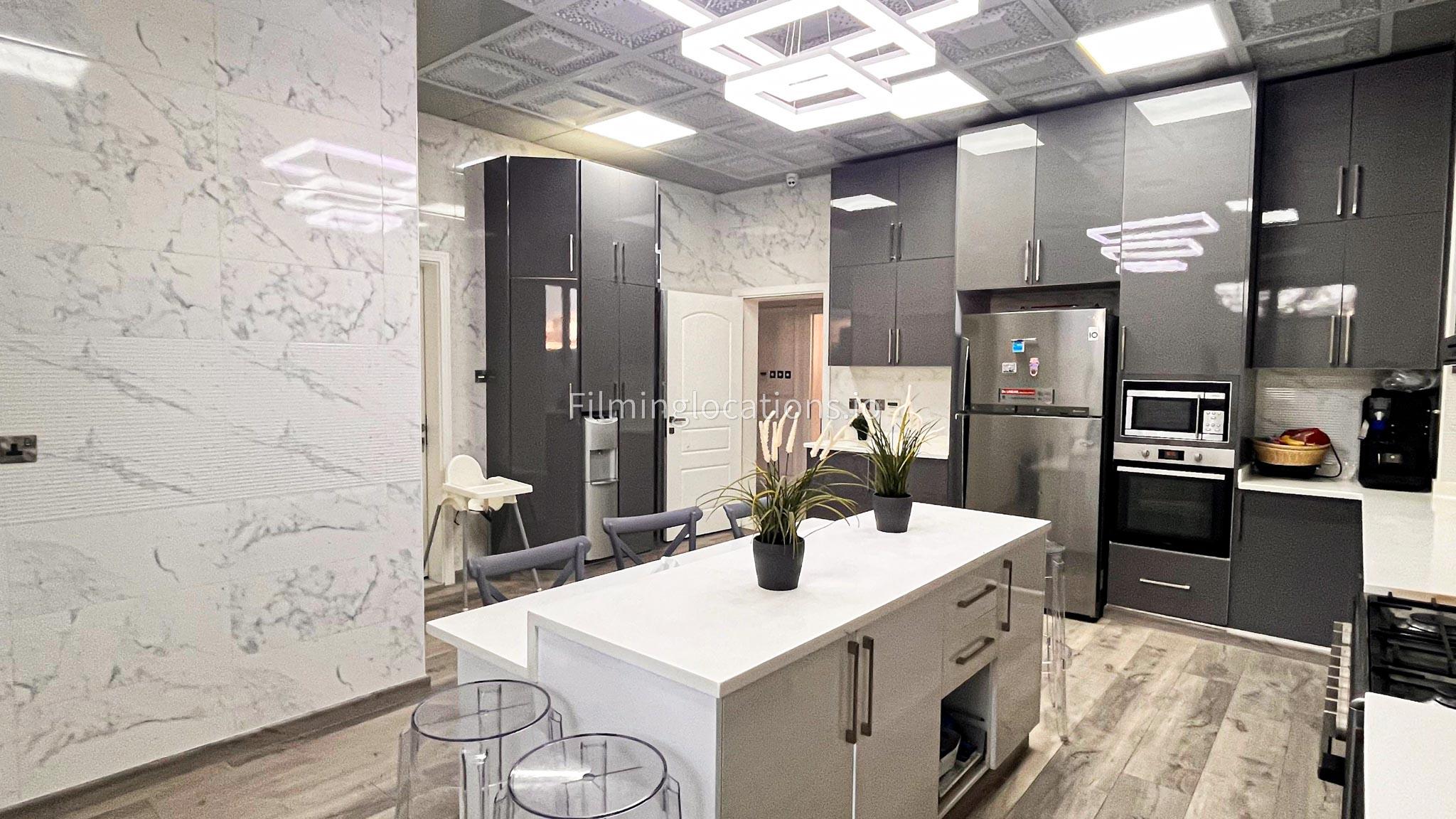 Our villa features a stunning living room adorned with stylish blue furnishings, complemented by golden sconces and grand chandeliers. We have two kitchens, one elegantly designed with white marble and wicker accents, while the other is adorned with grey furniture and includes a central island. The two bedrooms exude a sense of royalty with their sophisticated elegance.