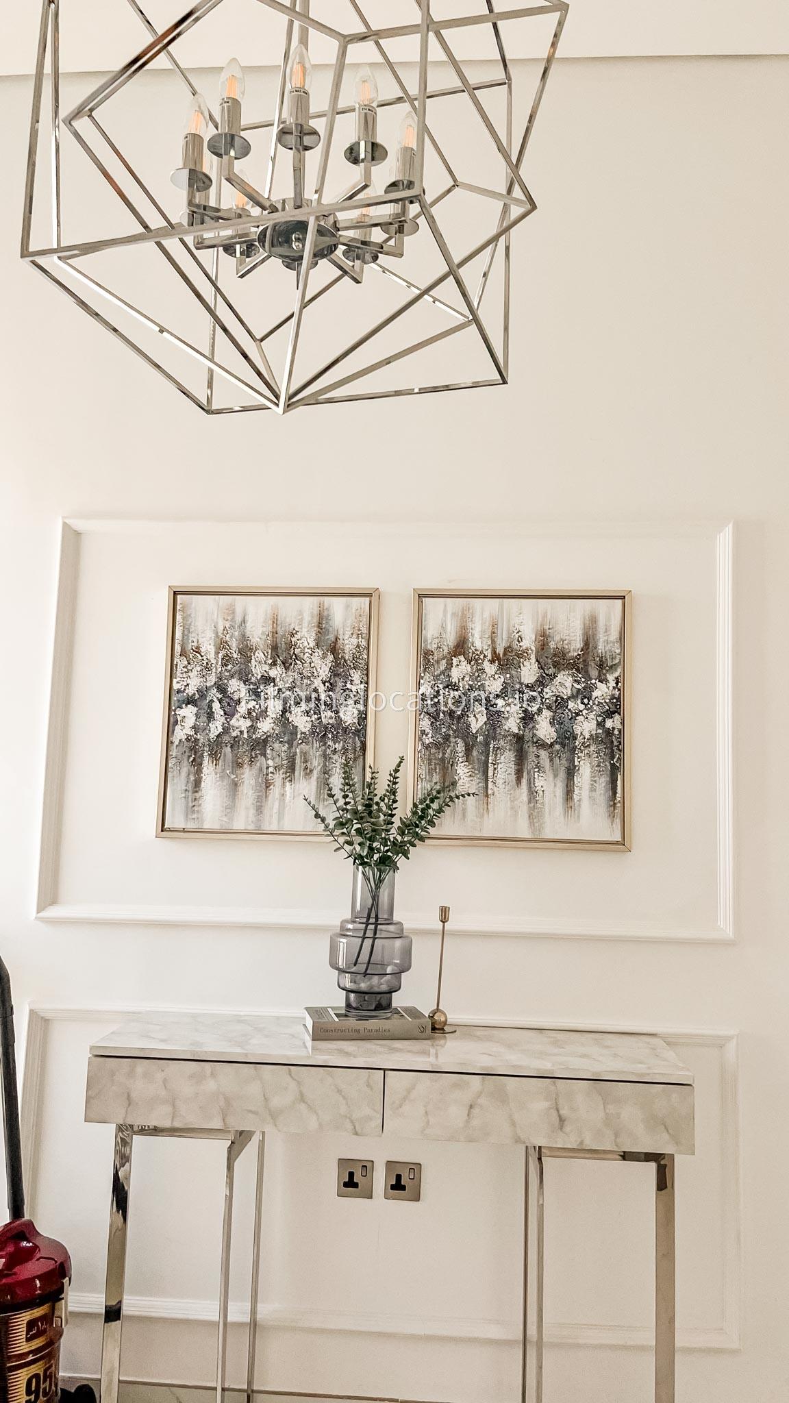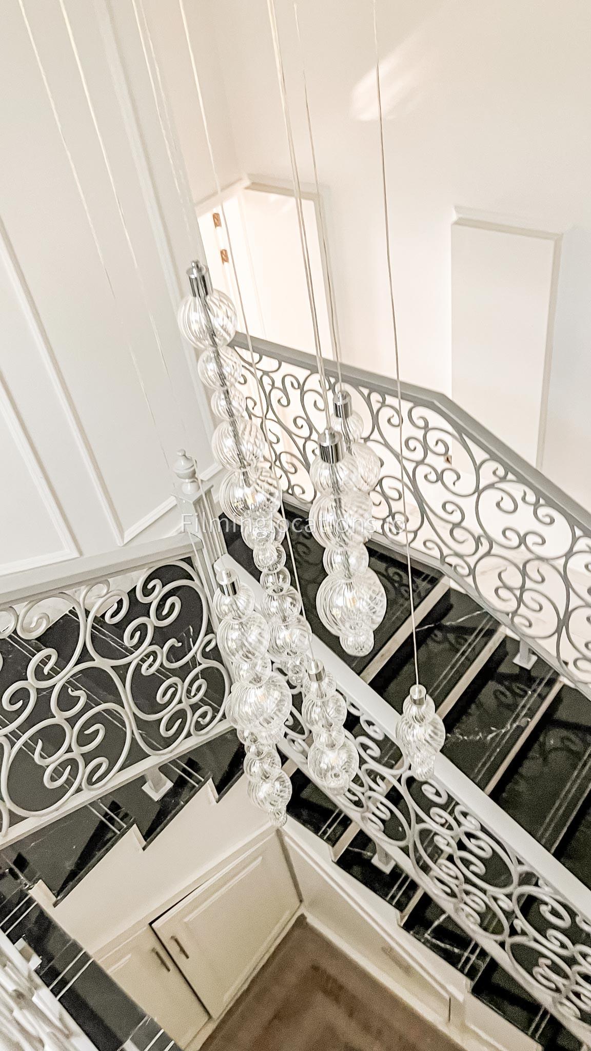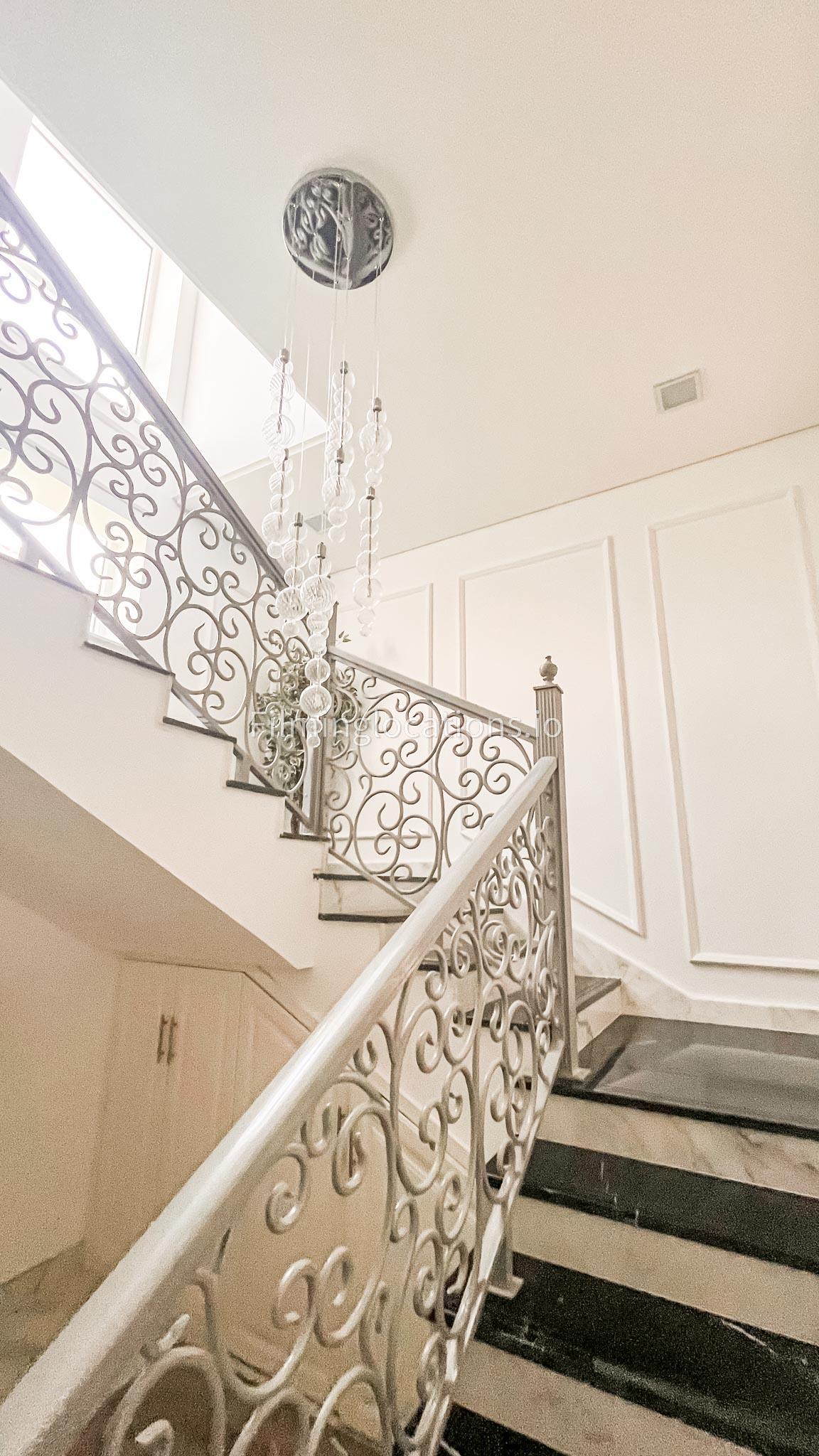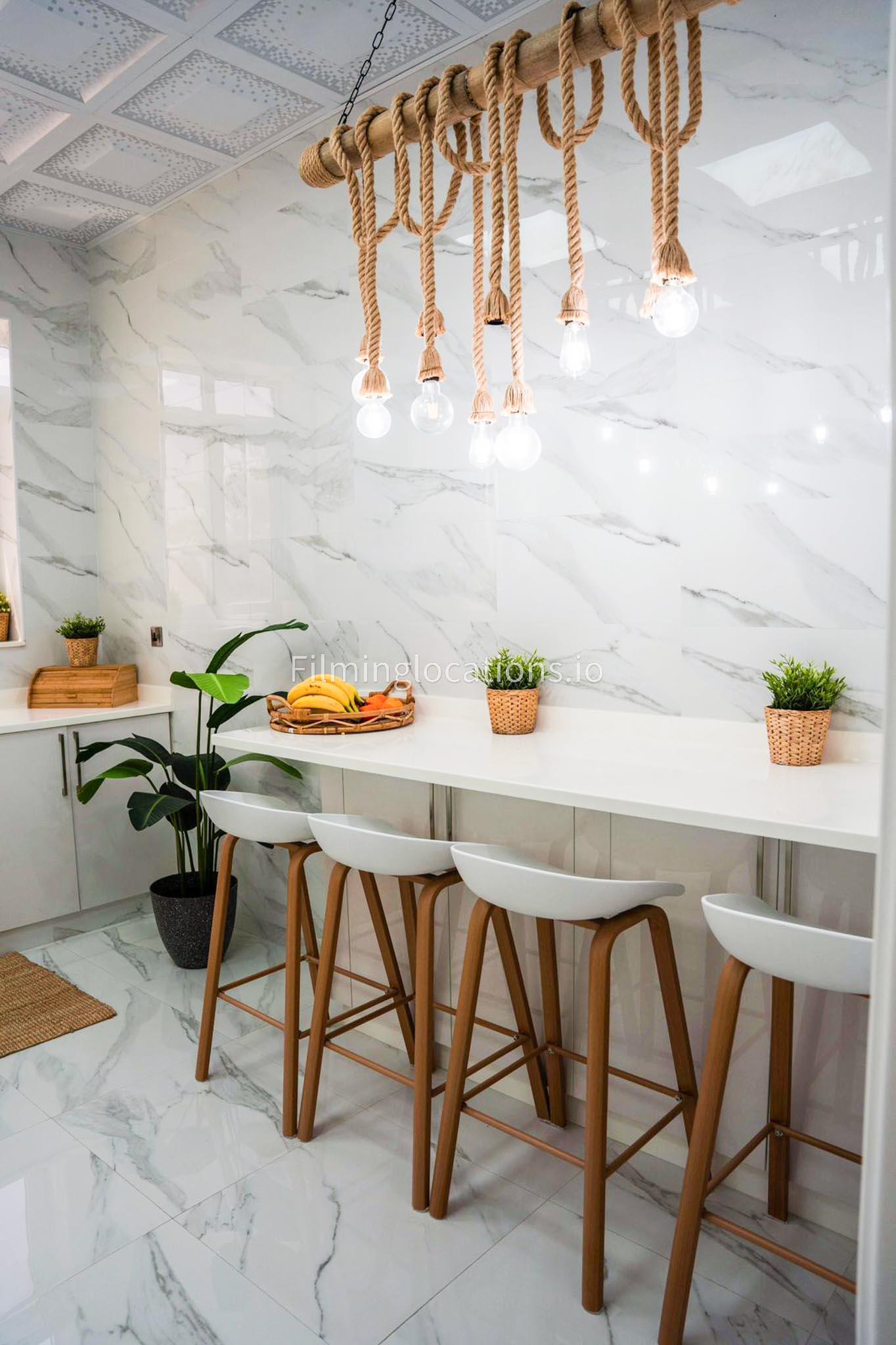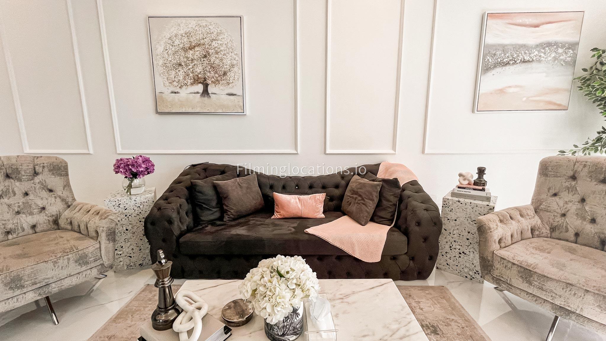 Our villa features a stunning living room adorned with stylish blue furnishings, complemented by golden sconces and grand chandeliers. We have two kitchens, one elegantly designed with white marble and wicker accents, while the other is adorned with grey furniture and includes a central island. The two bedrooms exude a sense of royalty with their sophisticated elegance.