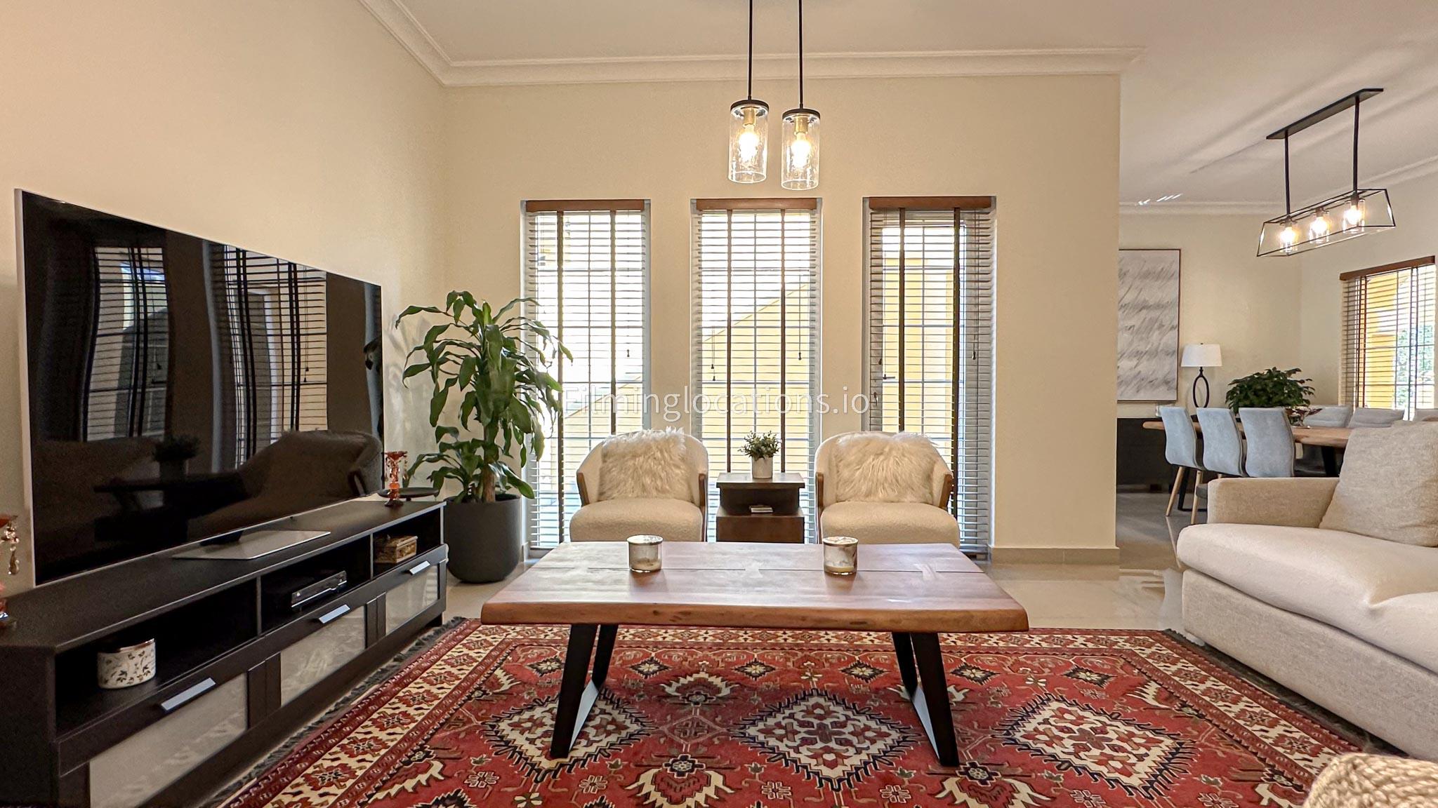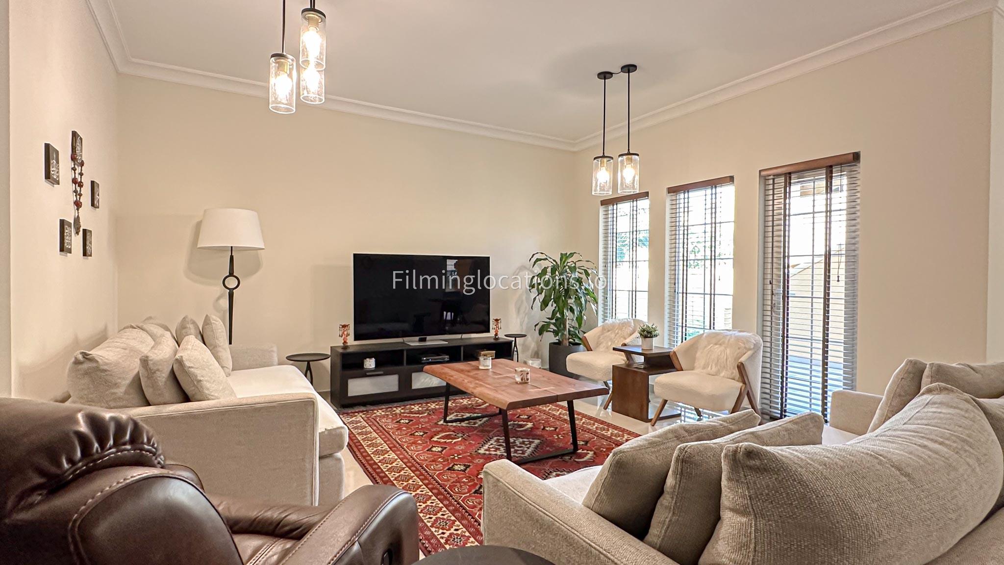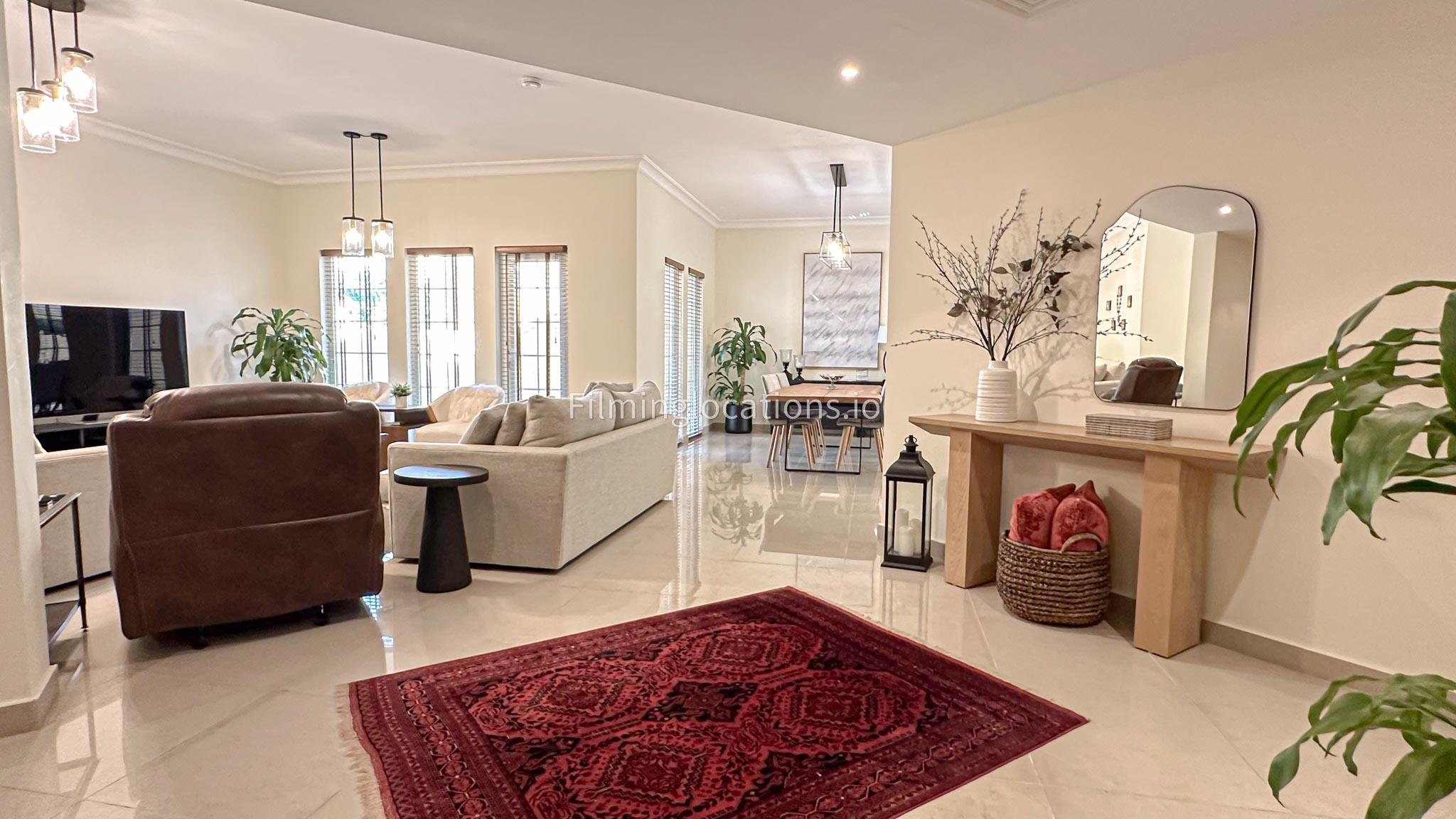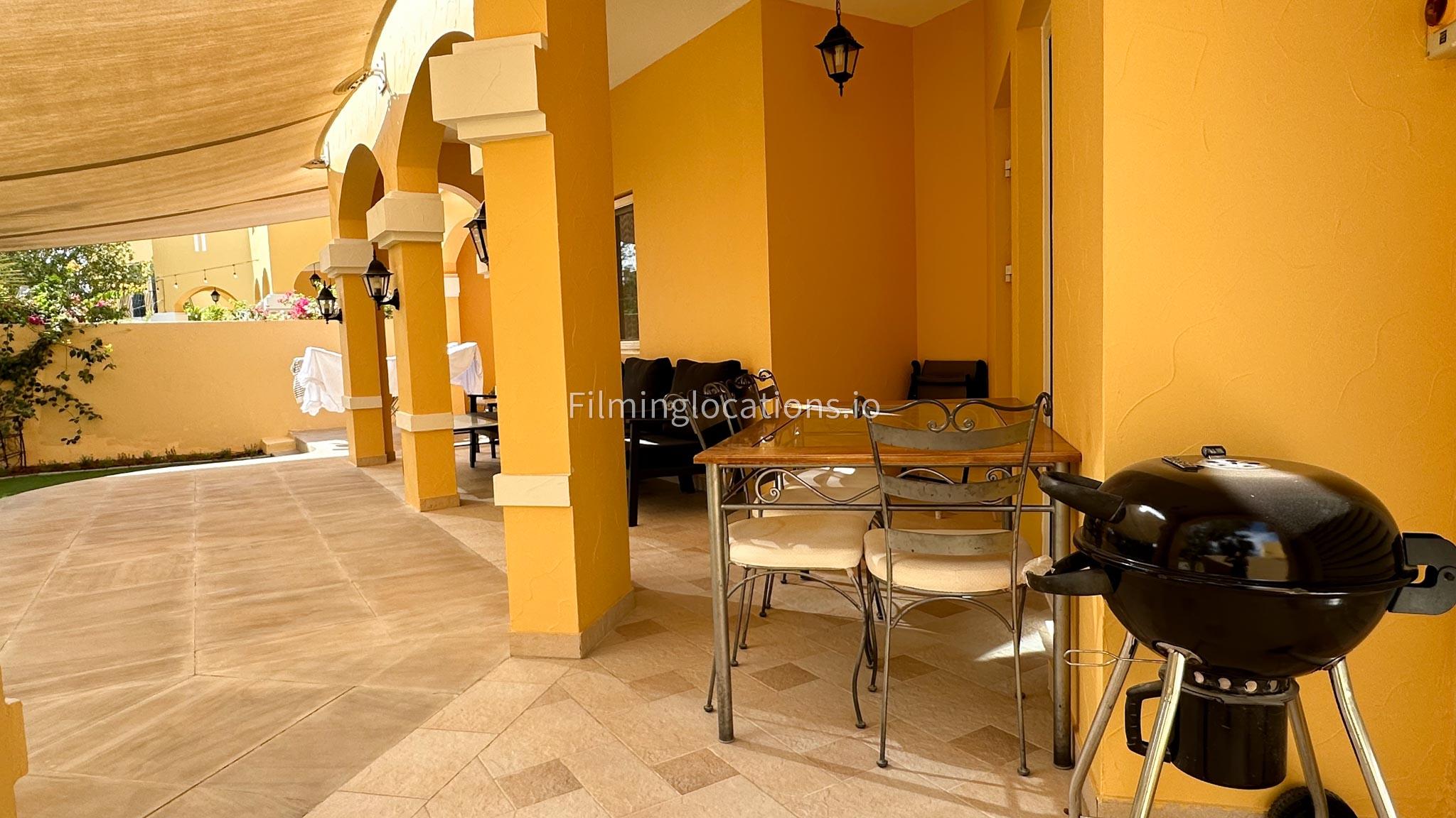 Our villa features a charming living room that embraces the sunrise, accompanied by an elegant dining area. The spacious backyard, adorned with delightful patio furniture and a BBQ grill, is easily accessible. Upstairs, a second living space with a balcony offers a scenic view of the lush green backyard. Filmmakers will appreciate the picturesque setting and versatile spaces for capturing dynamic scenes in both the cozy interior and the inviting outdoor area.