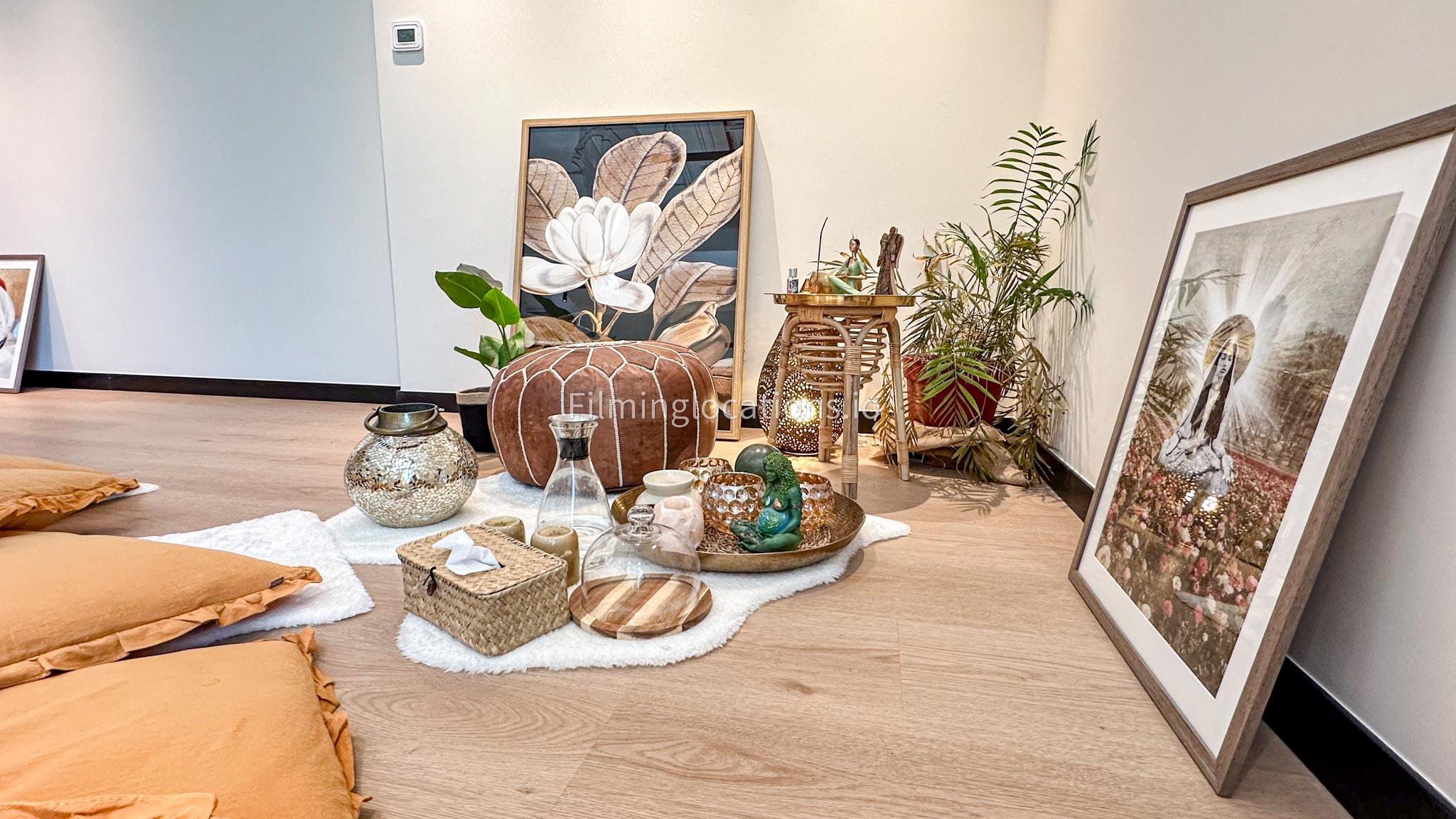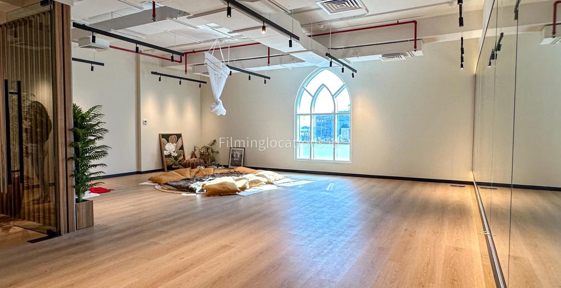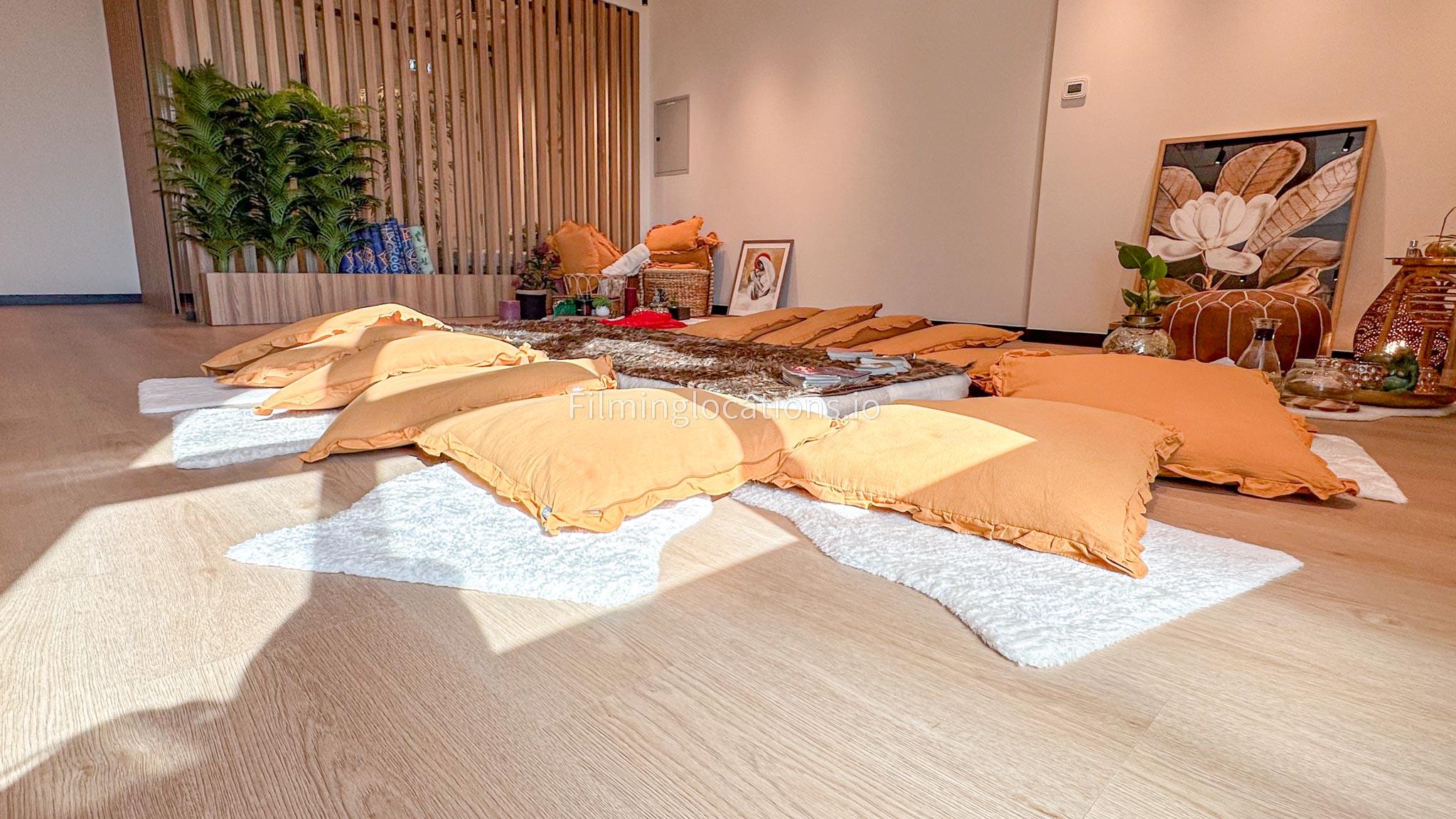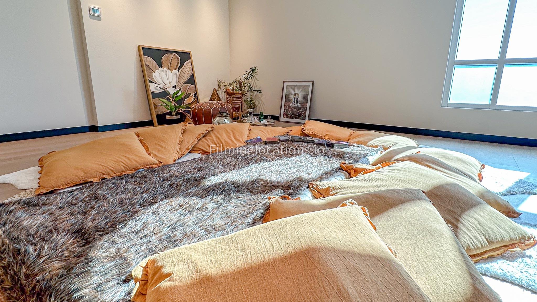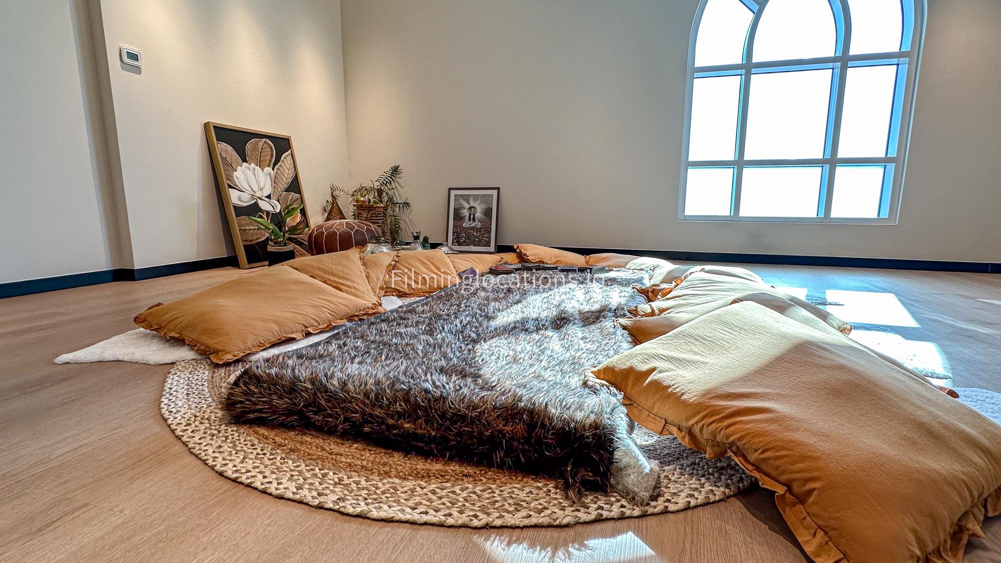 Our dance and yoga studio is a spacious with a bohemian vibe. Adorned with plants, pillows, and rugs to enhance tranquility, it features a large window framing the sunrise. The full-length mirror wall adds a dynamic touch, perfect for capturing movement. Additionally, a small reception area, quaint pantry, and restroom complete the space. Ideal for filmmakers, our studio combines aesthetic charm with practical elements for dance and yoga scenes.