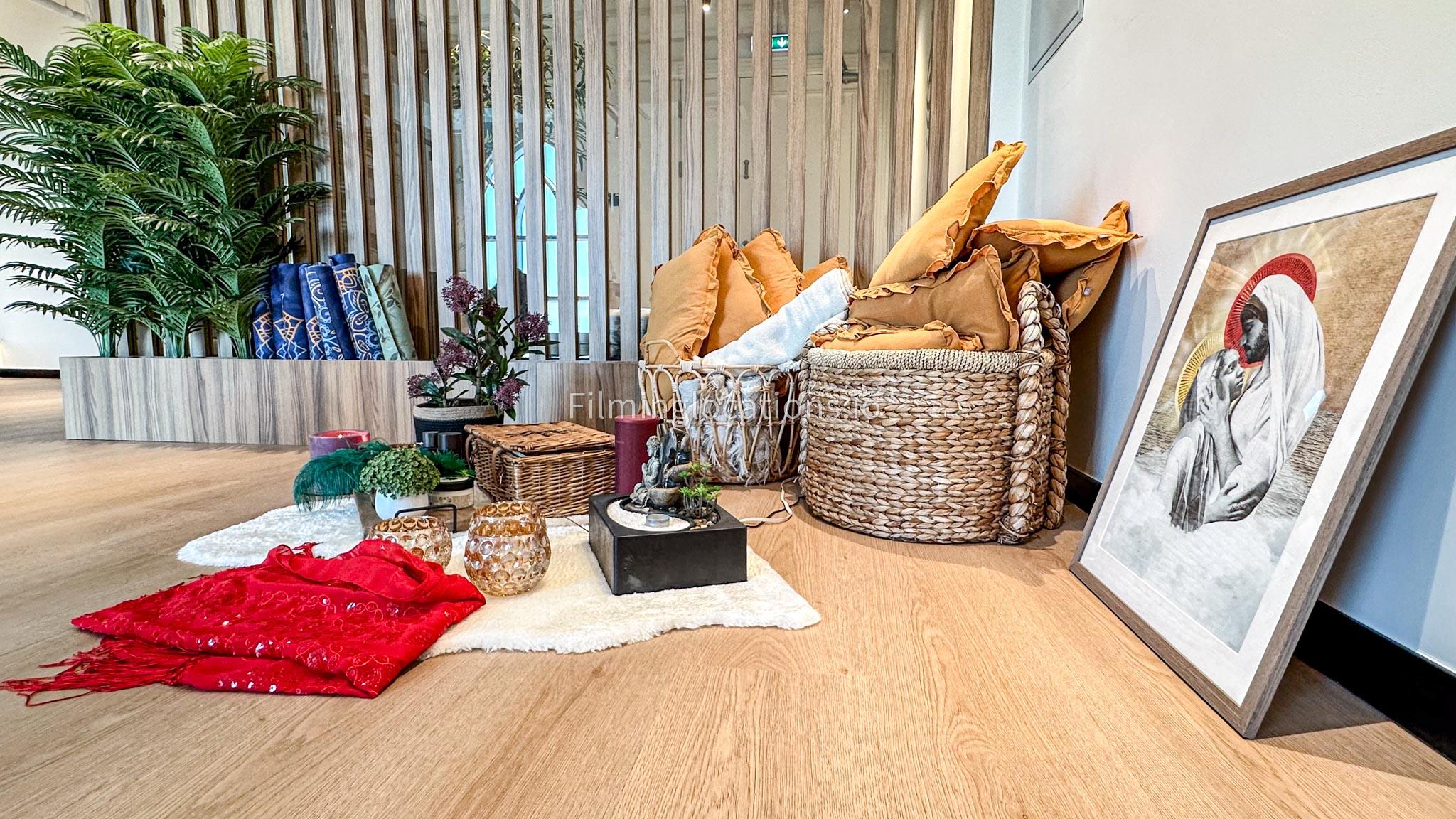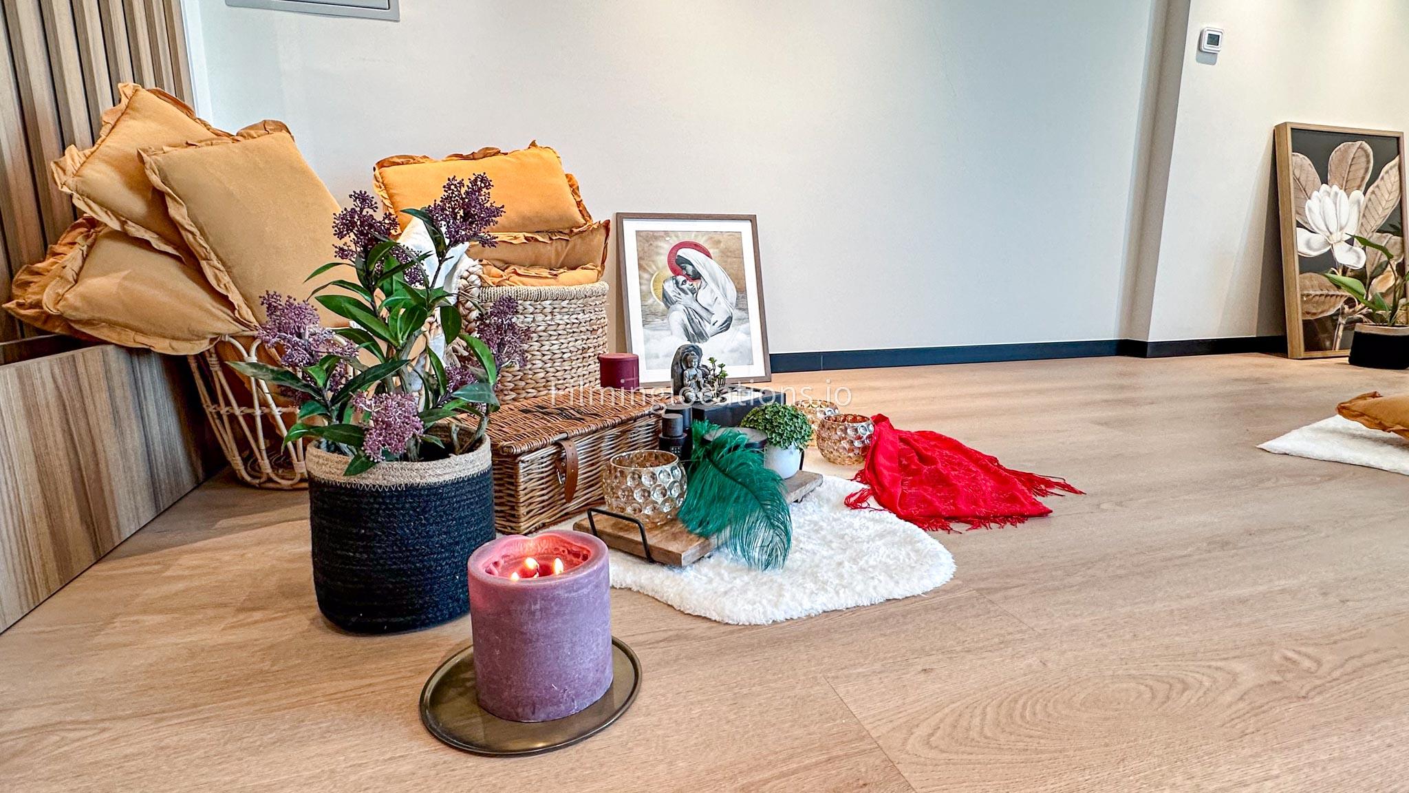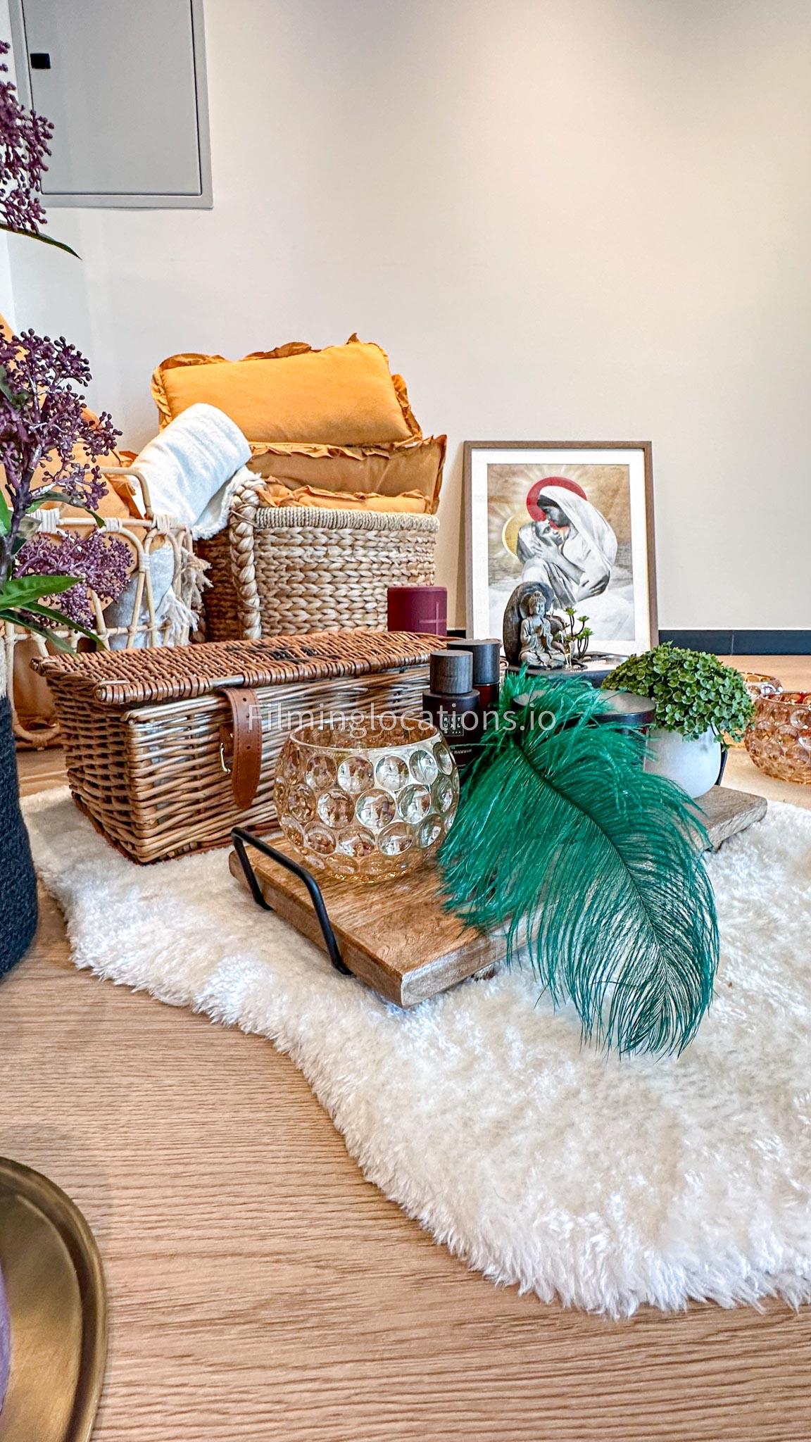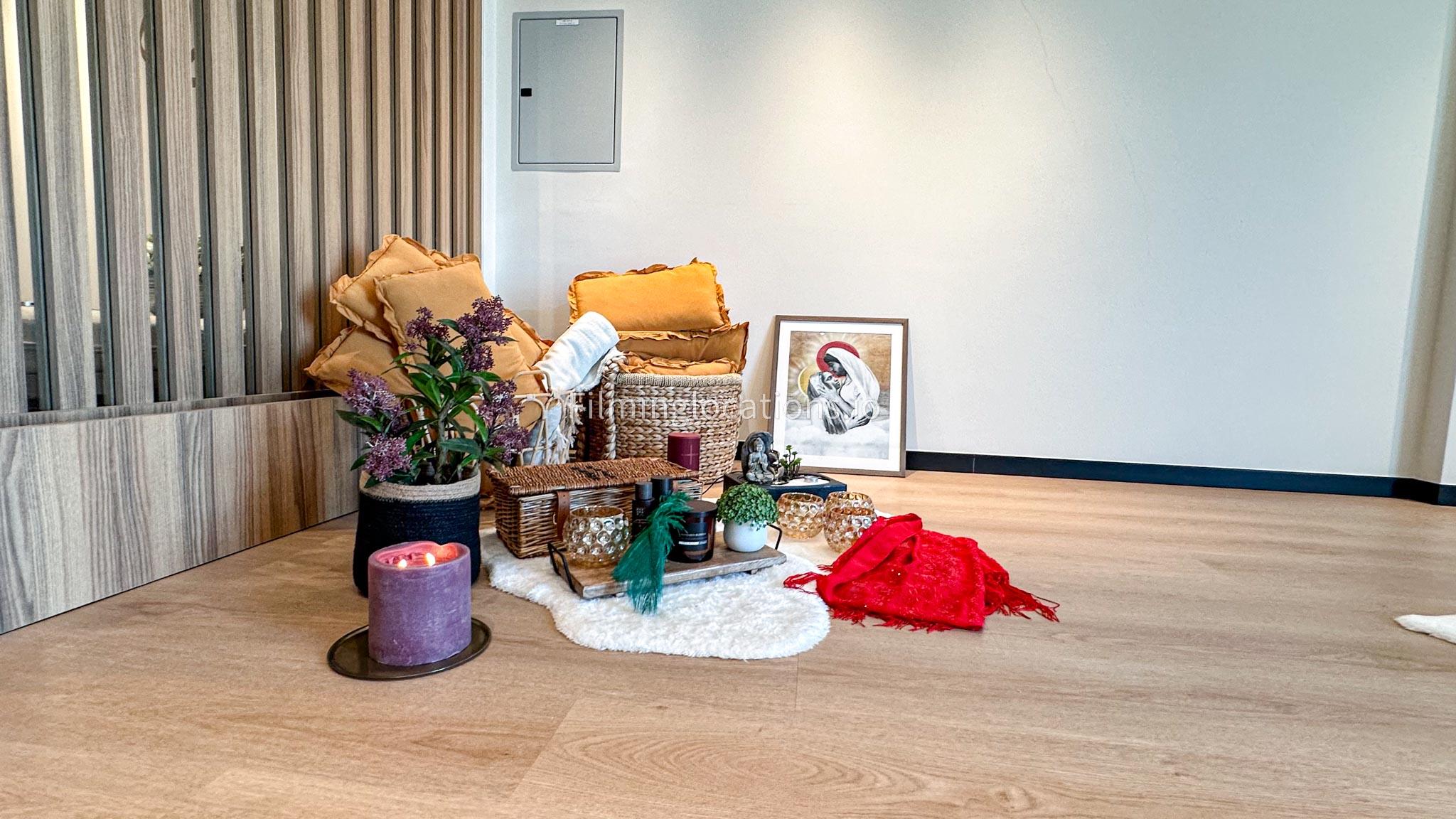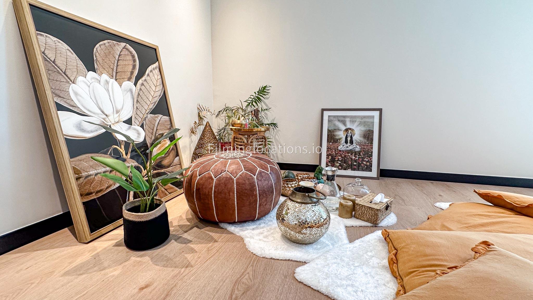 Our dance and yoga studio is a spacious with a bohemian vibe. Adorned with plants, pillows, and rugs to enhance tranquility, it features a large window framing the sunrise. The full-length mirror wall adds a dynamic touch, perfect for capturing movement. Additionally, a small reception area, quaint pantry, and restroom complete the space. Ideal for filmmakers, our studio combines aesthetic charm with practical elements for dance and yoga scenes.