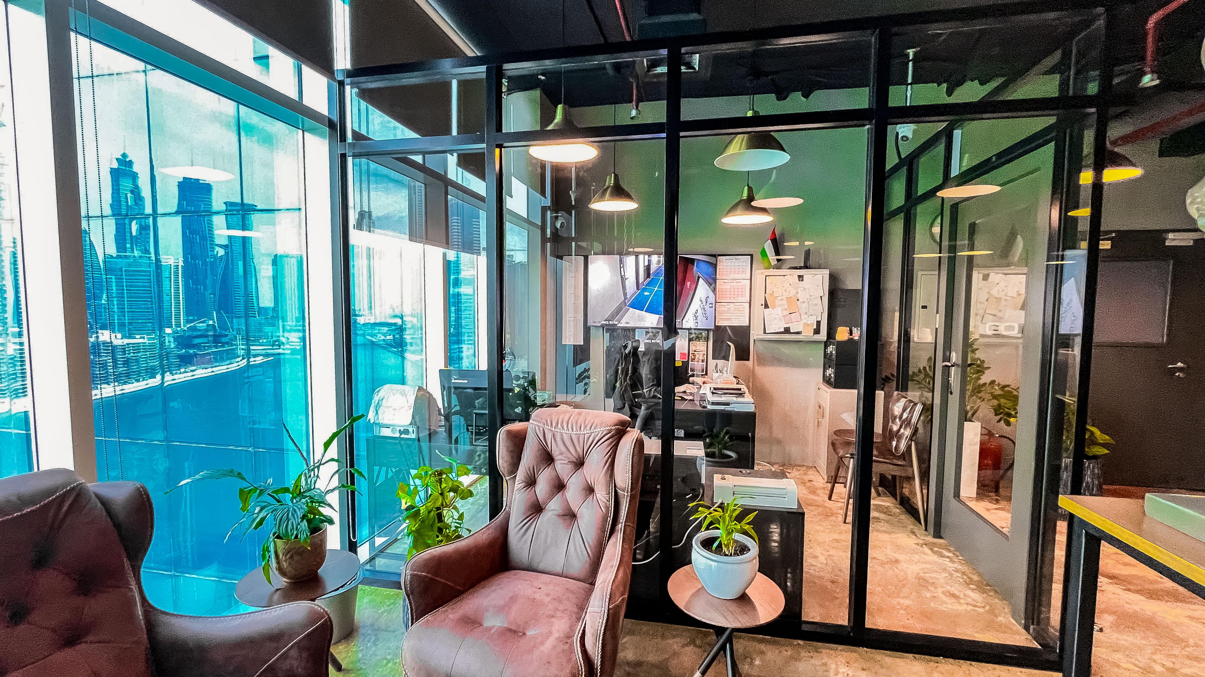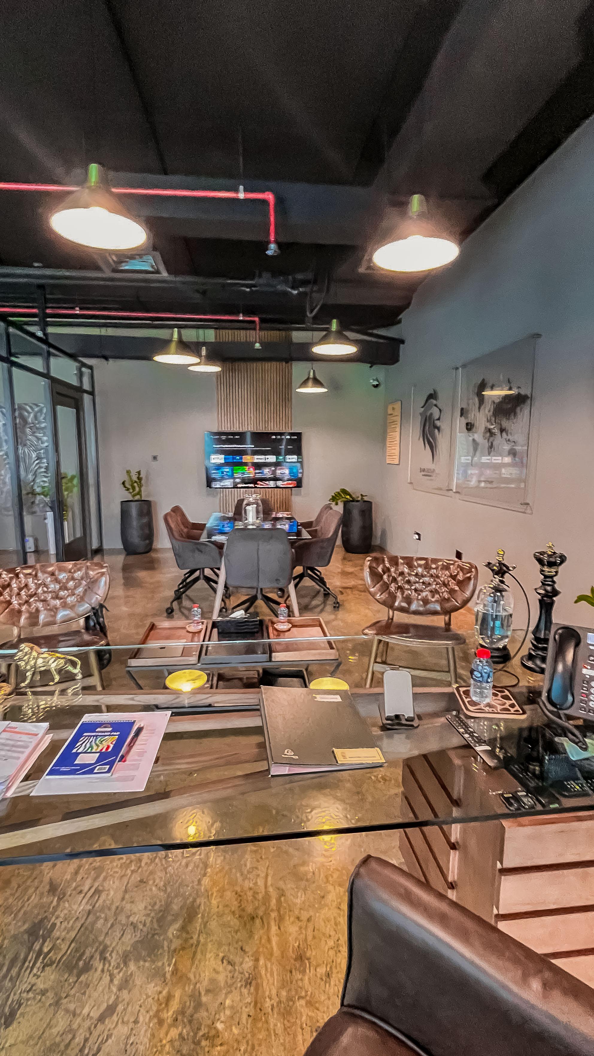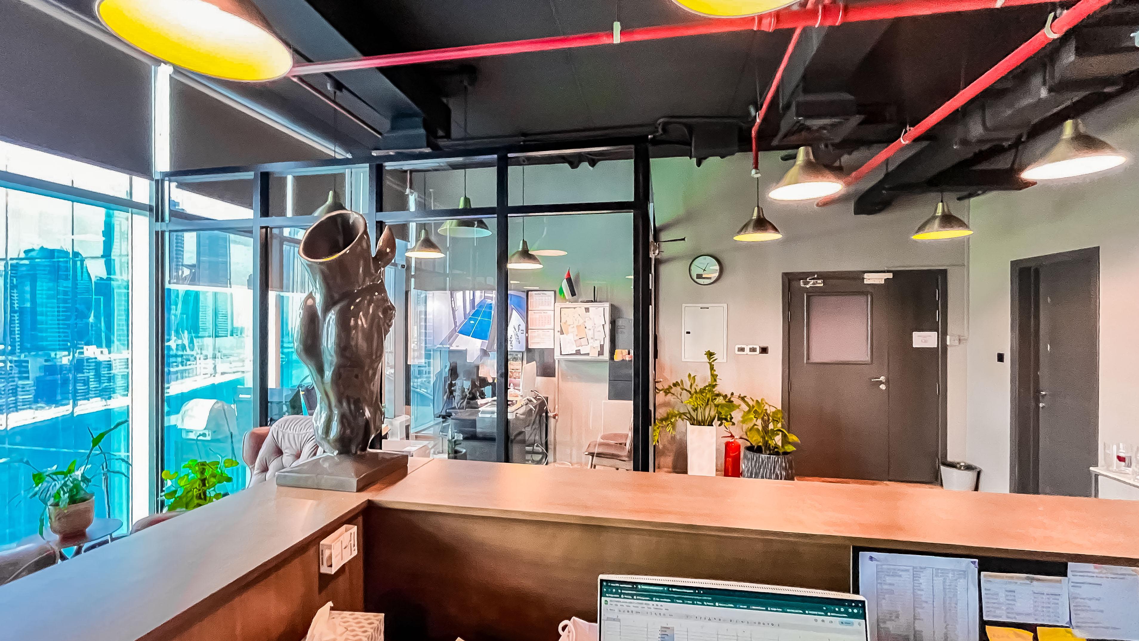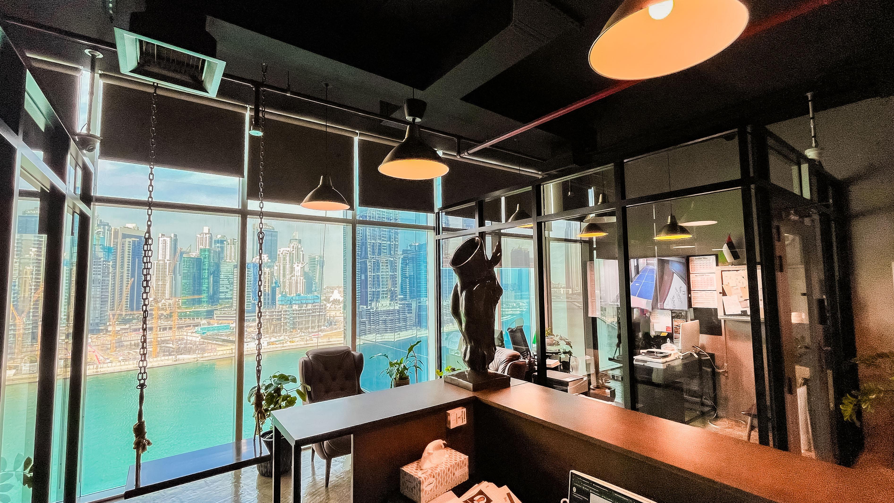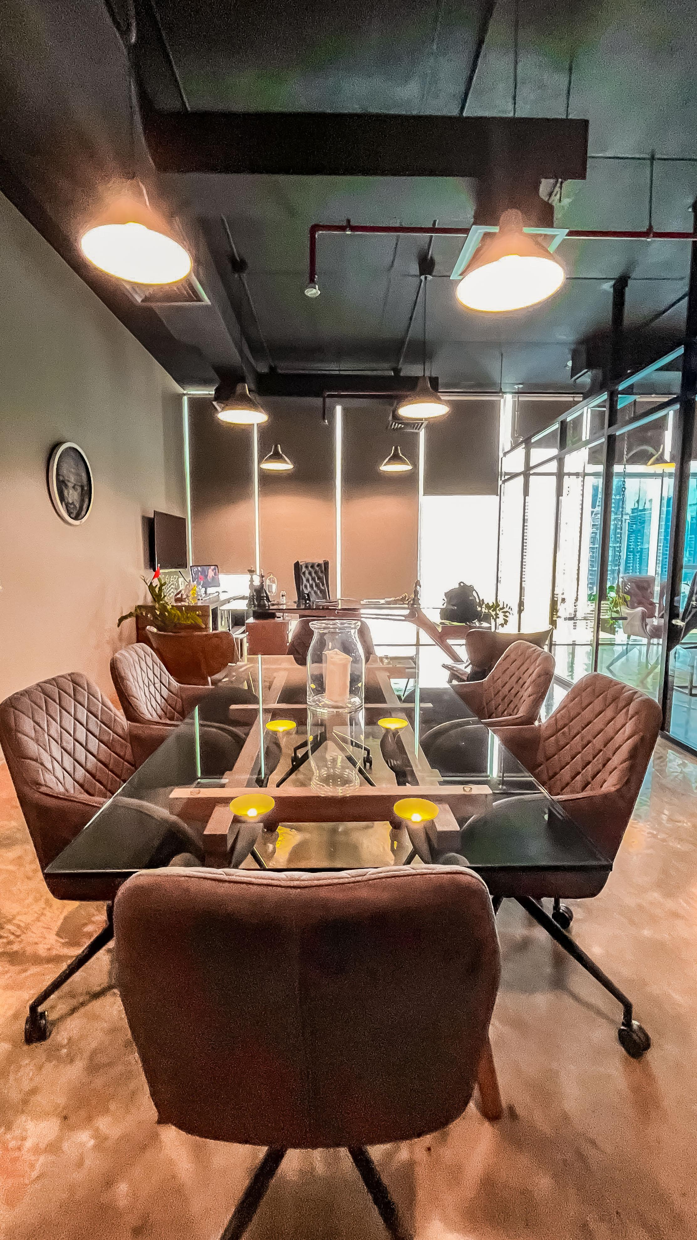 Our office boasts a distinct and stylish interior design, featuring expansive floor-to-ceiling windows that showcase the breathtaking Dubai skyline, especially highlighting the iconic Burj Khalifa. The elegant conference room is equipped with a glass conference table, plush chairs, and a TV, surrounded by glass walls for a modern touch. A sleek reception area welcomes visitors with its chic décor.