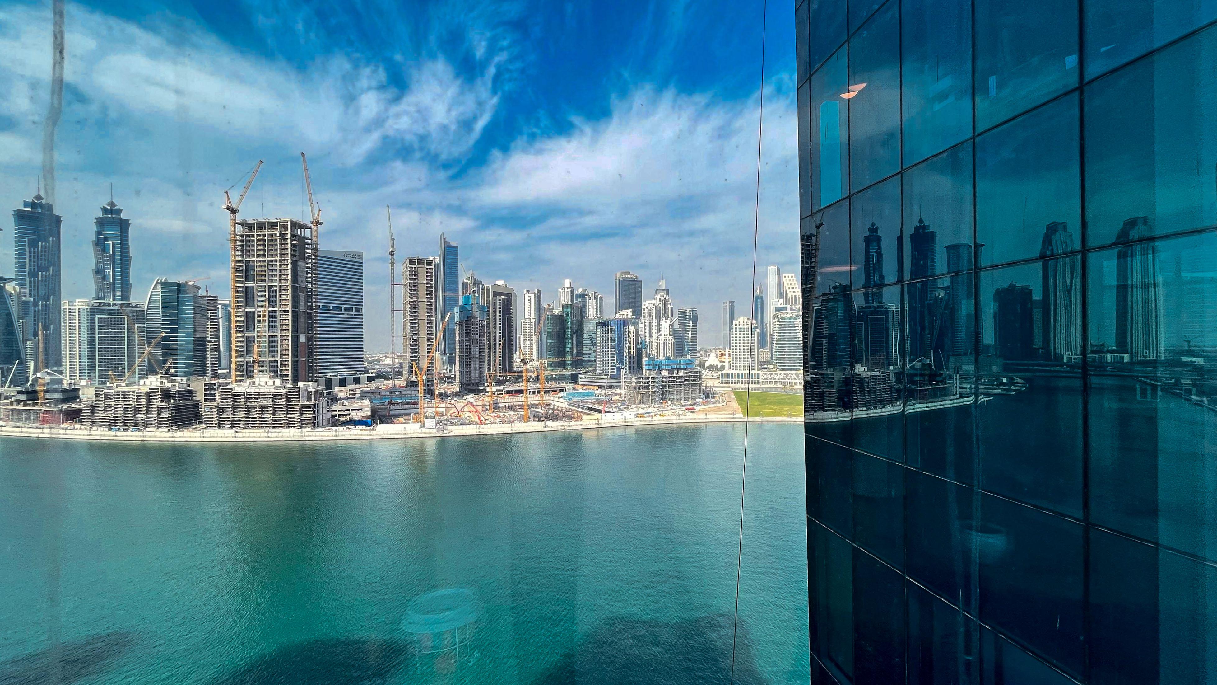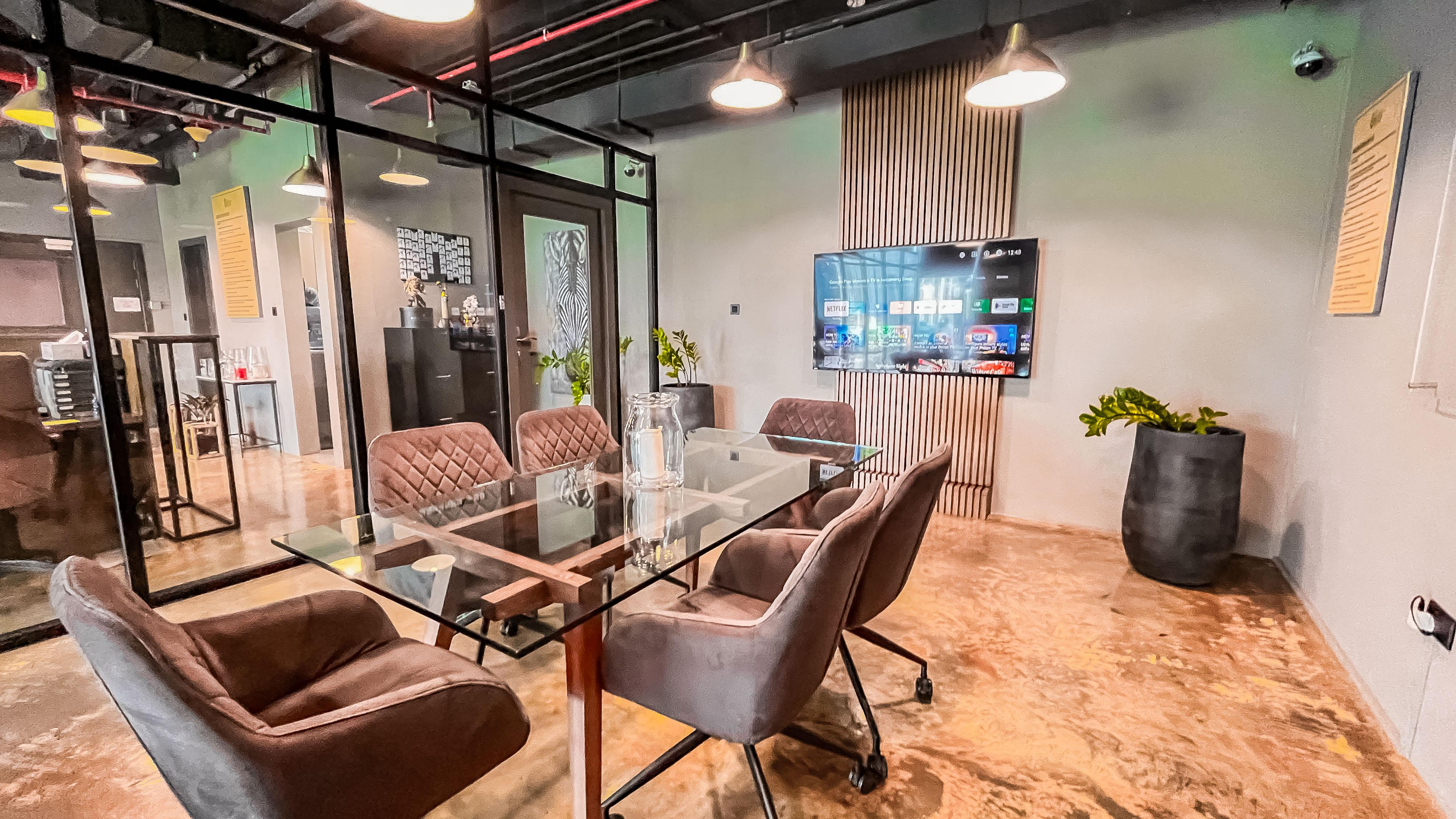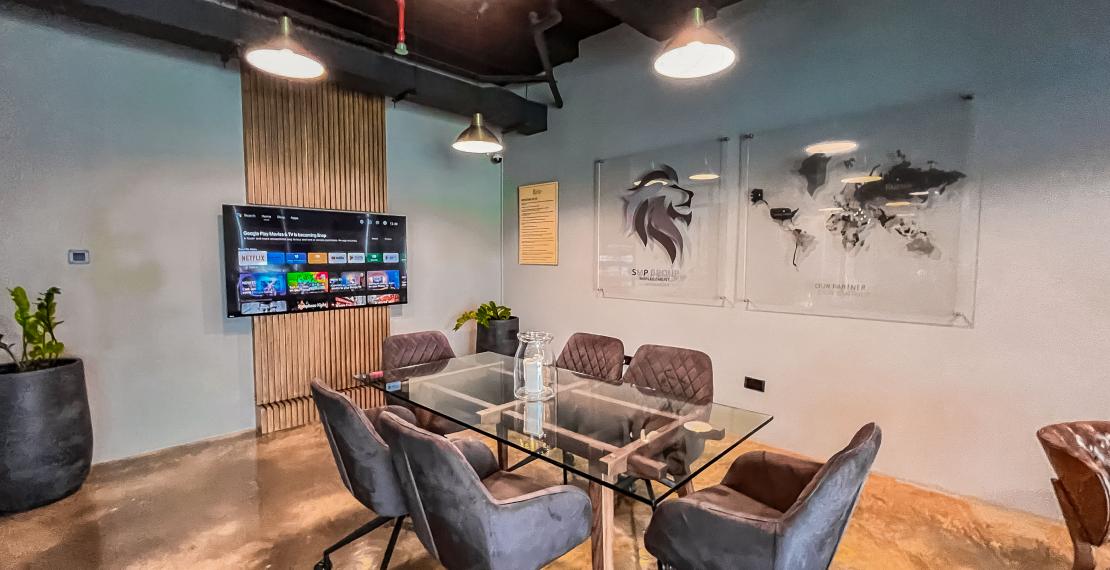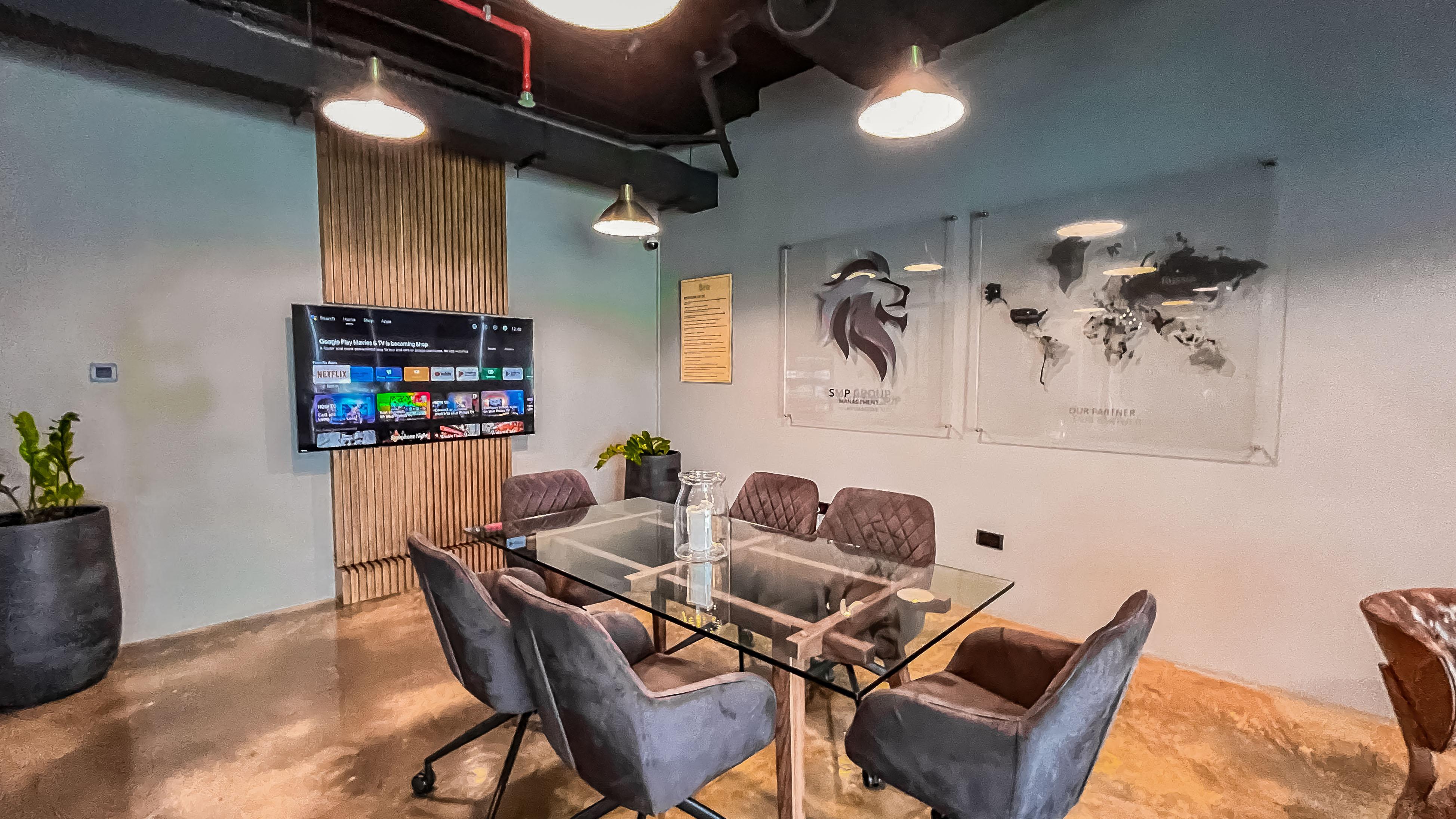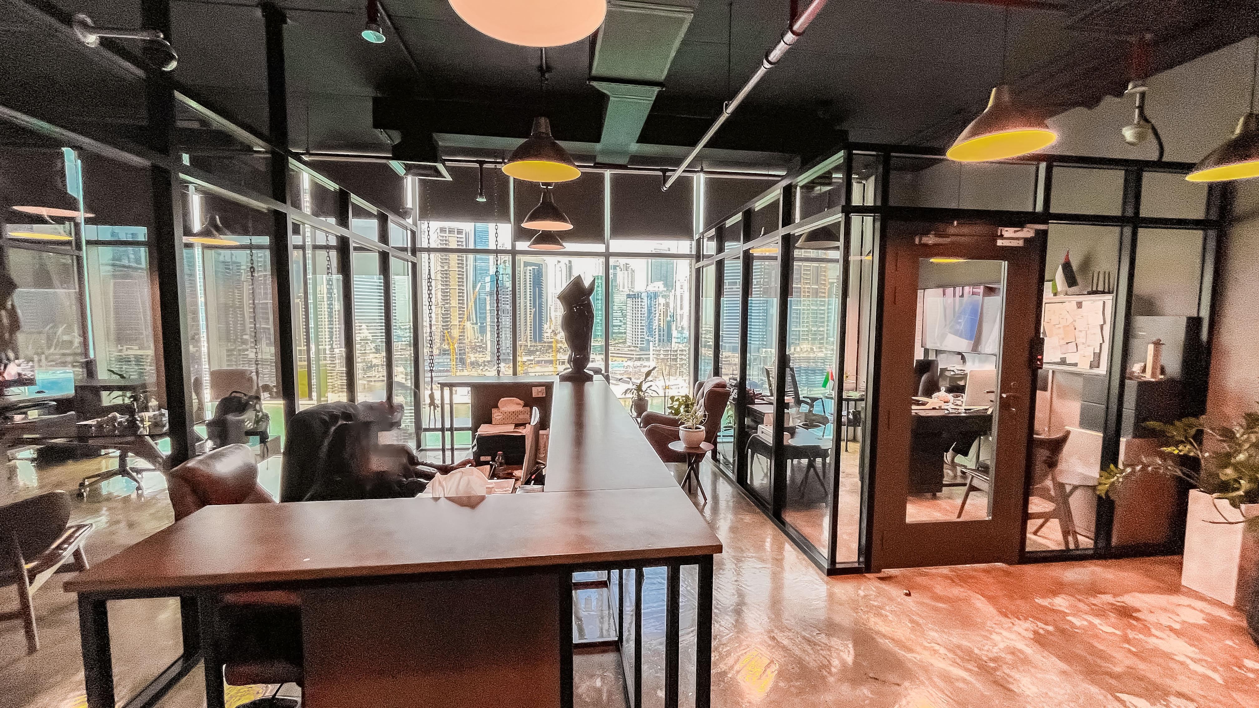 Our office boasts a distinct and stylish interior design, featuring expansive floor-to-ceiling windows that showcase the breathtaking Dubai skyline, especially highlighting the iconic Burj Khalifa. The elegant conference room is equipped with a glass conference table, plush chairs, and a TV, surrounded by glass walls for a modern touch. A sleek reception area welcomes visitors with its chic décor.