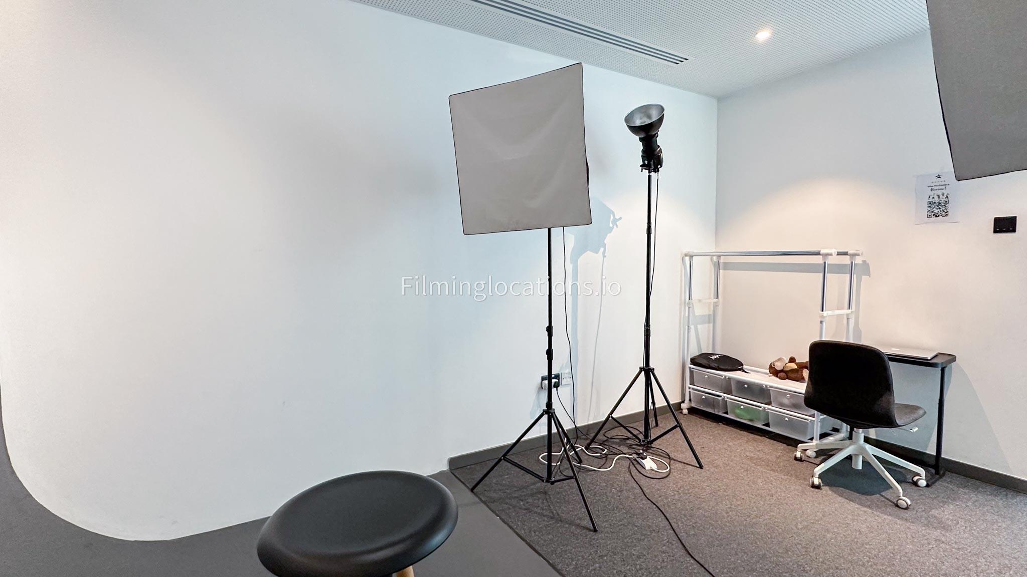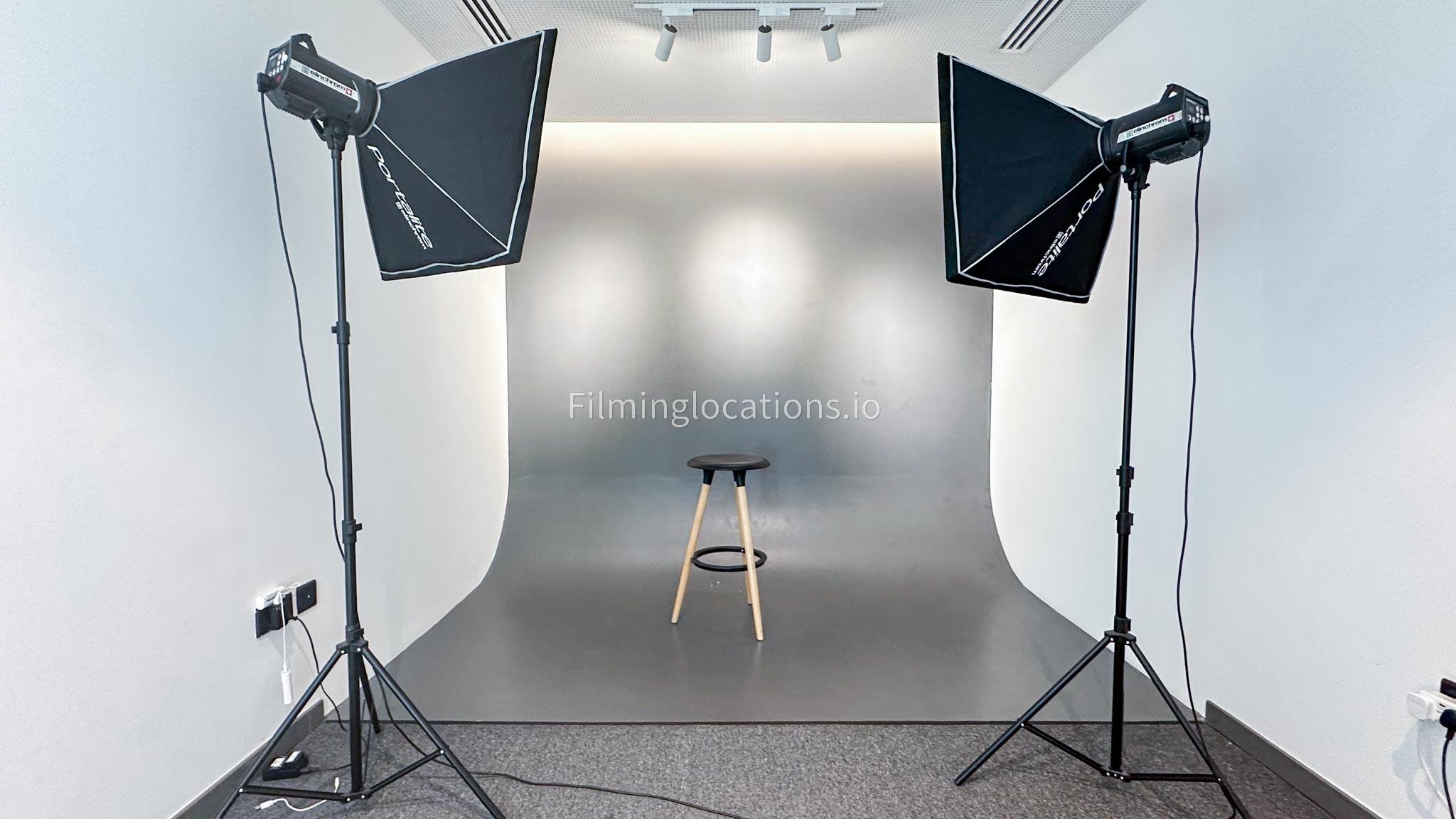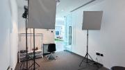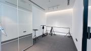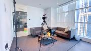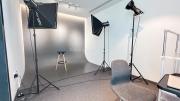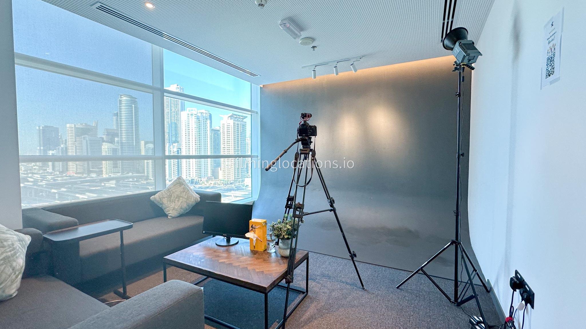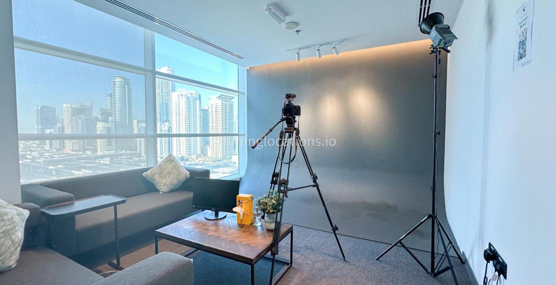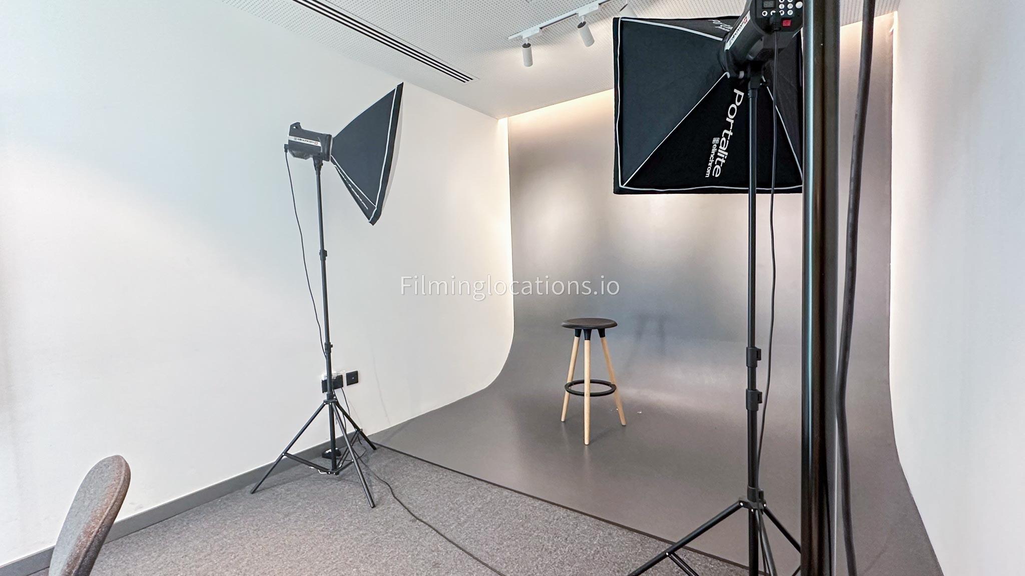 Our photo studio featuring glass walls is compact and provides a sleek urban backdrop with a captivating skyline view. It is Ideal for intimate shoots, product photography, or creative projects in a modern and inspiring setting.