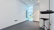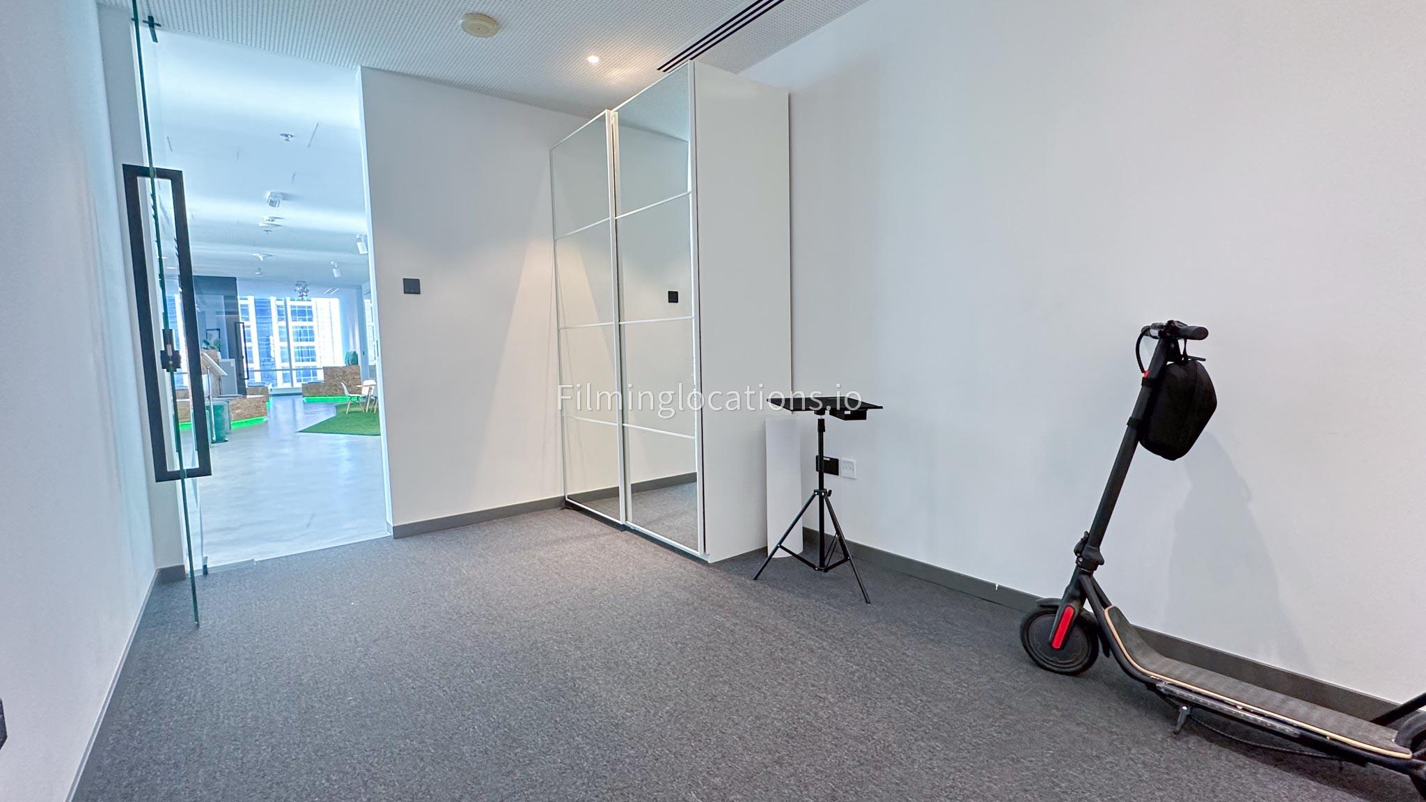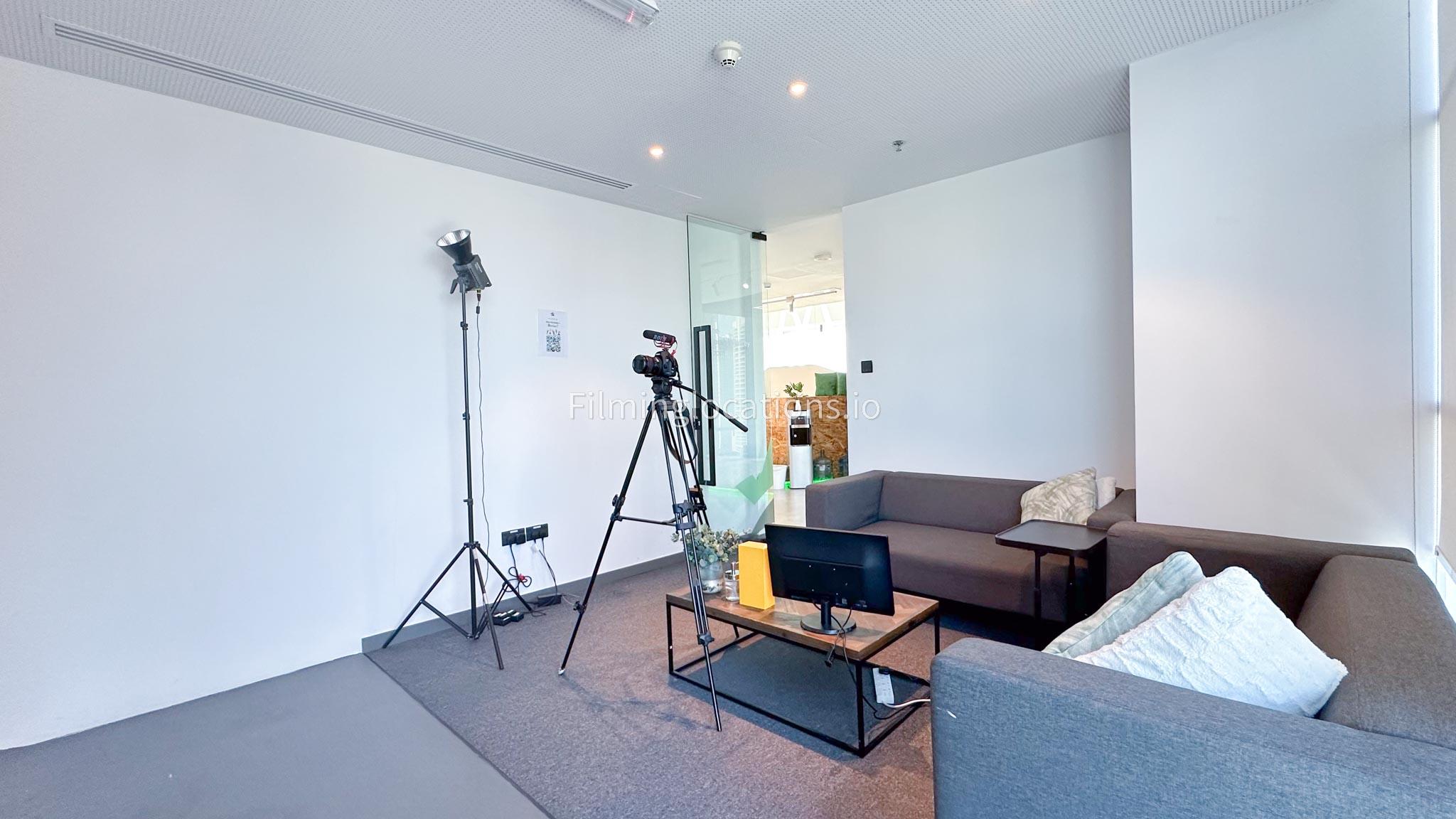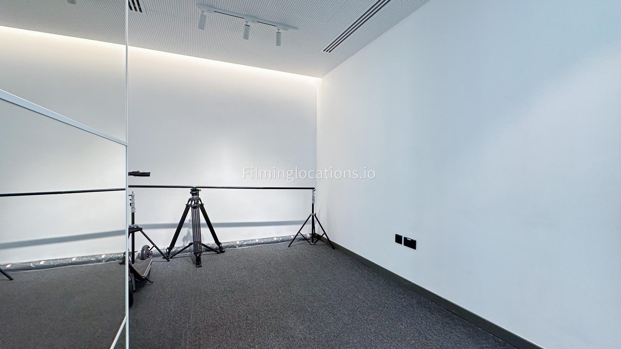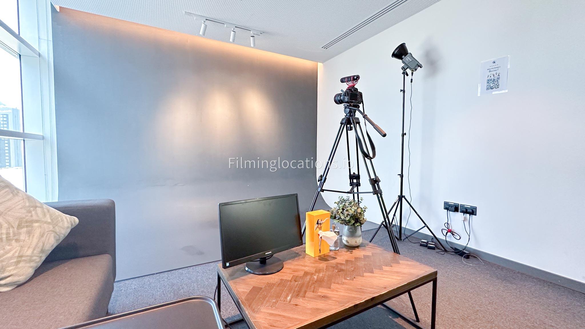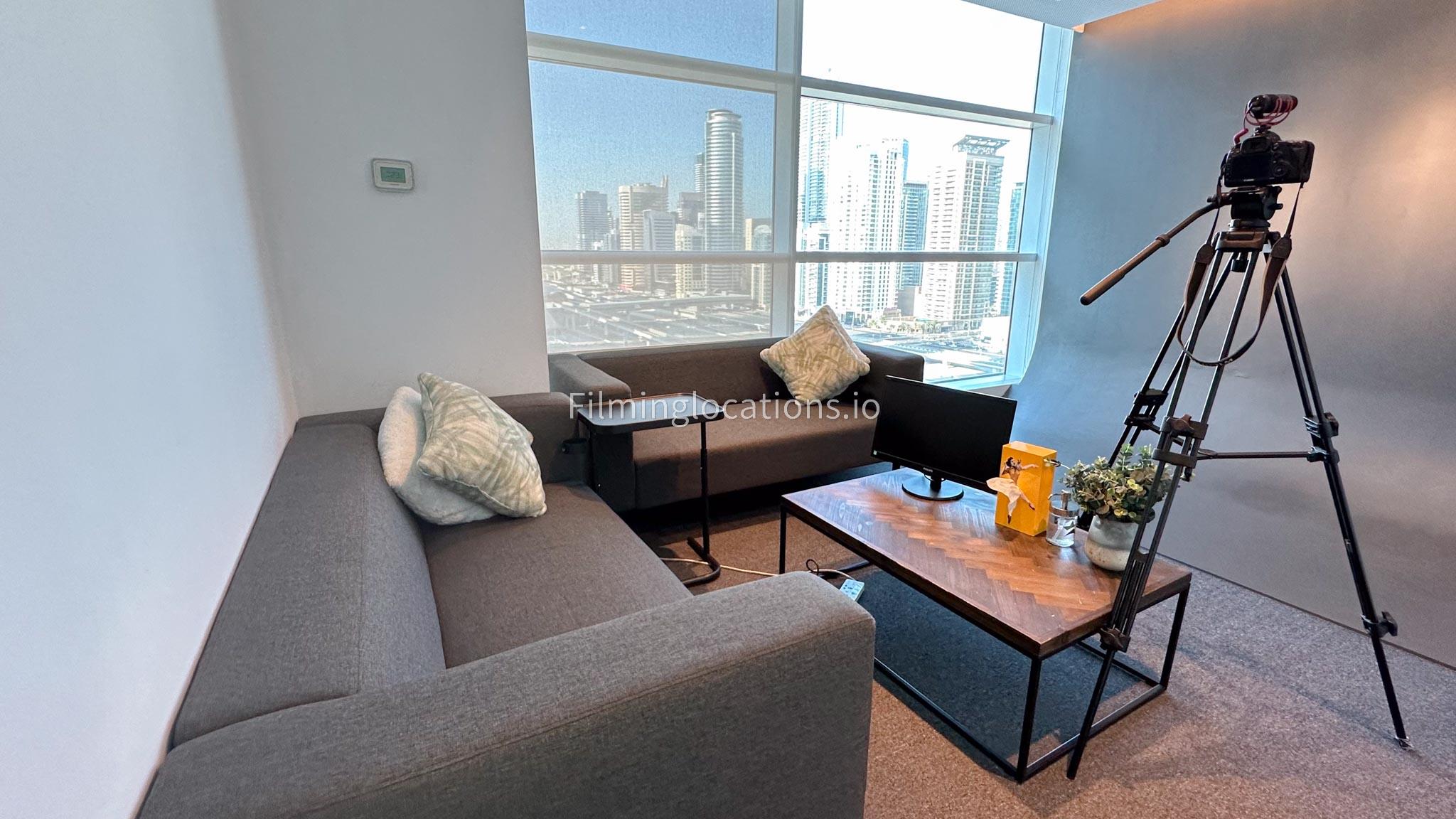 Our photo studio featuring glass walls is compact and provides a sleek urban backdrop with a captivating skyline view. It is Ideal for intimate shoots, product photography, or creative projects in a modern and inspiring setting.
