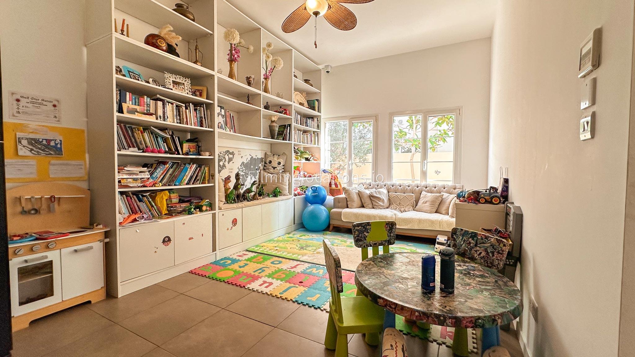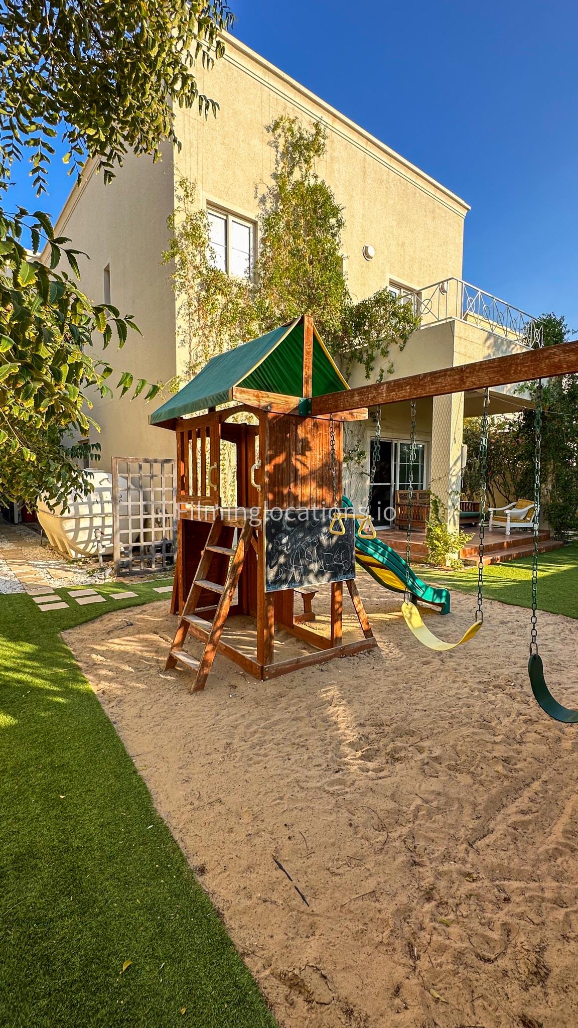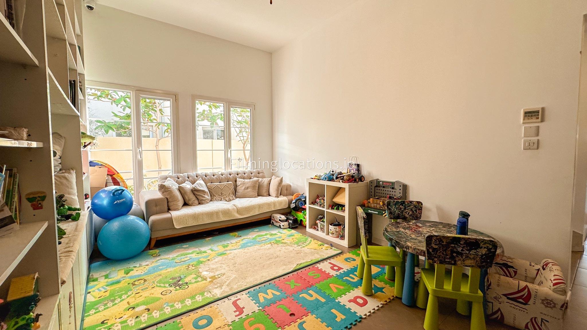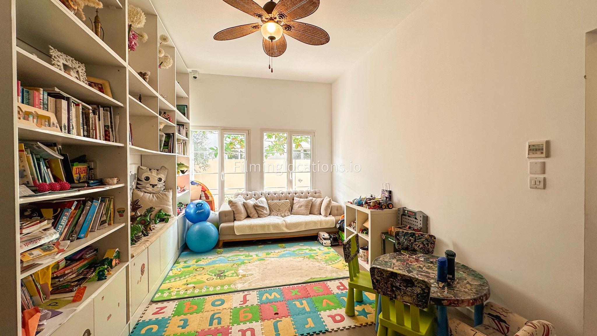 Our villa features a two-storey layout with 3 bedrooms accompanied with balconies, spacious living room along with a dining space. There is an open kitchen, colorful kid’s area, an office space and kid’s room. Stepping outside there is a quaint backyard with a play area and cute outdoor seating providing a set for shooting cozy outdoor scenes.