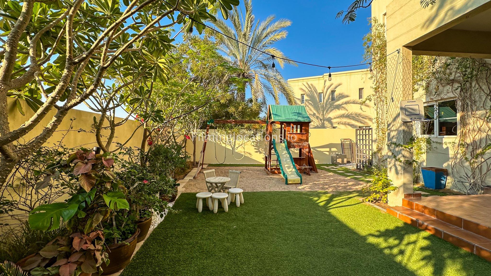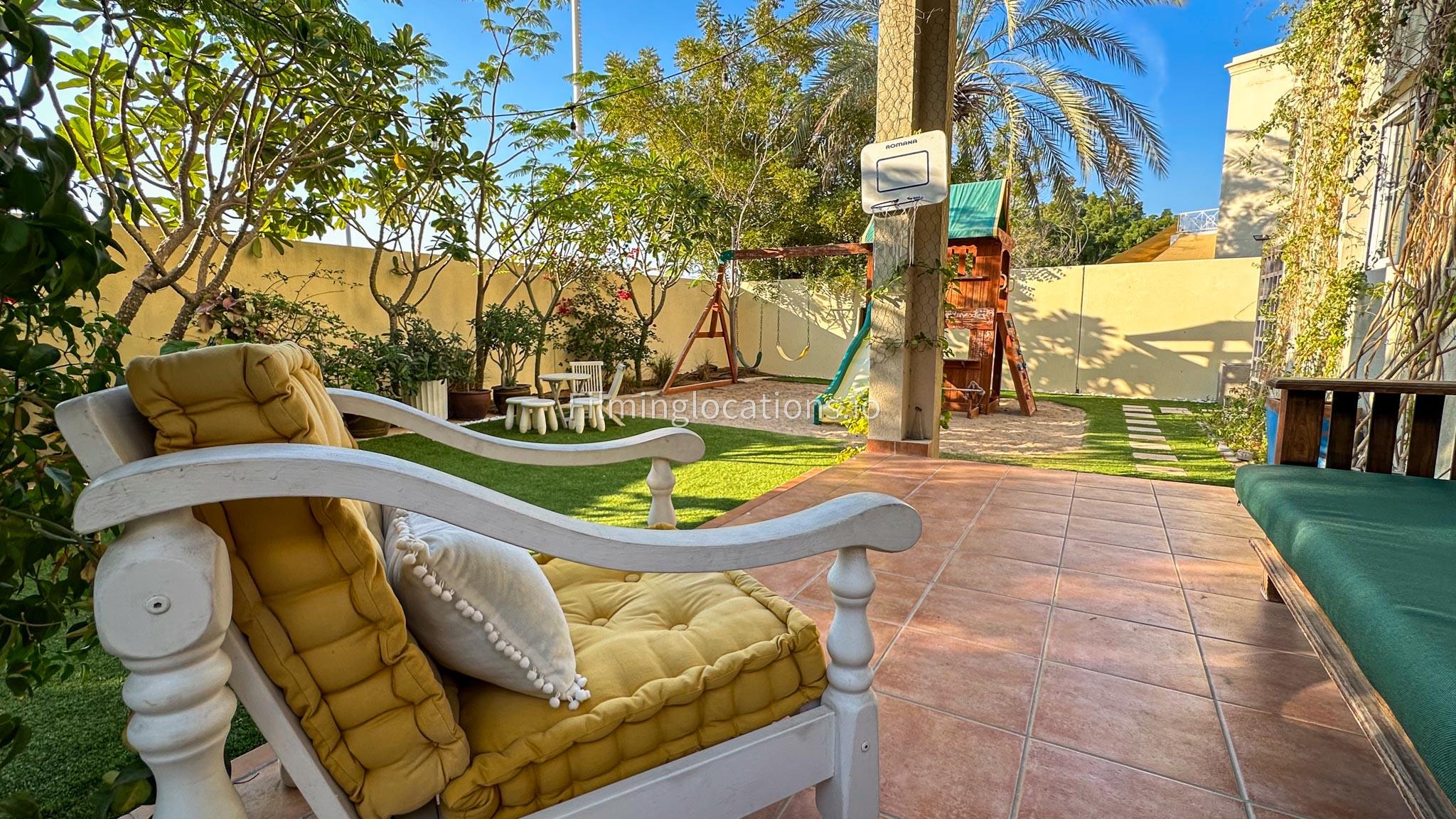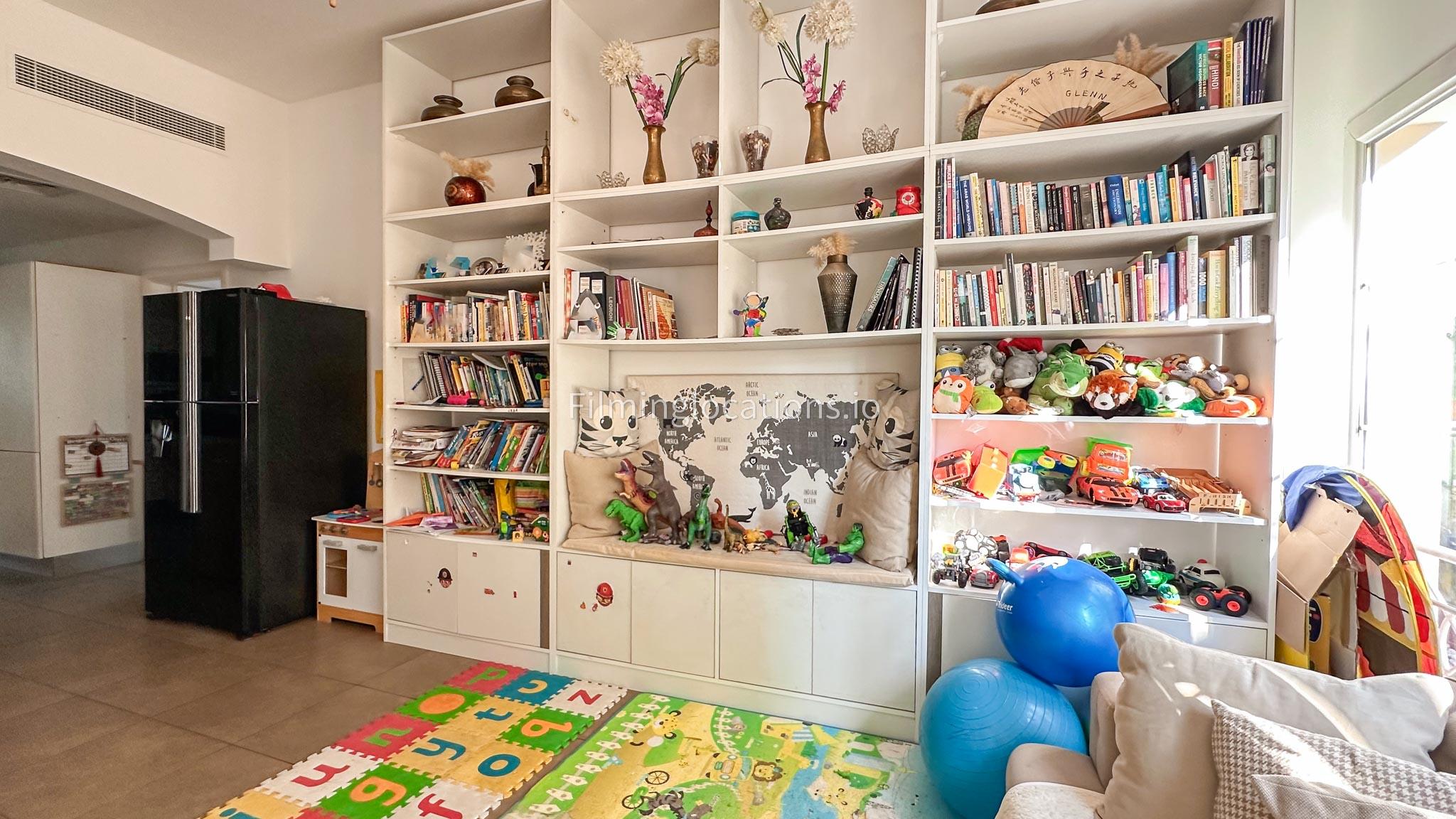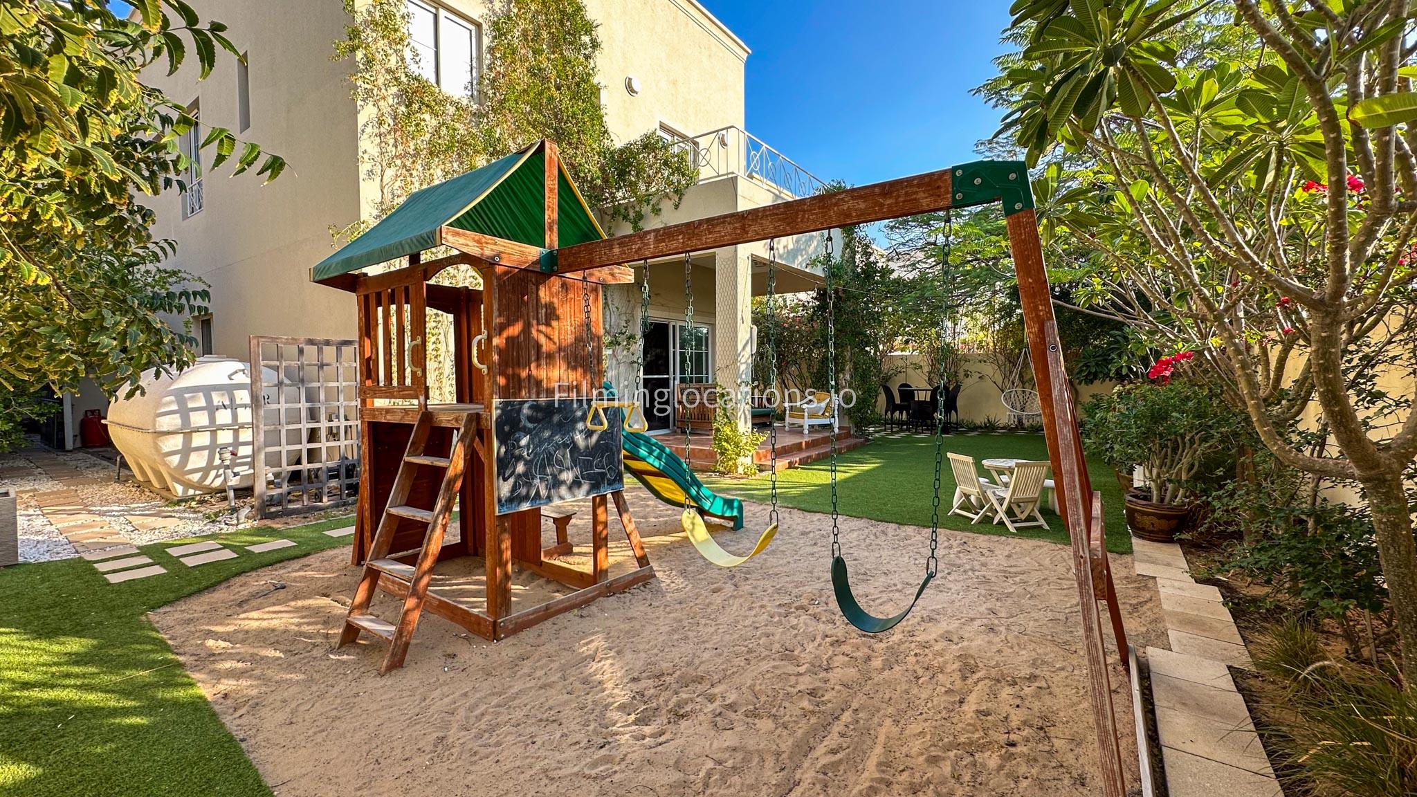 Our villa features a two-storey layout with 3 bedrooms accompanied with balconies, spacious living room along with a dining space. There is an open kitchen, colorful kid’s area, an office space and kid’s room. Stepping outside there is a quaint backyard with a play area and cute outdoor seating providing a set for shooting cozy outdoor scenes.