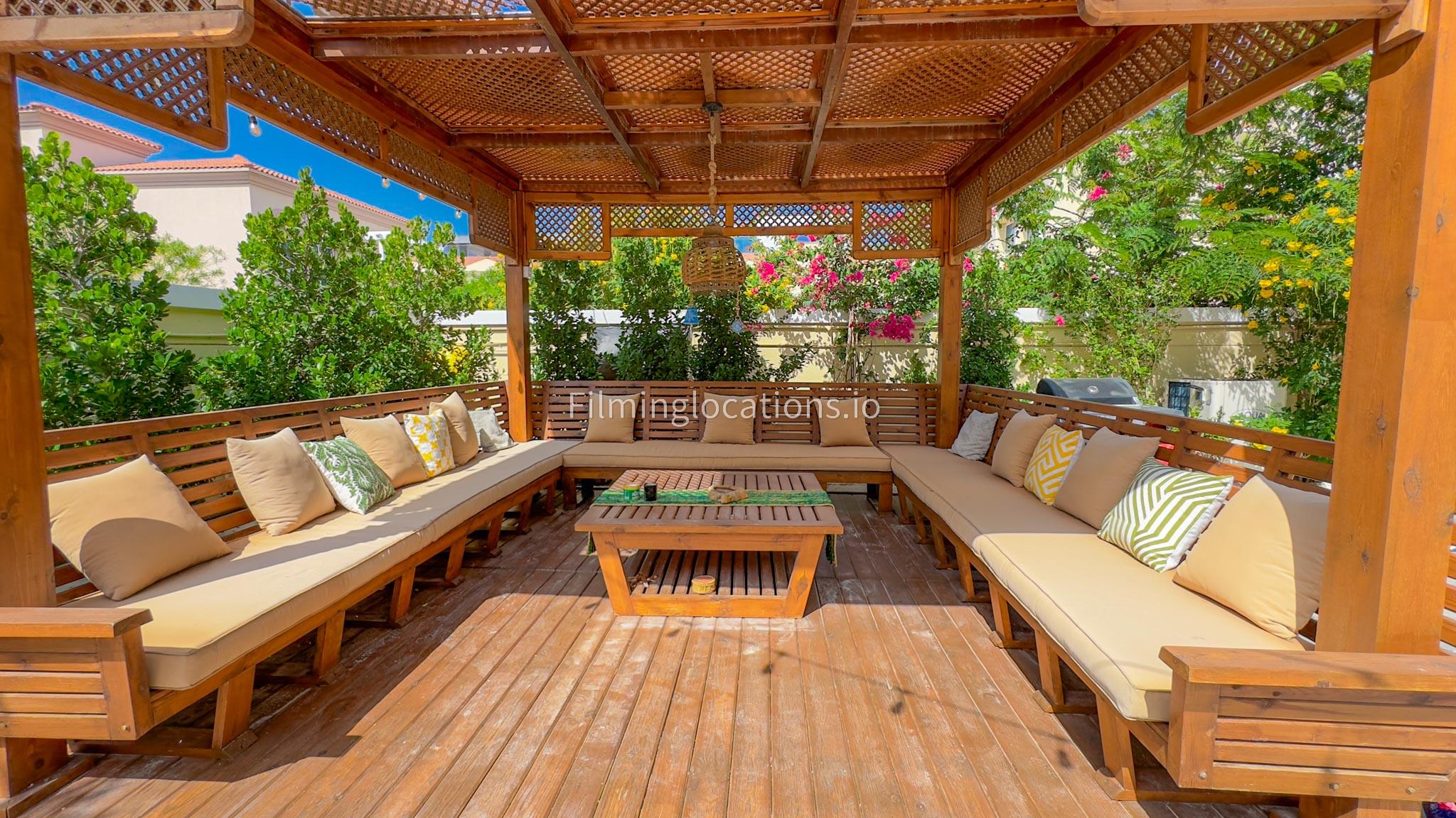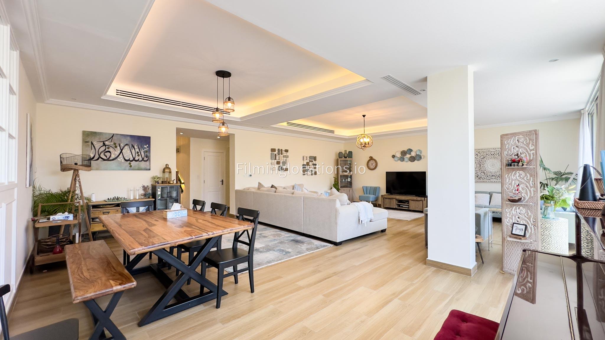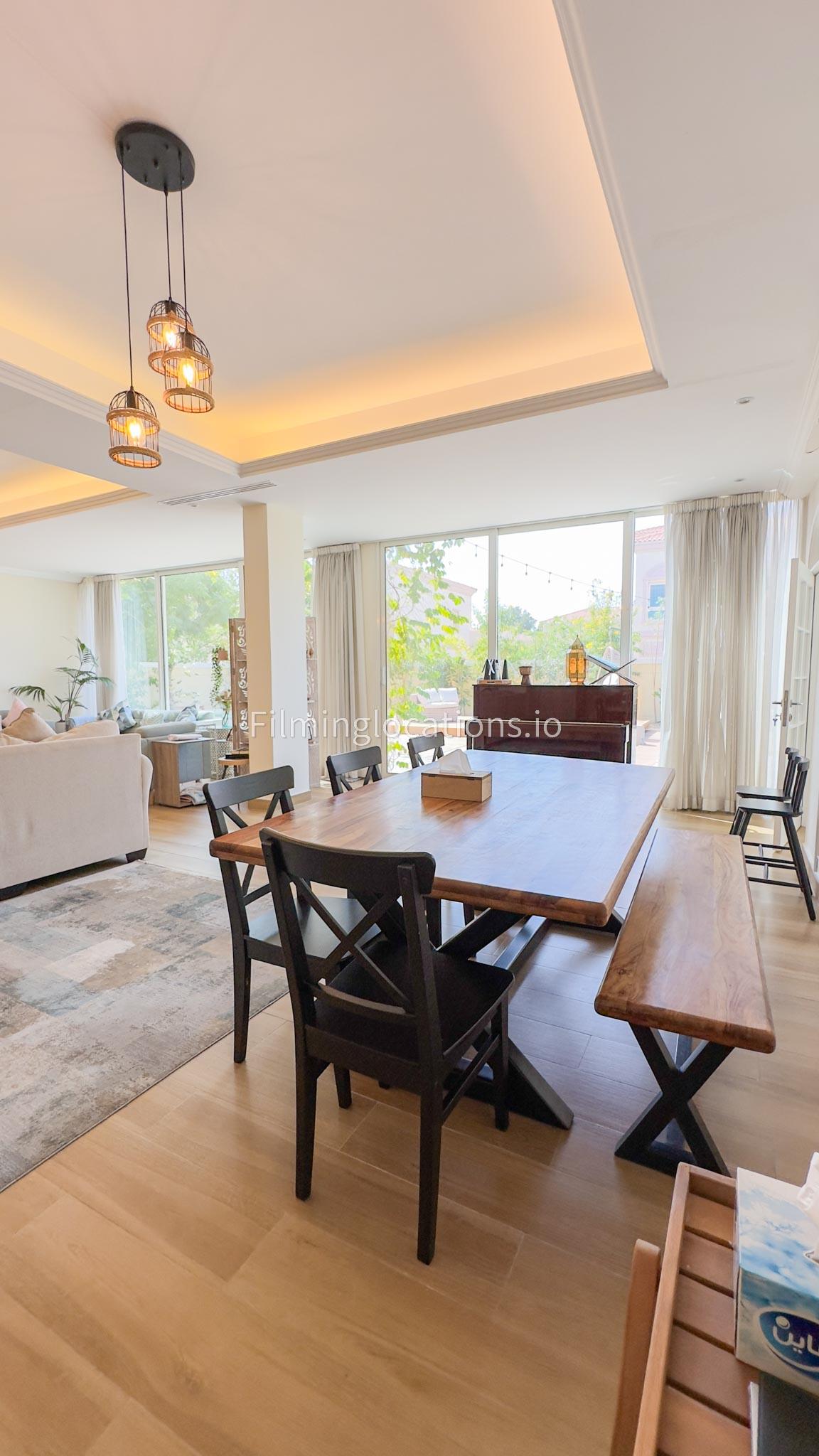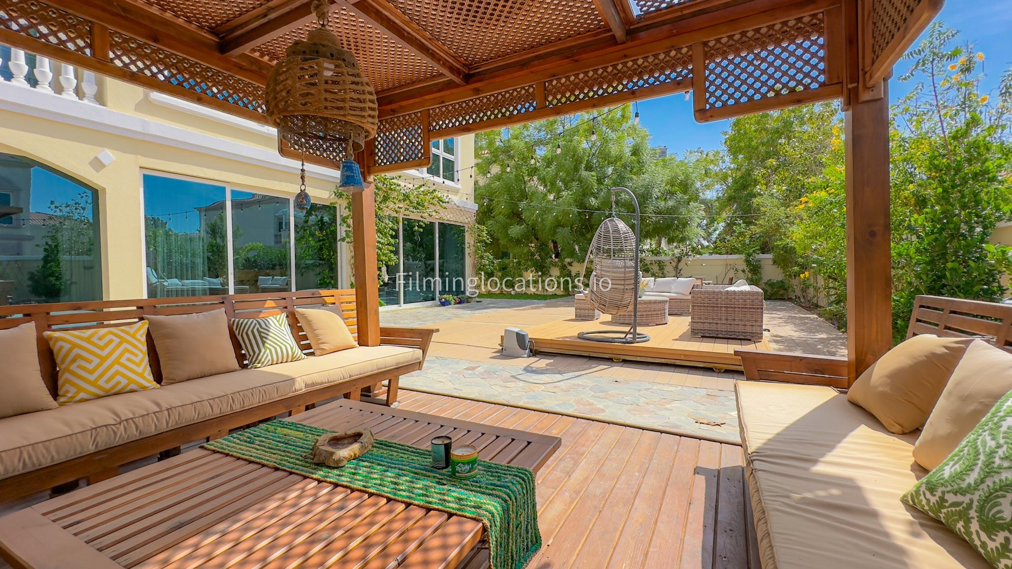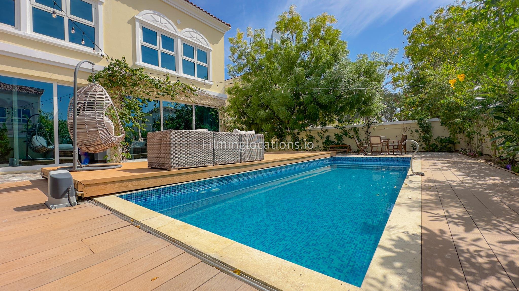 Our villa exudes a contemporary charm, featuring 6 bedrooms and a spacious living area adorned with a piano and exquisite Middle Eastern artwork. The backyard presents a picturesque scene with a swimming pool featuring a sliding deck, a wooden gazebo, and outdoor seating surrounded by greenery. These features make our villa an ideal choice for filmmakers seeking an elegant yet versatile setting for their productions.