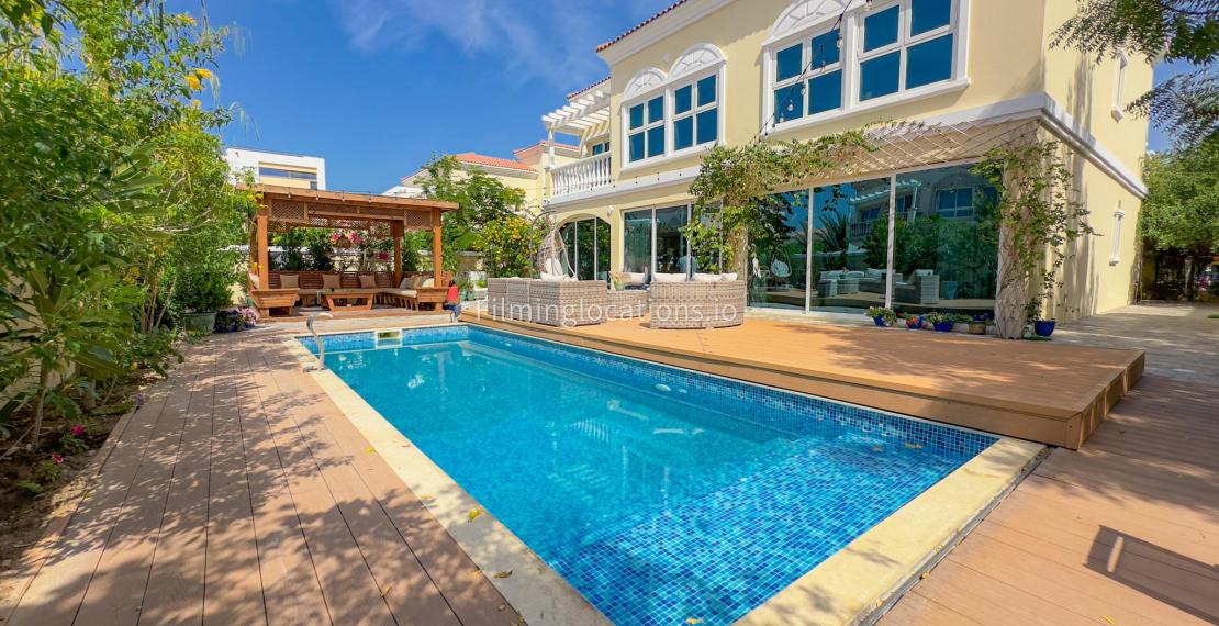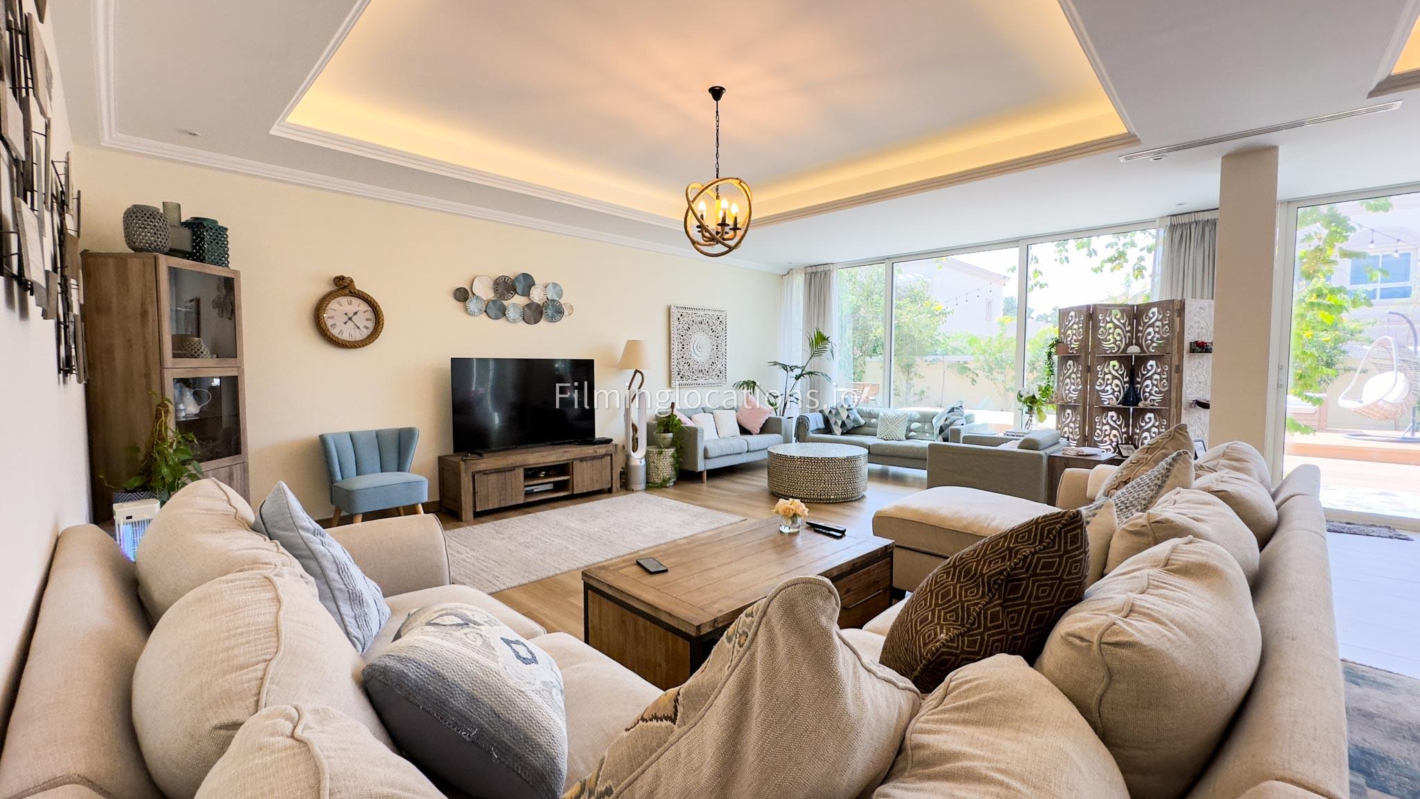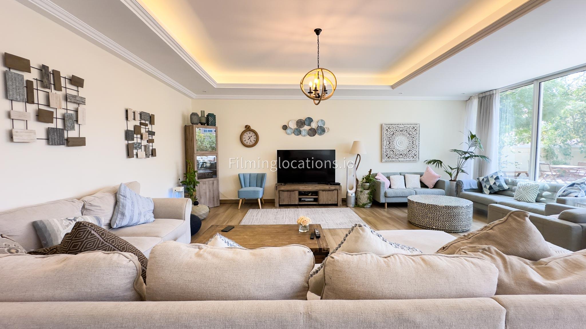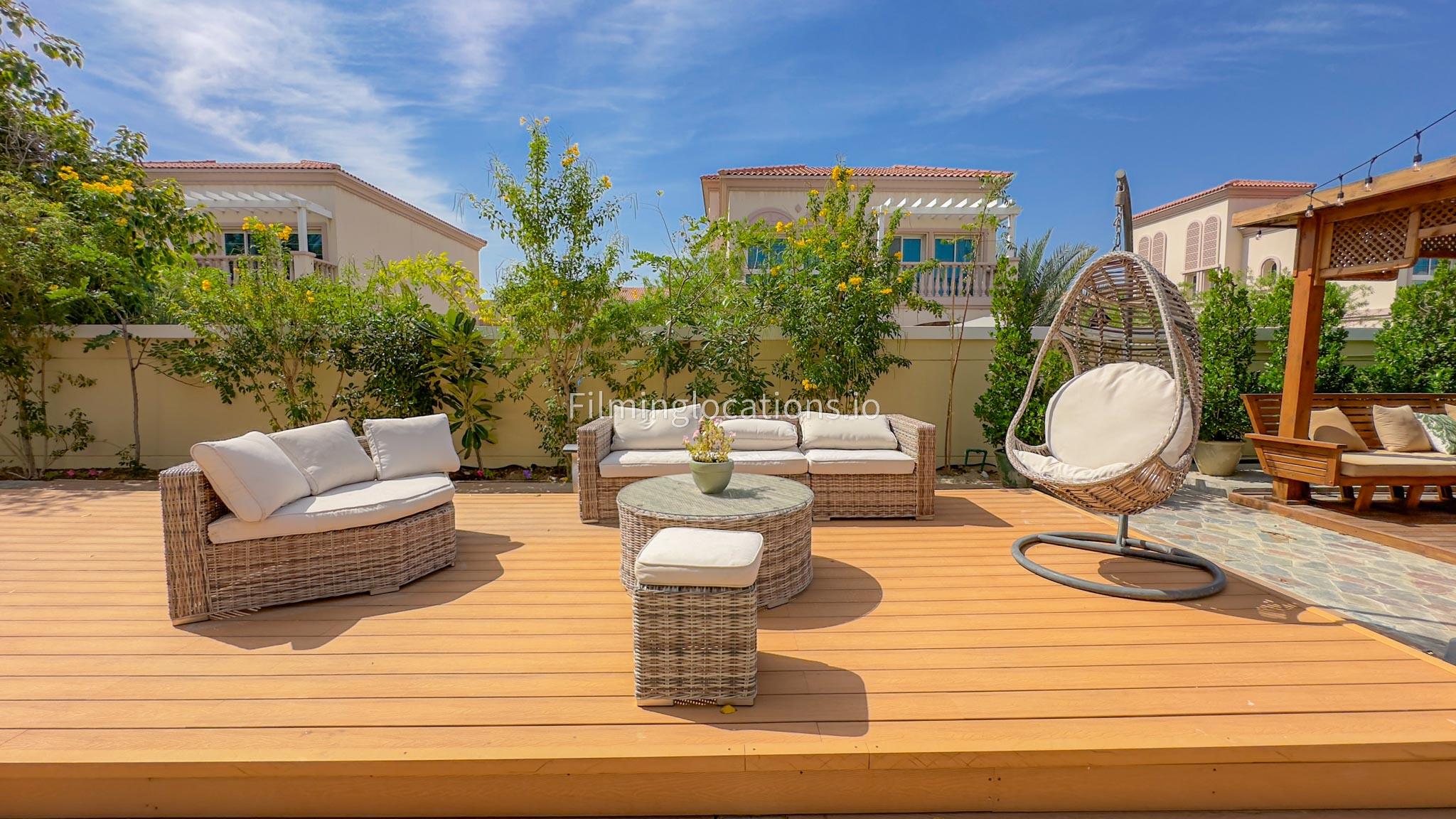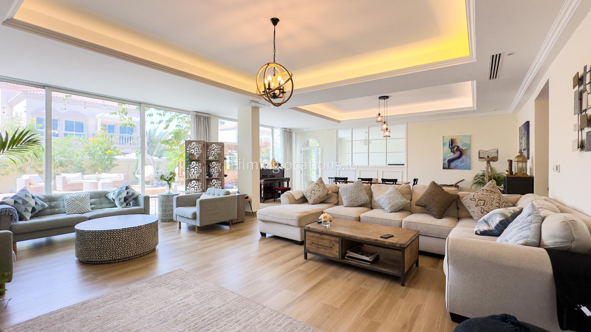Our villa exudes a contemporary charm, featuring 6 bedrooms and a spacious living area adorned with a piano and exquisite Middle Eastern artwork. The backyard presents a picturesque scene with a swimming pool featuring a sliding deck, a wooden gazebo, and outdoor seating surrounded by greenery. These features make our villa an ideal choice for filmmakers seeking an elegant yet versatile setting for their productions.