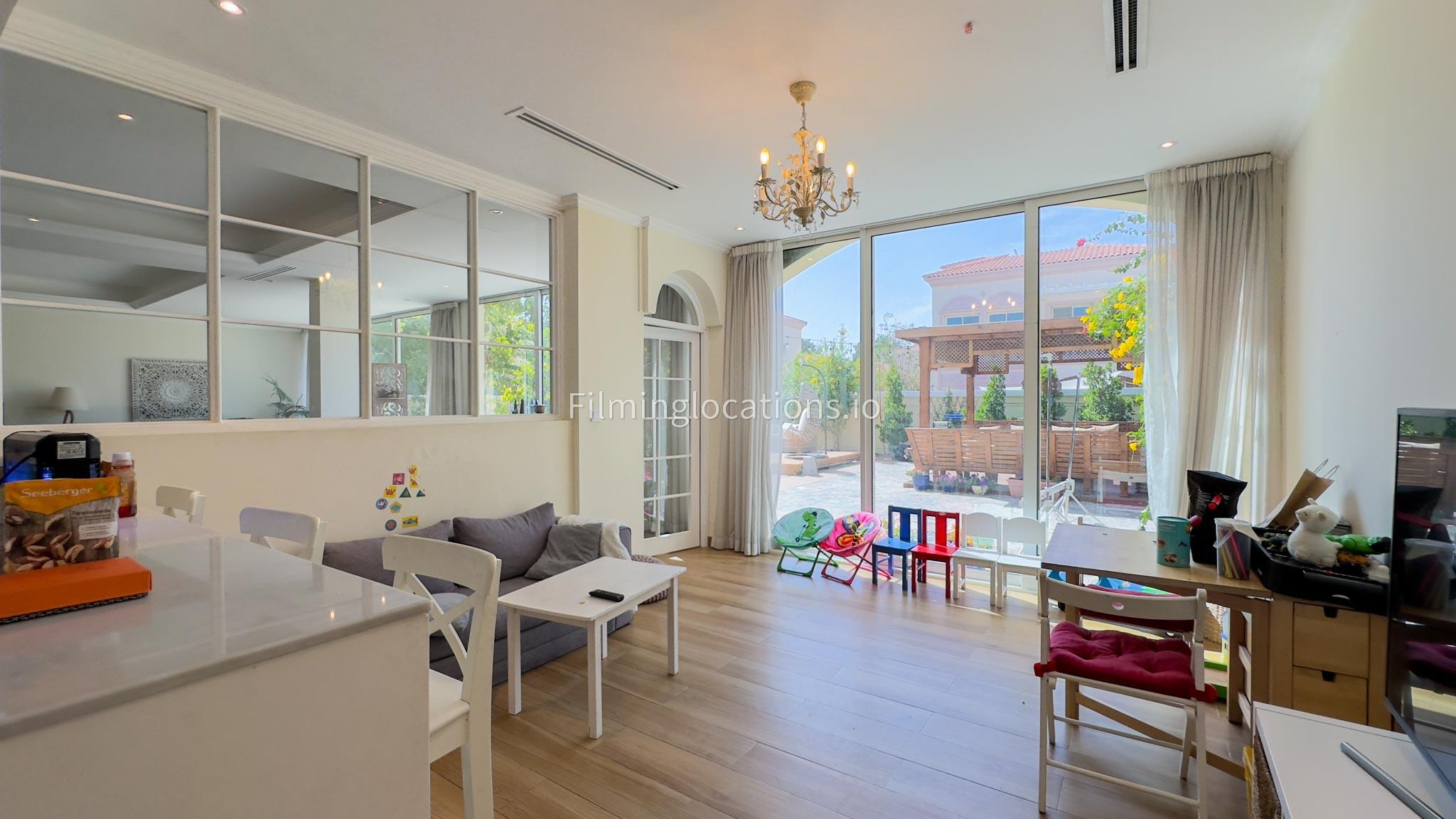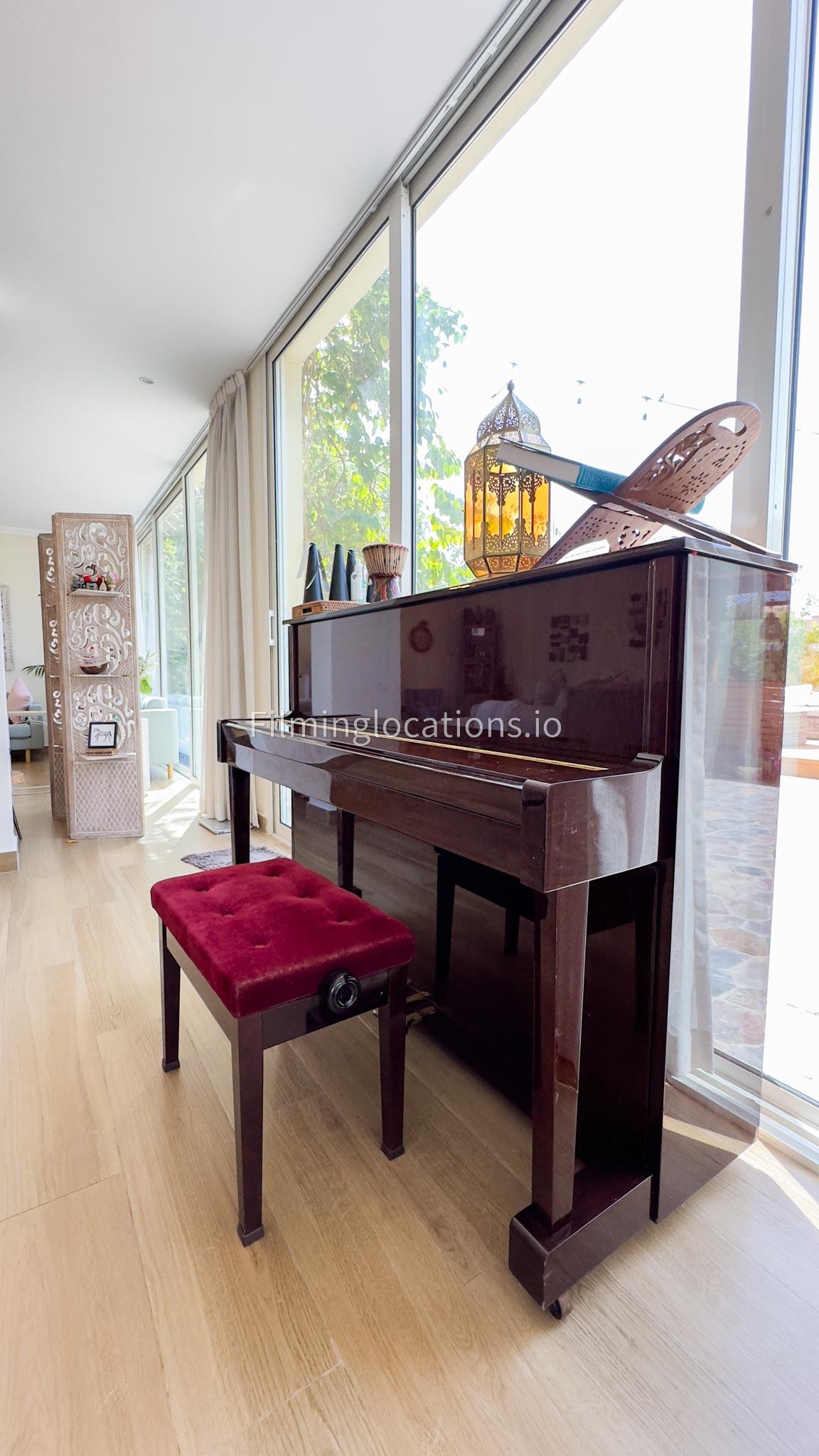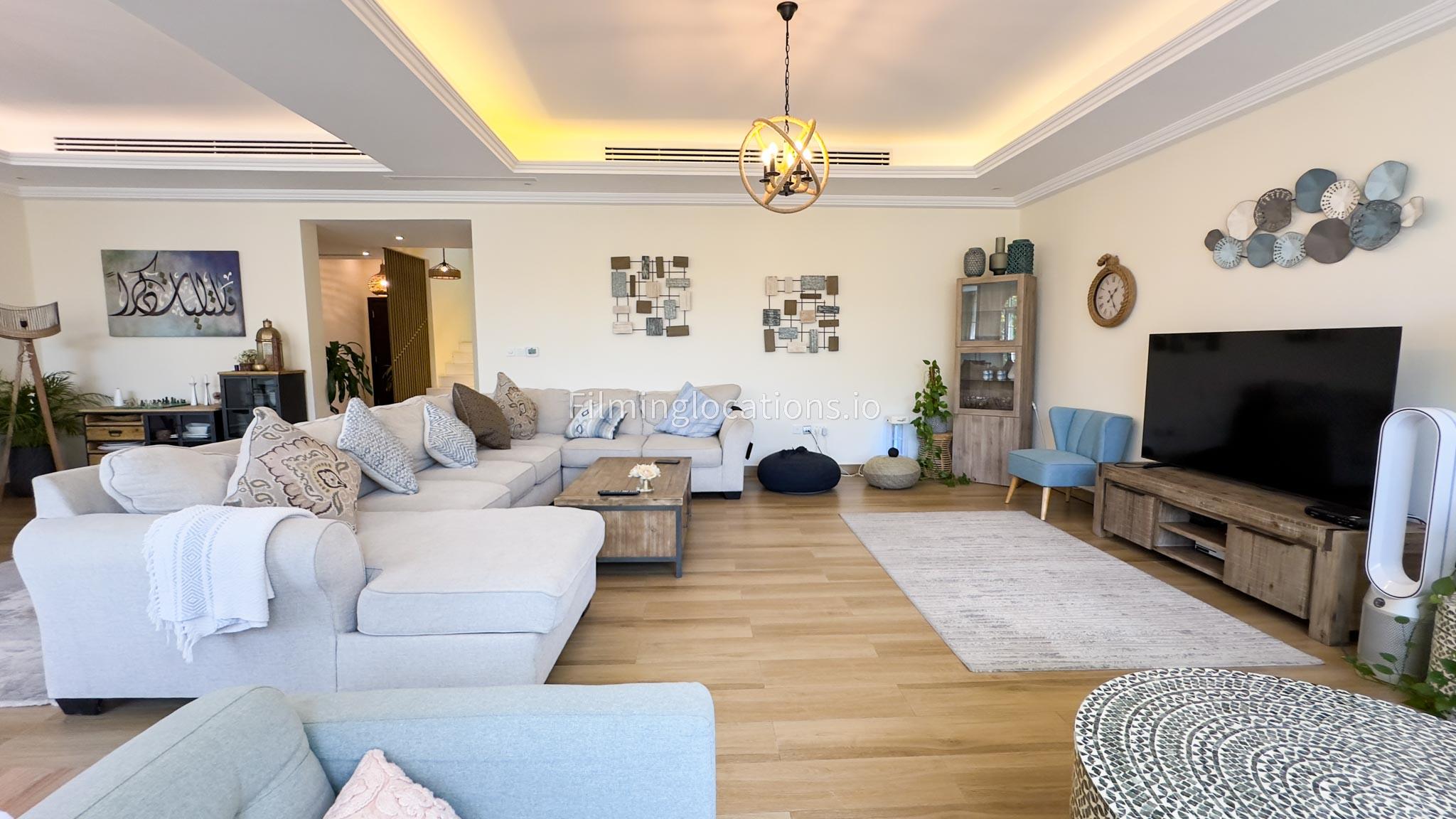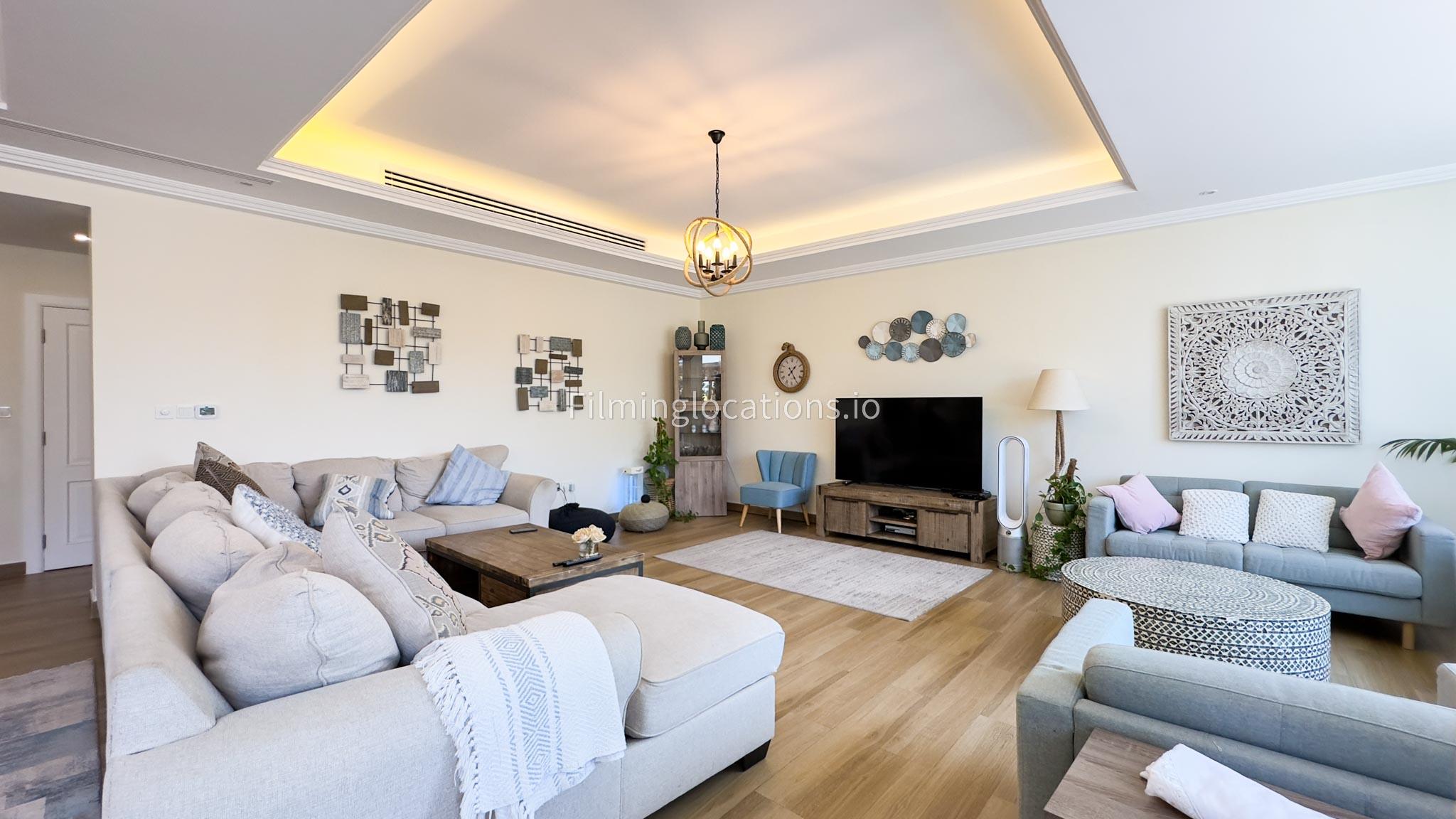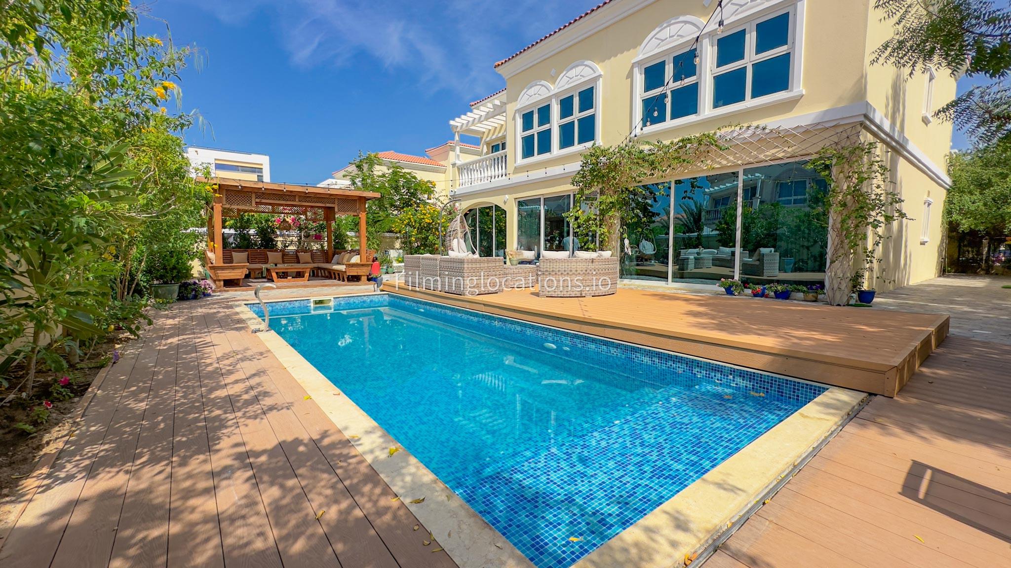 Our villa exudes a contemporary charm, featuring 6 bedrooms and a spacious living area adorned with a piano and exquisite Middle Eastern artwork. The backyard presents a picturesque scene with a swimming pool featuring a sliding deck, a wooden gazebo, and outdoor seating surrounded by greenery. These features make our villa an ideal choice for filmmakers seeking an elegant yet versatile setting for their productions.