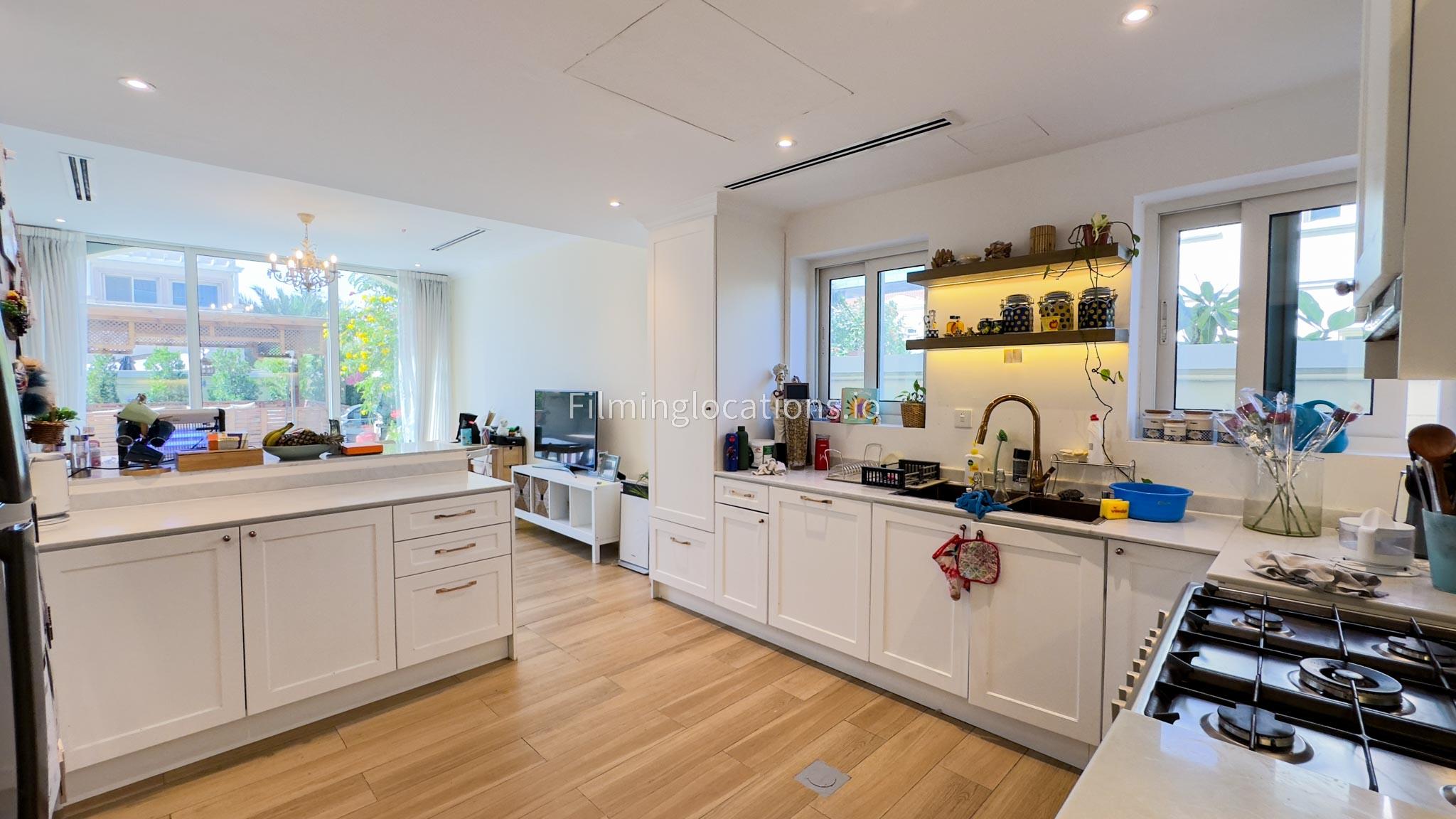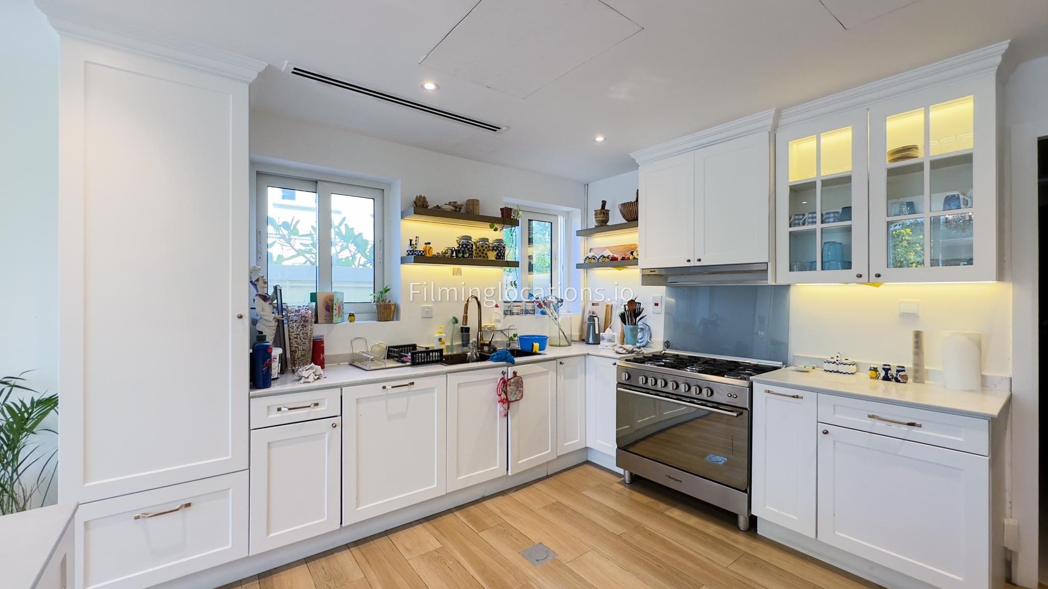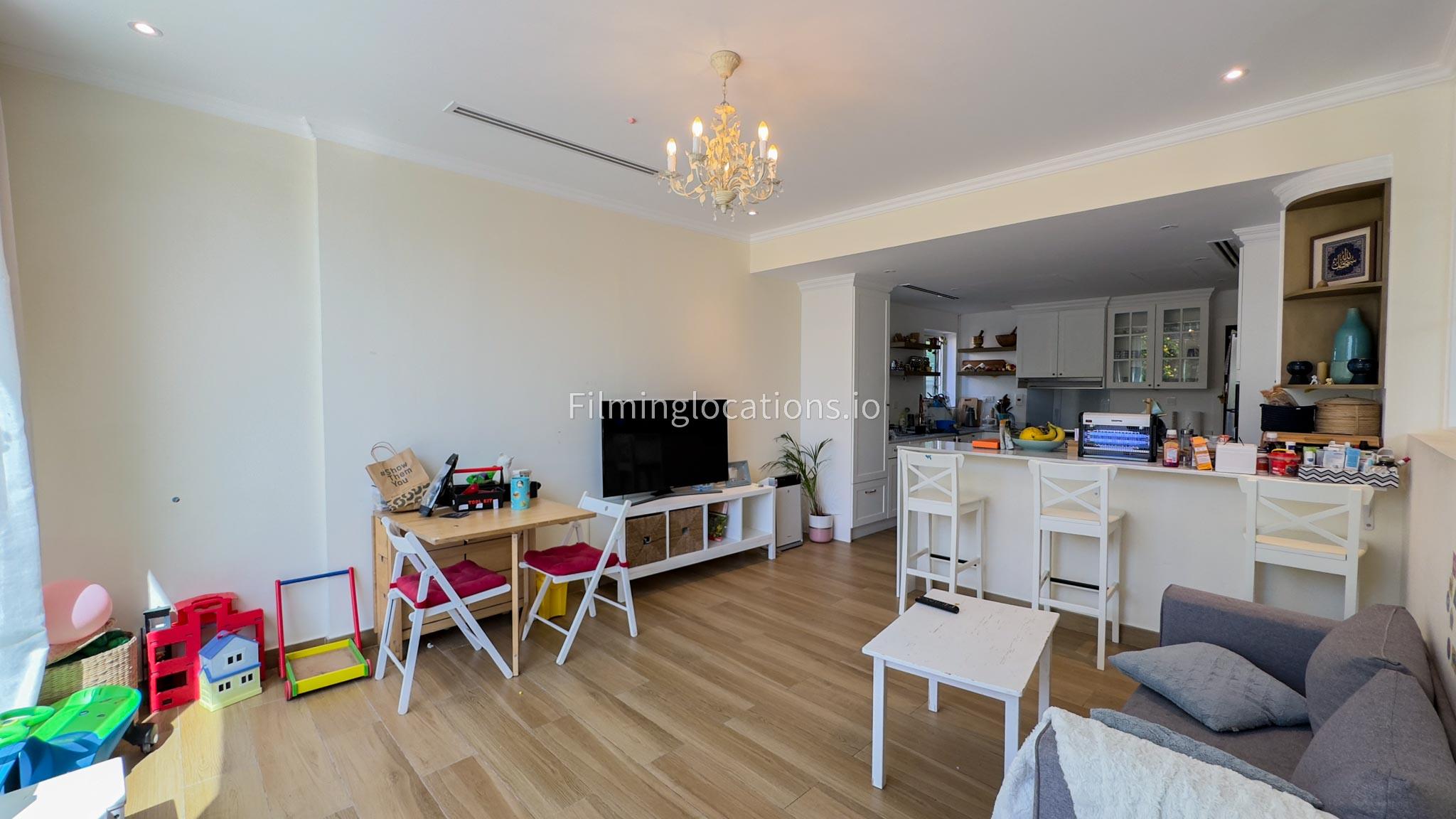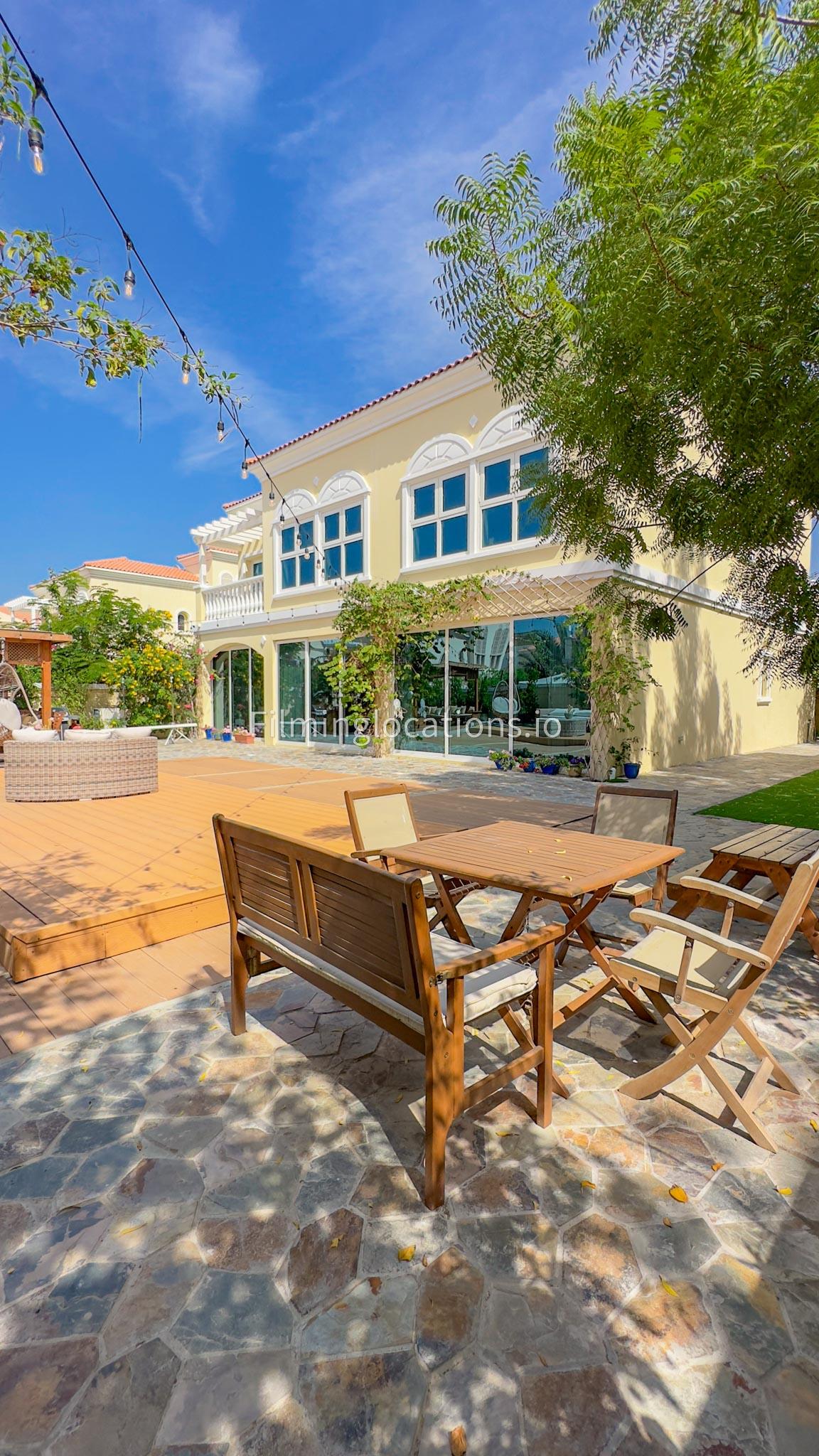 Our villa exudes a contemporary charm, featuring 6 bedrooms and a spacious living area adorned with a piano and exquisite Middle Eastern artwork. The backyard presents a picturesque scene with a swimming pool featuring a sliding deck, a wooden gazebo, and outdoor seating surrounded by greenery. These features make our villa an ideal choice for filmmakers seeking an elegant yet versatile setting for their productions.