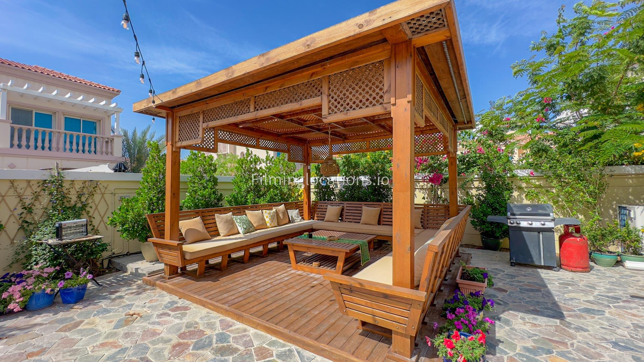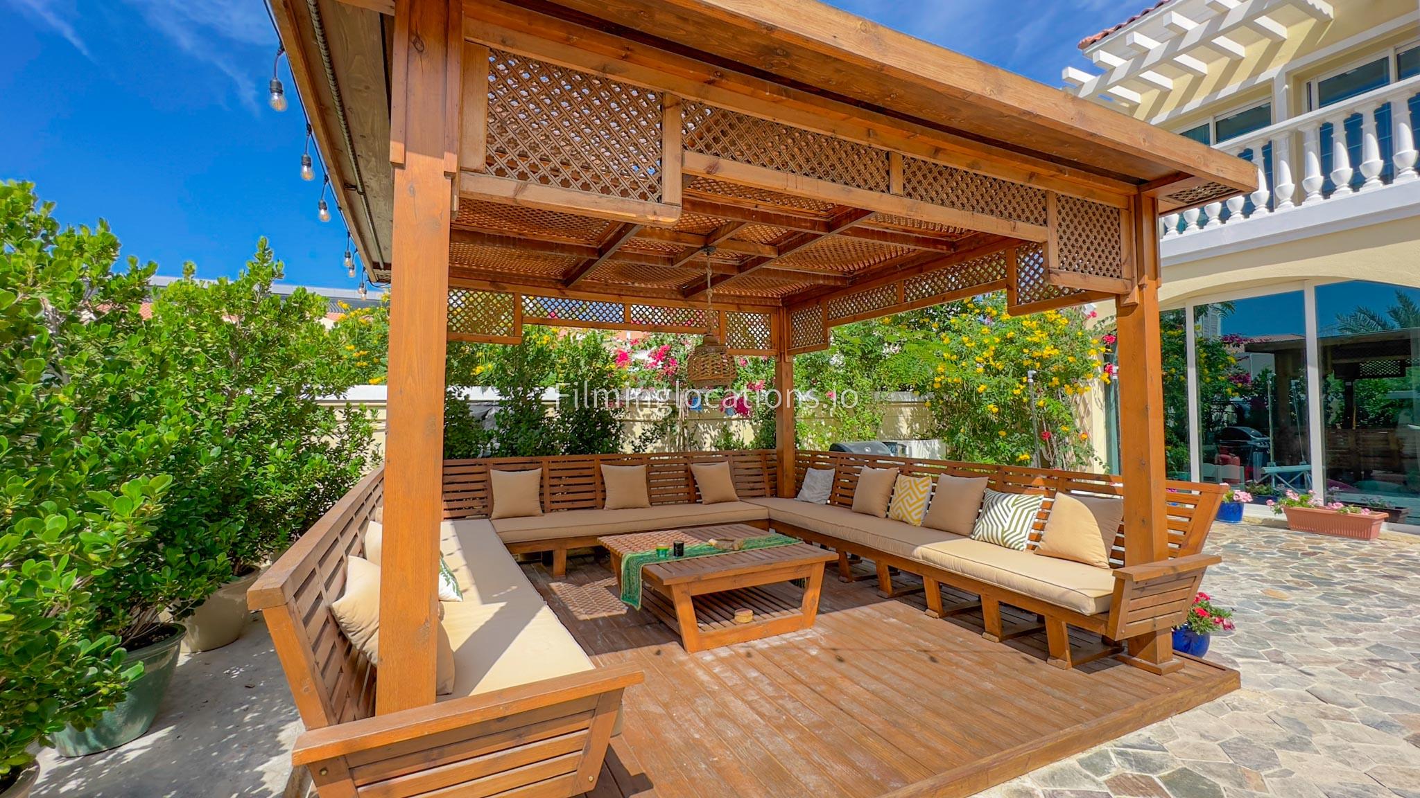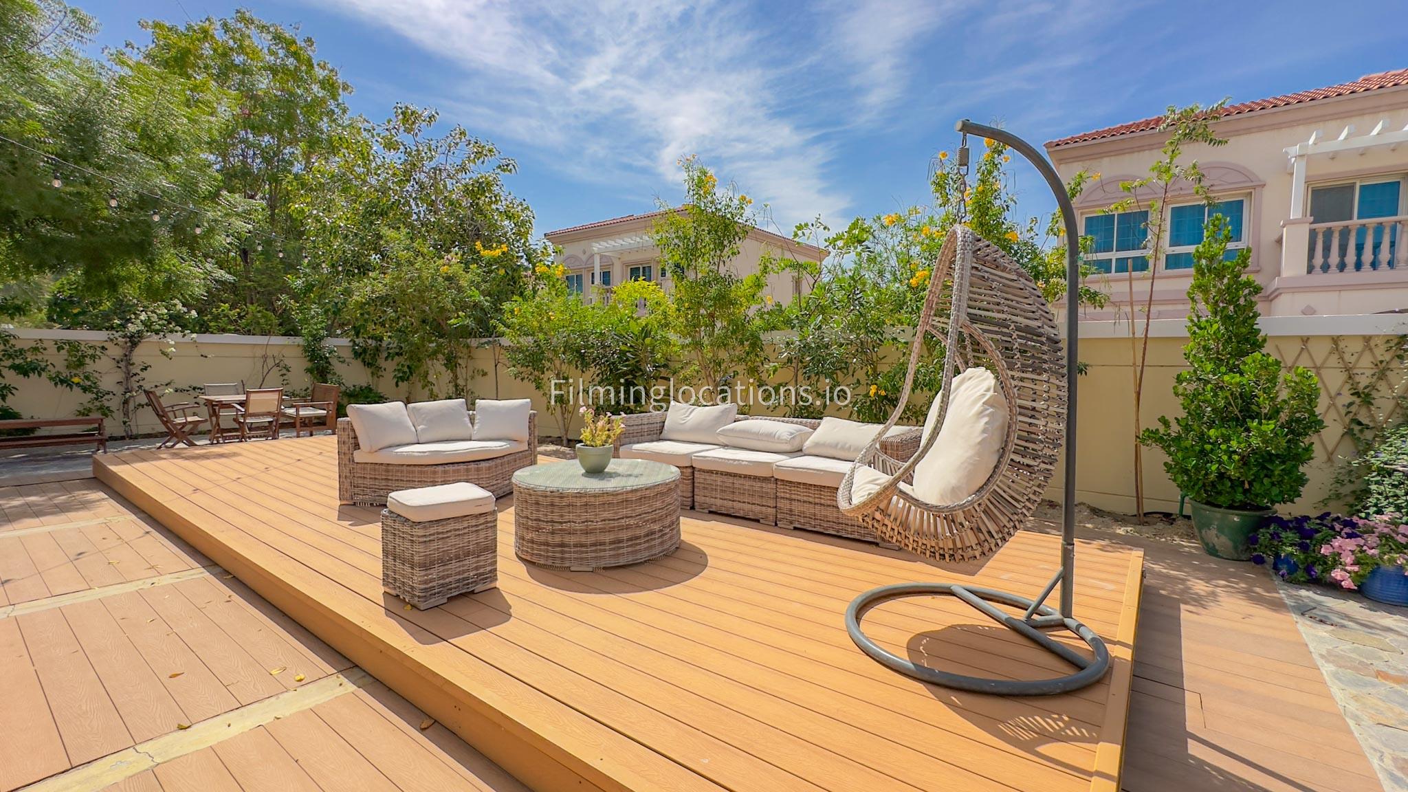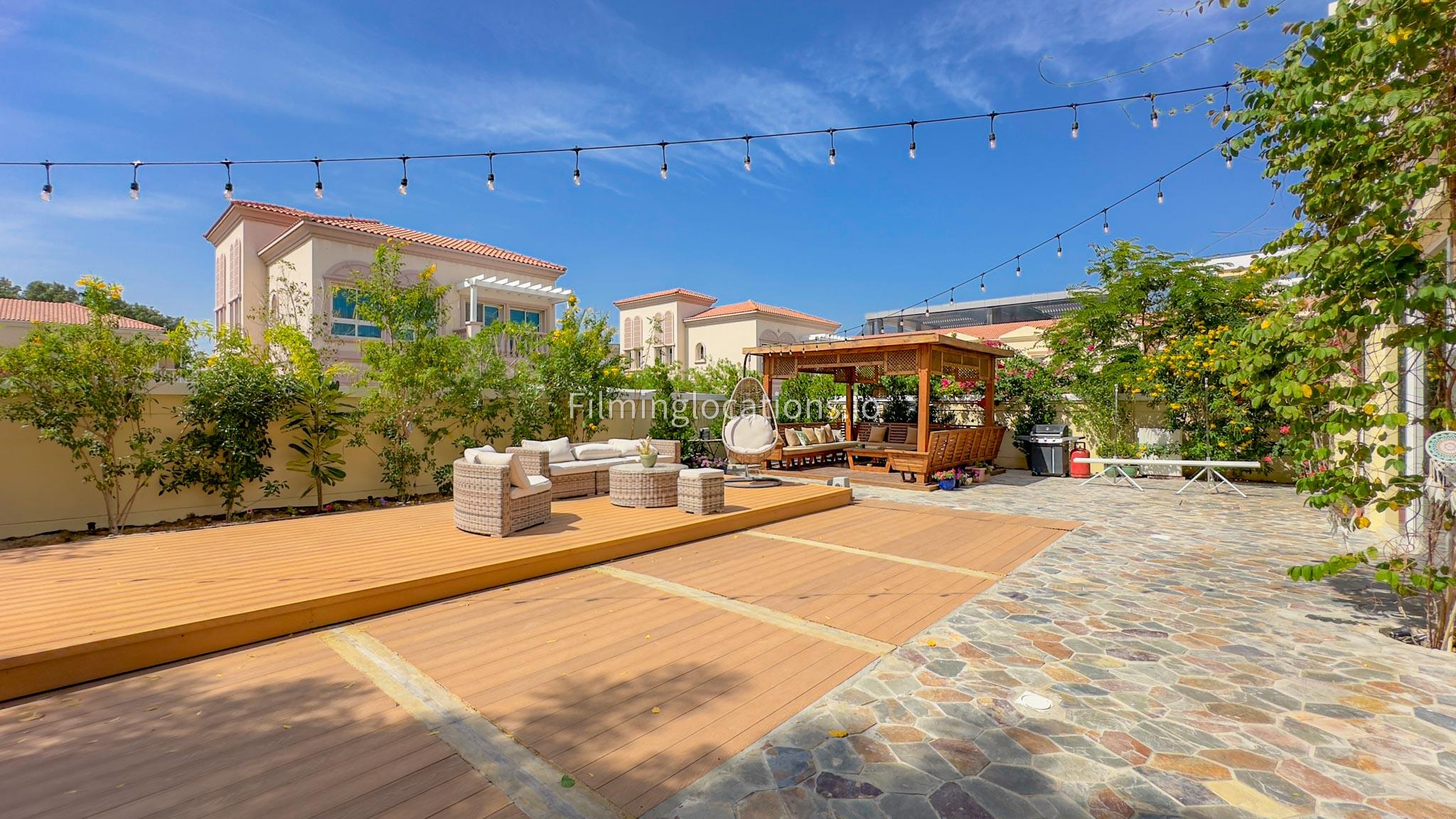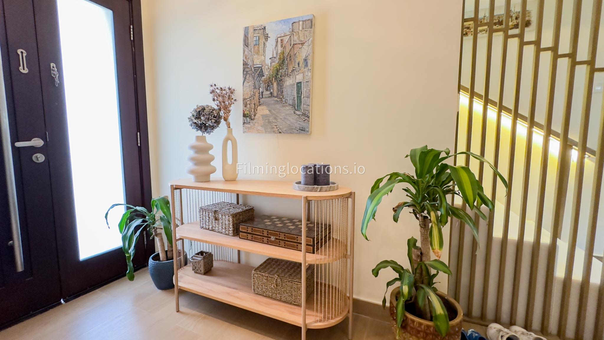 Our villa exudes a contemporary charm, featuring 6 bedrooms and a spacious living area adorned with a piano and exquisite Middle Eastern artwork. The backyard presents a picturesque scene with a swimming pool featuring a sliding deck, a wooden gazebo, and outdoor seating surrounded by greenery. These features make our villa an ideal choice for filmmakers seeking an elegant yet versatile setting for their productions.