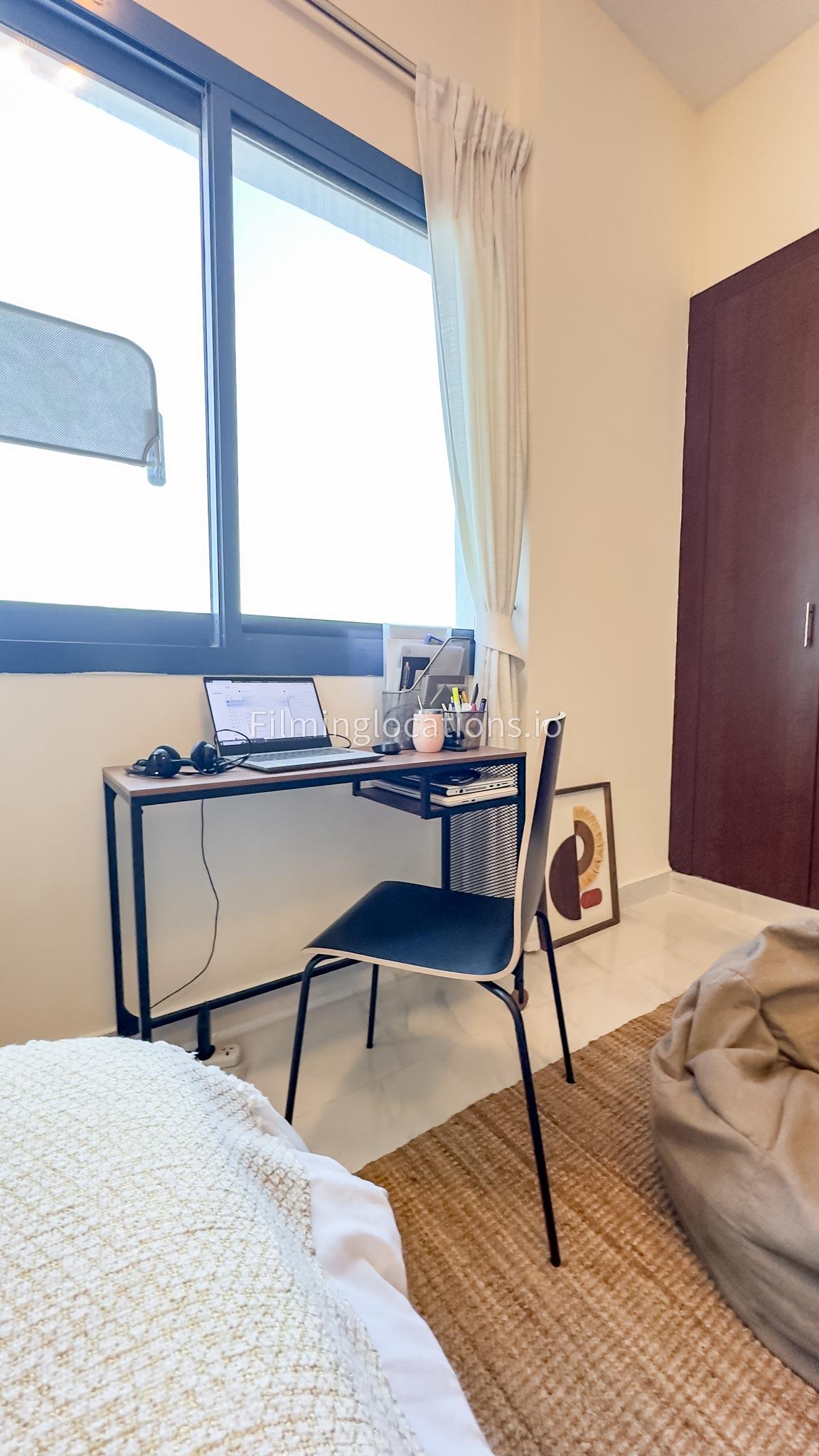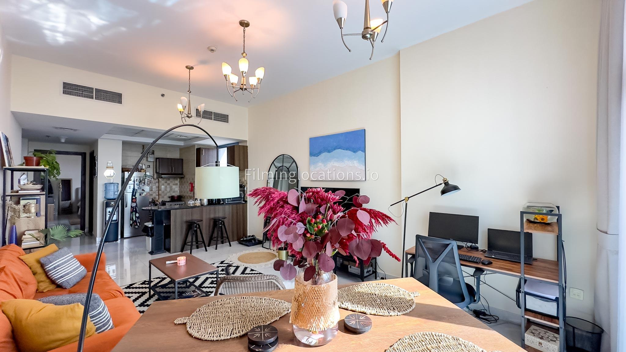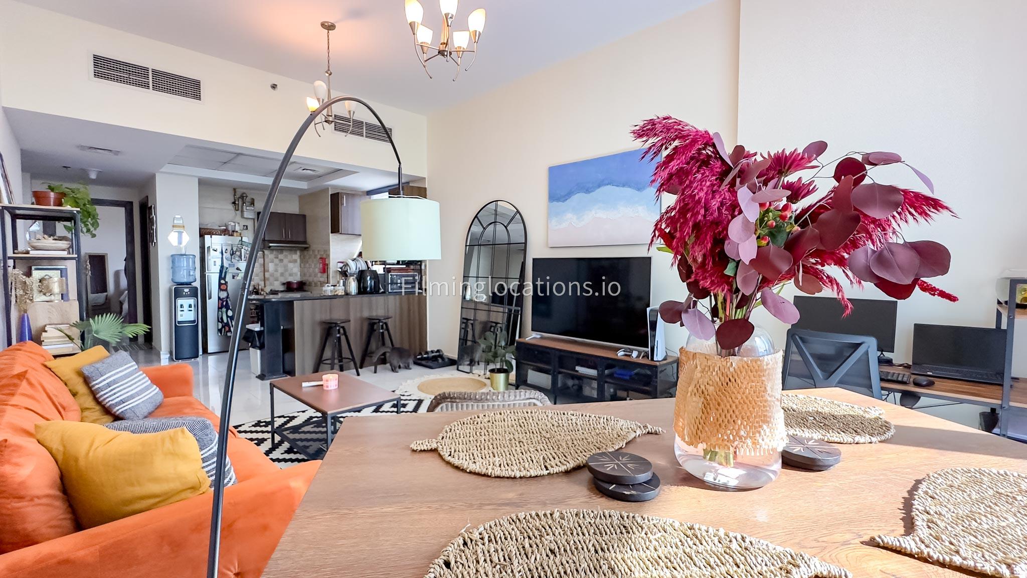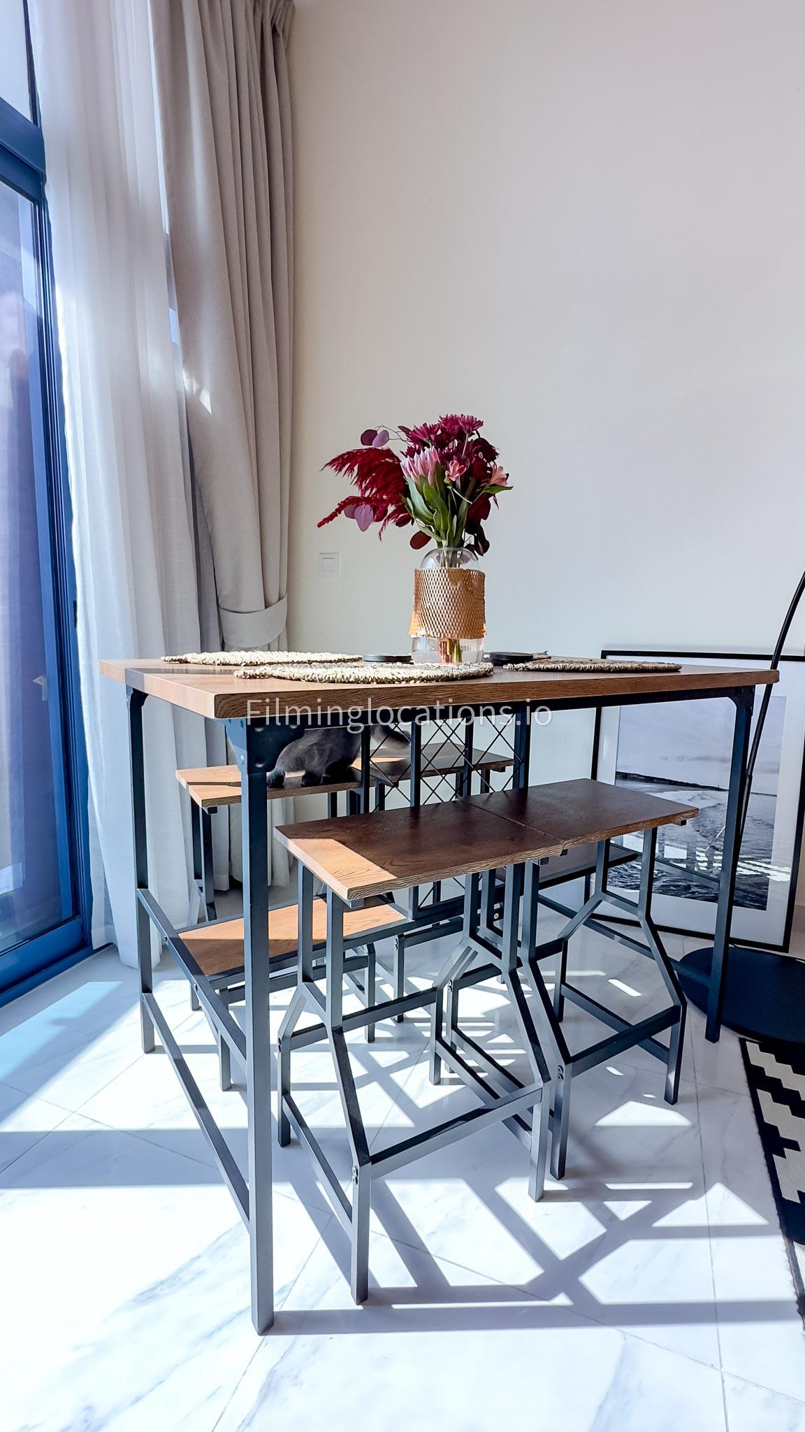 Our apartment exudes a modern vibe, with furnishings that lends to it's modern appeal. Natural light floods the space through floor-to-ceiling windows, creating an inviting atmosphere for filming. Furthermore, there is an open kitchen and a bedroom that has a bohemian charm with it's own ensuite bathroom.