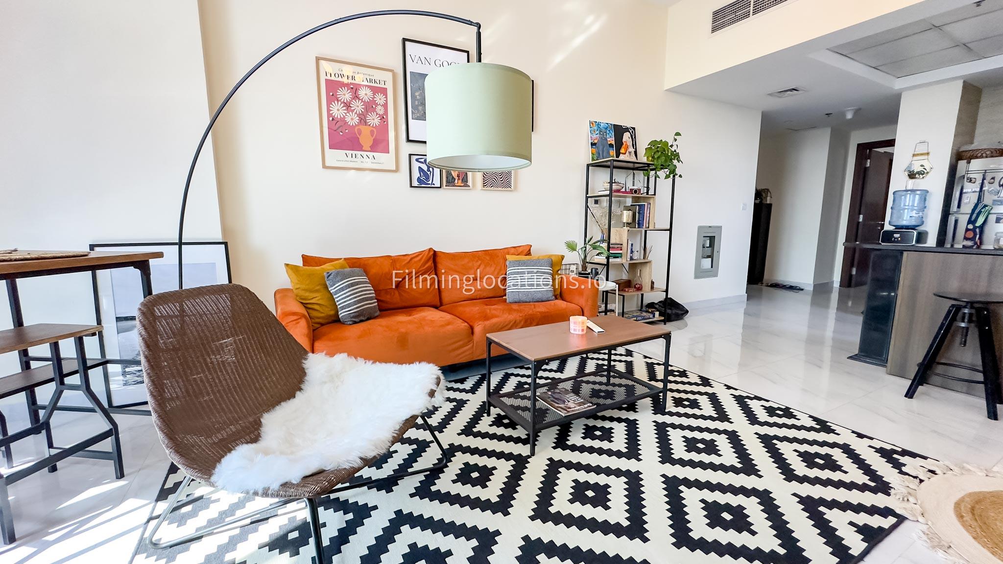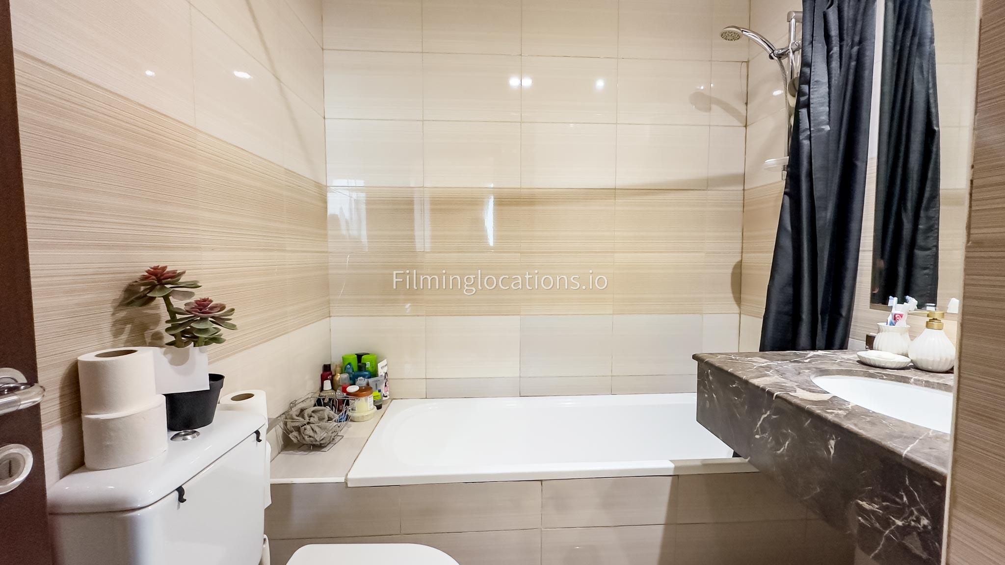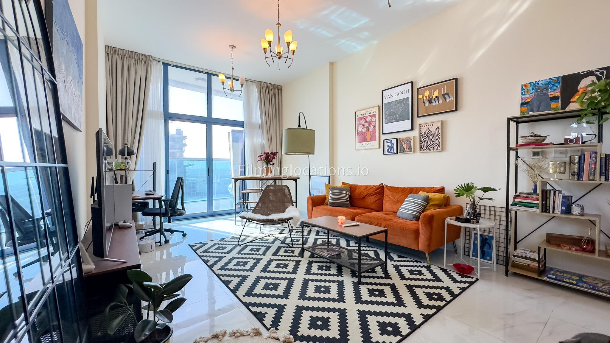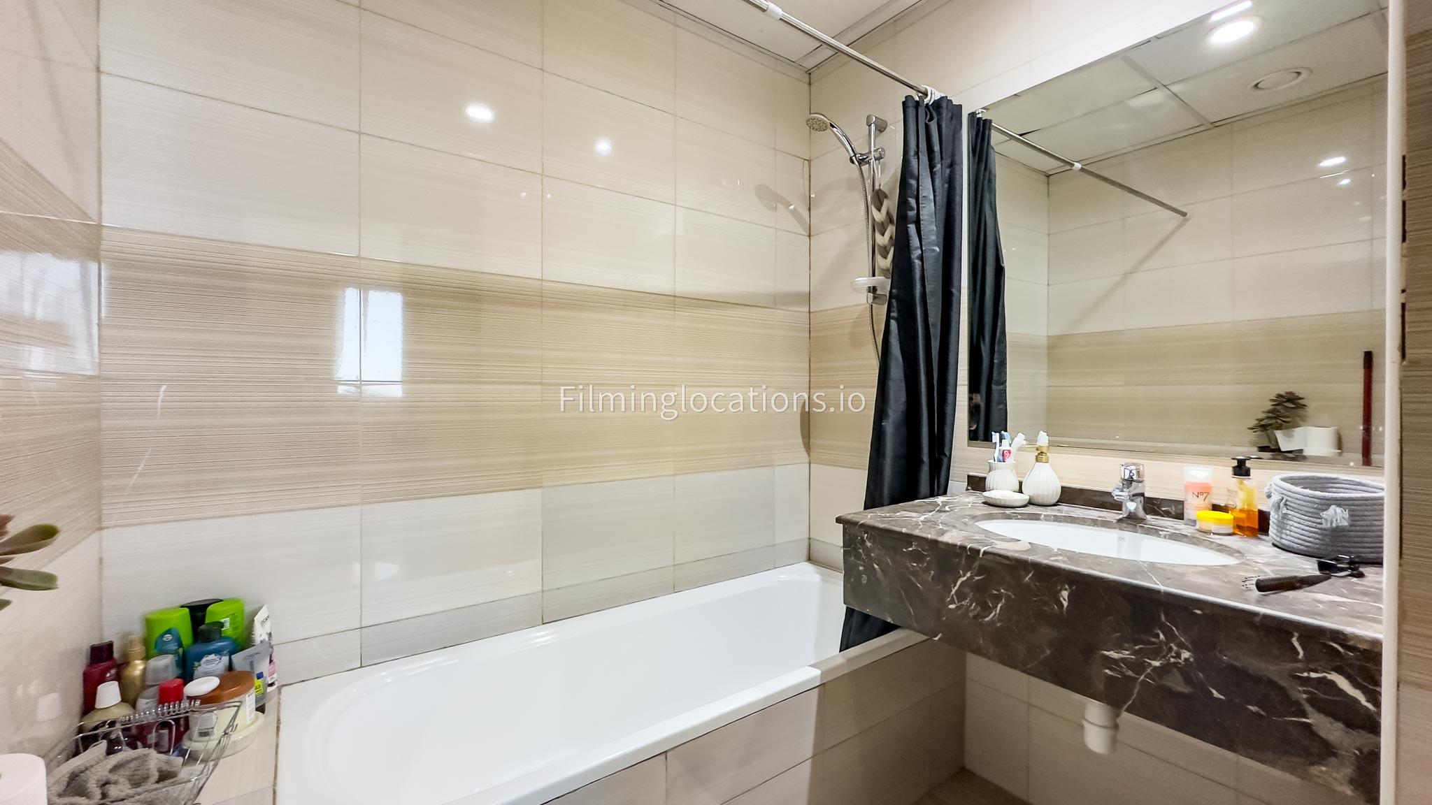 Our apartment exudes a modern vibe, with furnishings that lends to it's modern appeal. Natural light floods the space through floor-to-ceiling windows, creating an inviting atmosphere for filming. Furthermore, there is an open kitchen and a bedroom that has a bohemian charm with it's own ensuite bathroom.