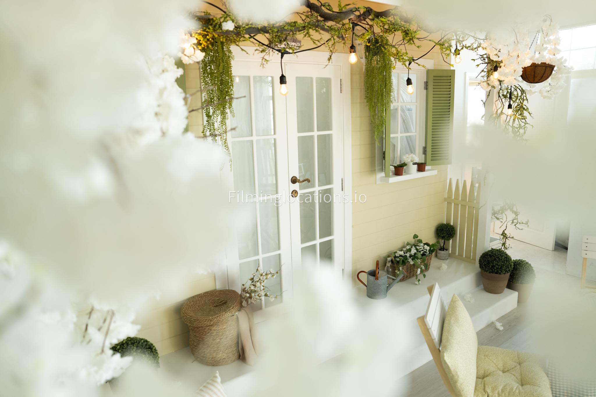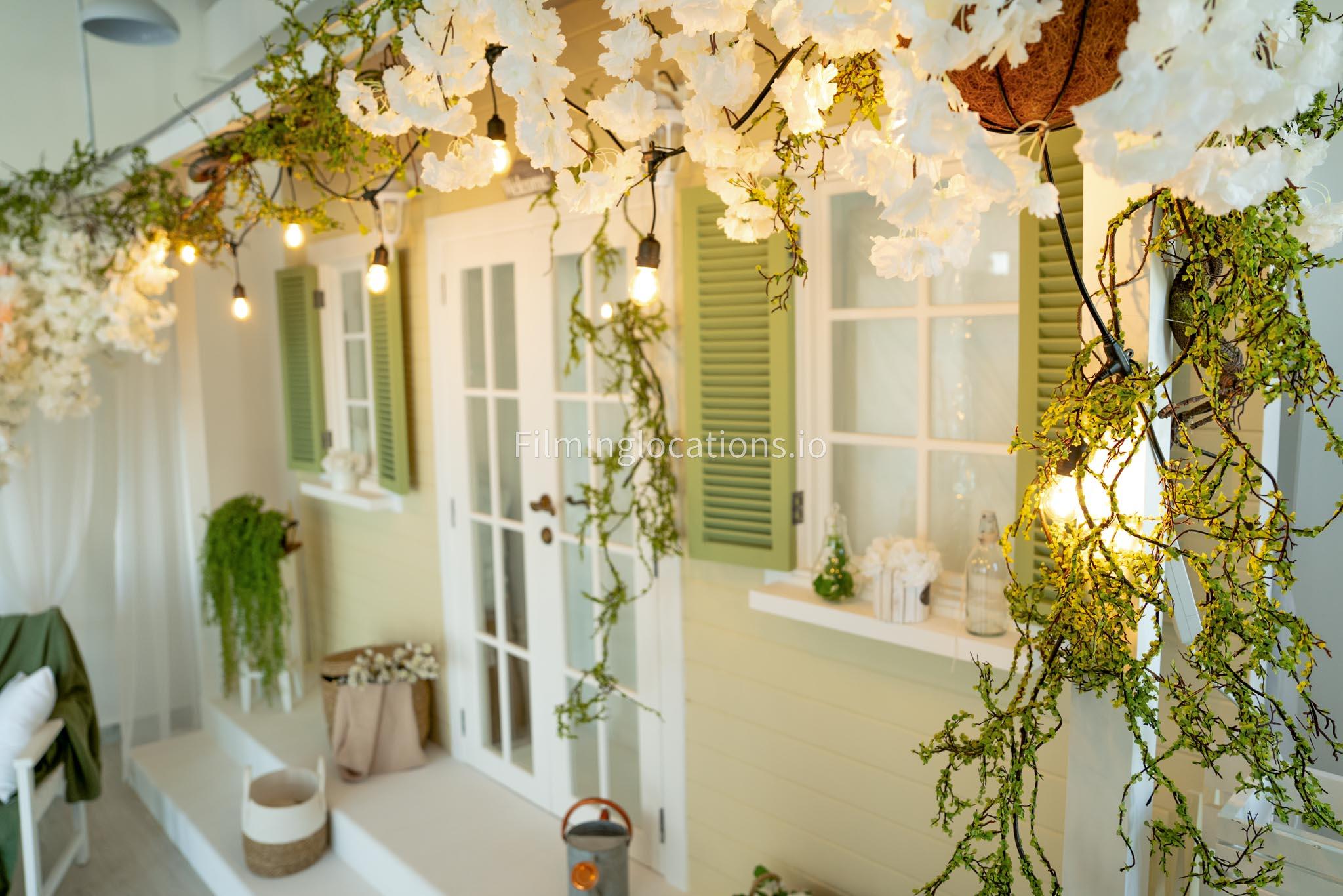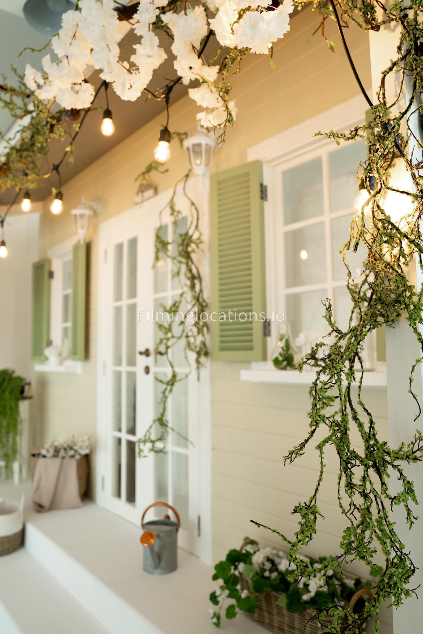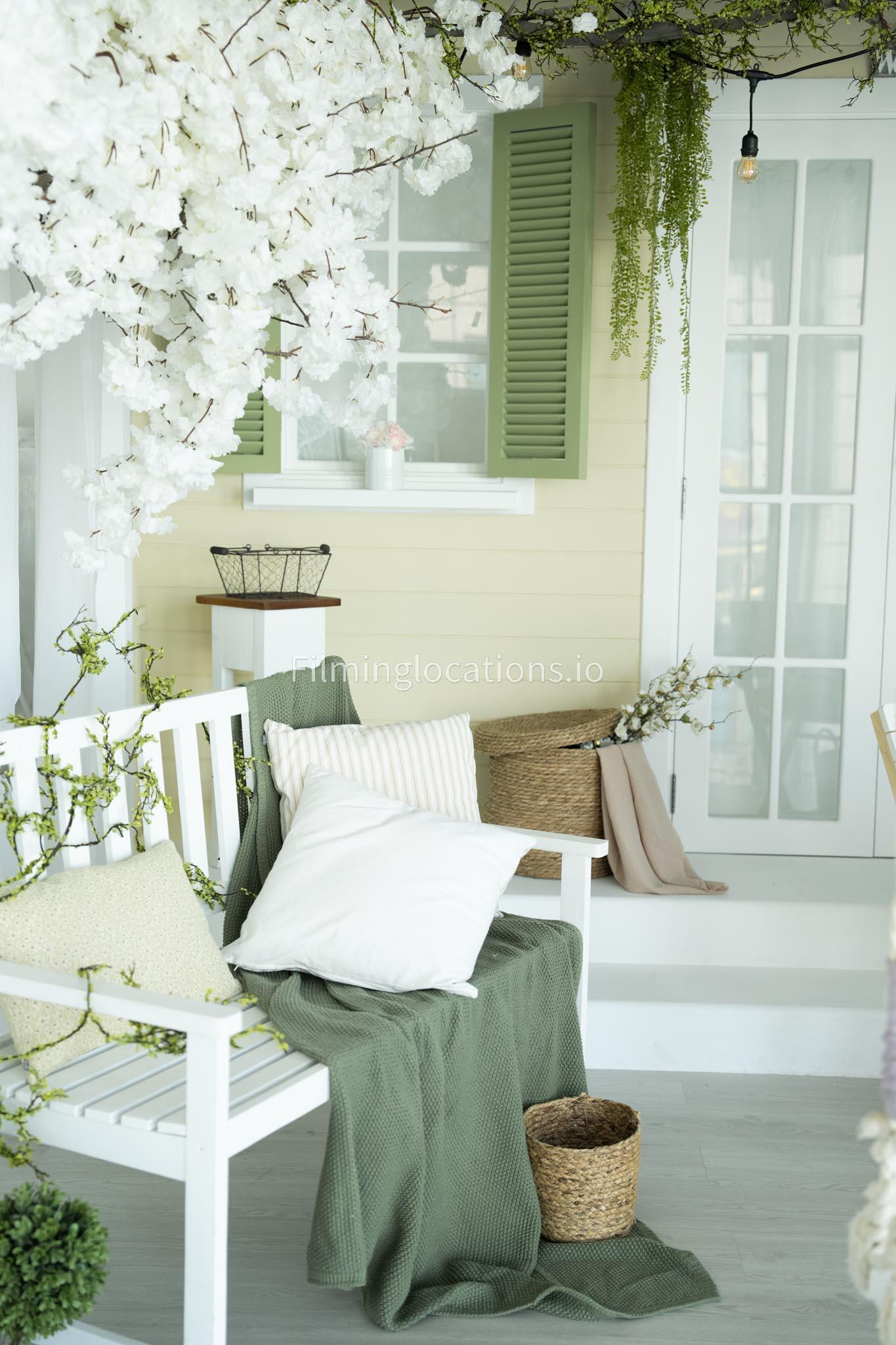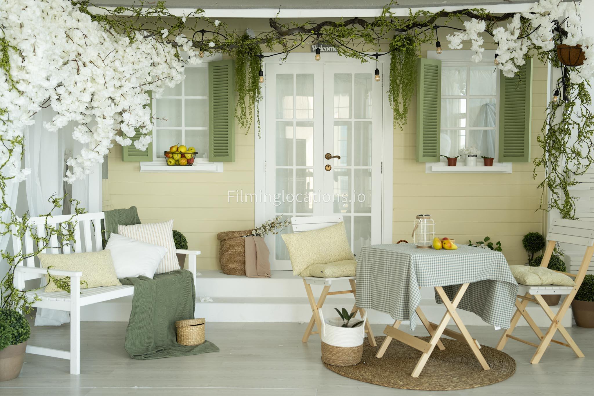 Our cottage-style set boasts a charming porch with beautiful seating and lush greenery, embodying a delightful spring ambiance. Filmmakers will love its picturesque setting, ideal for capturing warm and tranquil scenes filled with romance or family moments